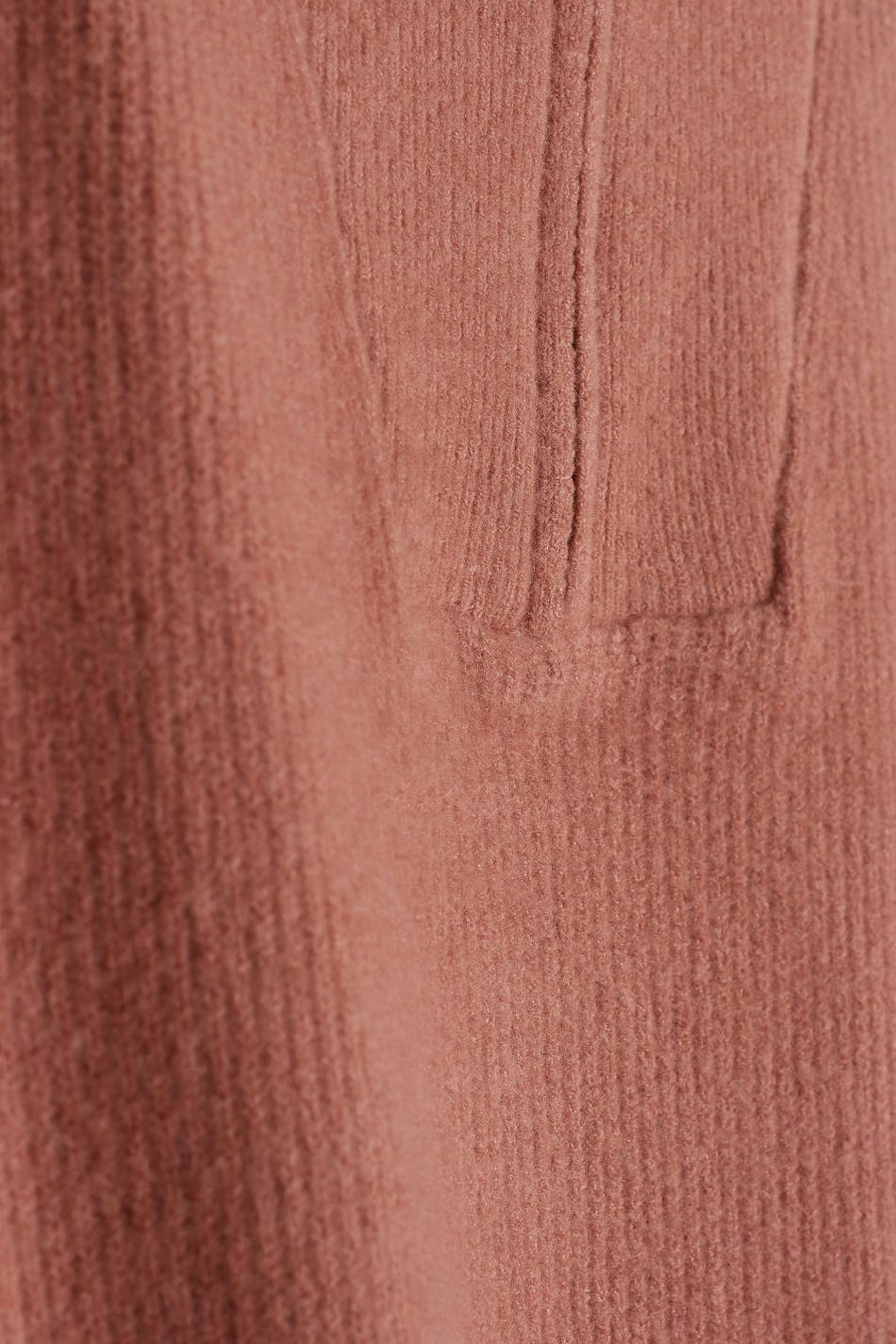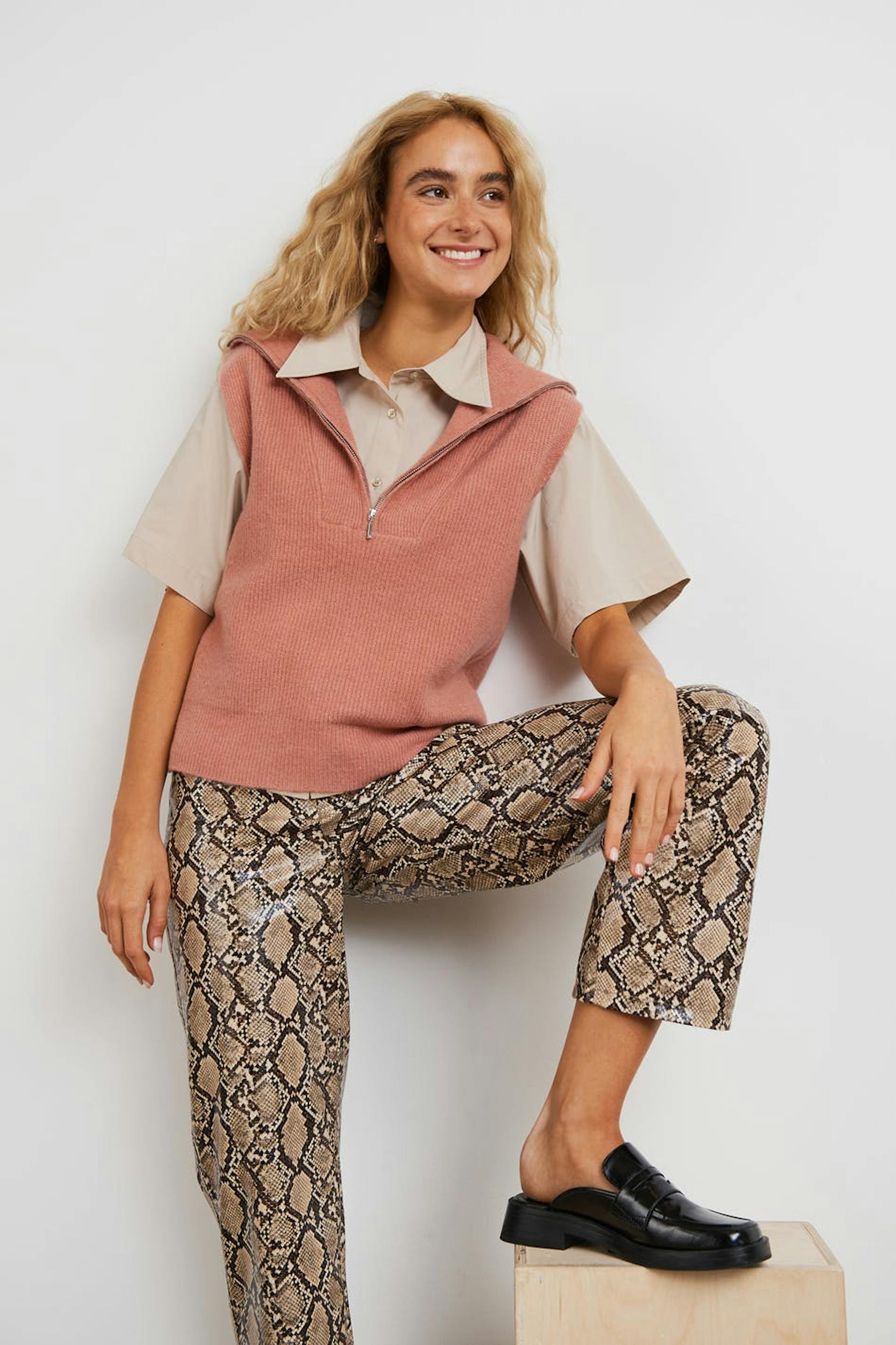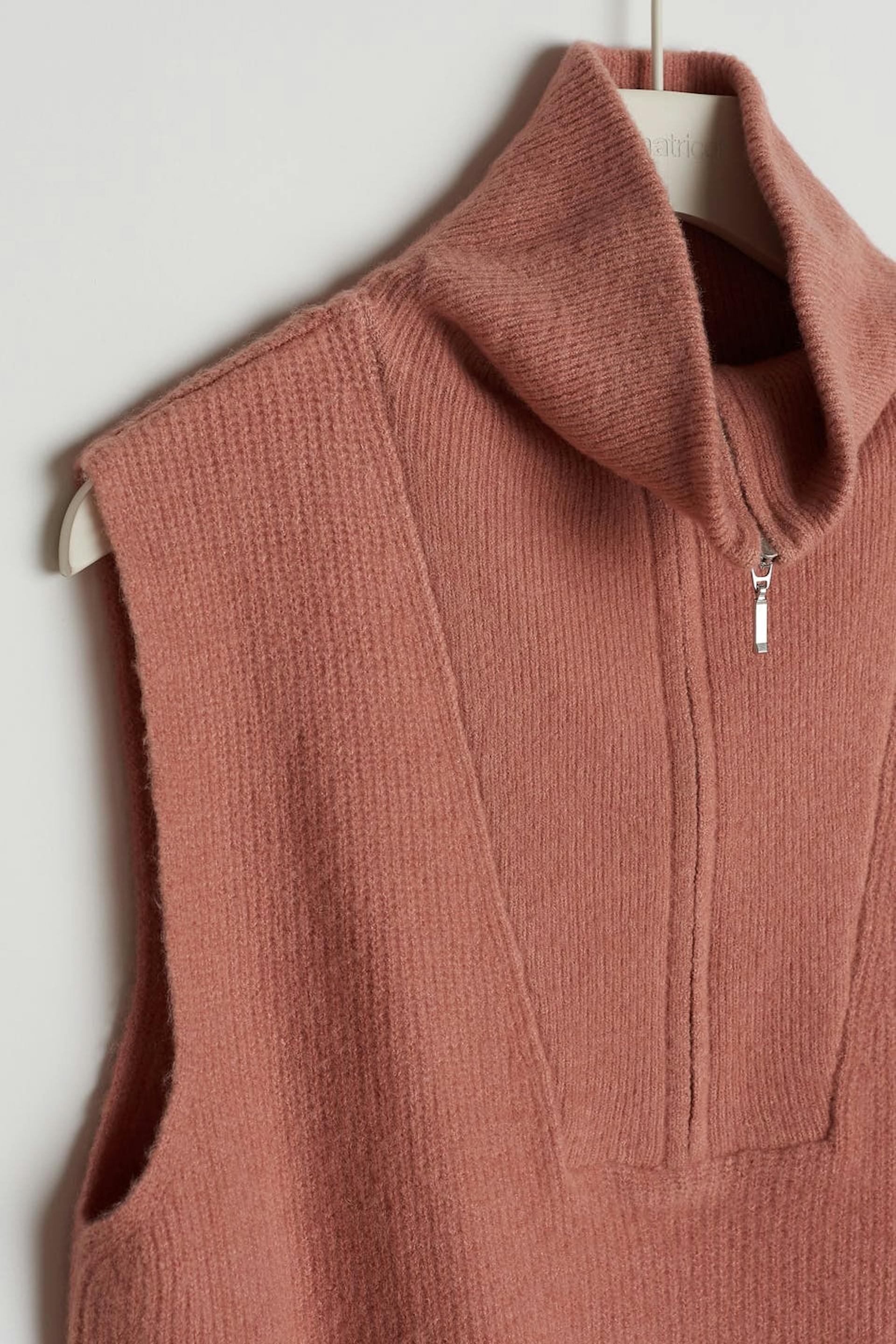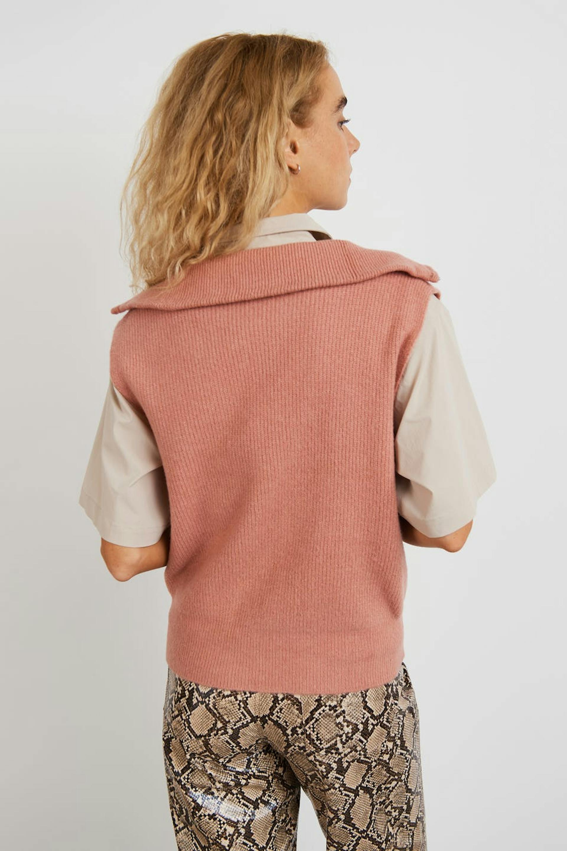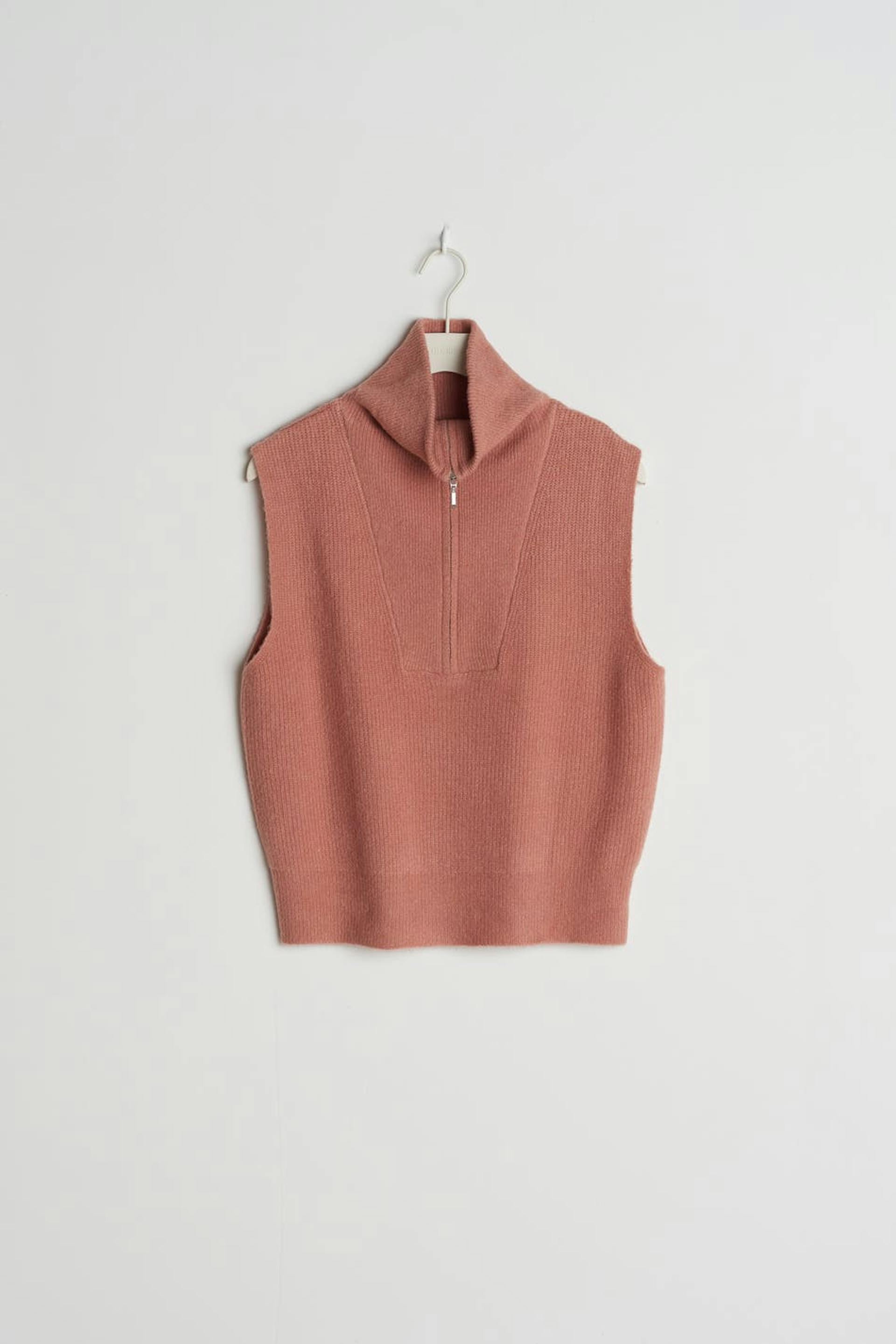 Neulottu liivi normaalilla istuvuudella. Liivi on pinkki ja hihaton ja siinä on korkea kaula. Siinä on puolivetoketju ylhäällä.