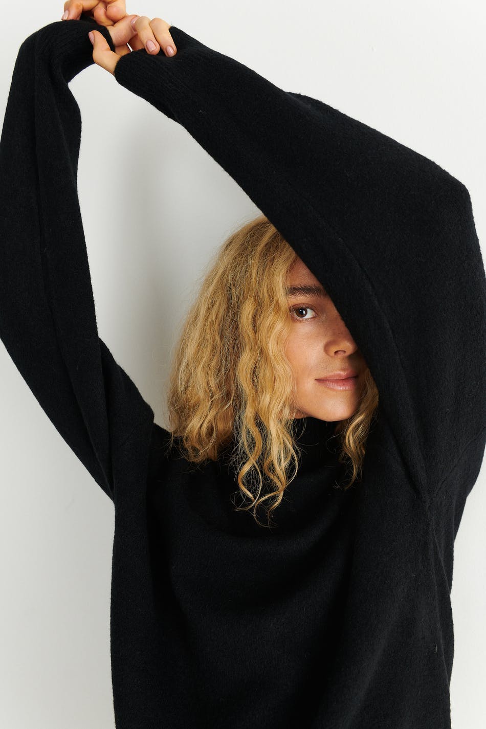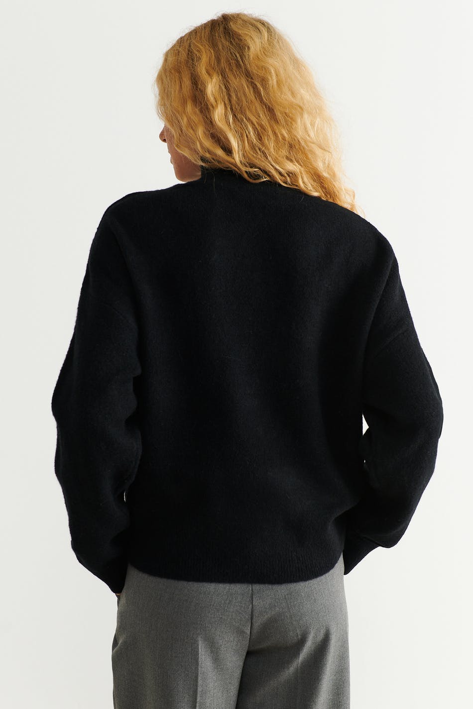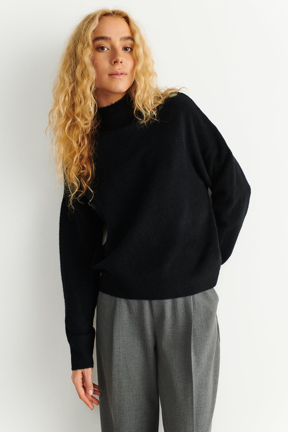 Neulottu paita poolokauluksella. Paita on musta ja siinä on laatikkomainen malli. Siinä on pudotetut olkapäät ja resorihelma.