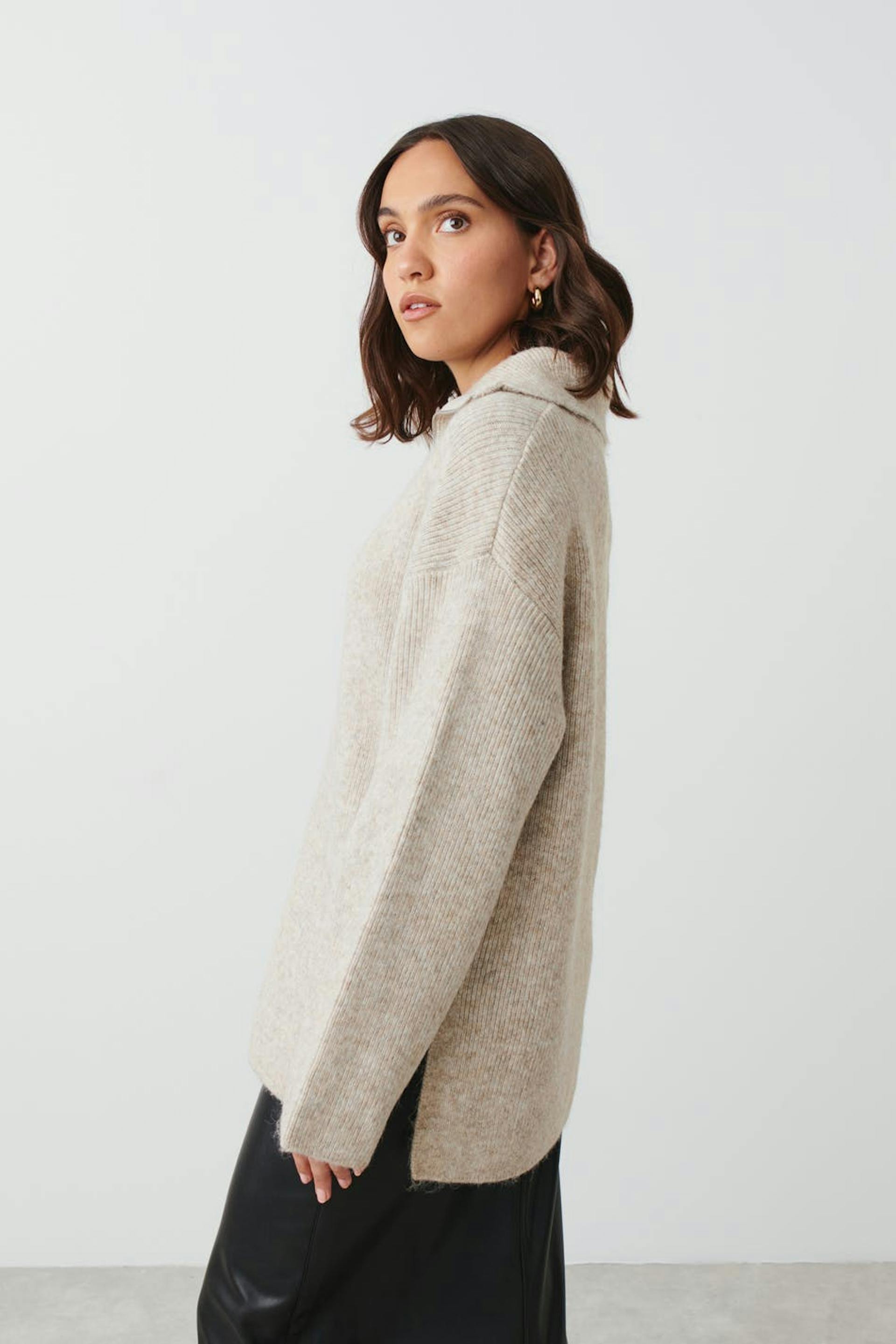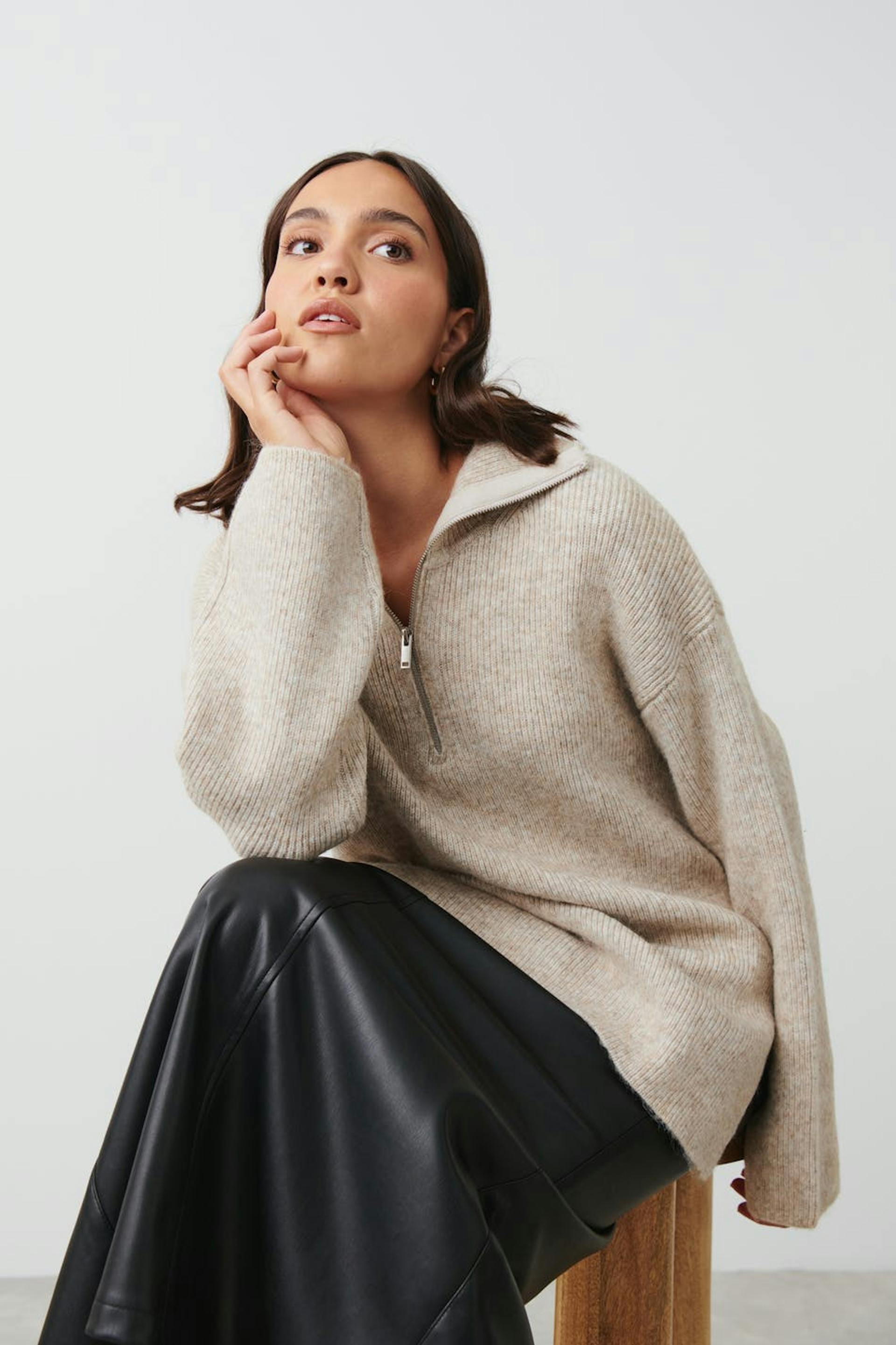 Pitkä neulepusero v-pääntiellä. Pusero on beige ja siinä on korkea kaulus vetoketjulla.