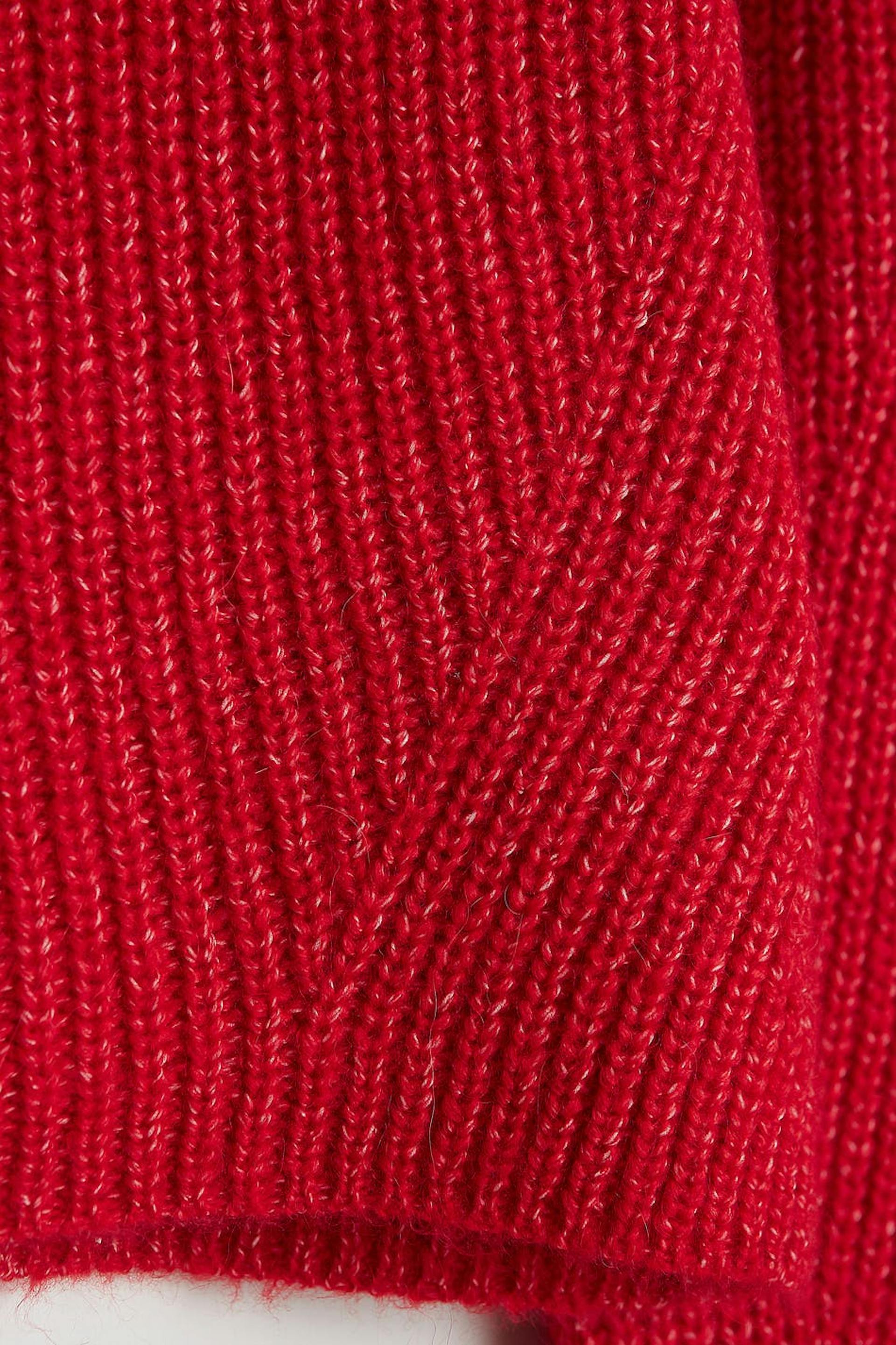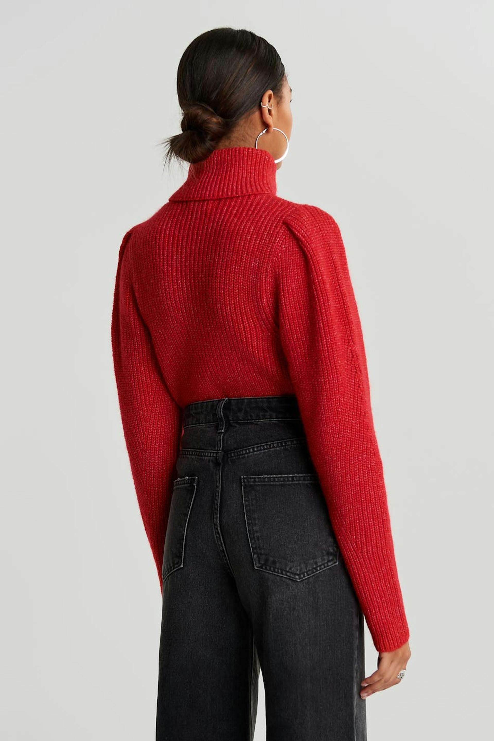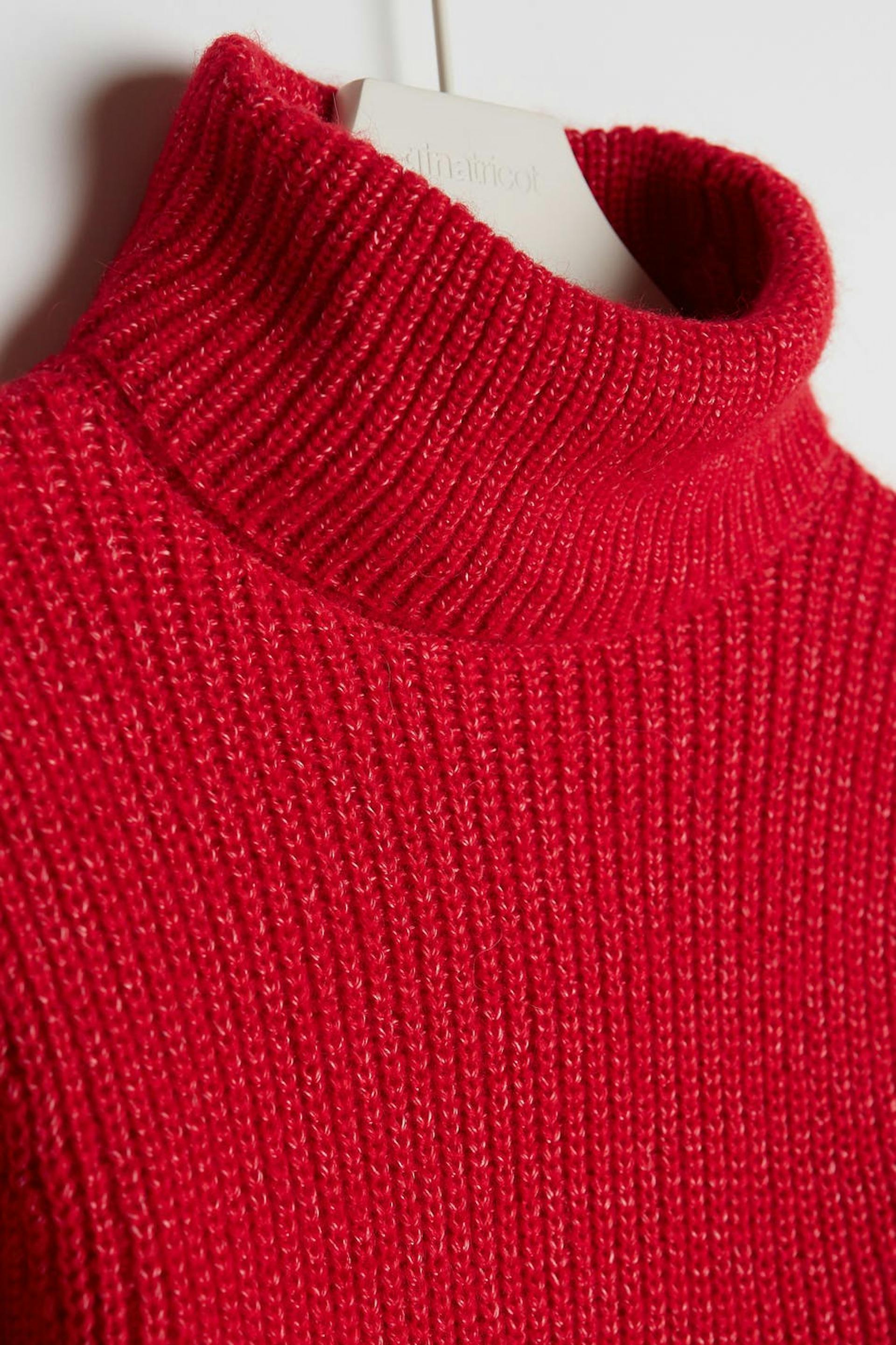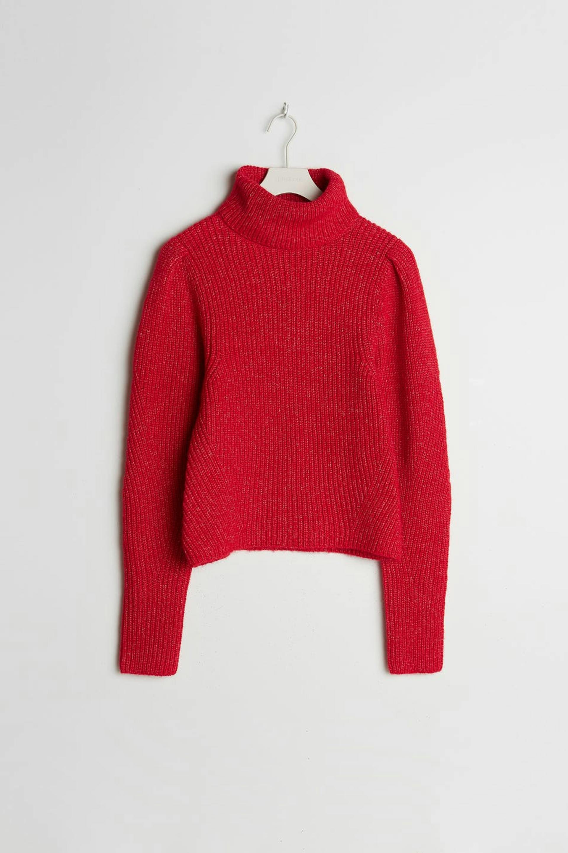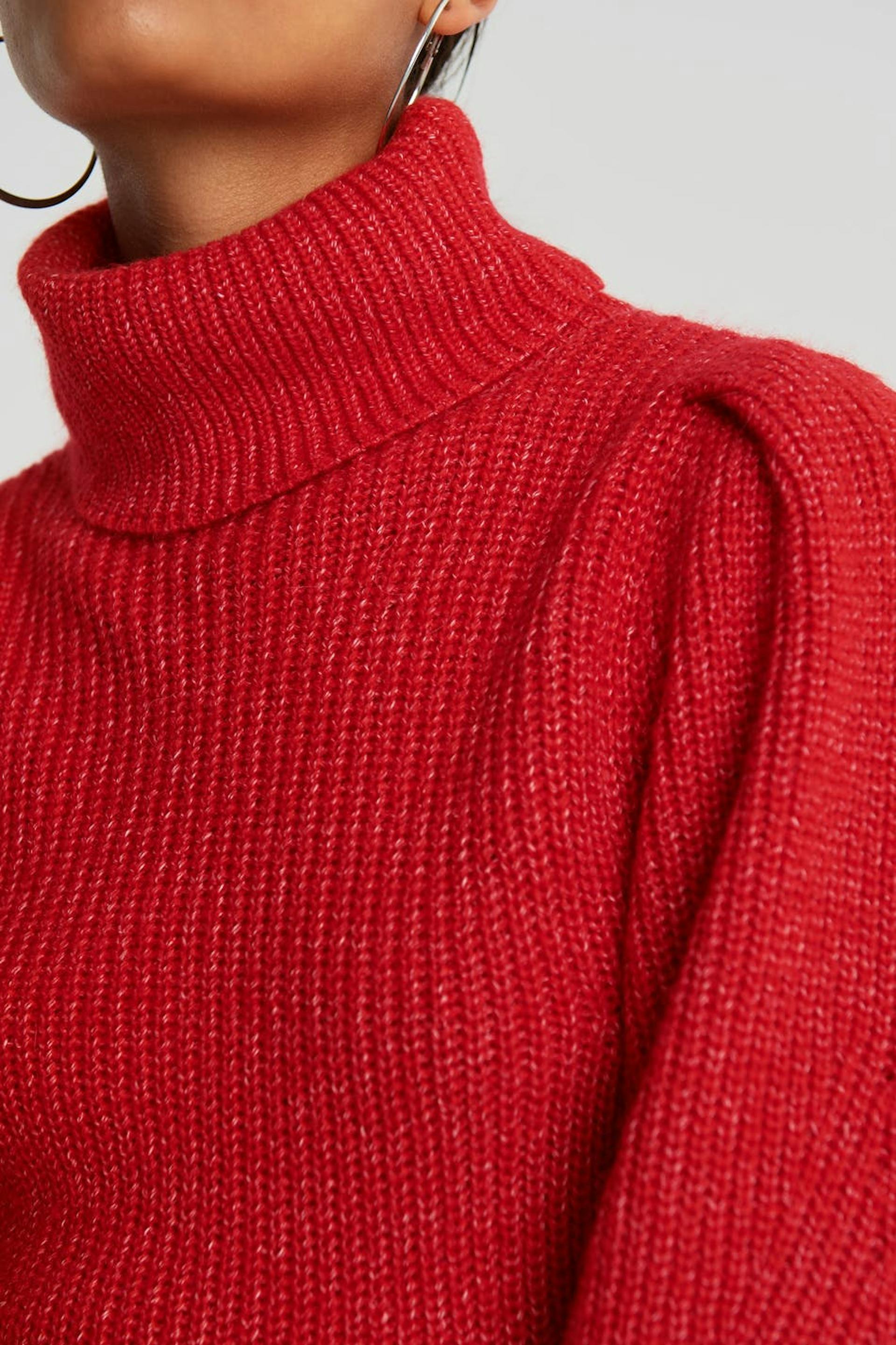 Neulottu villapaita poolokauluksella. Villapaita on punainen ja neulottu ja siinä on pitkät puff sleeve-paidat.