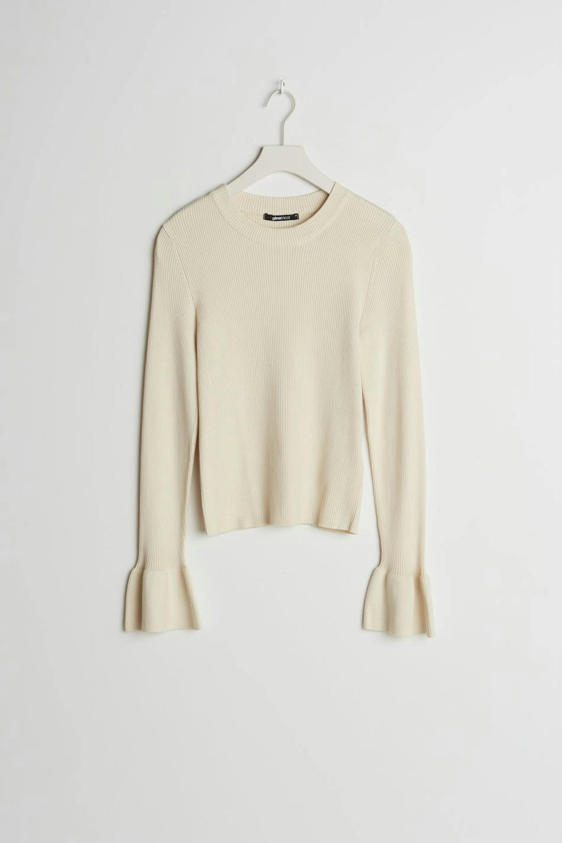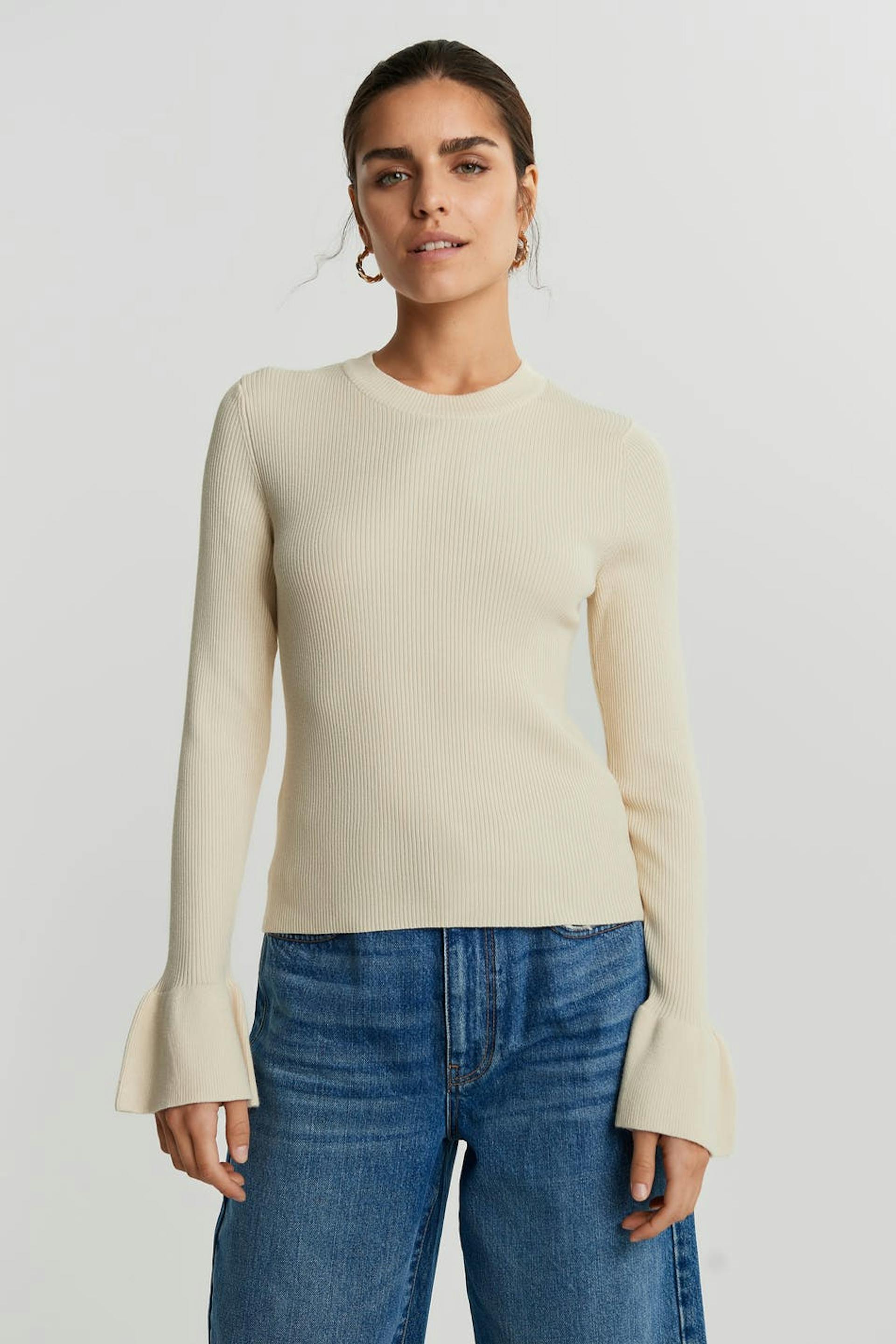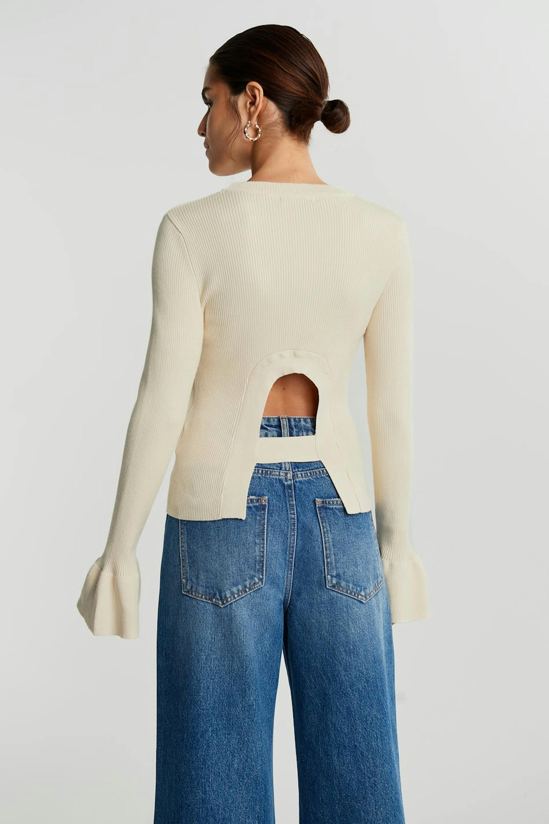 Resorimainen villapaita vartalonmyötäisellä istuvuudella. Villapaita on beige ja siinä on röyhelöt hihansuissa. Siinä on avoin yksityiskohta selässä.
