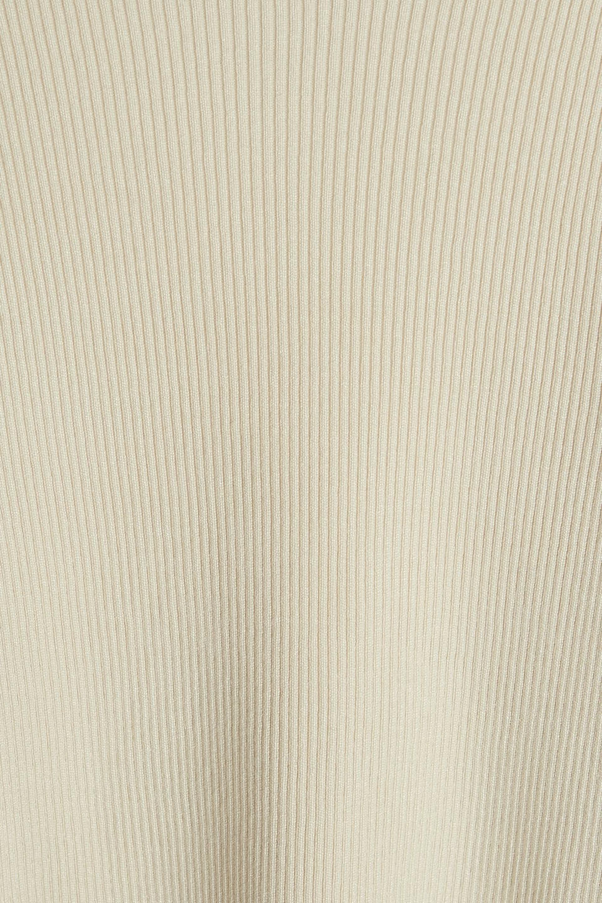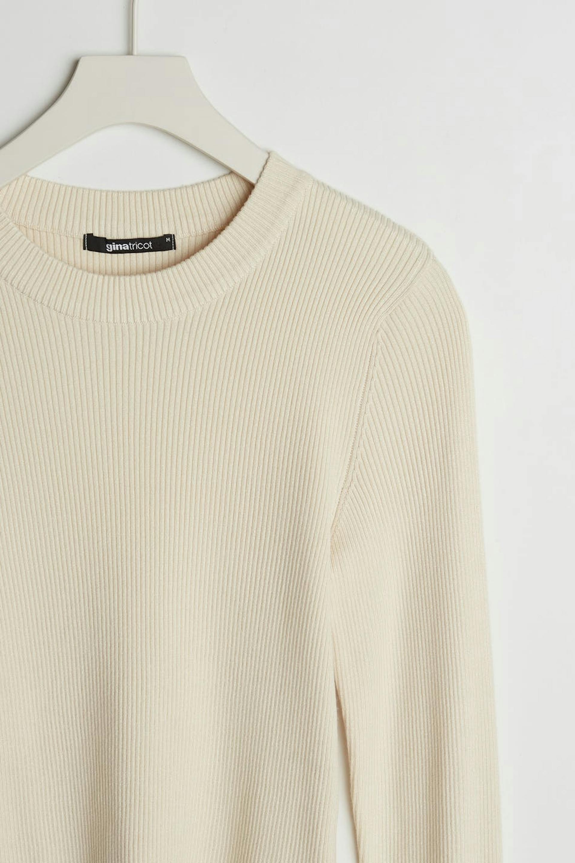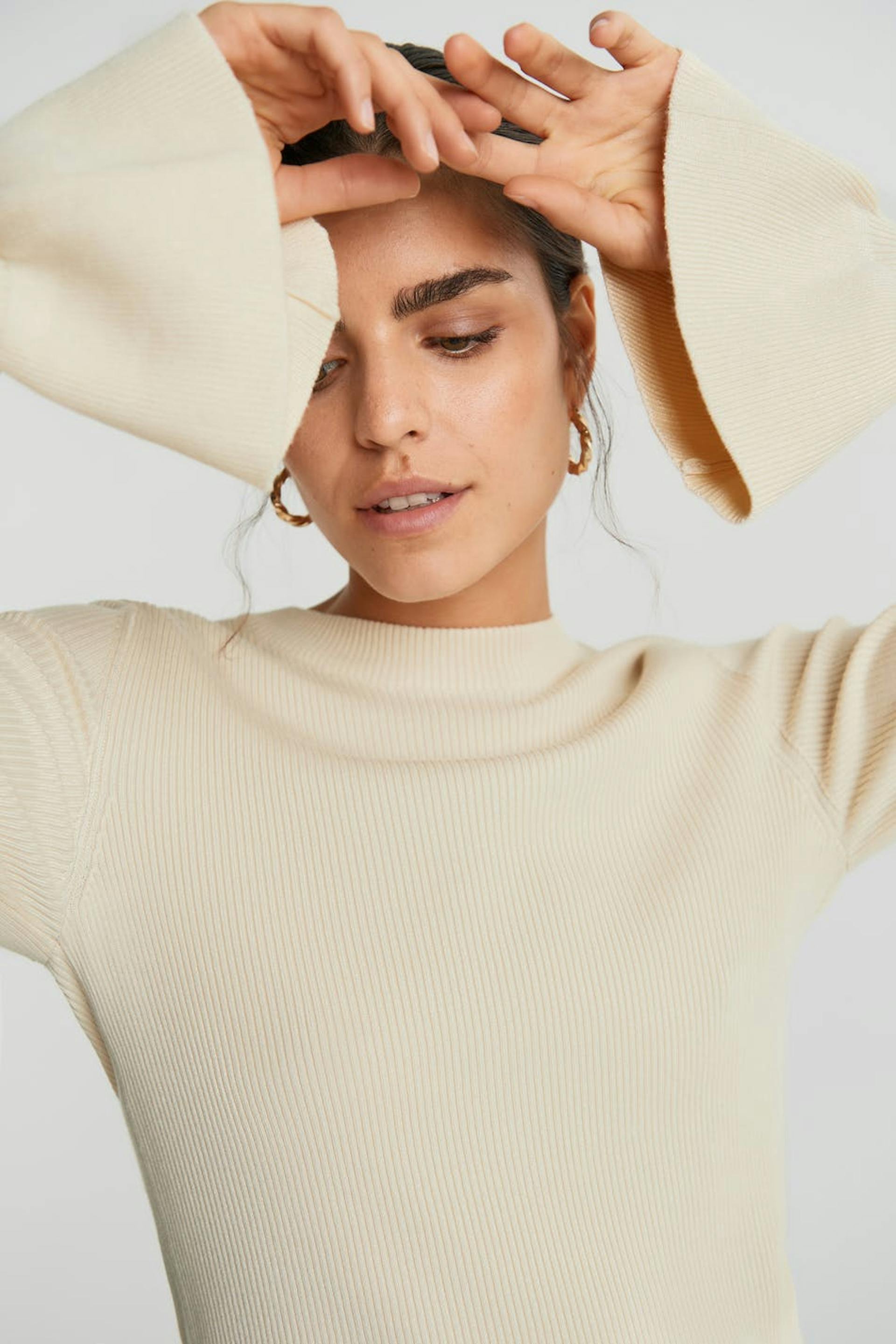 Resorimainen villapaita vartalonmyötäisellä istuvuudella. Villapaita on beige ja siinä on röyhelöt hihansuissa. Siinä on avoin yksityiskohta selässä.