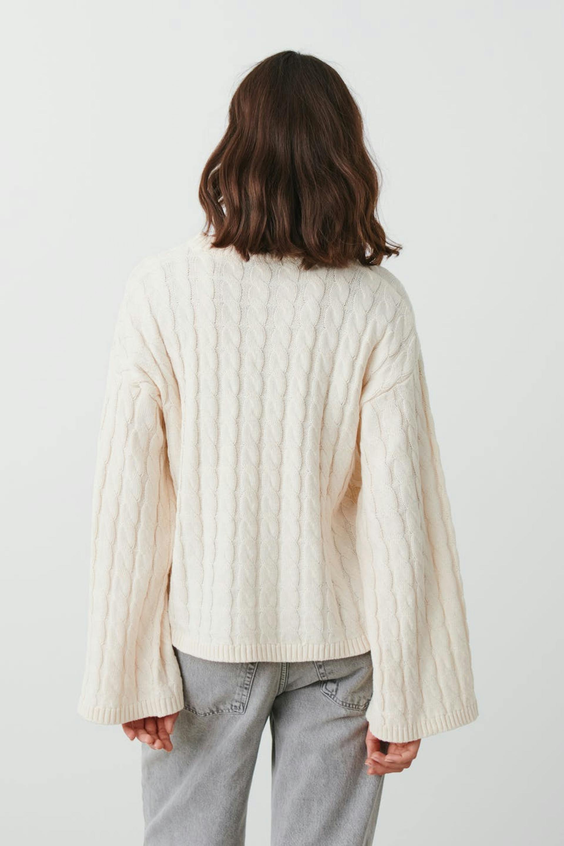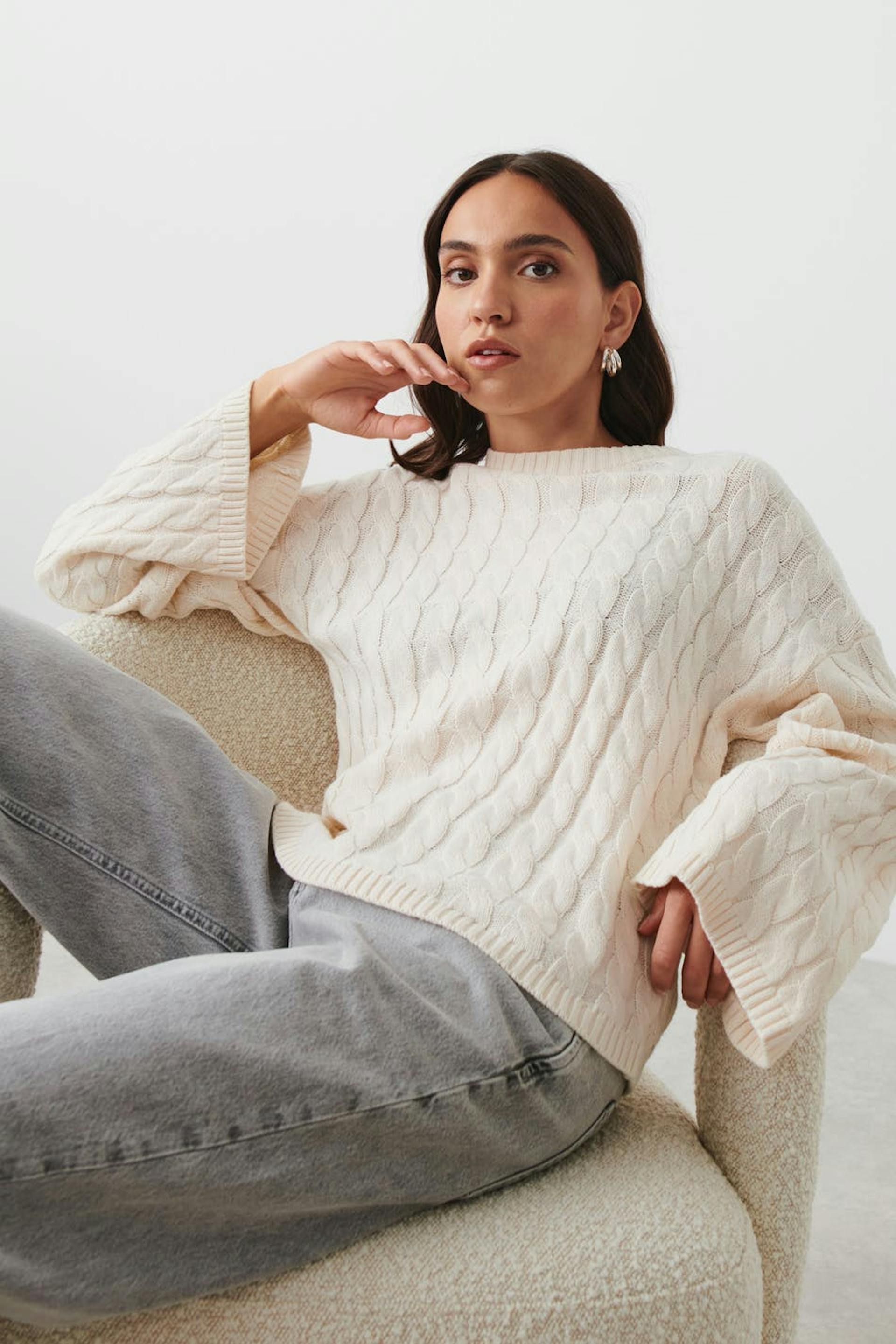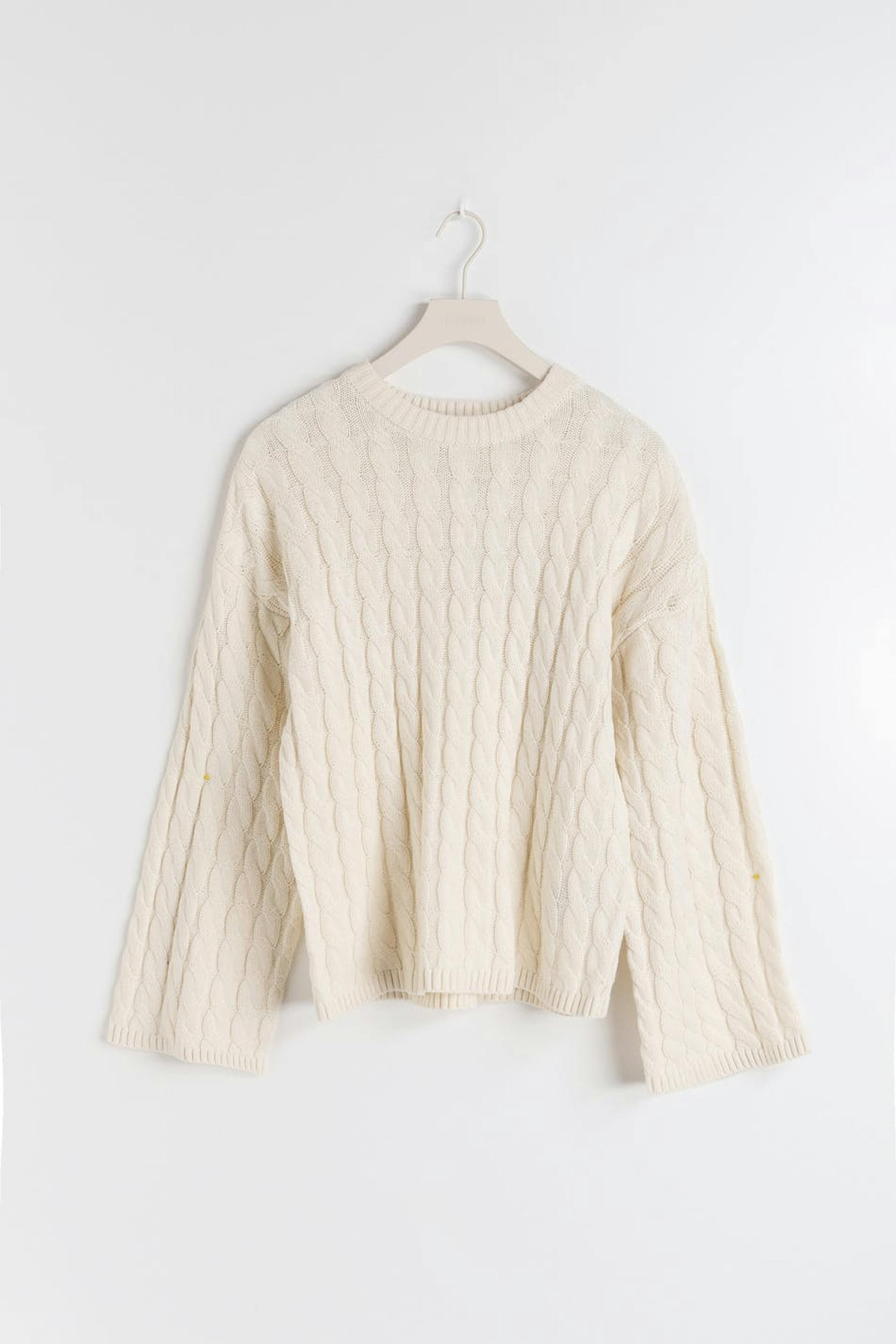 Palmikkoneulepusero oversized-mallilla. Paita on valkoinen ja siinä on pyöreä pääntie.