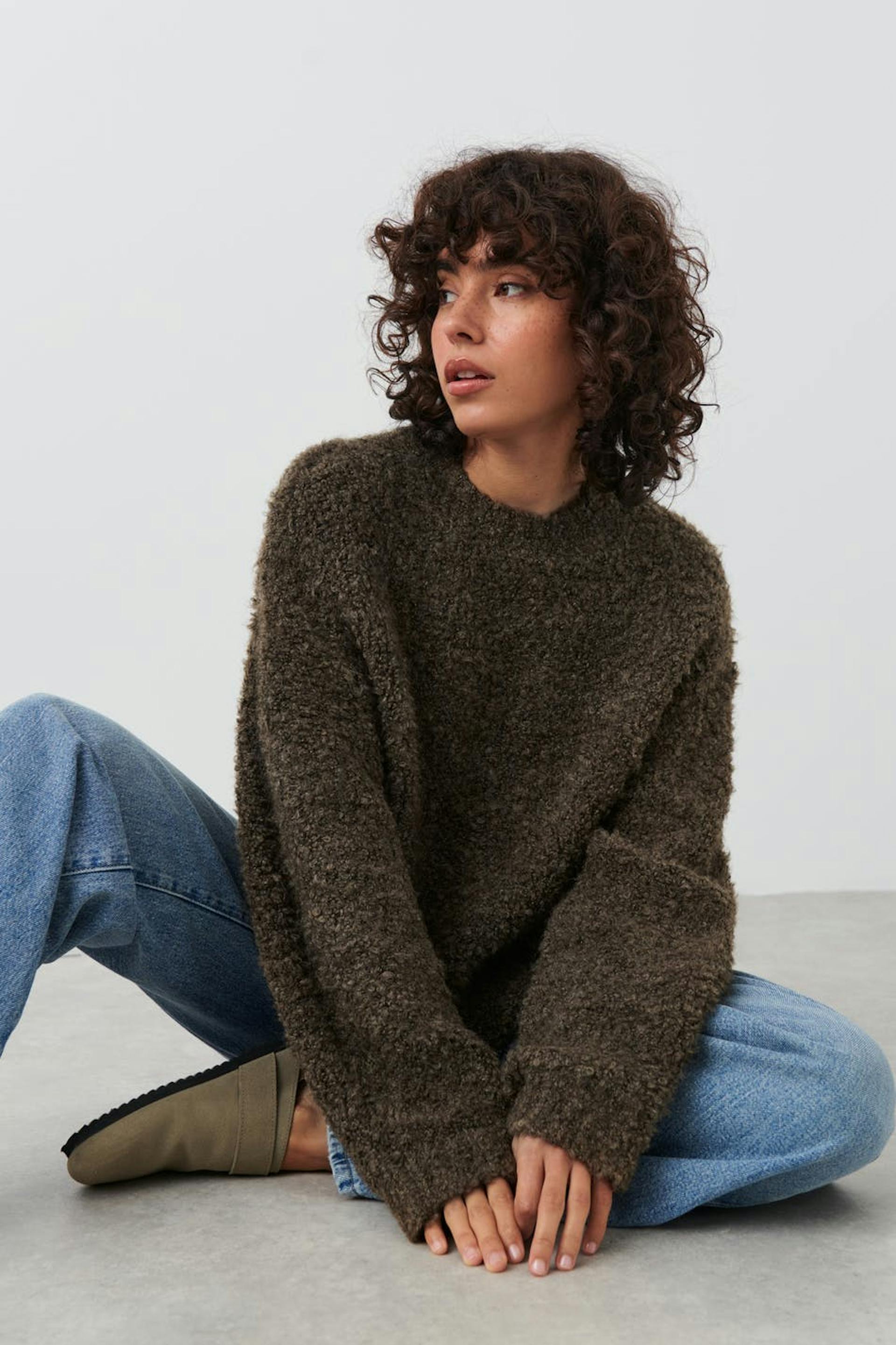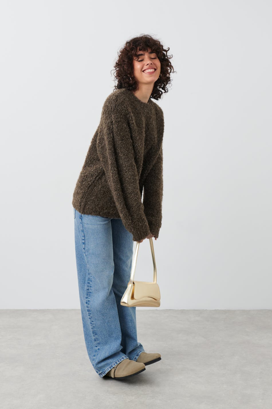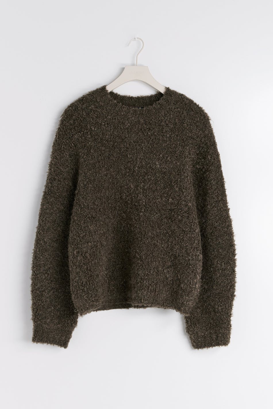 Neulepusero silmukkanukkakankaasta pyöreällä pääntiellä. Pusero on ruskea ja siinä on väljä malli. Siinä on pitkä, kookas hiha.