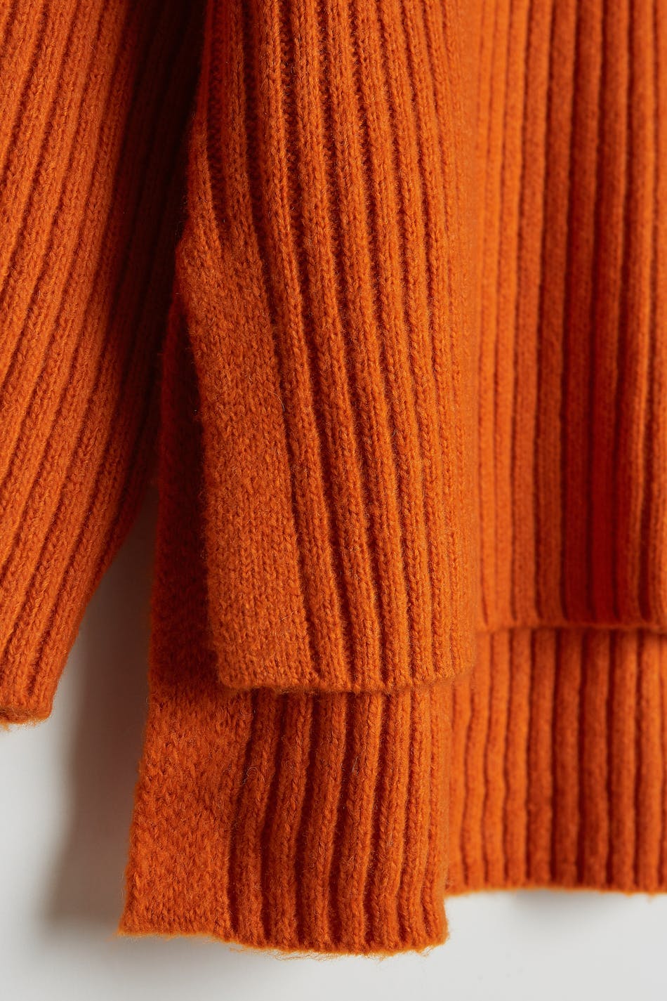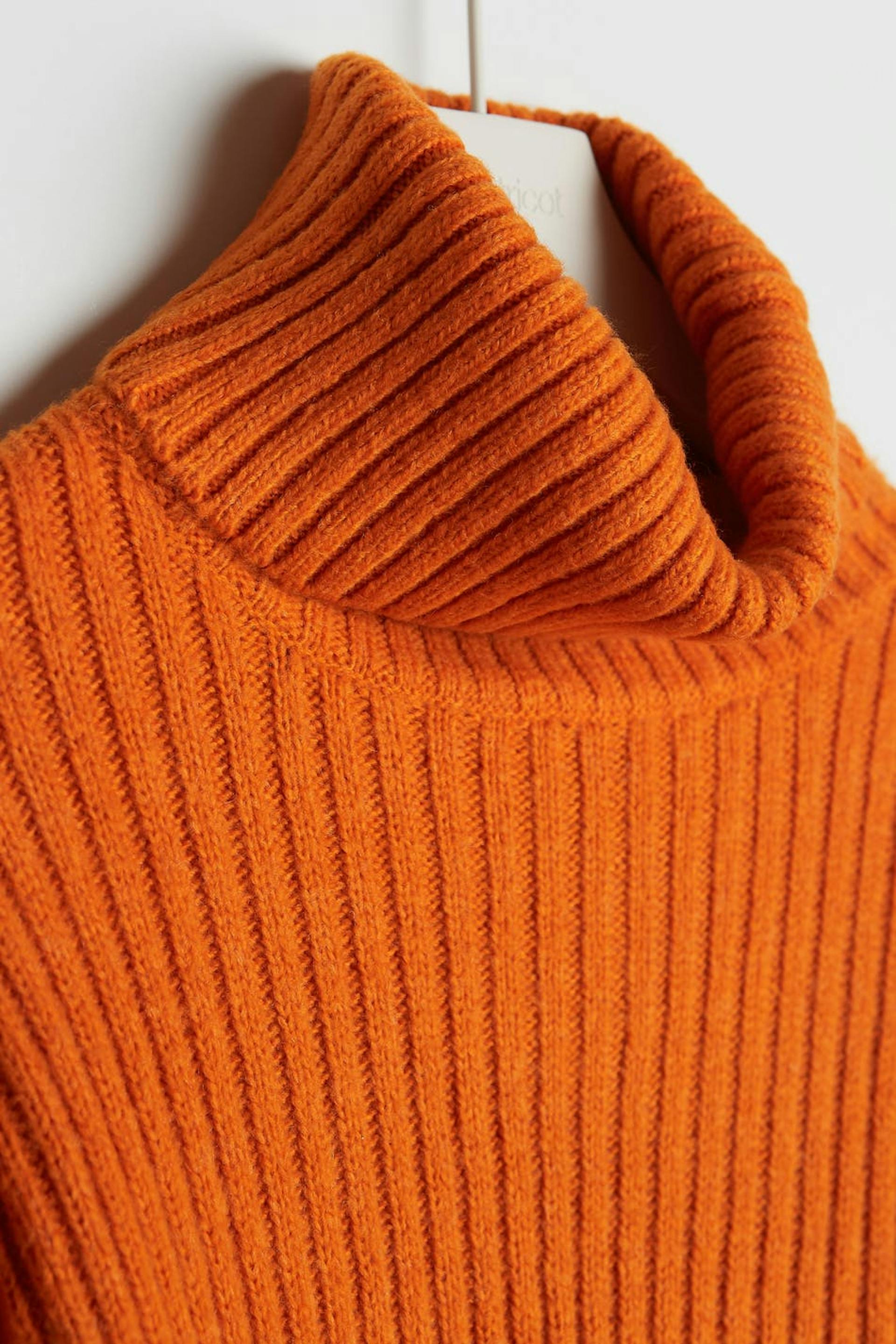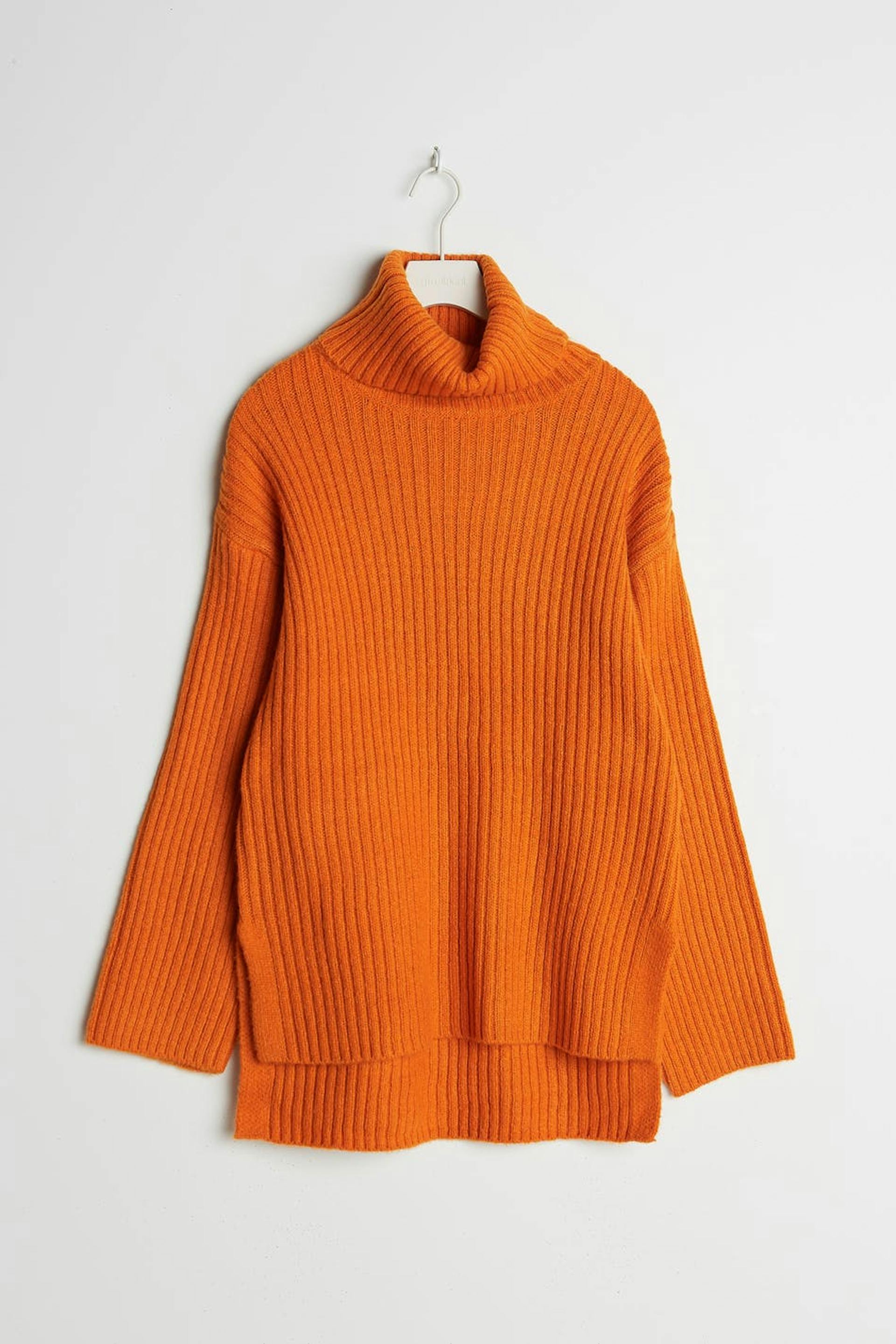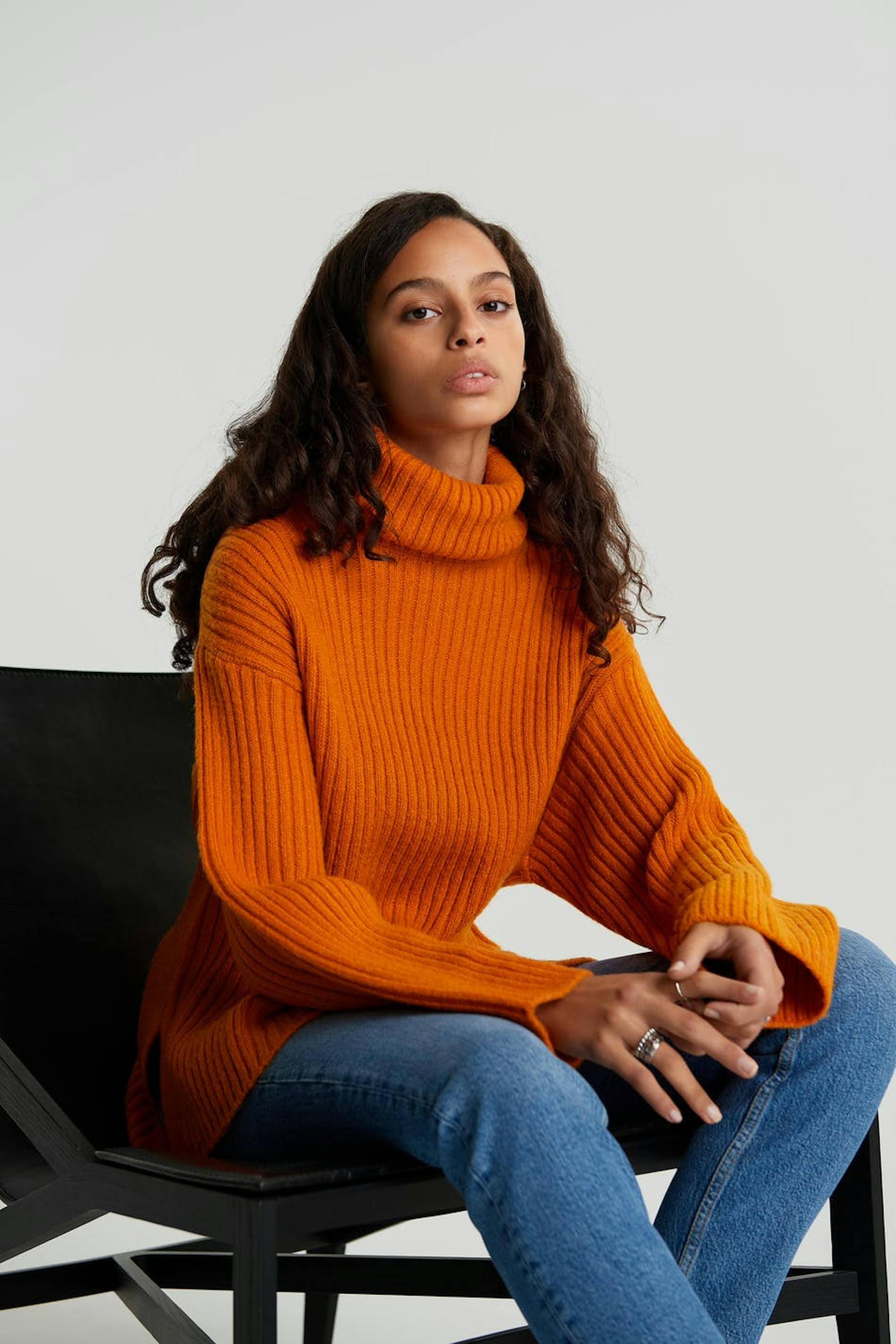Neulottu villapaita normaalilla leikkauksella. Villapaita on oranssi ja takaa hieman pidempi ja siinä on poolokaulus. Siinä on tilavat hihat.