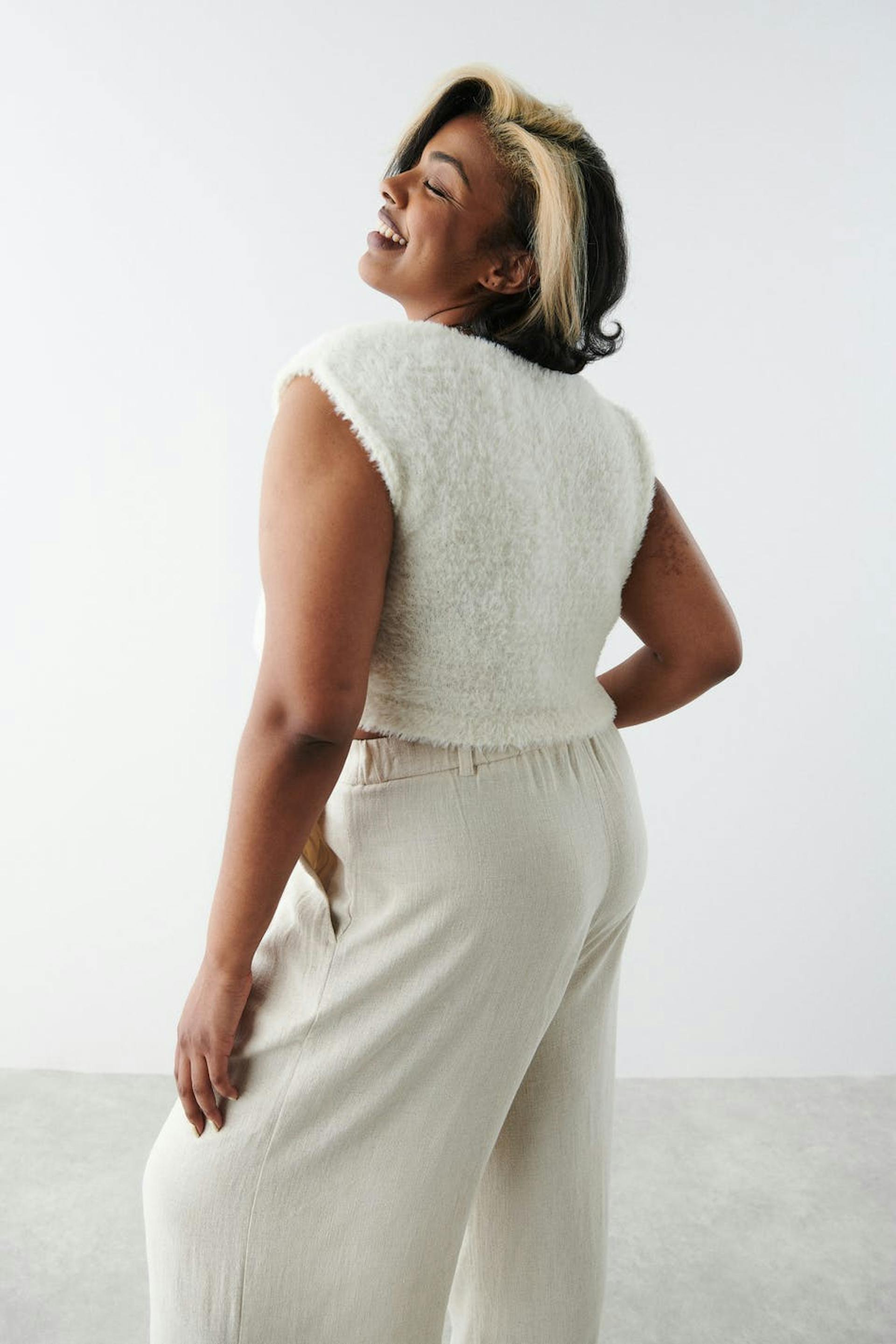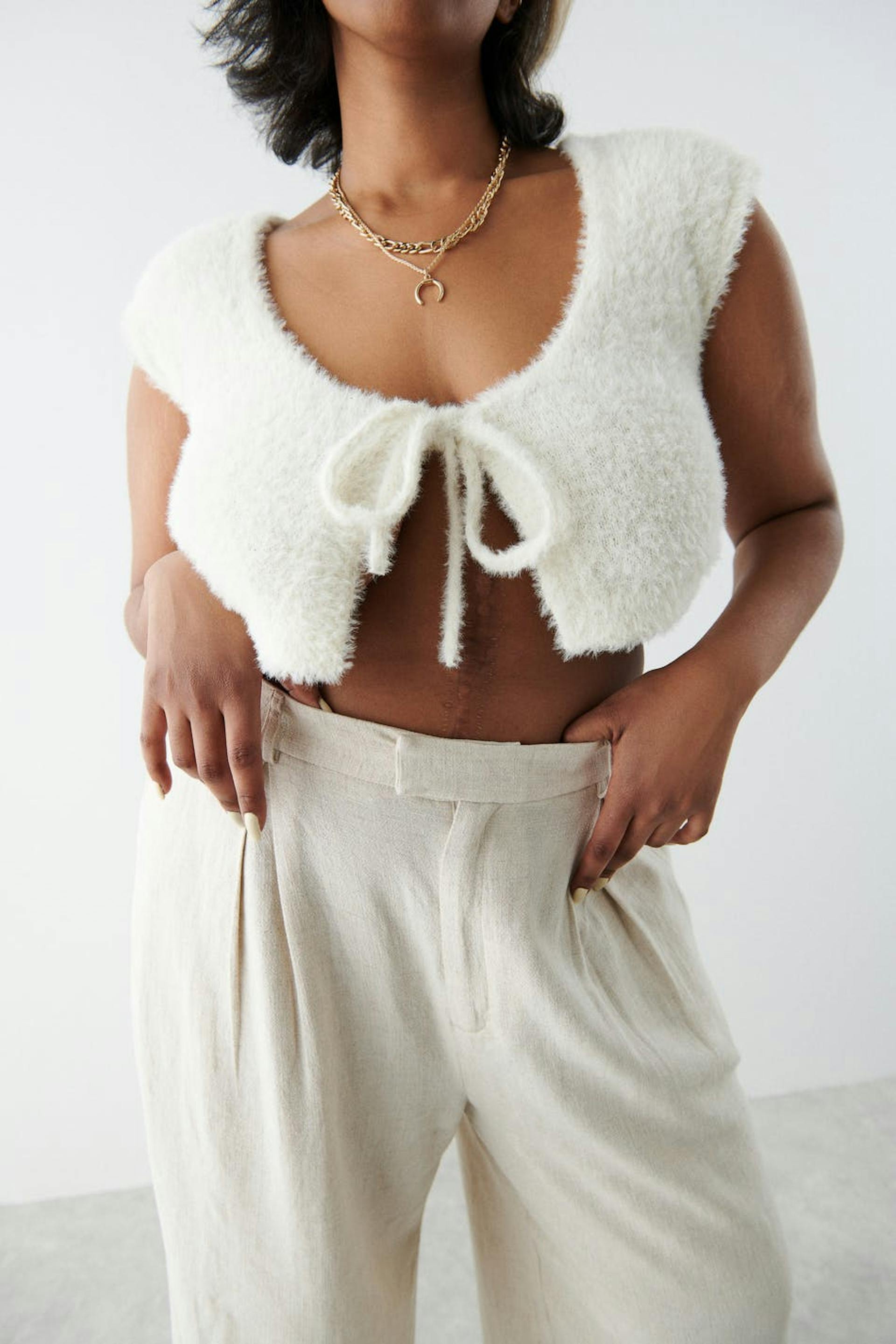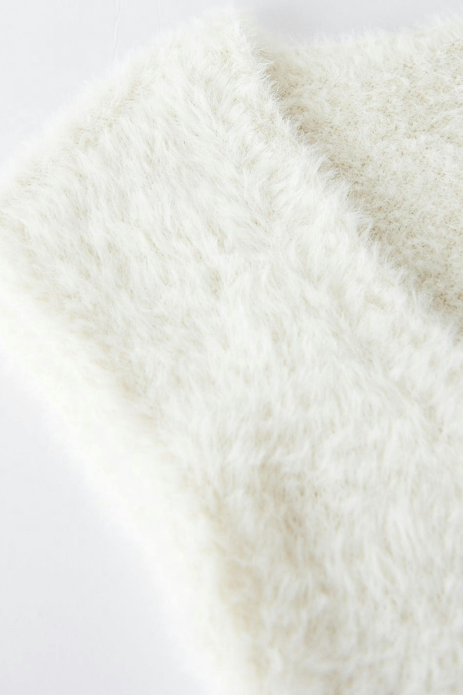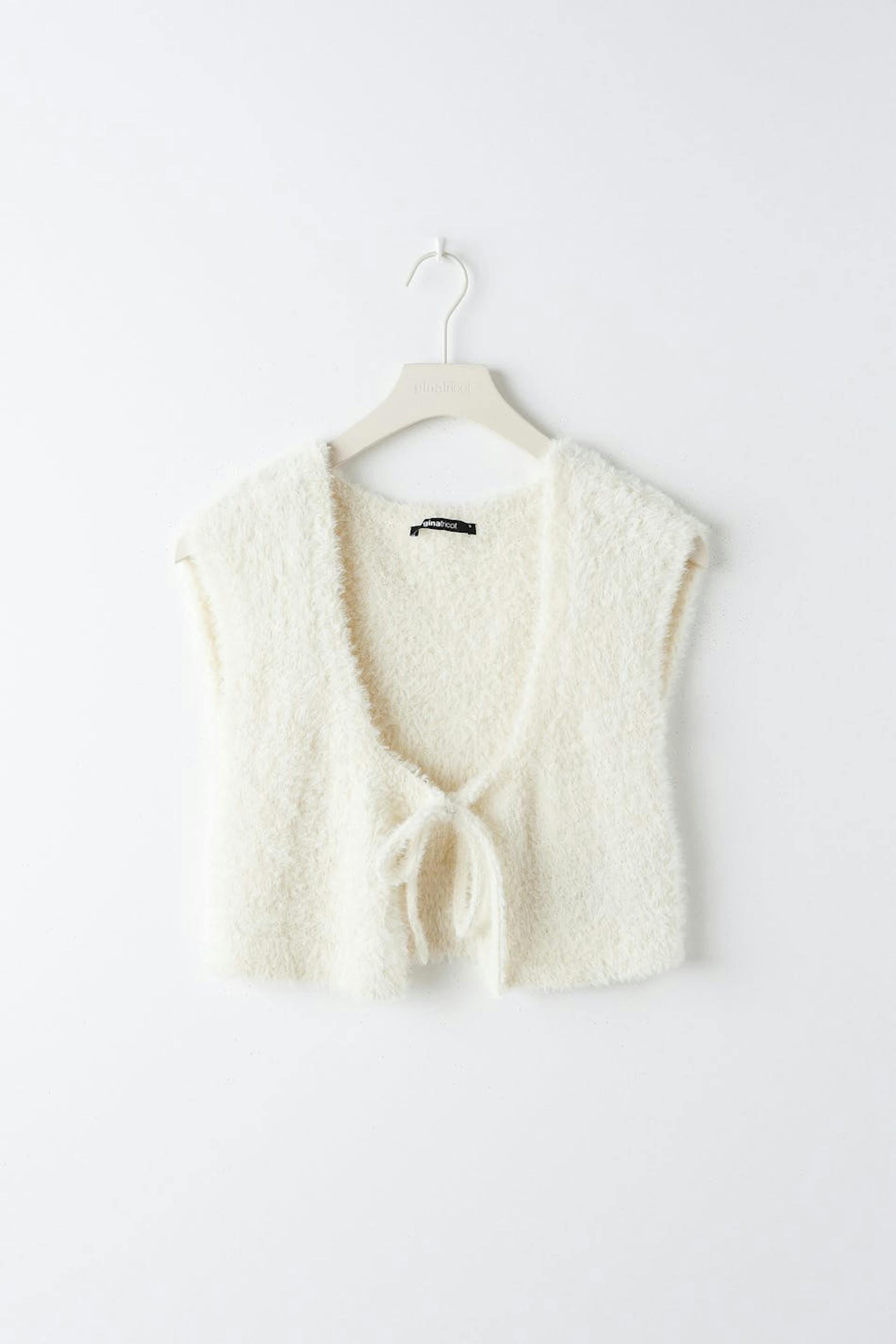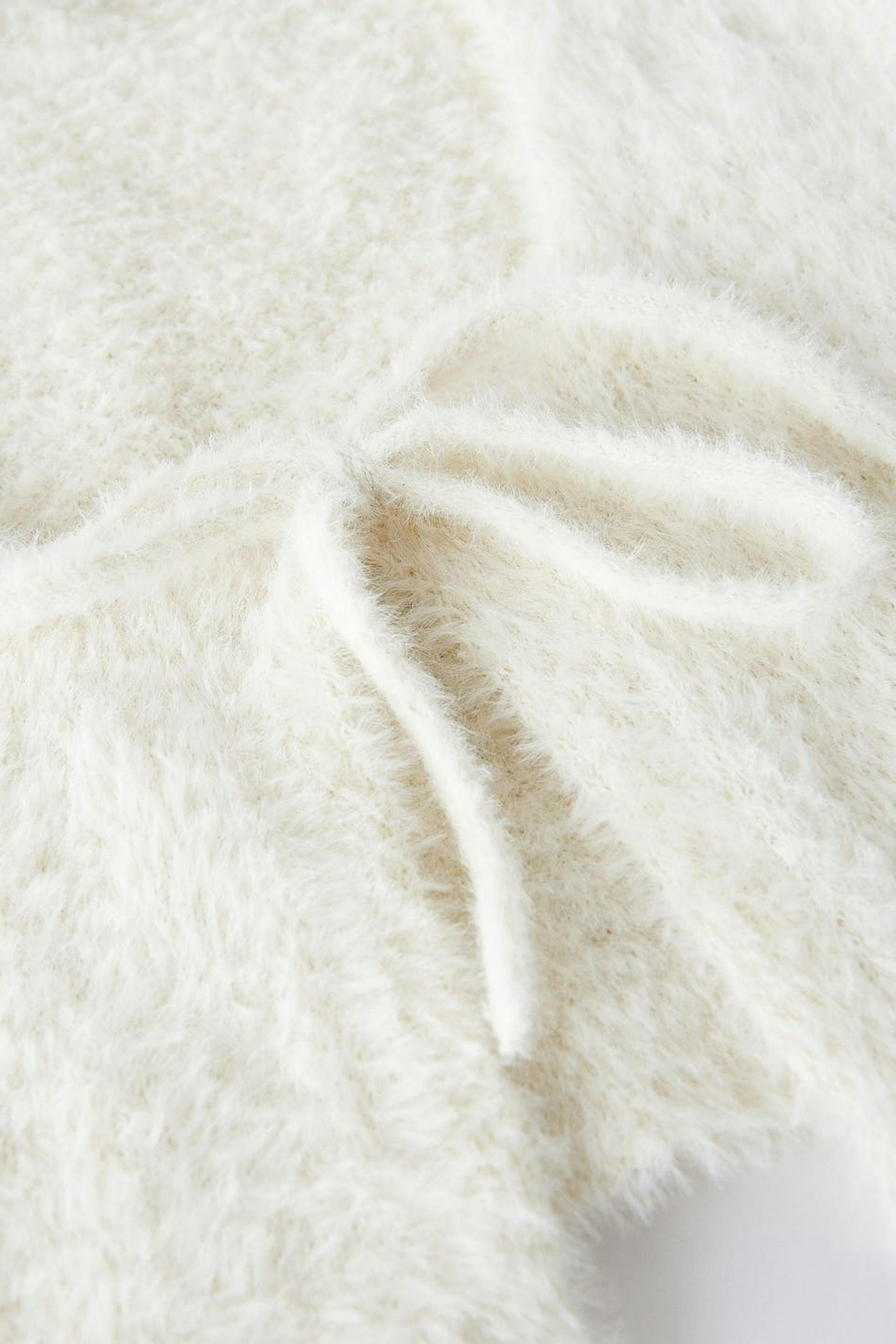 Pörröinen neuletakki lyhyillä hihoilla. Neuletakki on valkoinen, neulottu ja lyhyt. Siinä on solmuyksityiskohta edessä ja u-aukko.