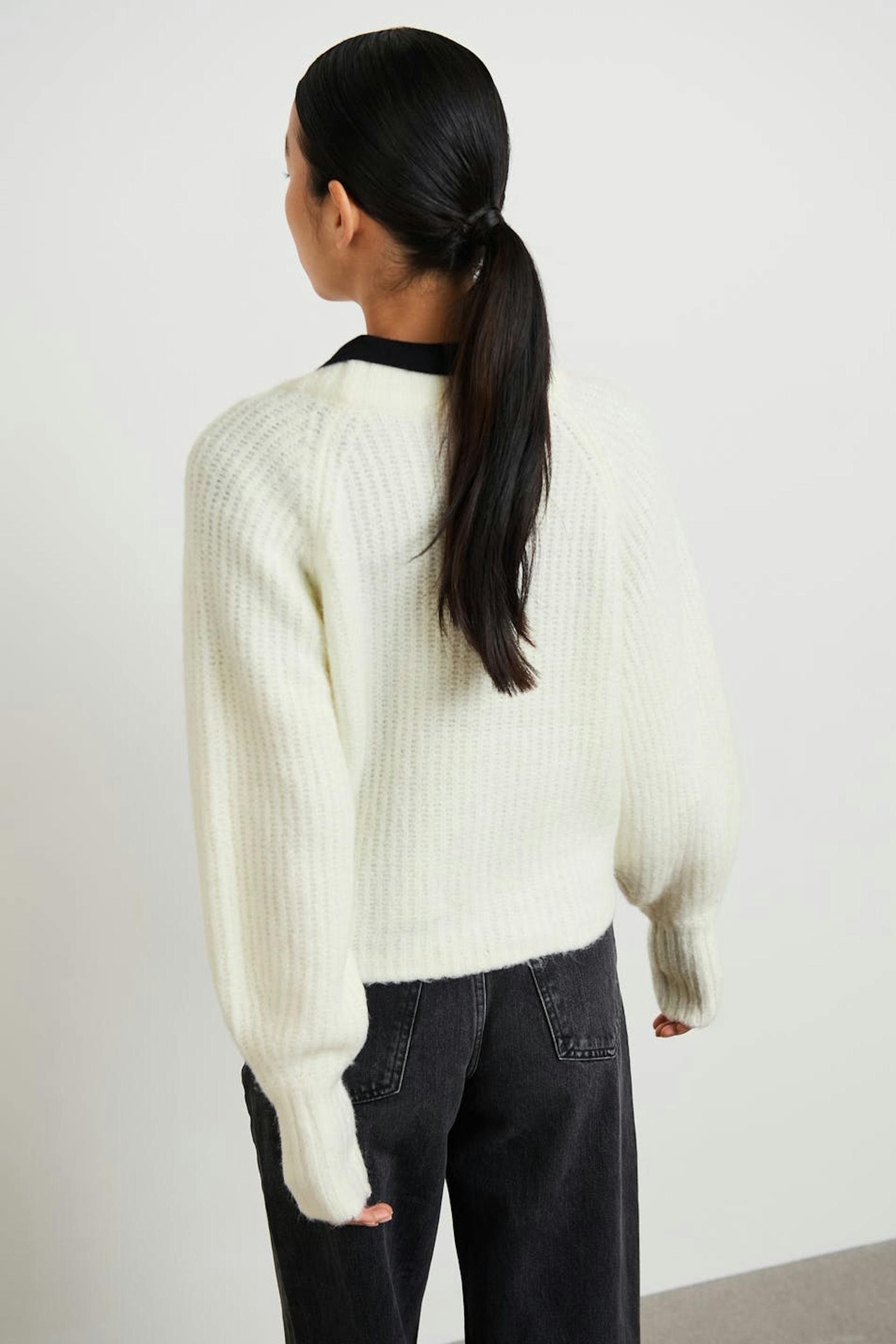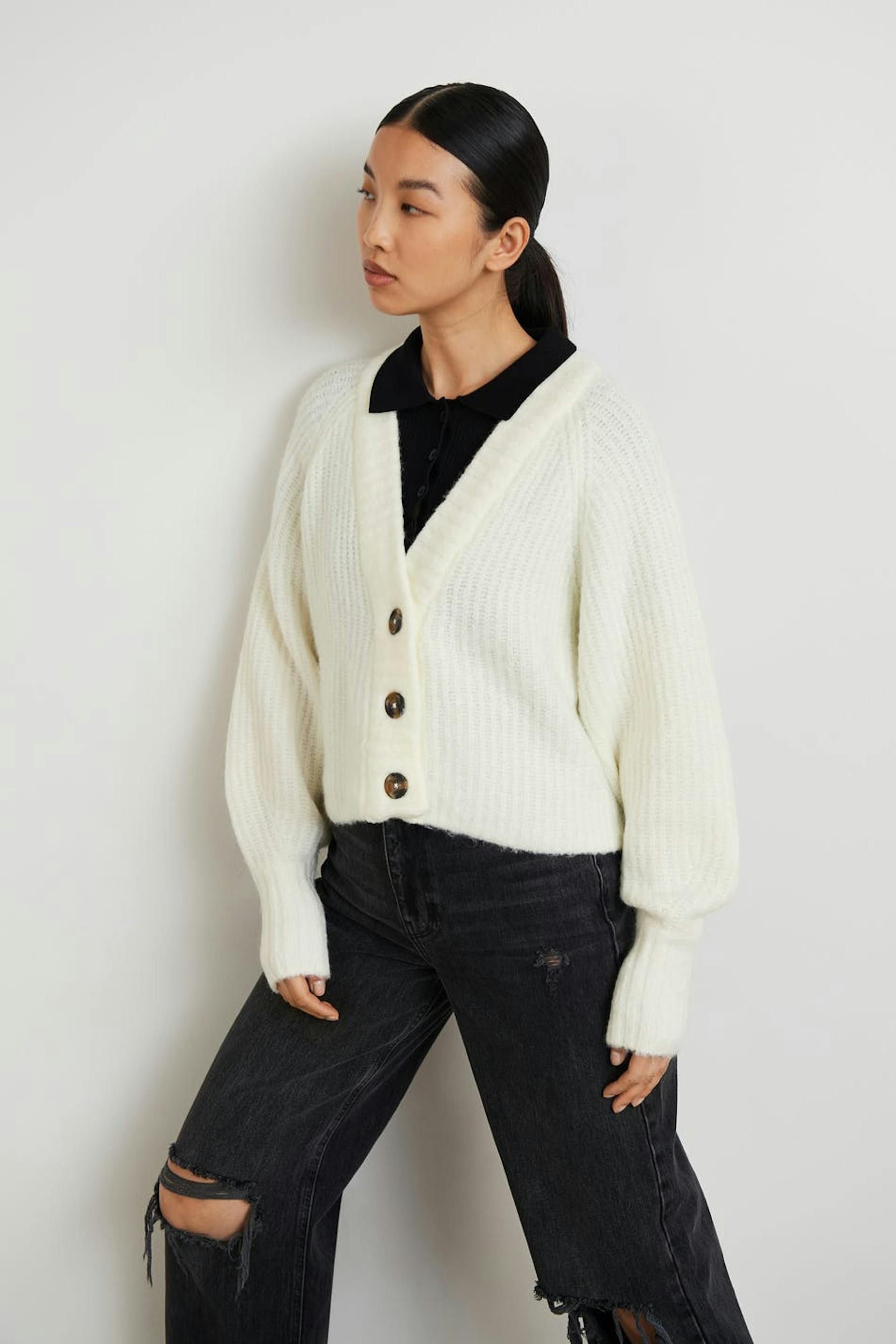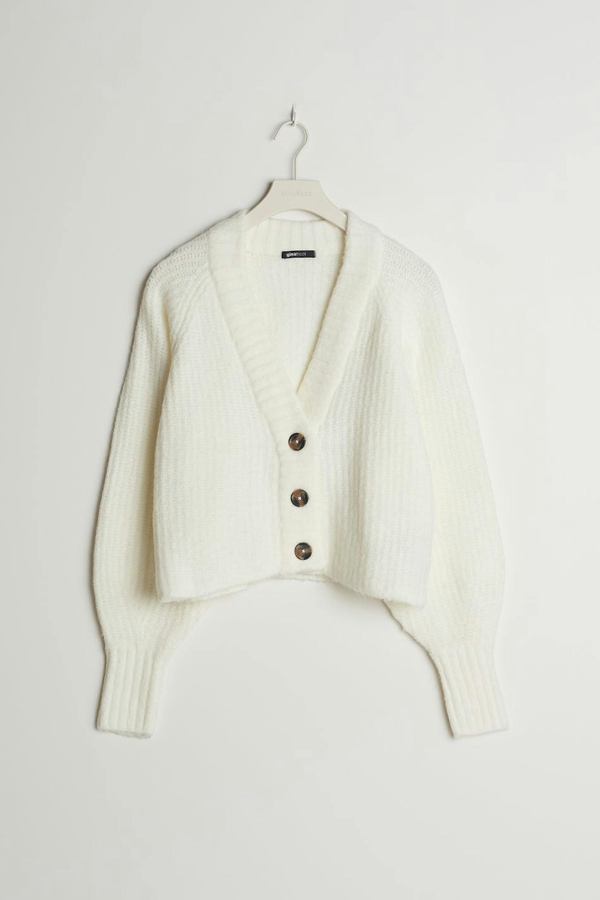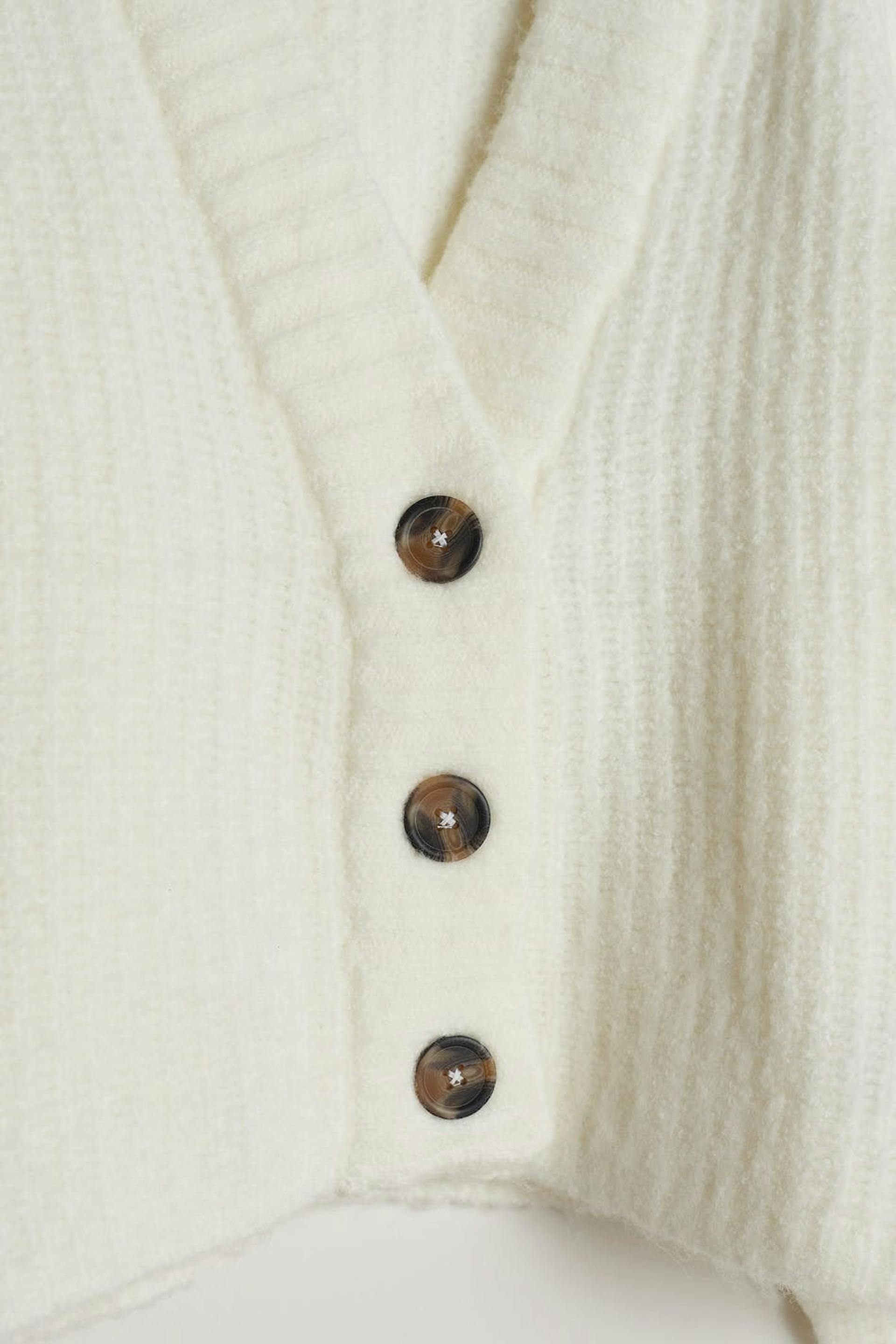 Neulottu neuletakki laatikkomallisella istuvuudella. Neuletakki on valkoinen, pitkähihainen ja cropattu. Siinä on V-aukko ja nappikiinnitys edessä.