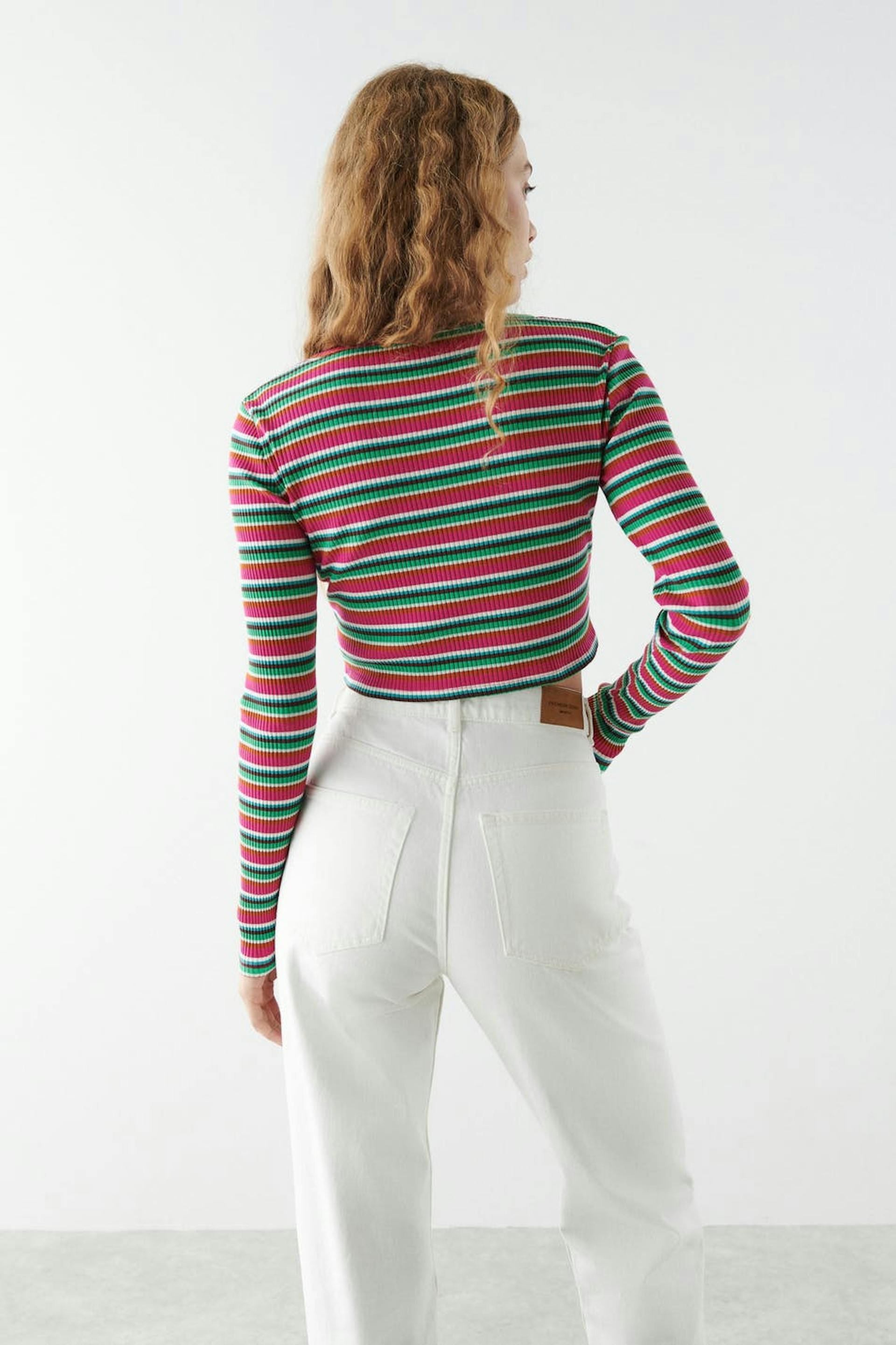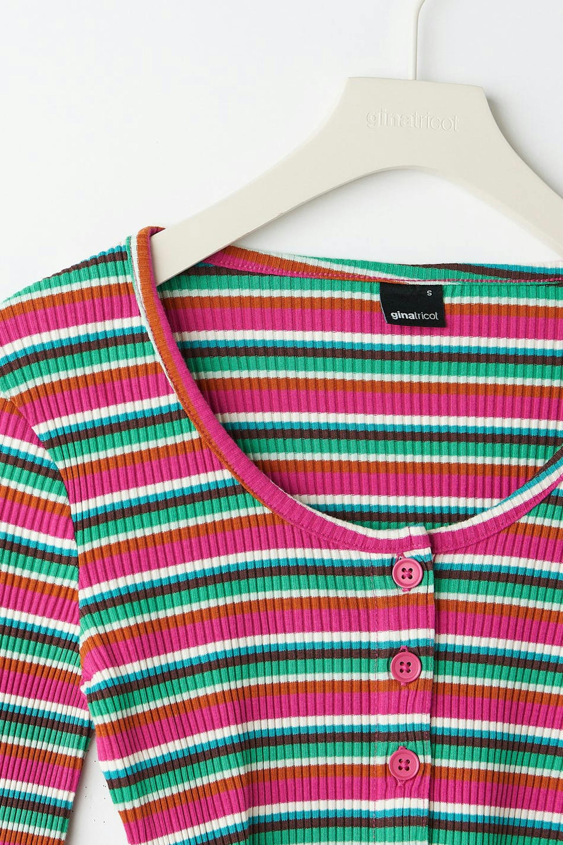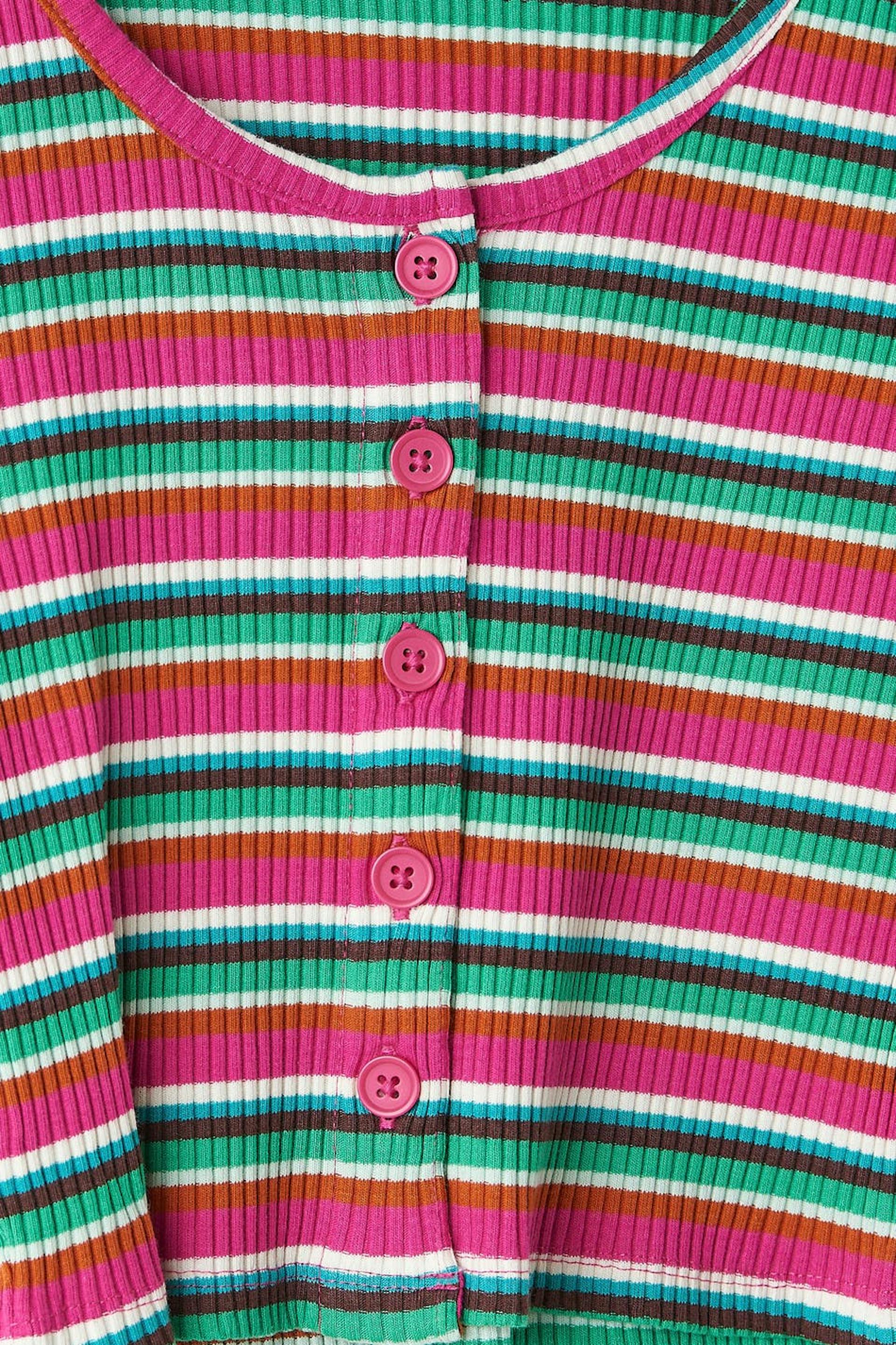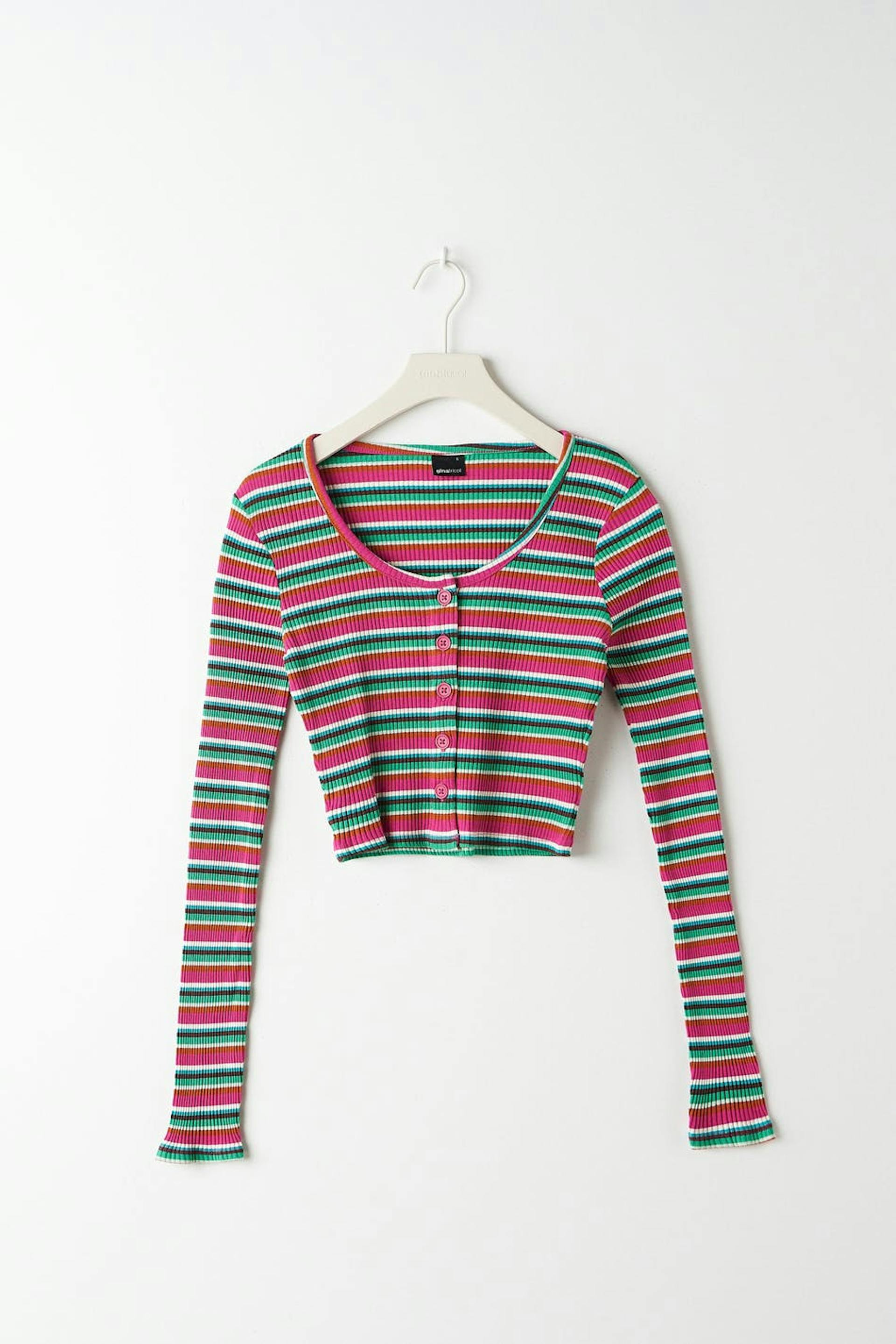 Raidallinen neuletakki napituslistalla edessä. Neuletakki on pinkki, vihreä ja lyhyt. Siinä on pitkät hihat, vartalonmyötäinen istuvuus ja ribattu laatu.