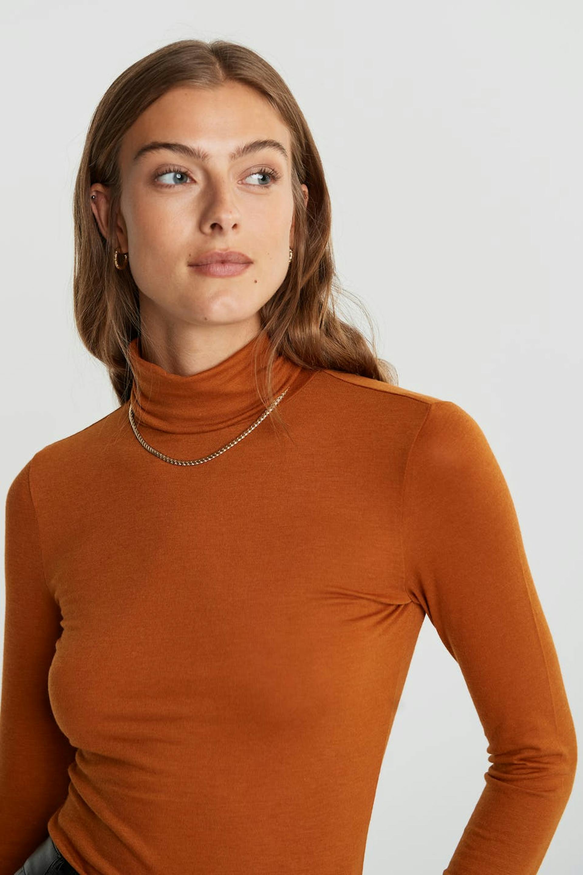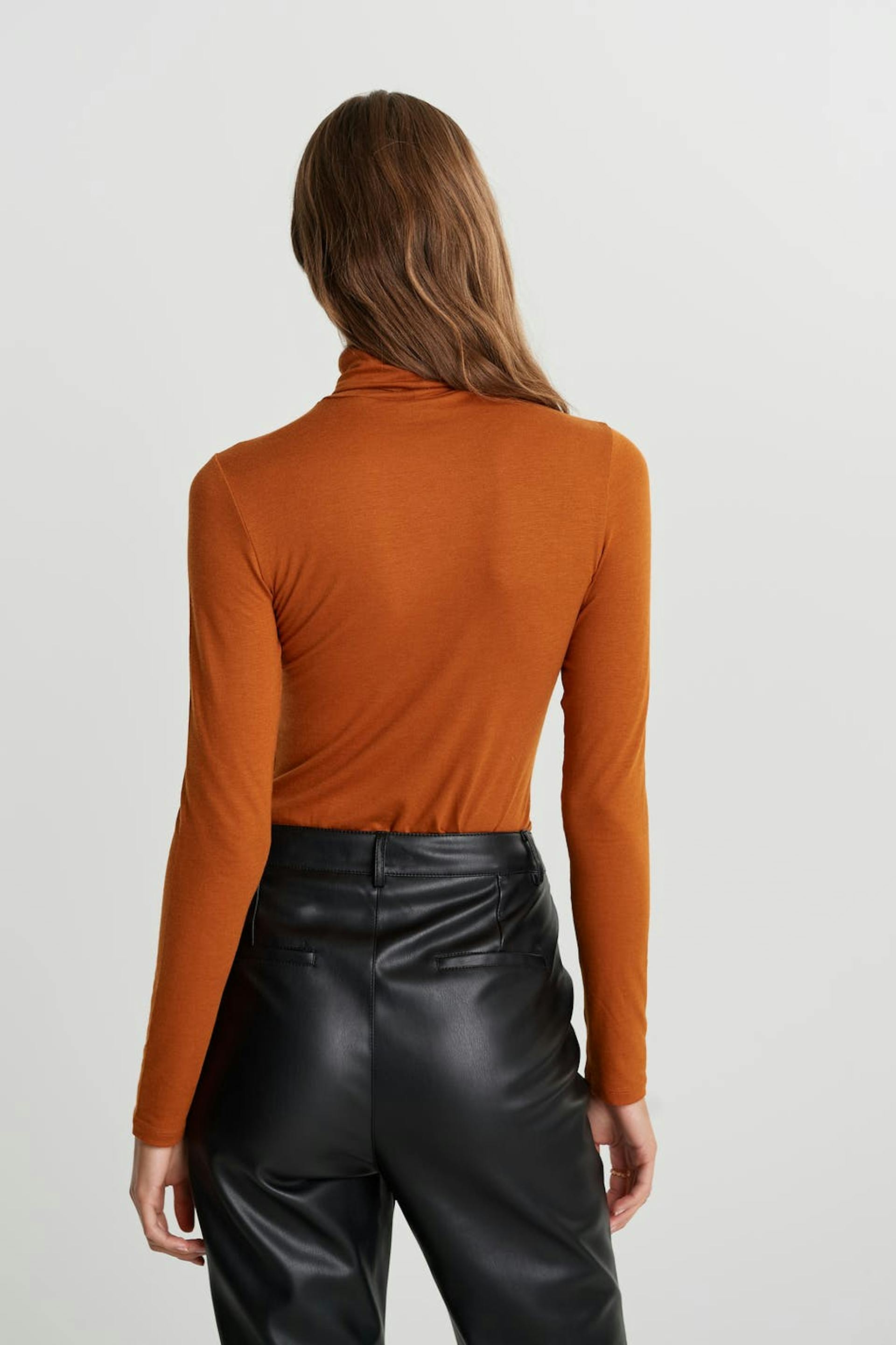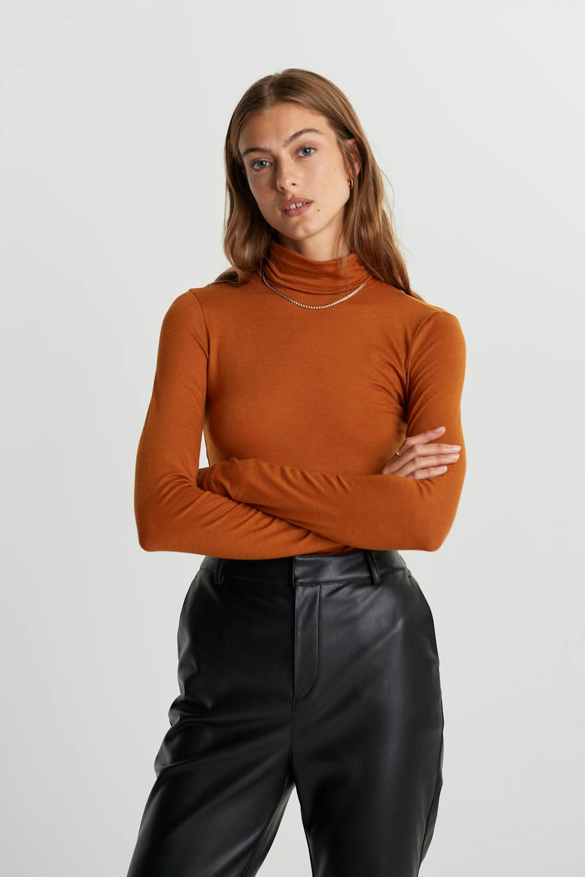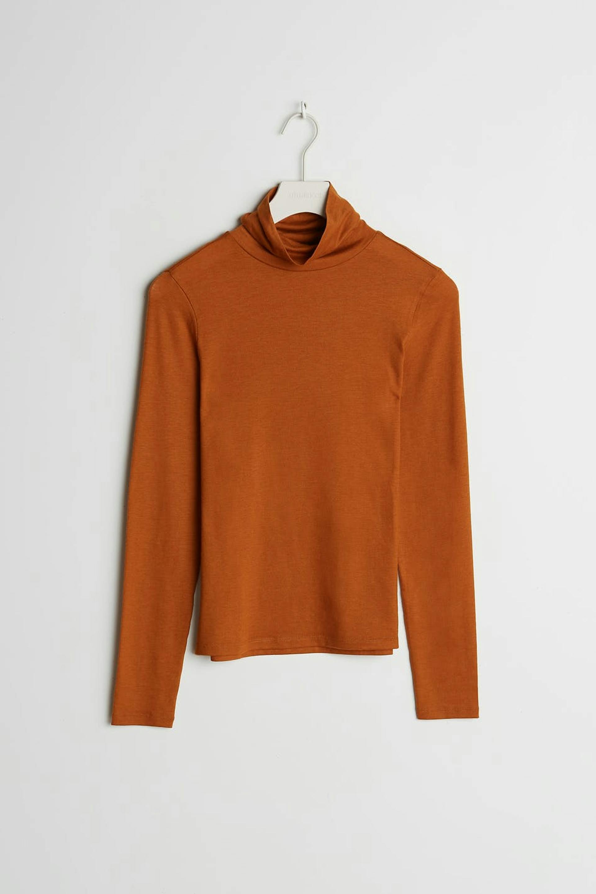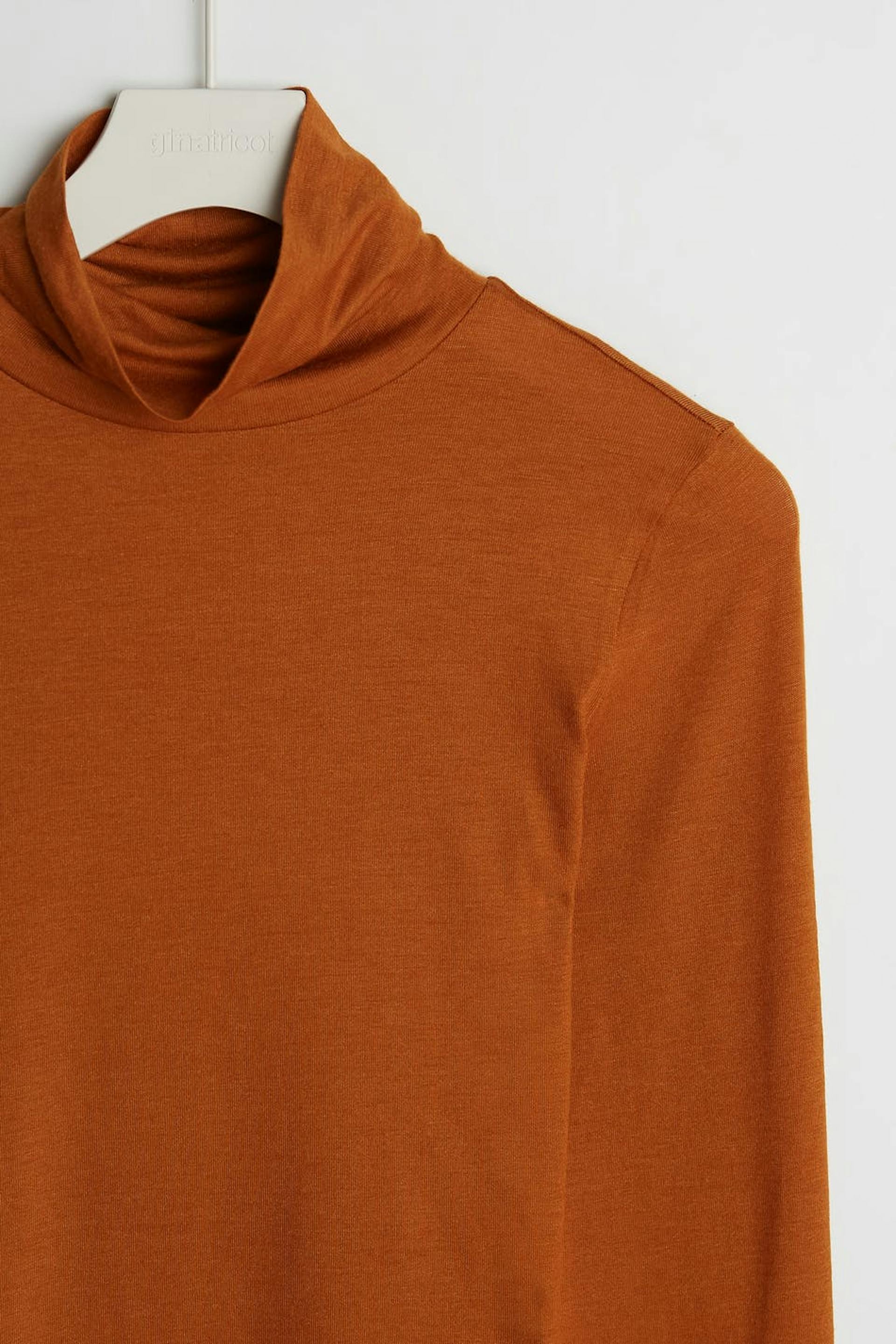 Pehmeä poolokauluspaita vartalonmyötäisellä istuvuudella. Villapaita on oranssi.