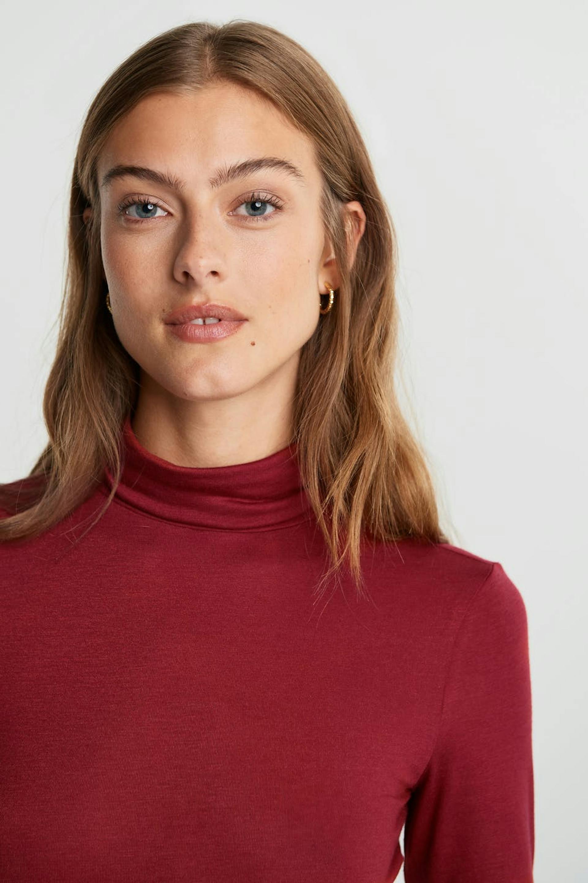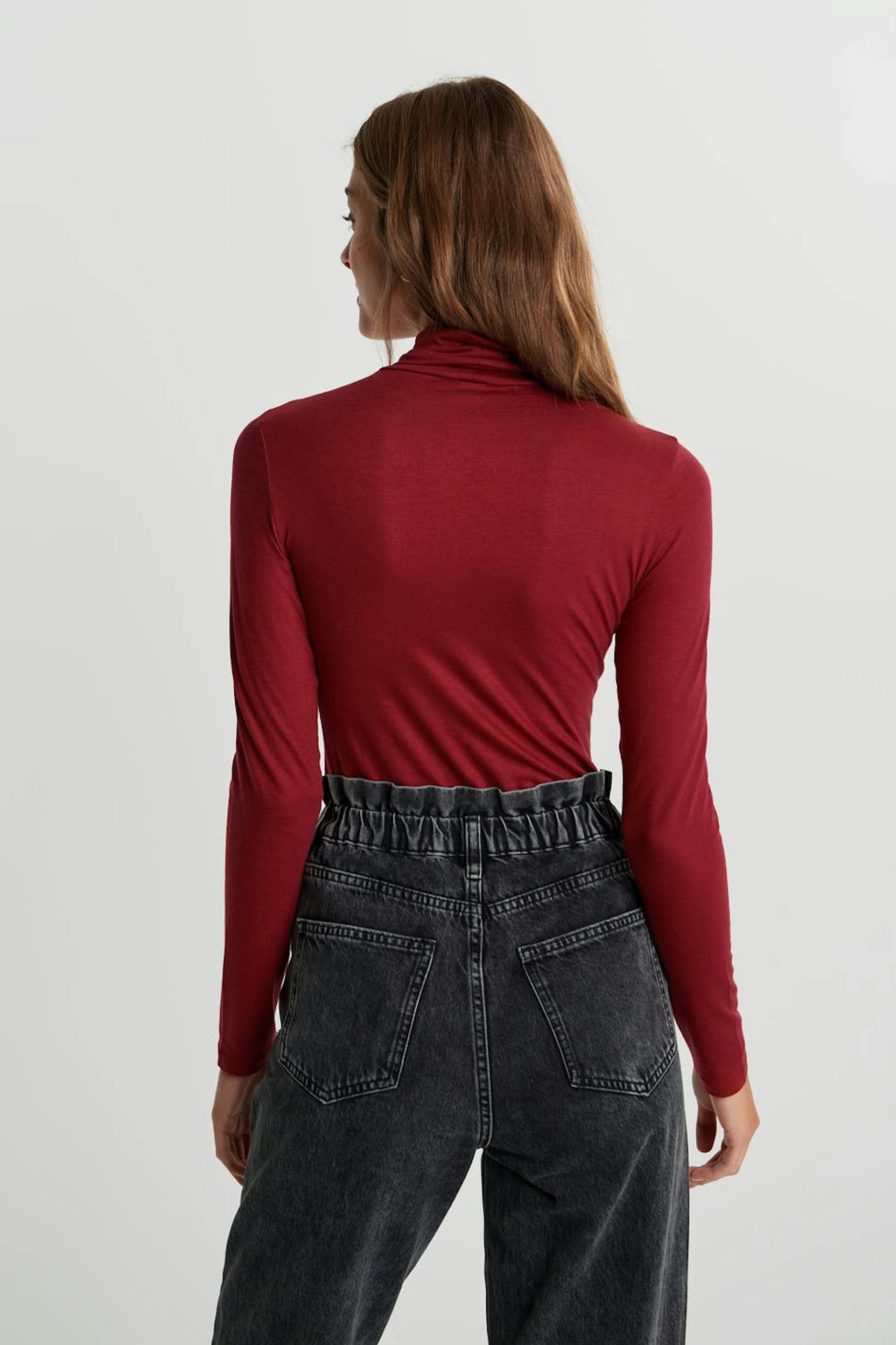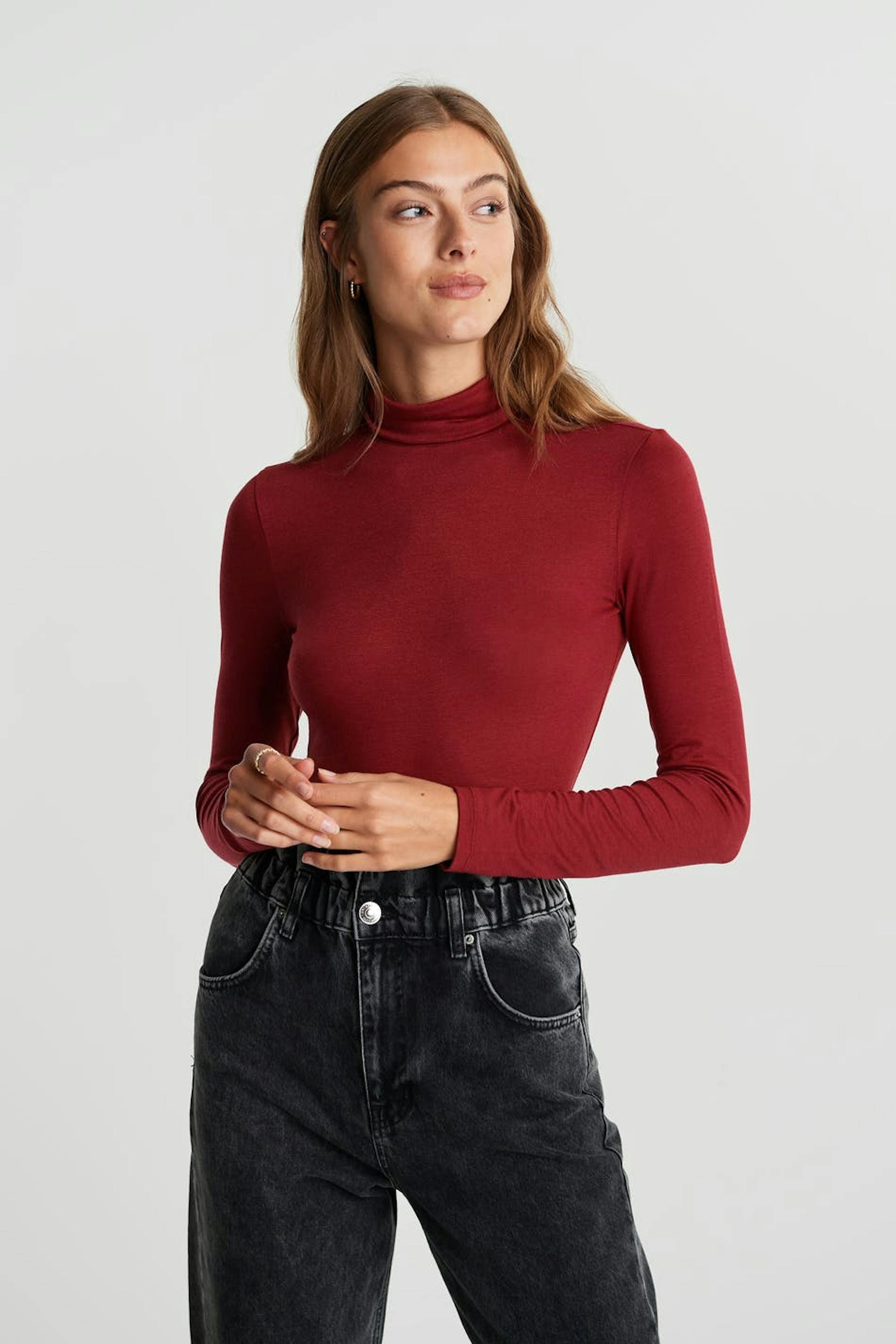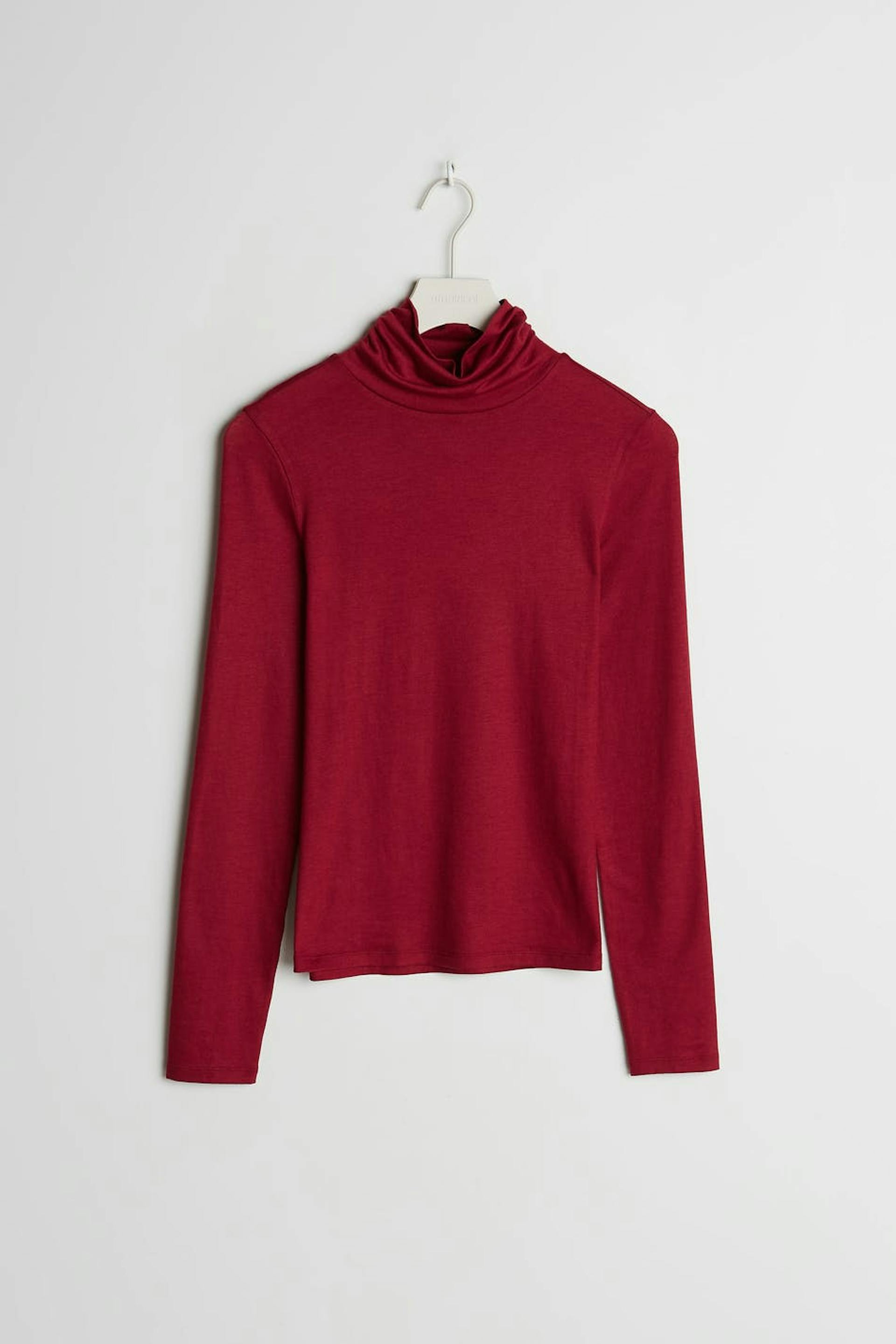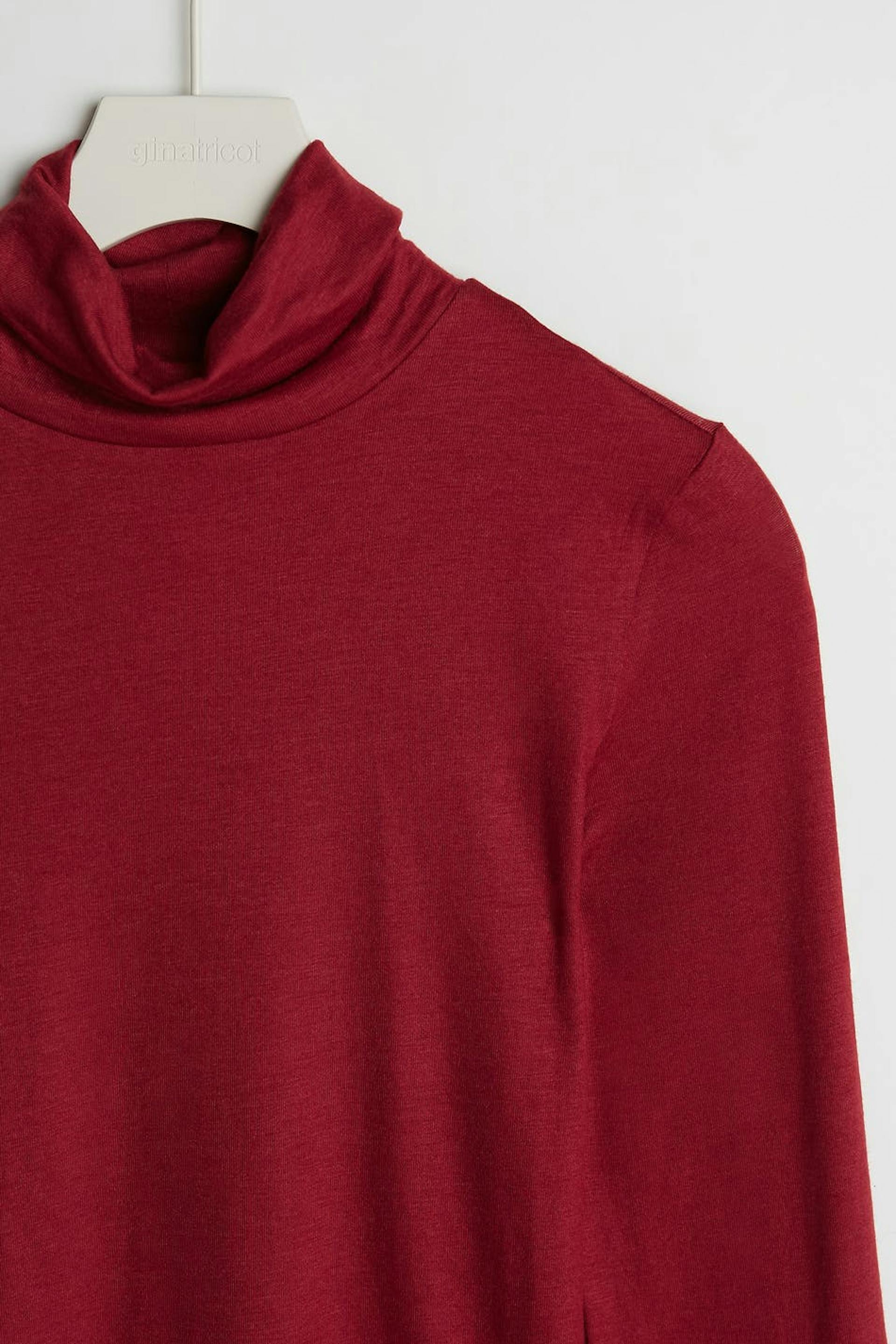 Pehmeä poolokauluspaita vartalonmyötäisellä istuvuudella. Villapaita on punainen.