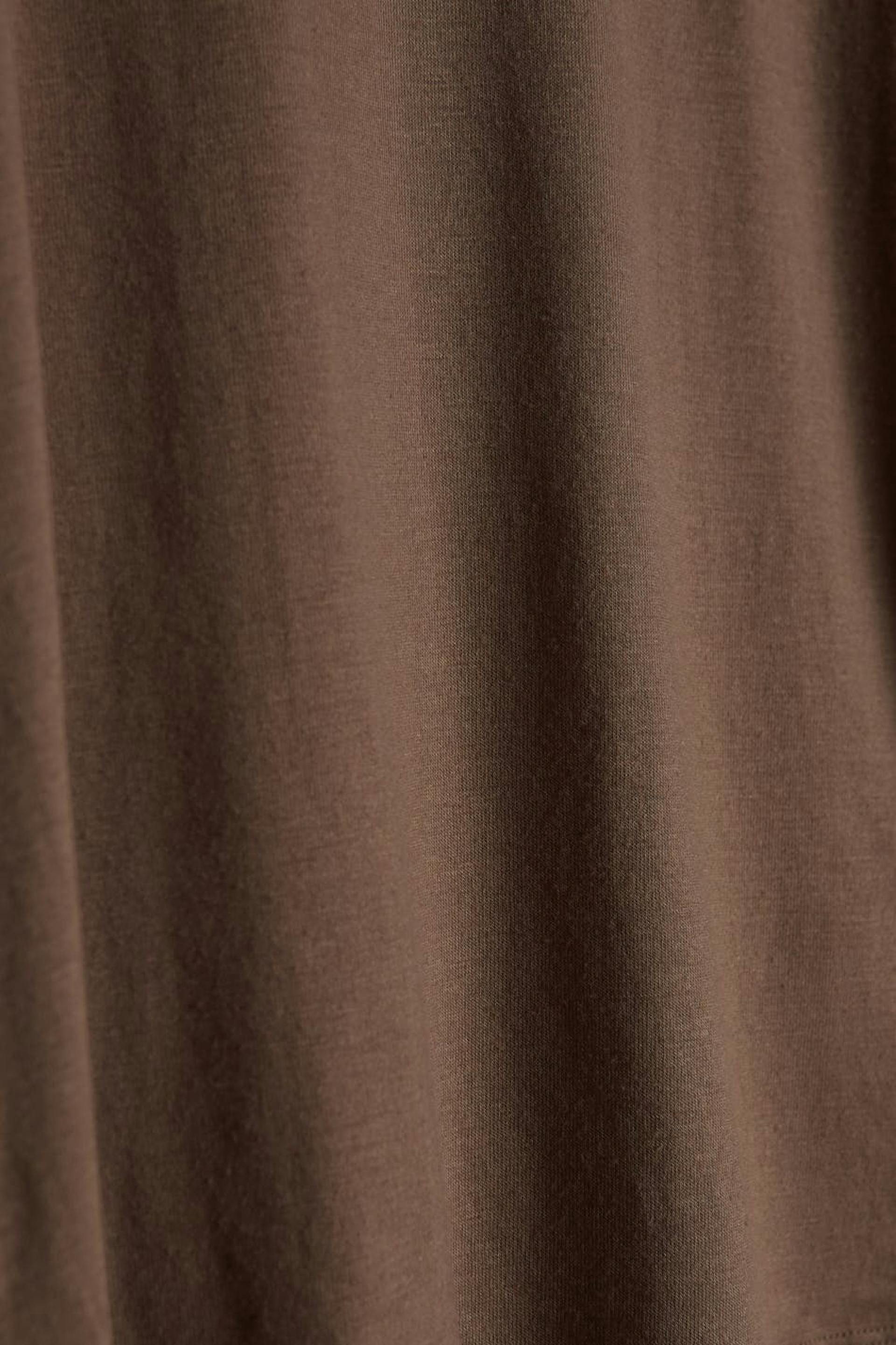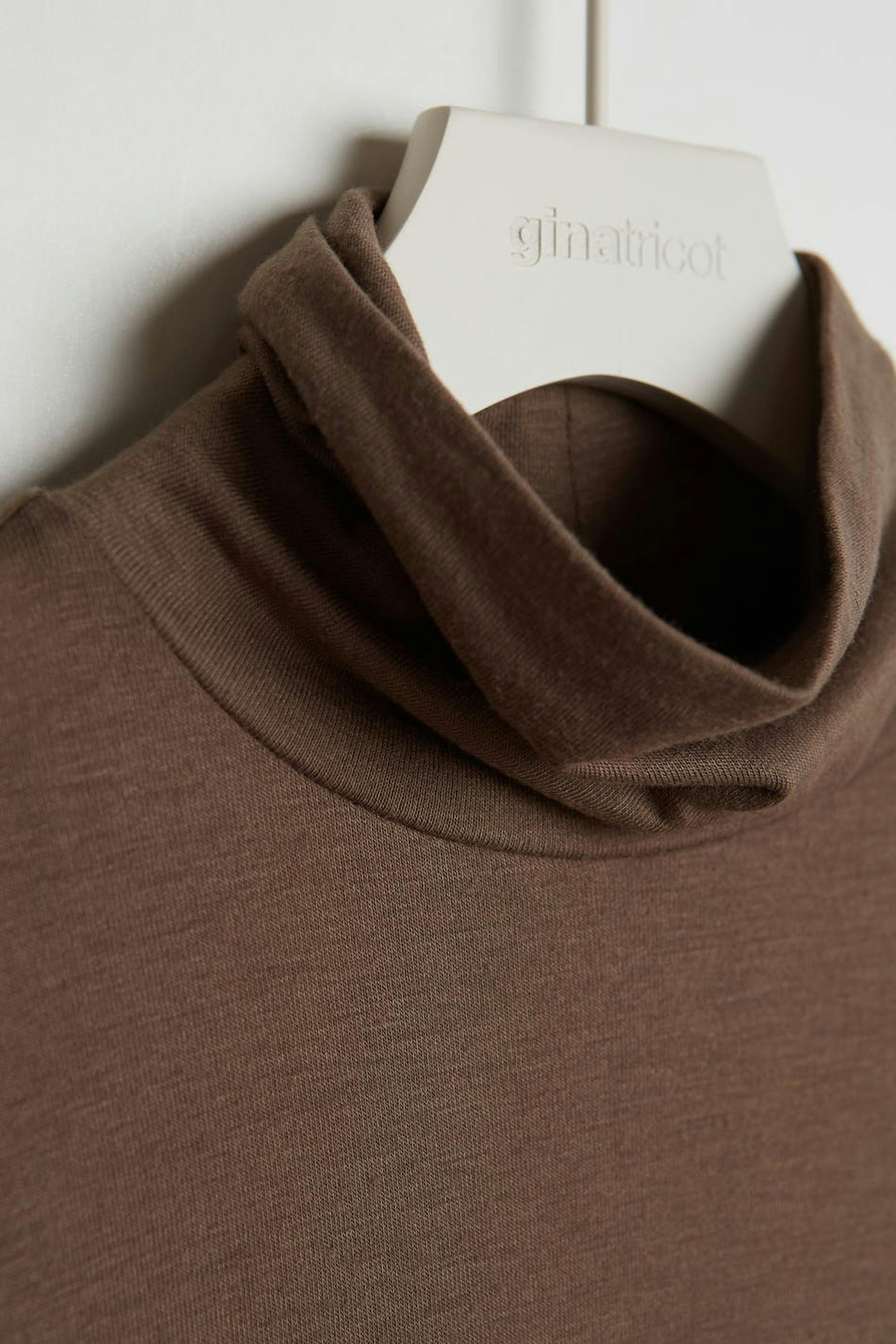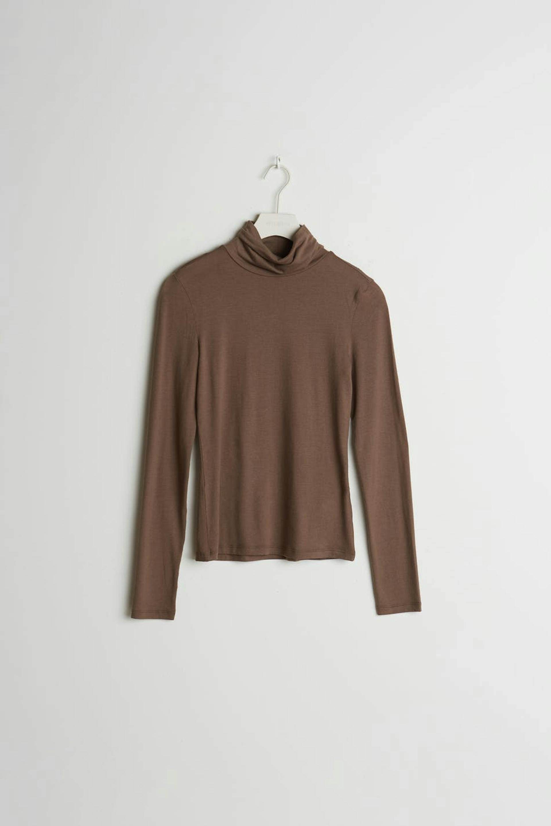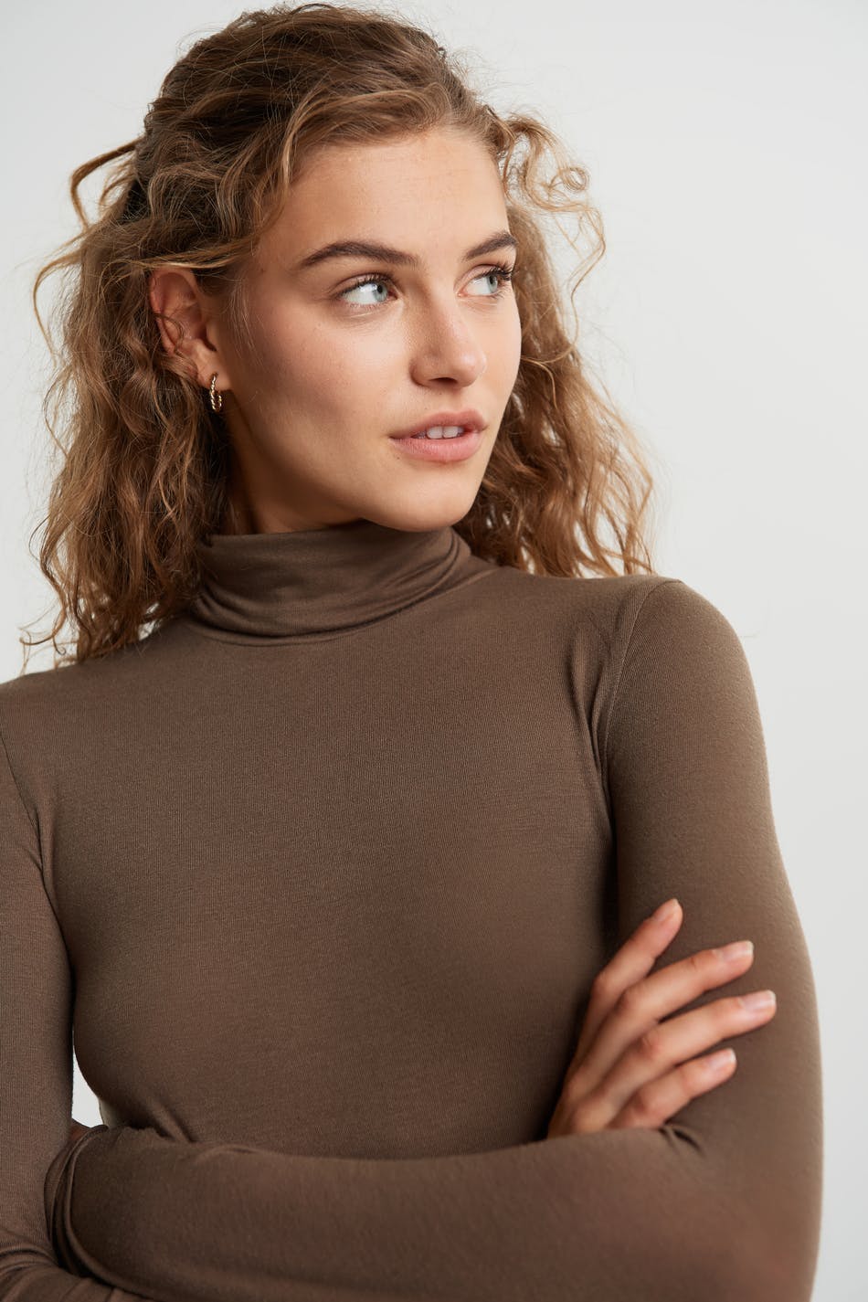 Pehmeä poolo vartalonmyötäisellä istuvuudella. Toppi on ruskea.