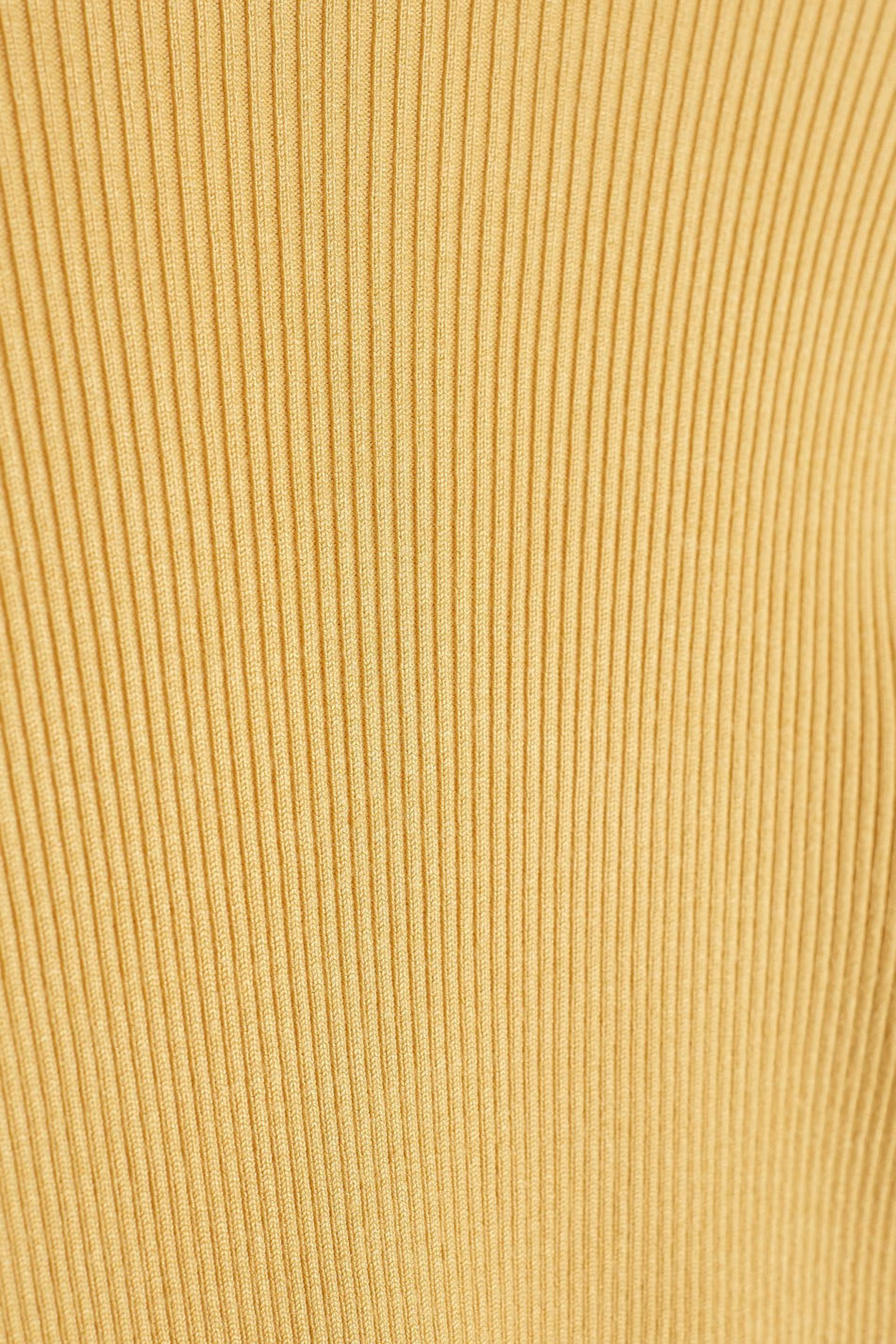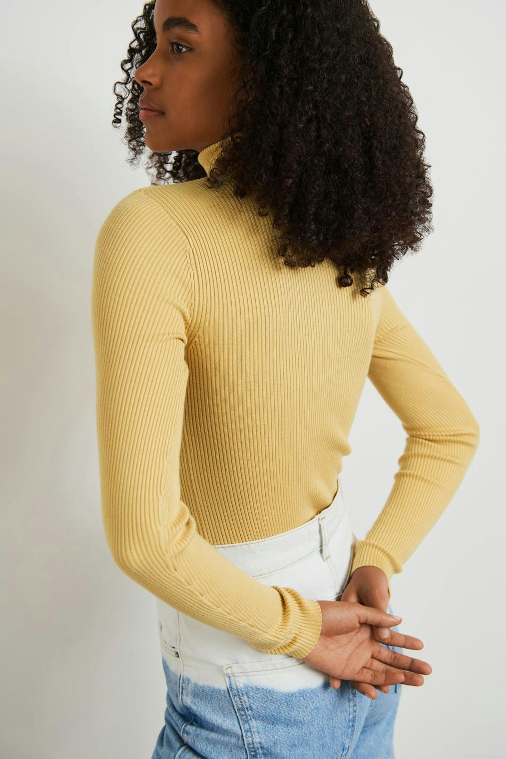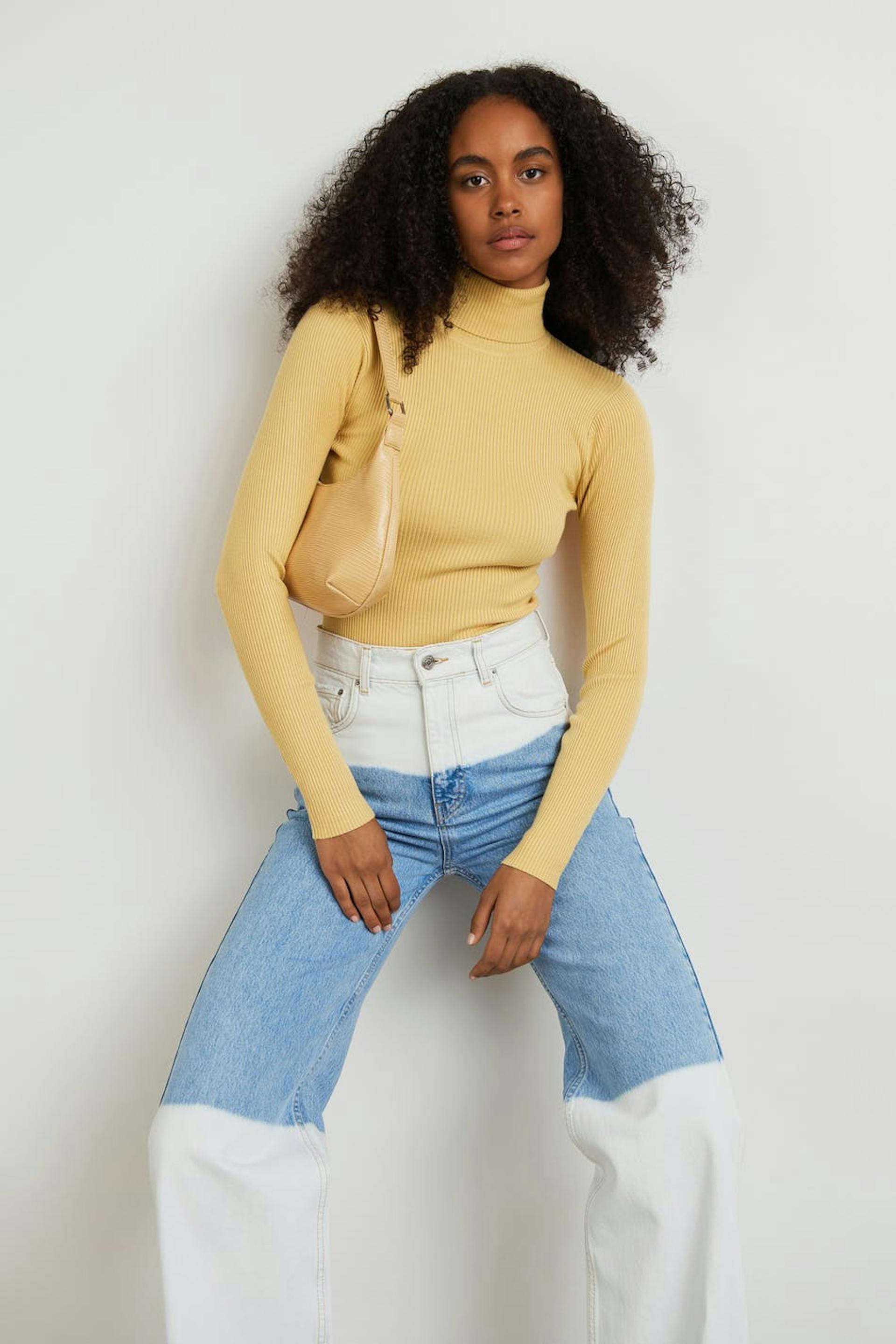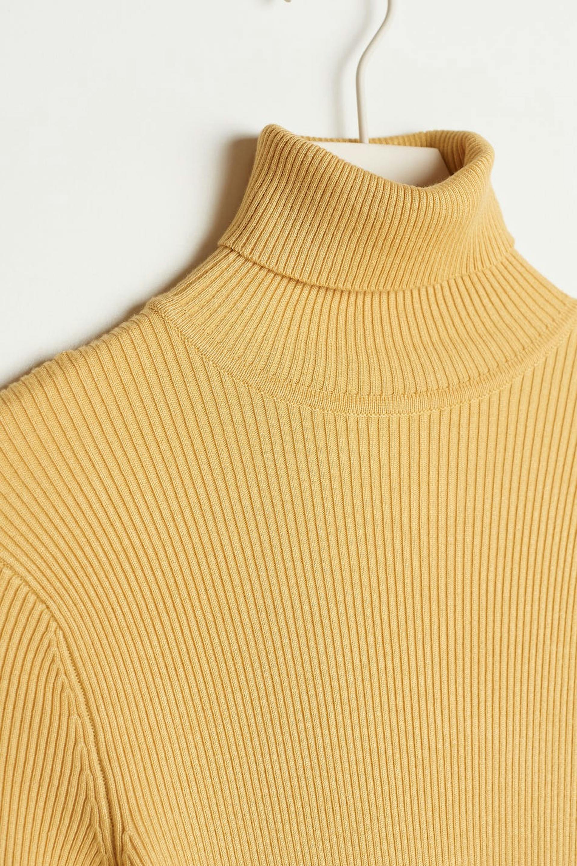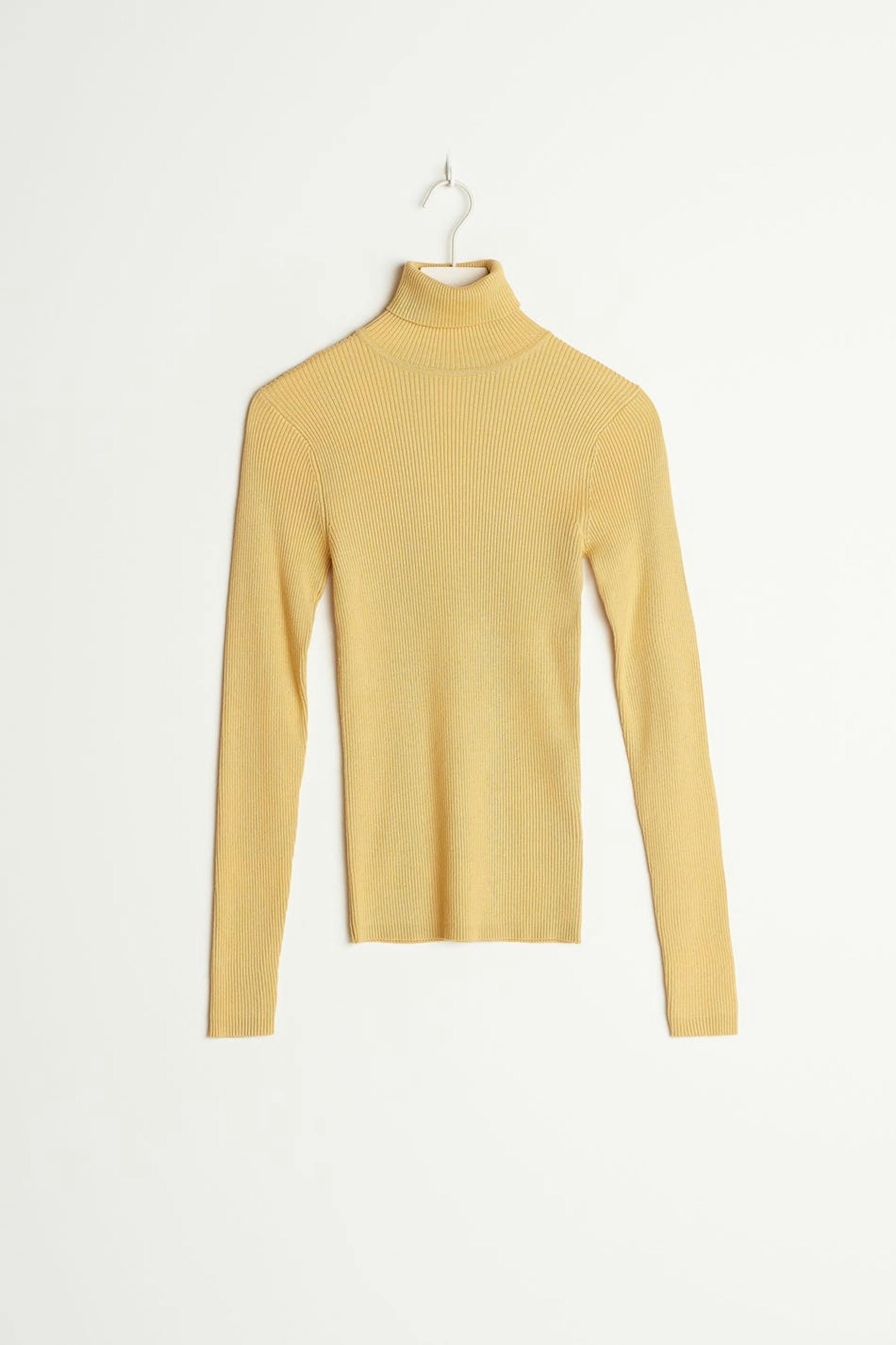 Neulottu toppi poolokauluksella. Toppi on keltainen, pitkähihainen ja resorimainen.