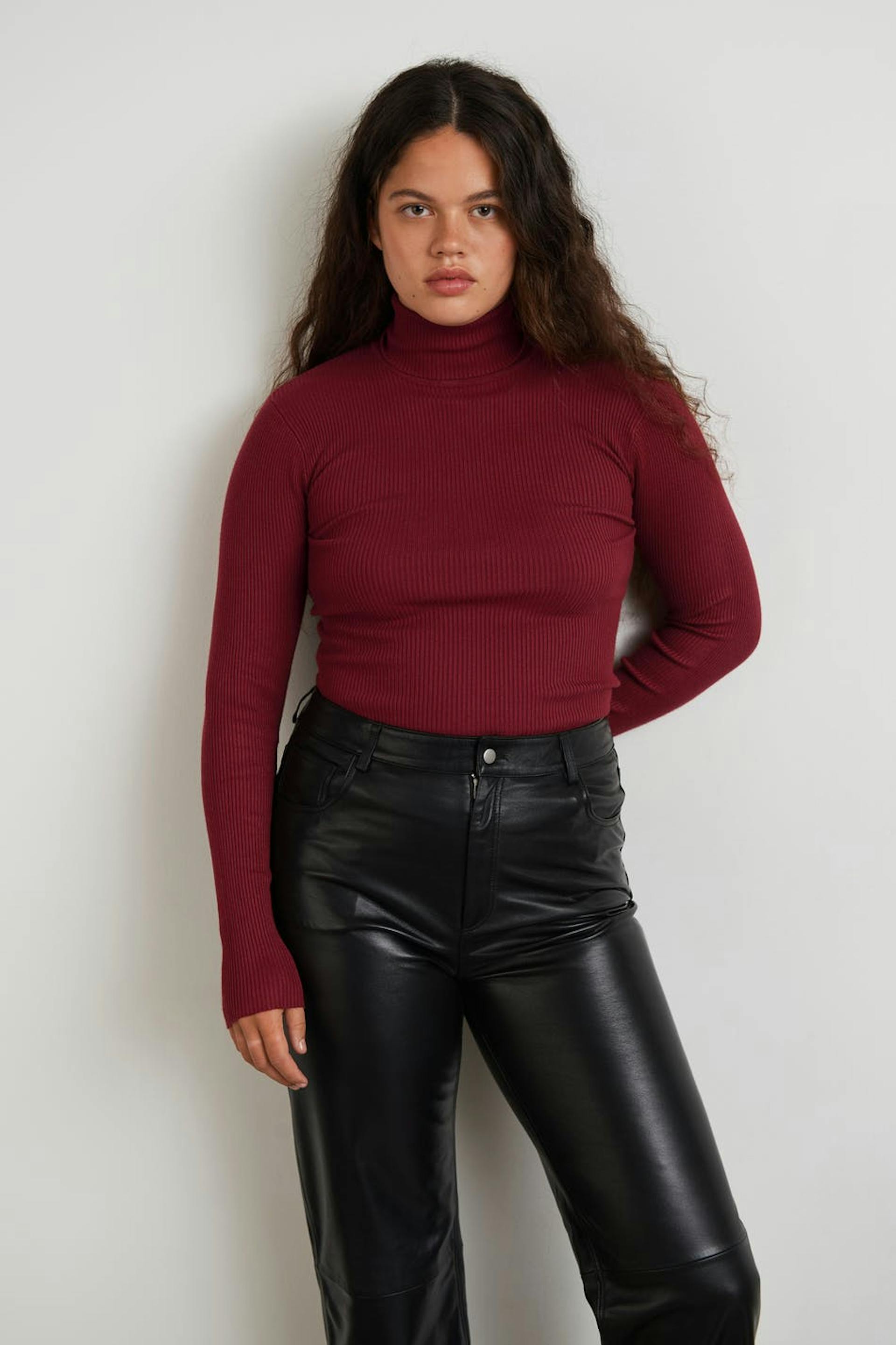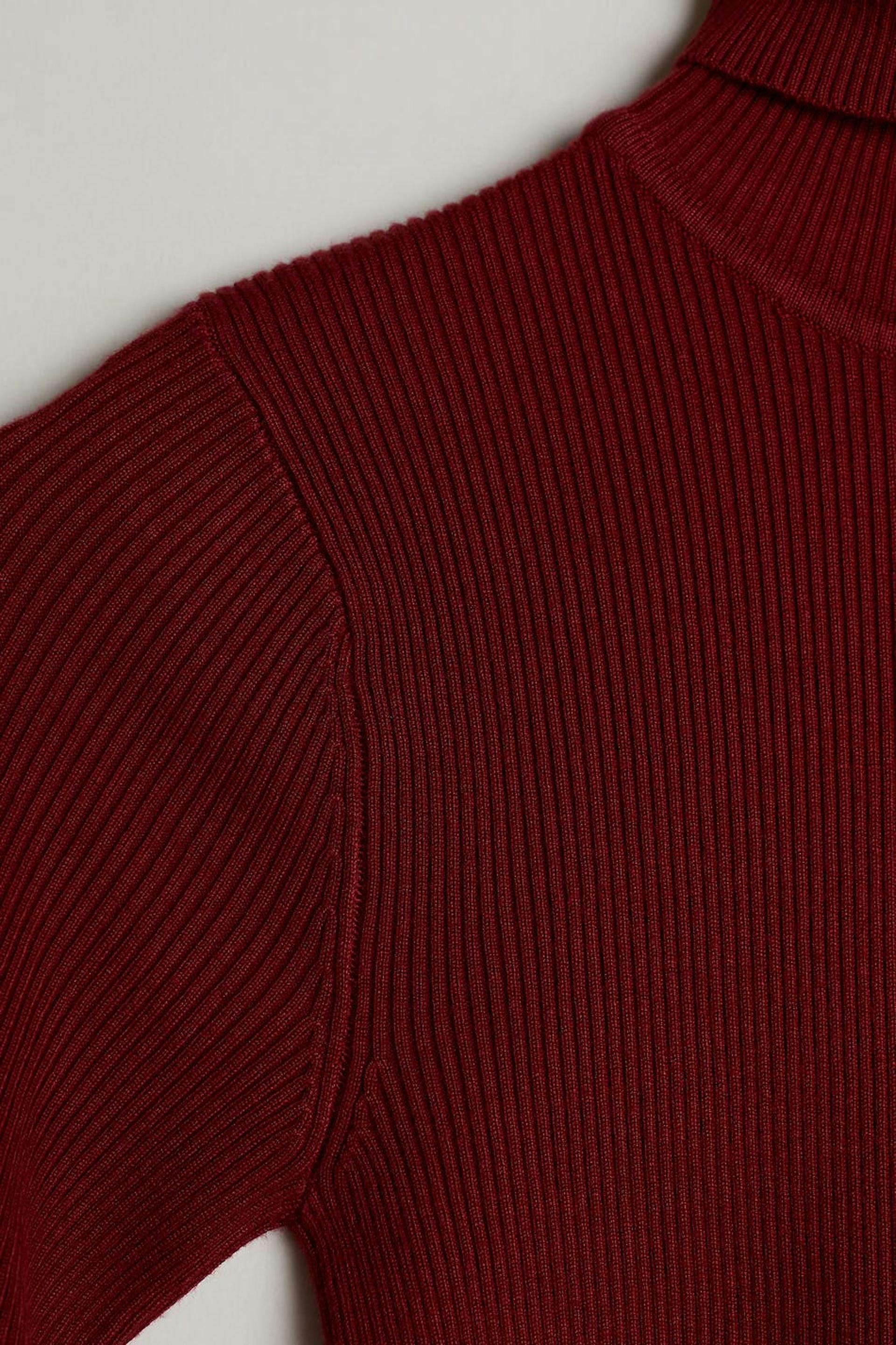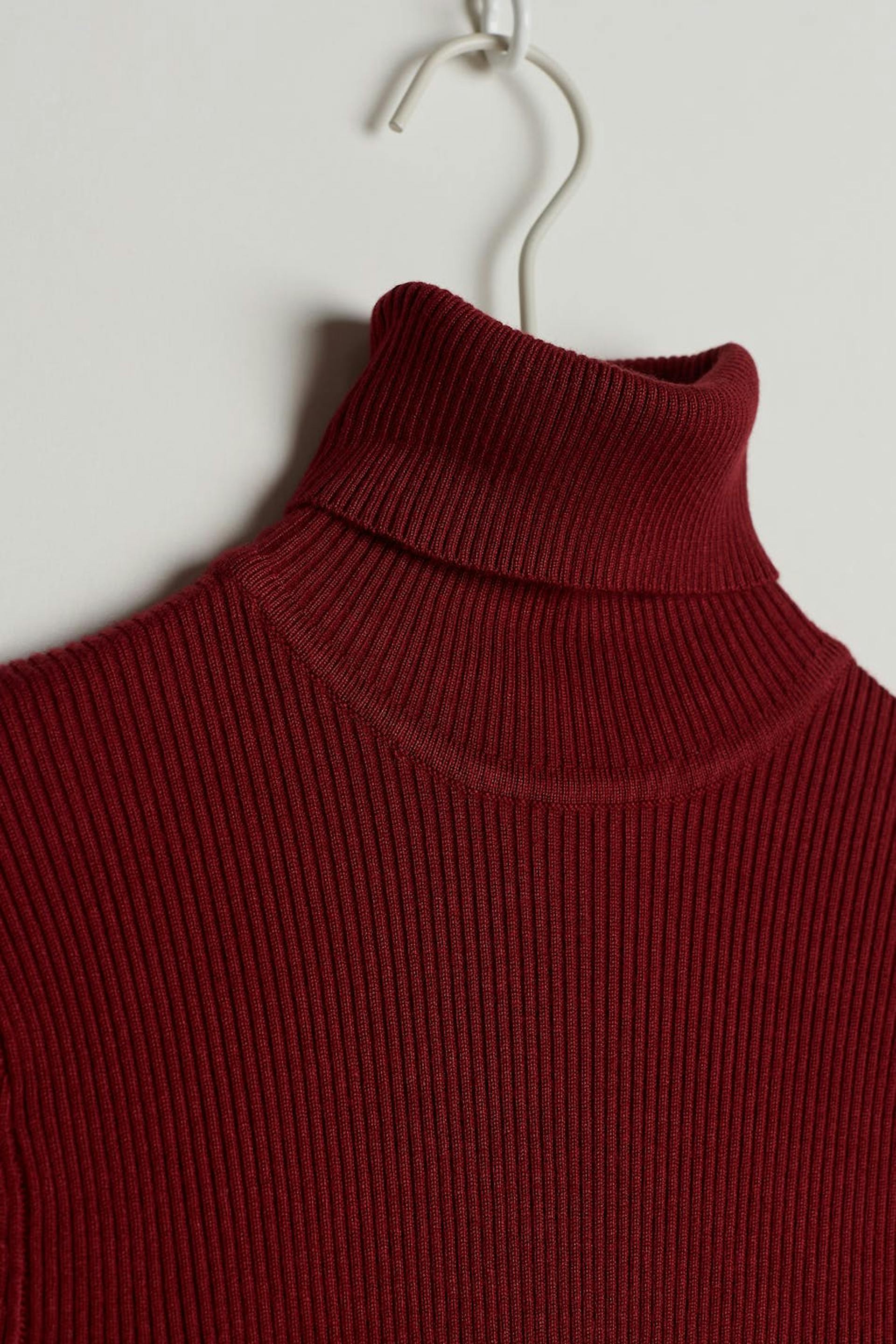Neulottu toppi poolokauluksella. Toppi on punainen, pitkähihainen ja resorimainen.