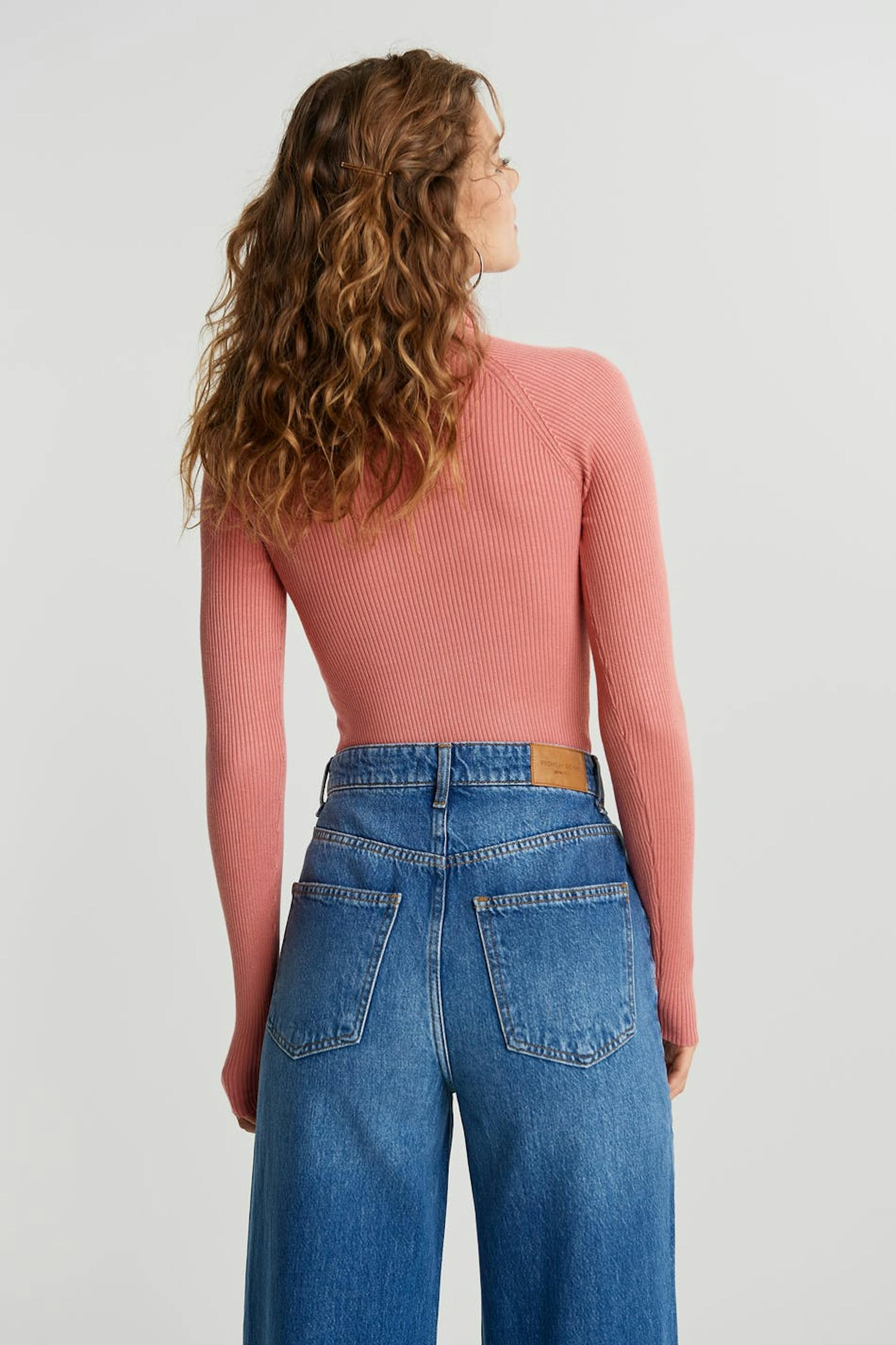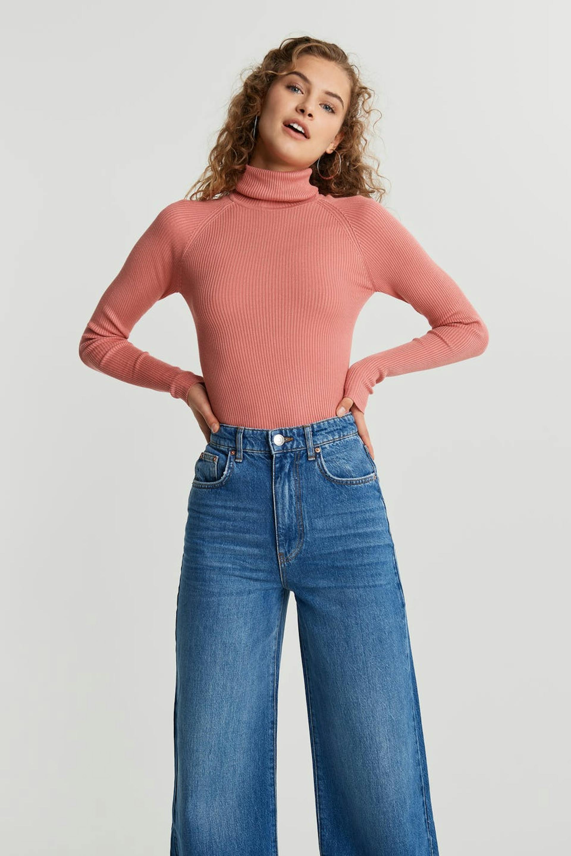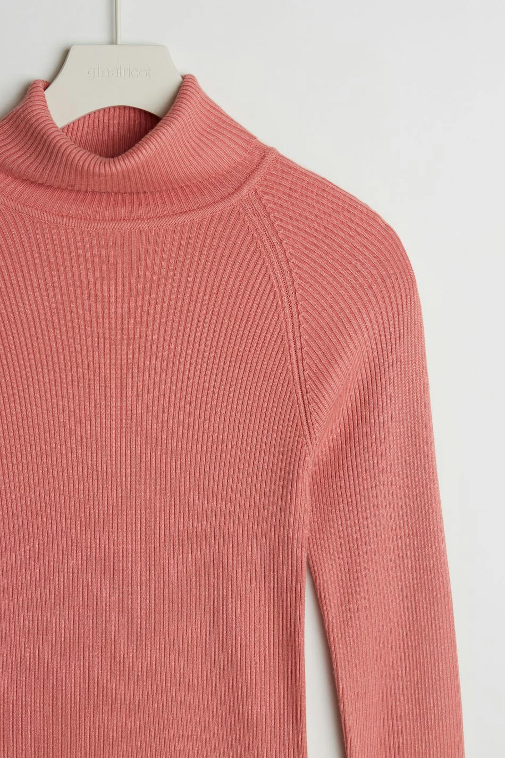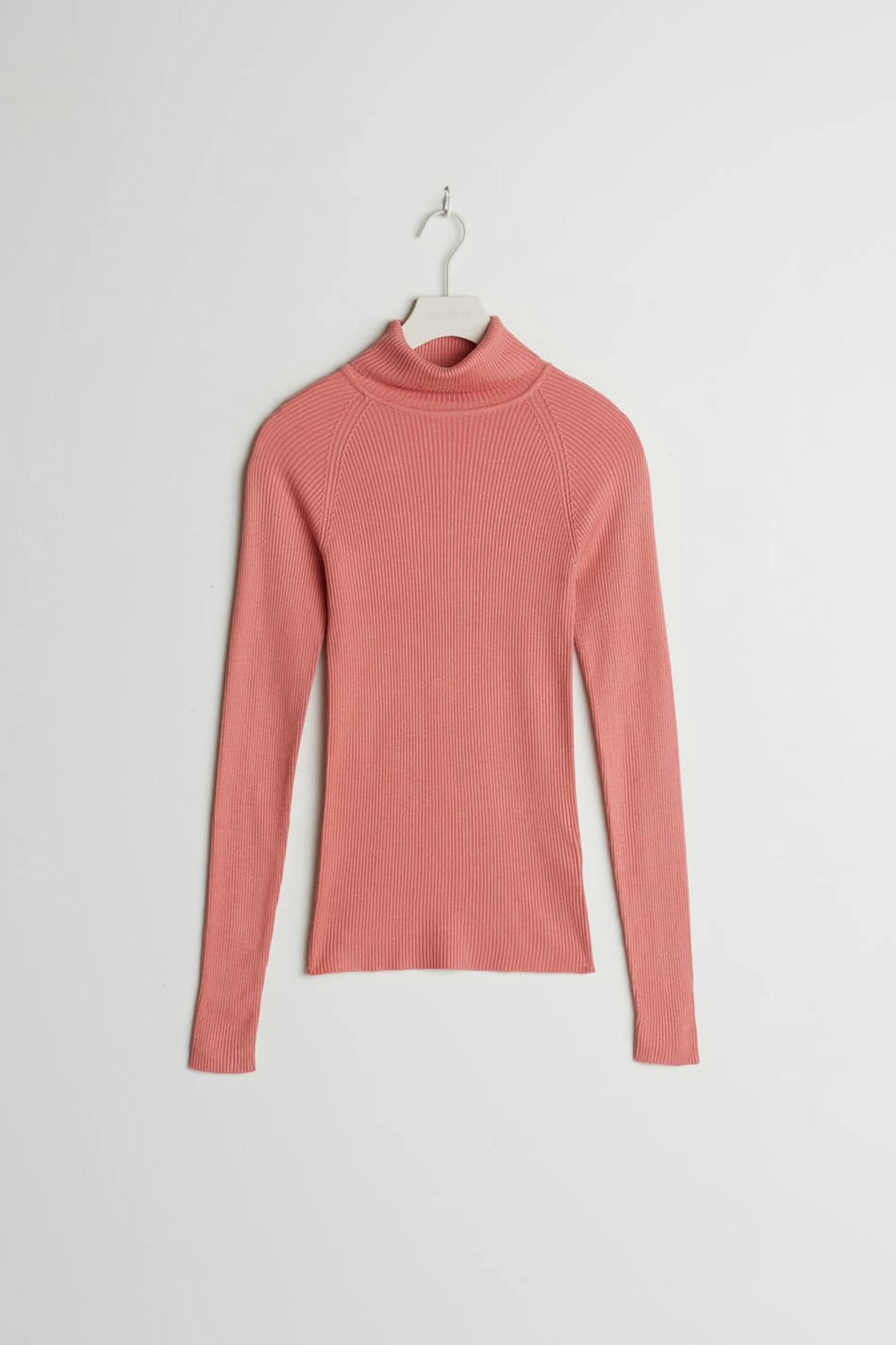 Resorimainen villapaita taitellulla poolokauluksella. Villapaita on pinkki ja pitkähihainen ja siinä on vartalonmyötäinen istuvuus.