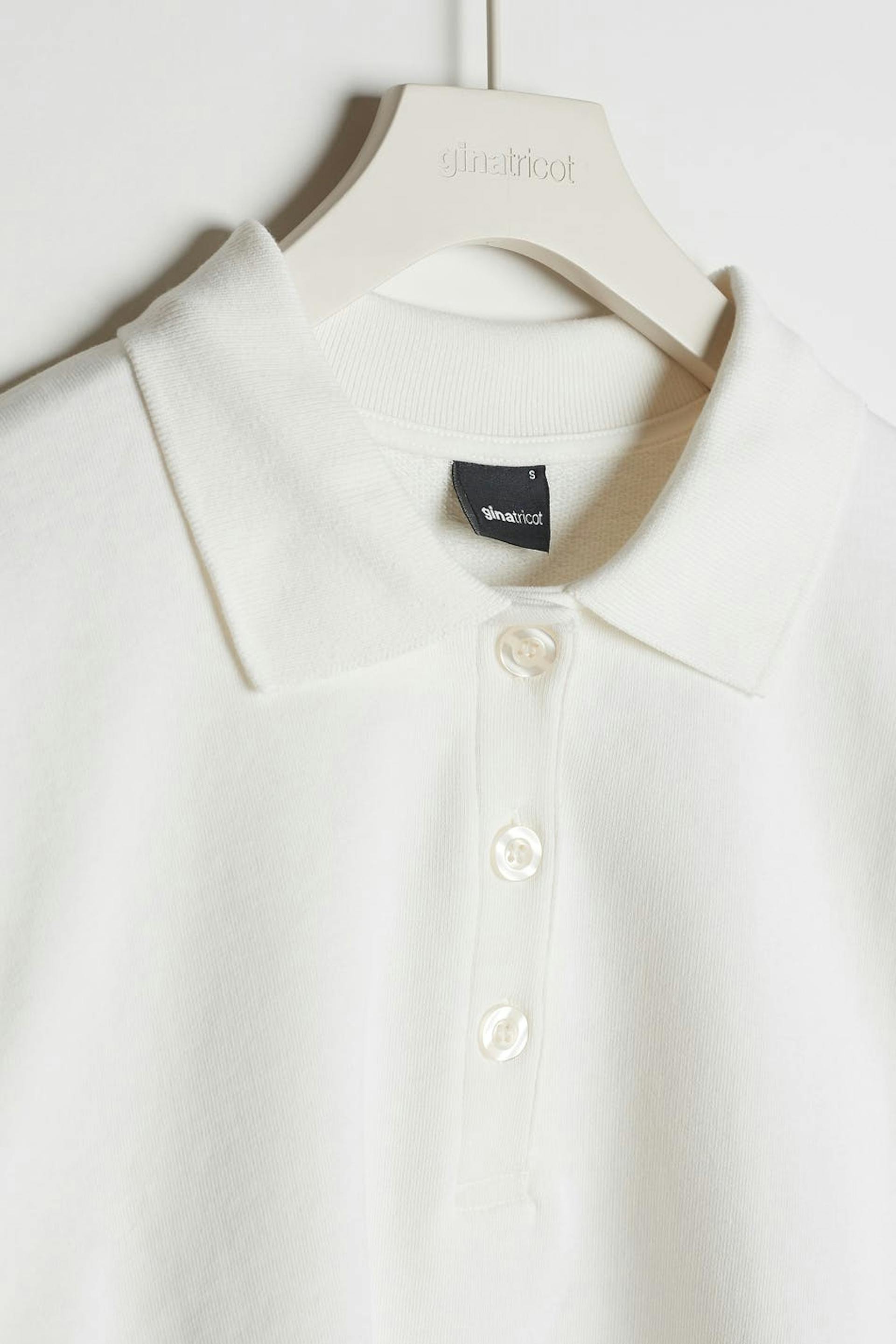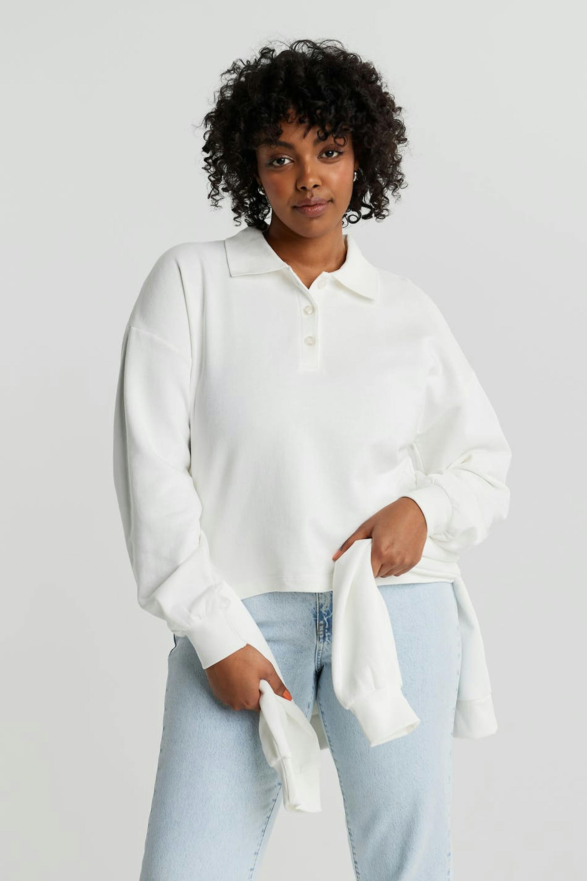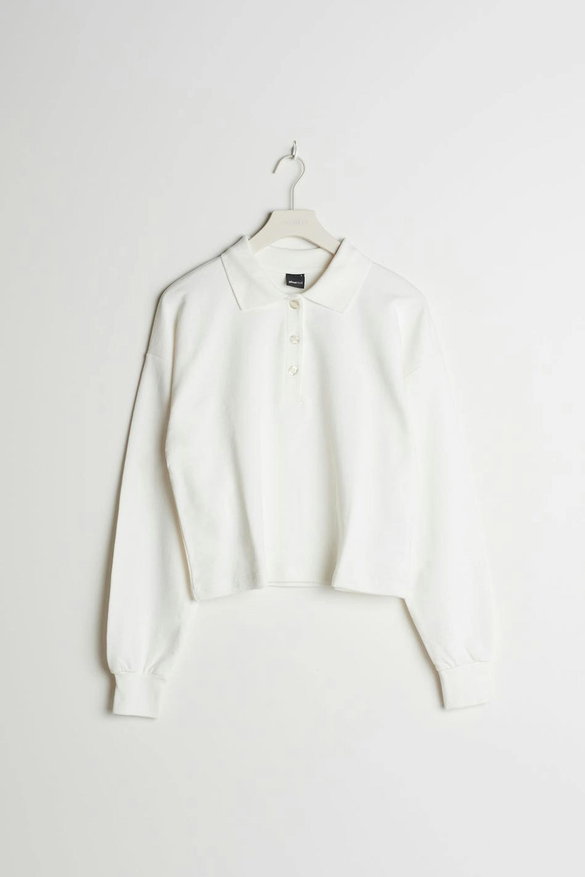 Pitkähihainen villapaita normaalilla leikkauksella. Villapaita on valkoinen ja siinä on kaulus. Siinä on napit kaula-aukossa ja cropattu, laatikkomallinen istuvuus.
