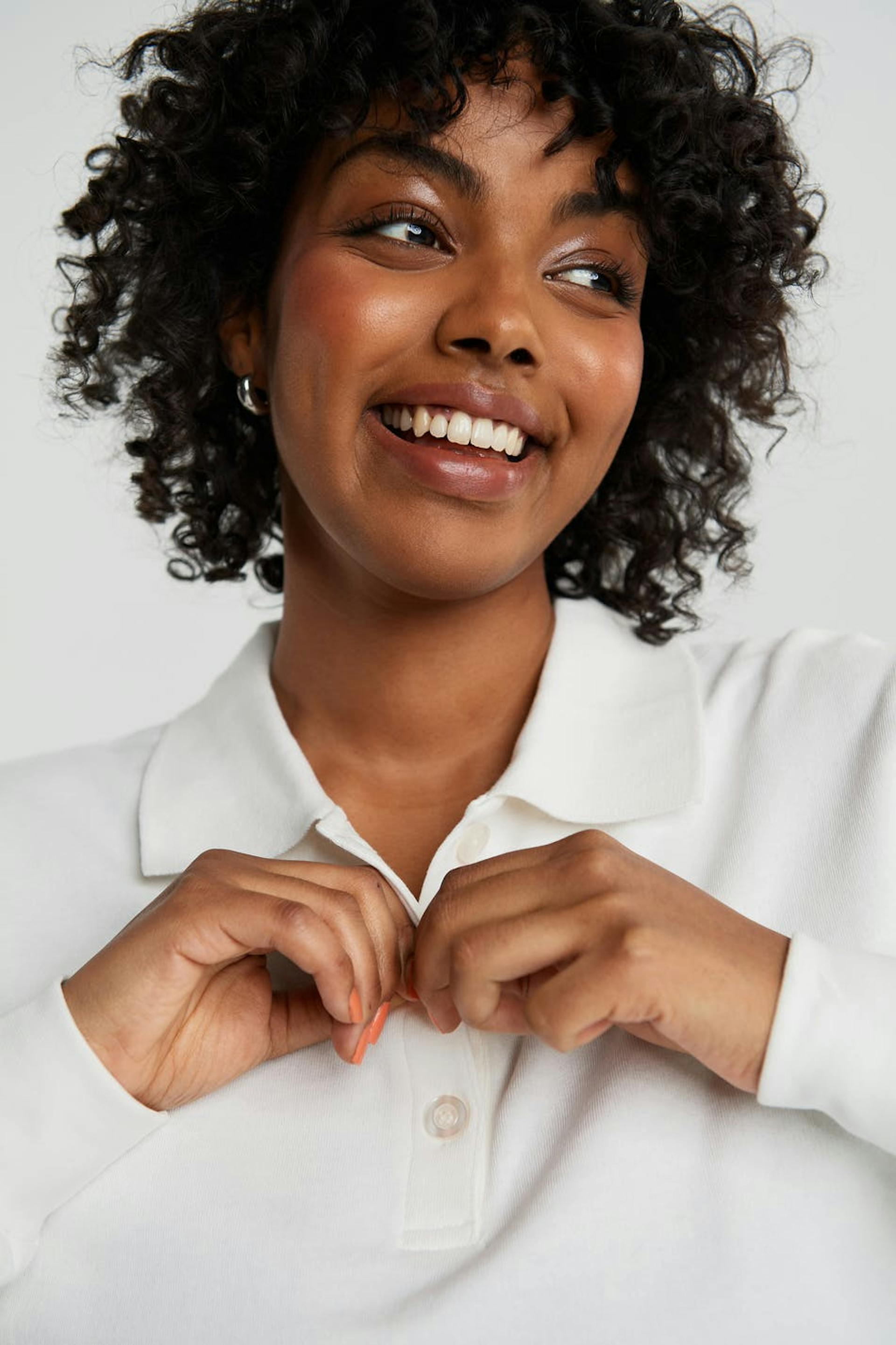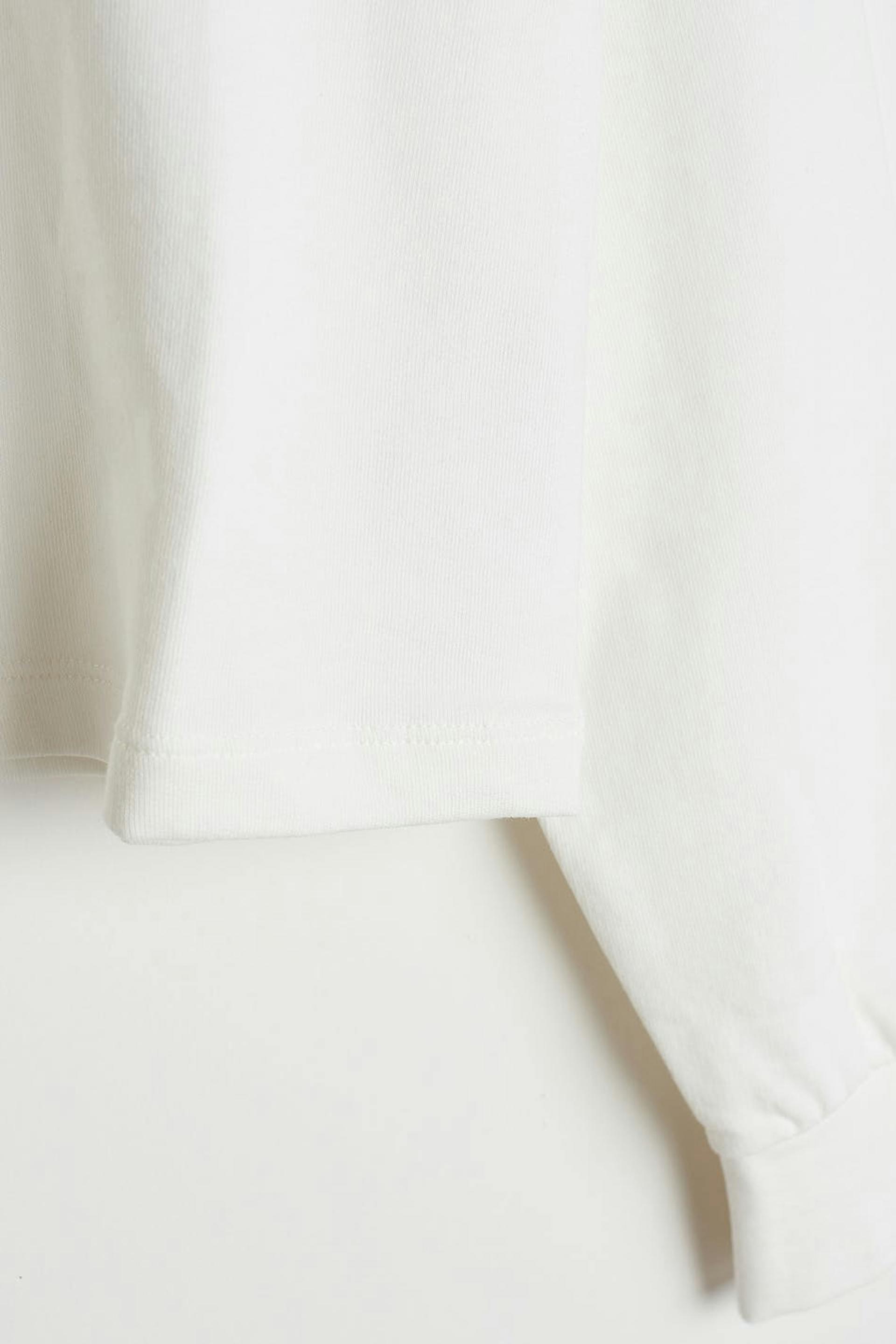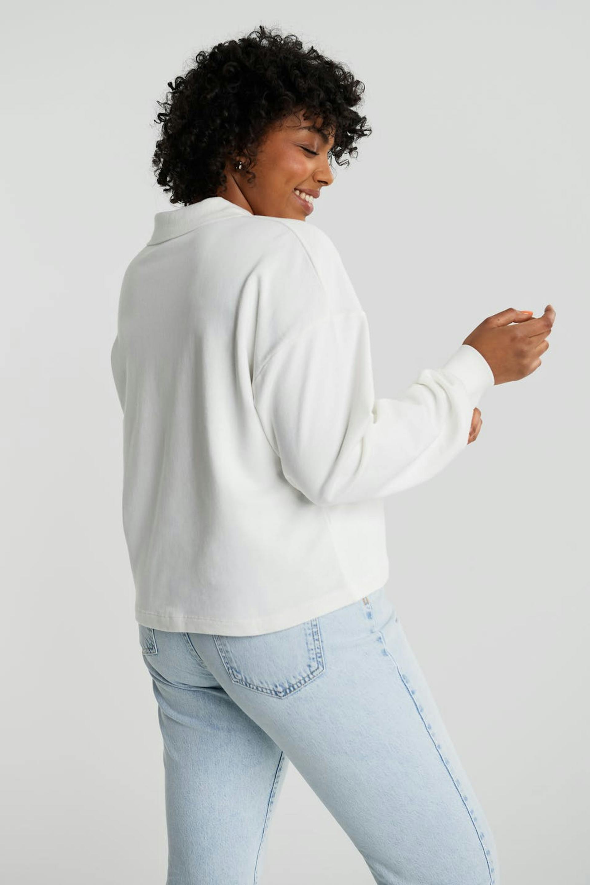 Pitkähihainen villapaita normaalilla leikkauksella. Villapaita on valkoinen ja siinä on kaulus. Siinä on napit kaula-aukossa ja cropattu, laatikkomallinen istuvuus.