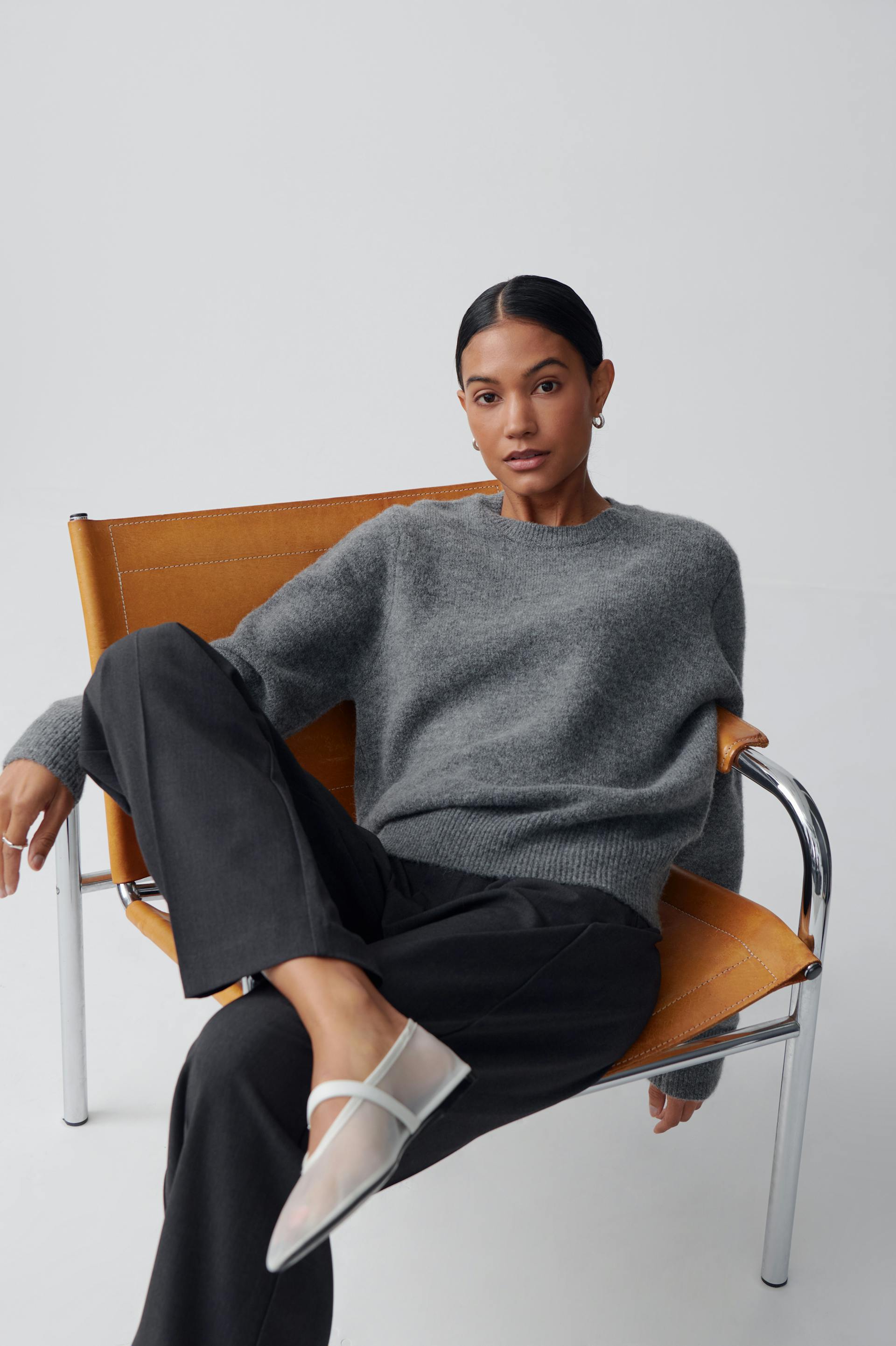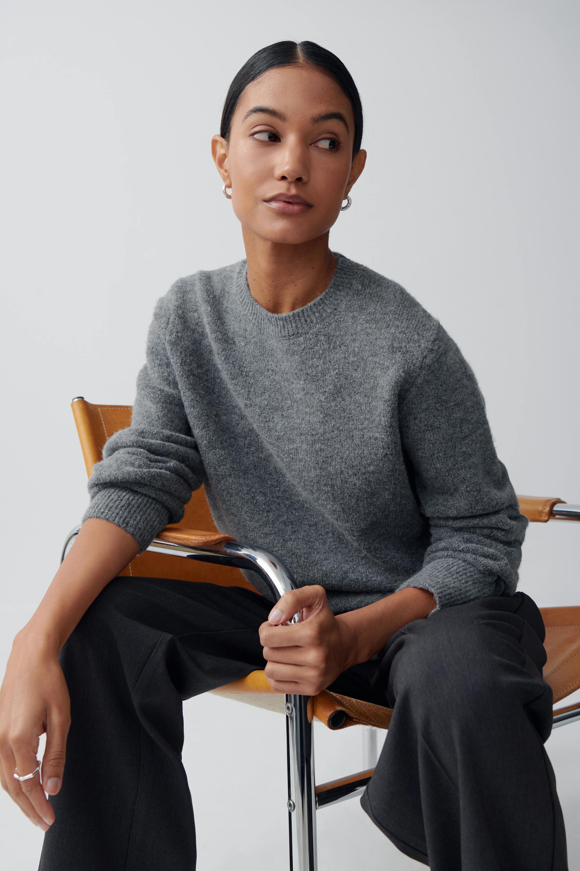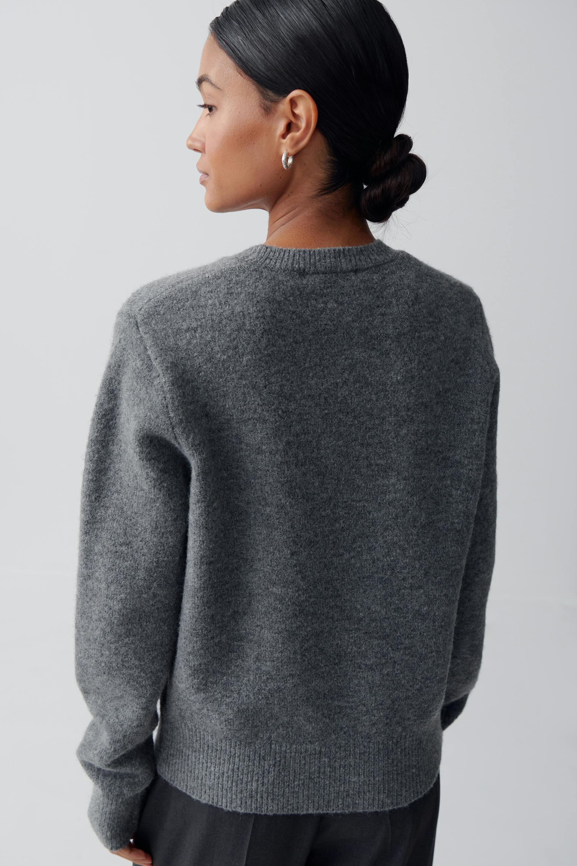 Neulepusero pyöreällä pääntiellä. Pusero on harmaa ja siinä on normaali istuvuus. Siinä on pitkä hiha ja ribbineulos hihansuissa ja pohjassa.