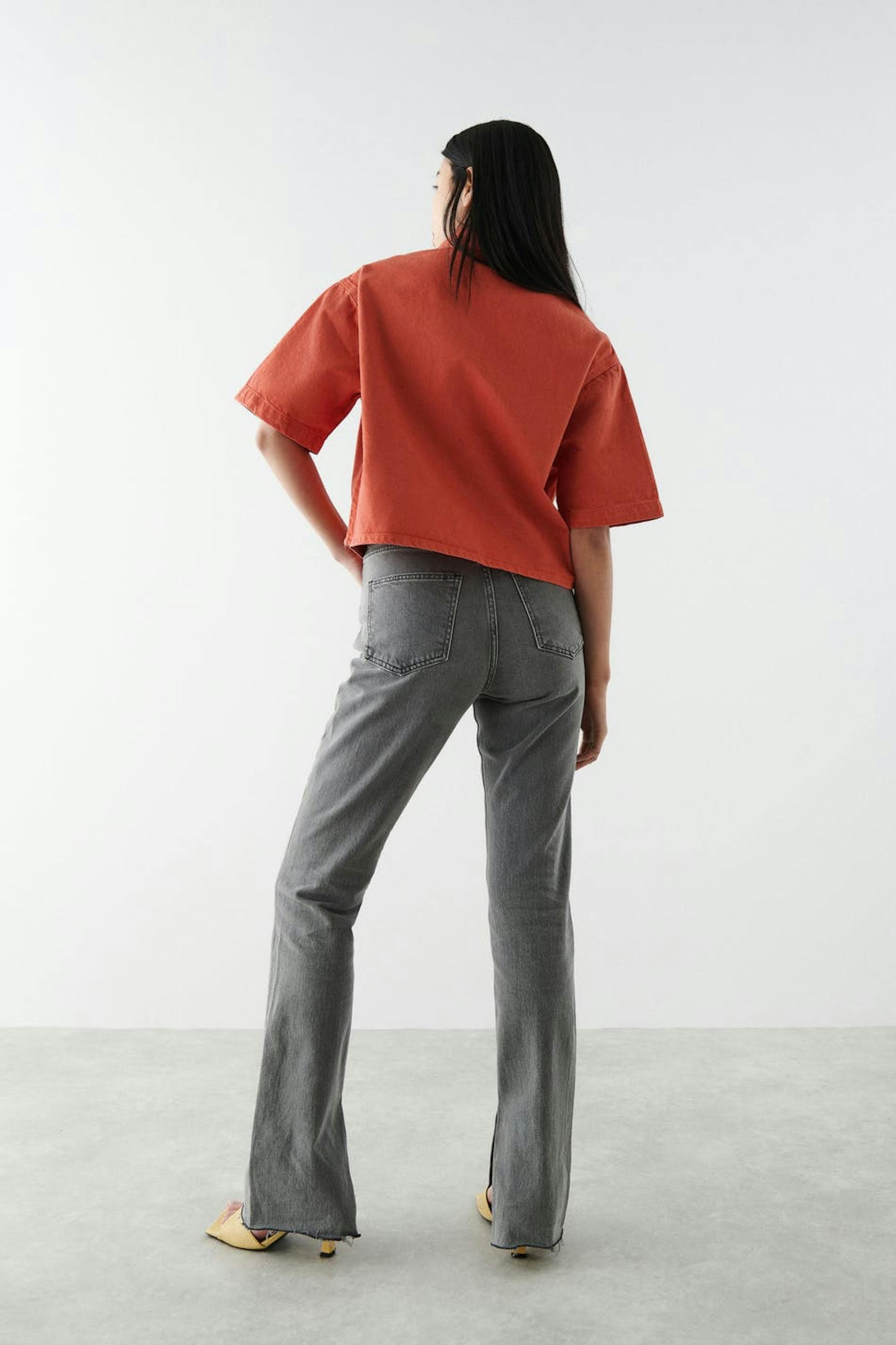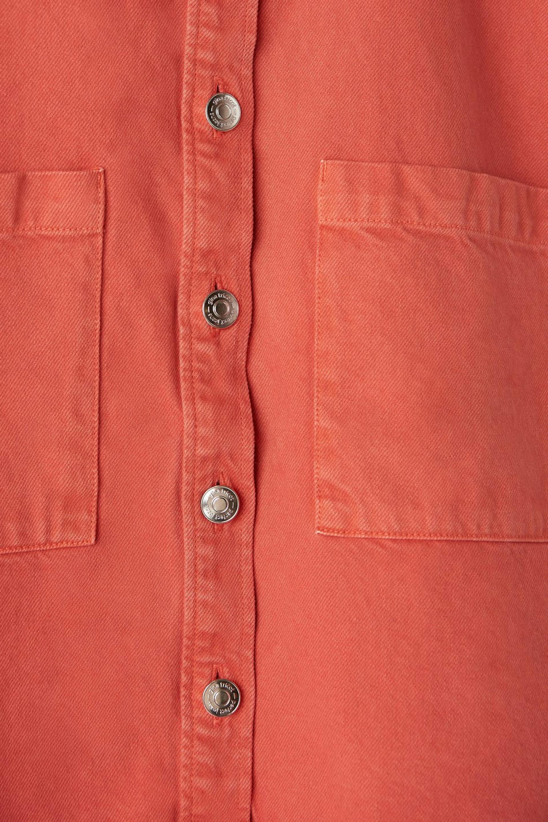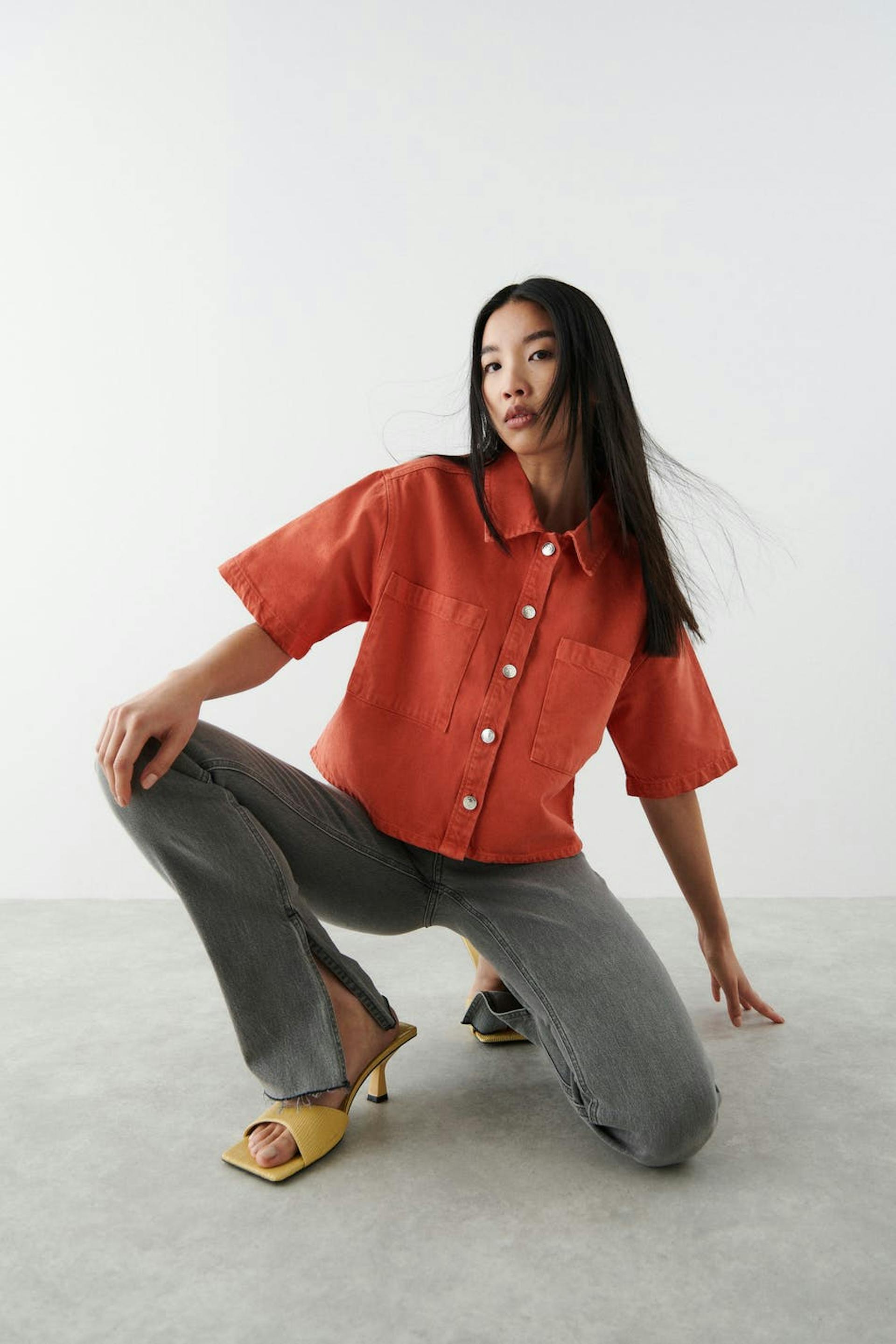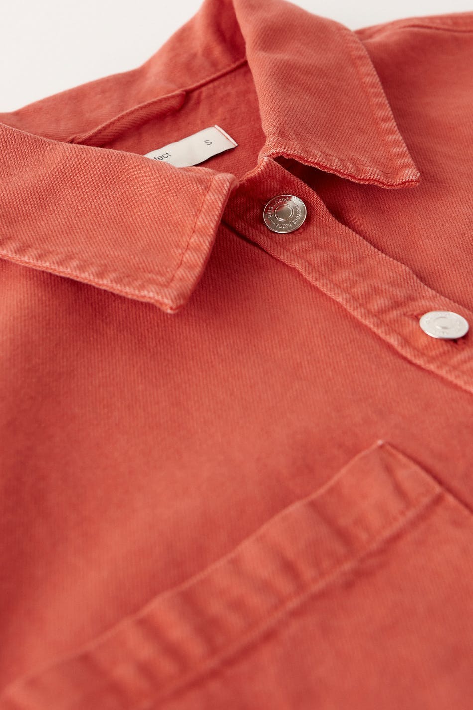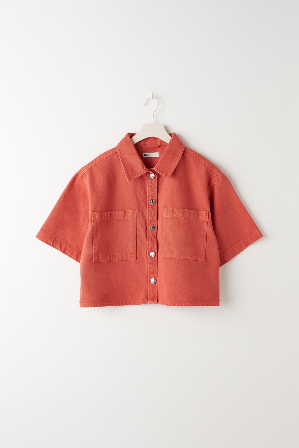 Lyhythihainen farkkupaita rintataskuilla. Paita on punainen ja siinä on oversized-malli joustamattomasta denimistä. Siinä on kaulus, napituslista edessä ja cropattu pituus.