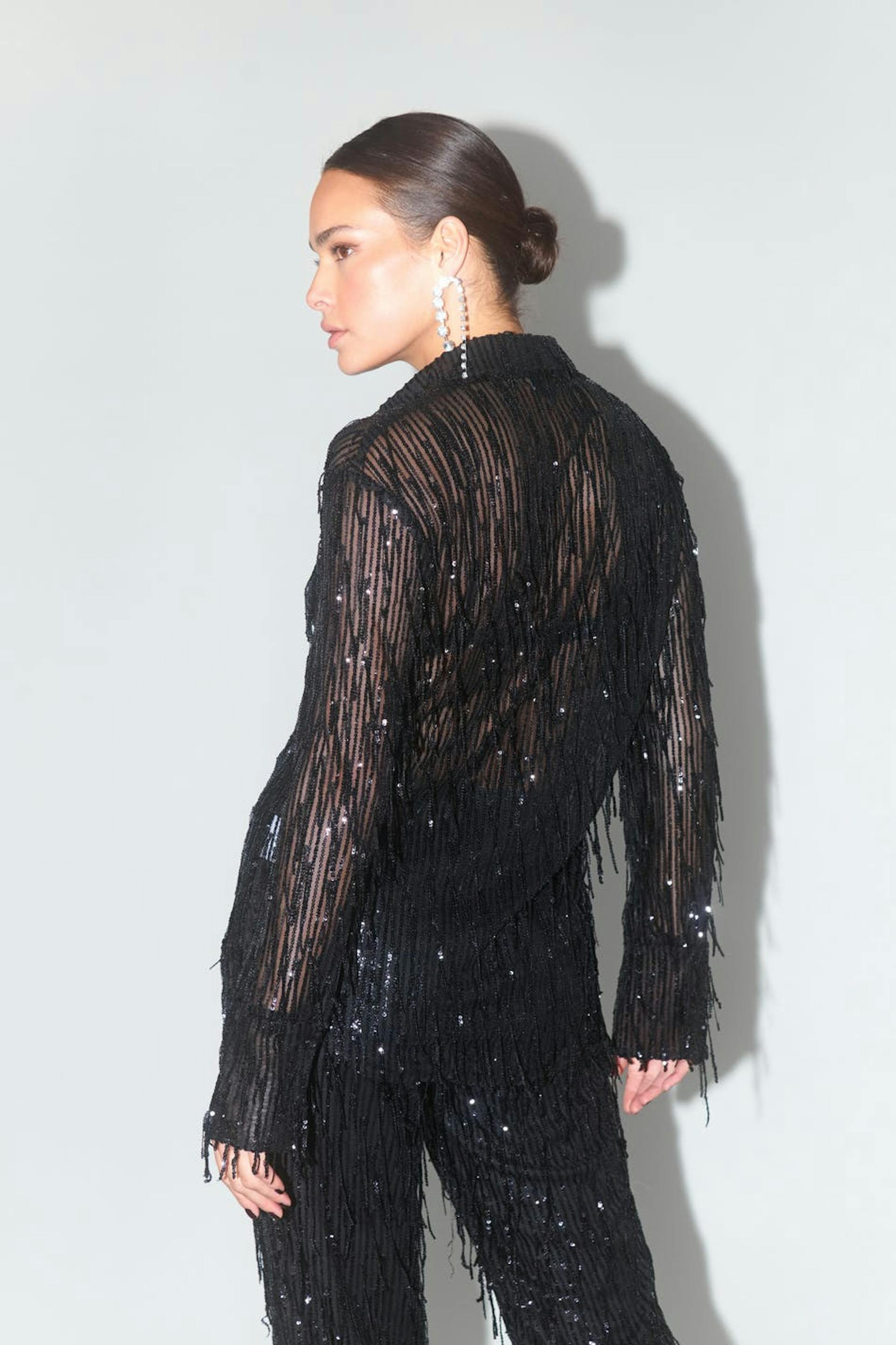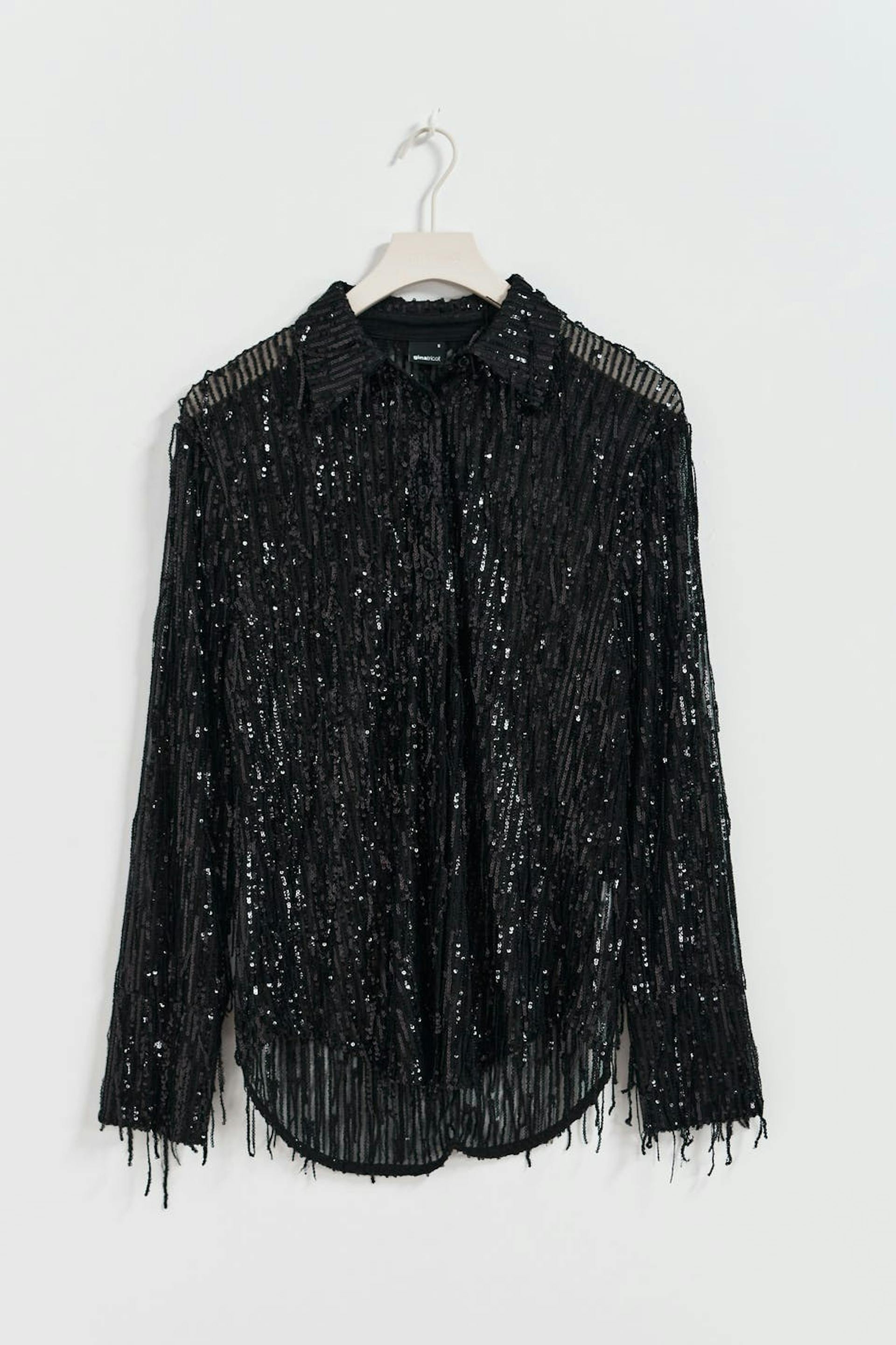 Paljettipaita hapsuilla. Paita on musta ja siinä on väljä malli. Siinä on kaulus ja napitus edessä.
