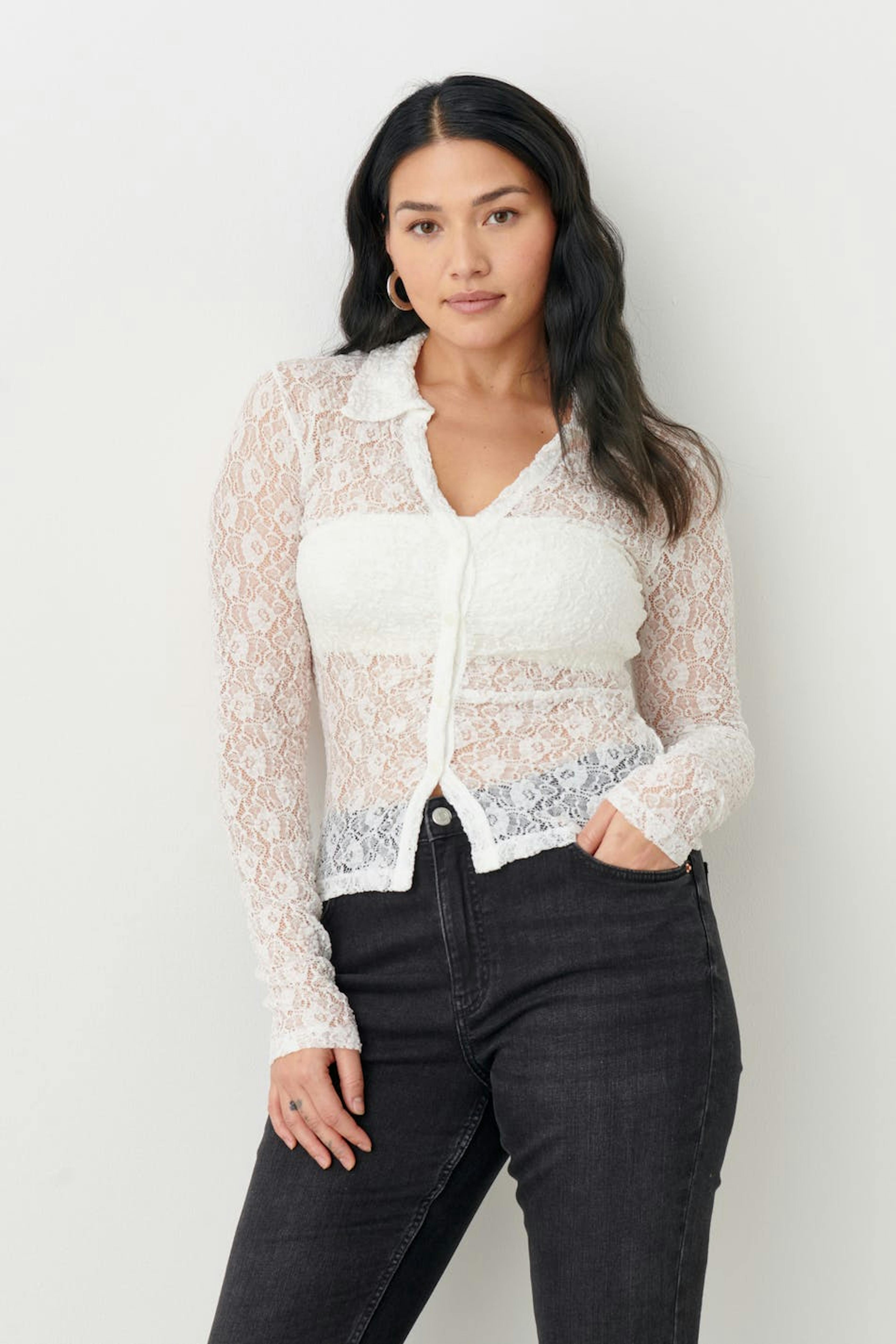 Paita pitsistä v-pääntiellä. Paita on valkoinen ja siinä on tyköistuva istuvuus. Siinä on kaulus, napituslista edessä ja joustava laatu.