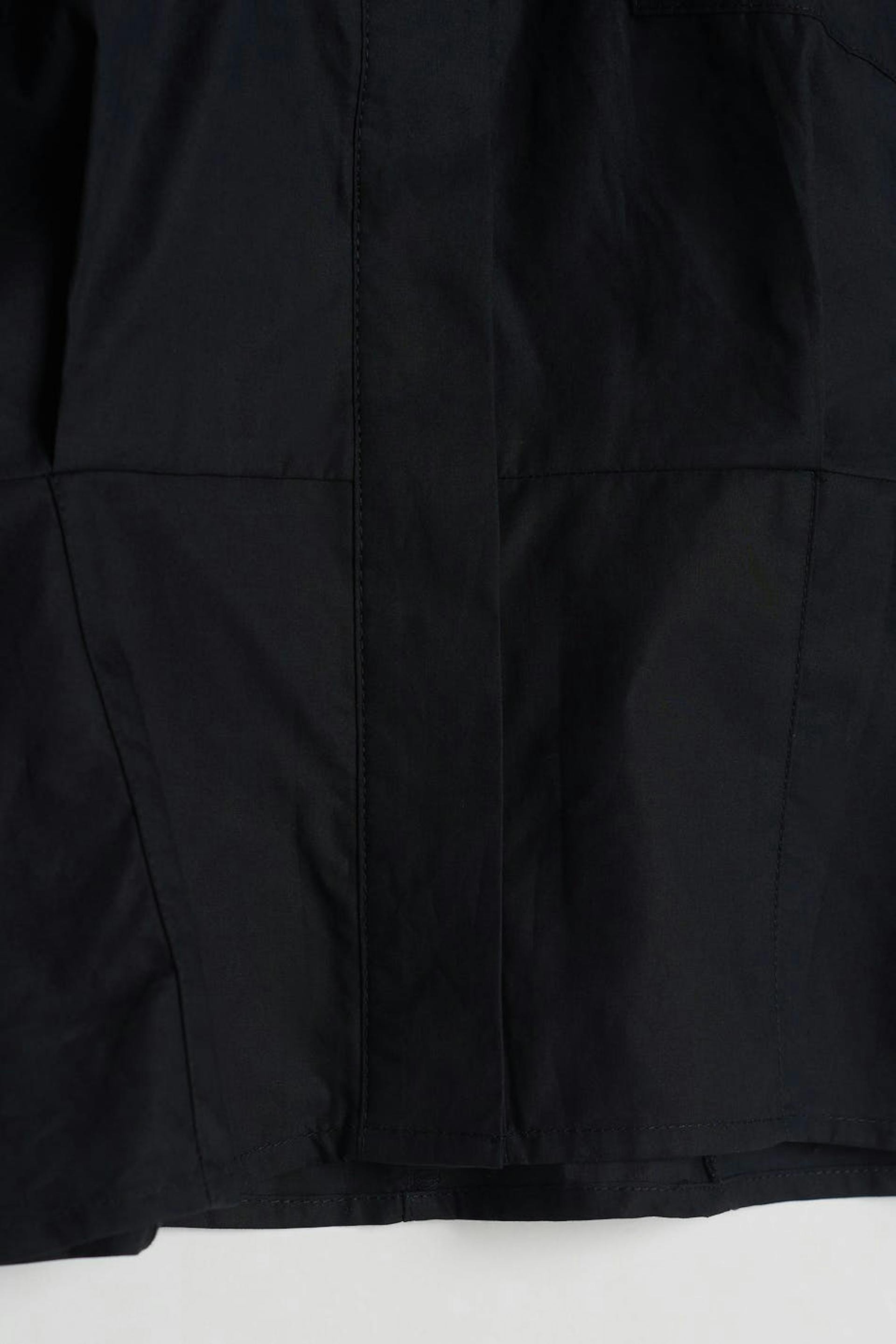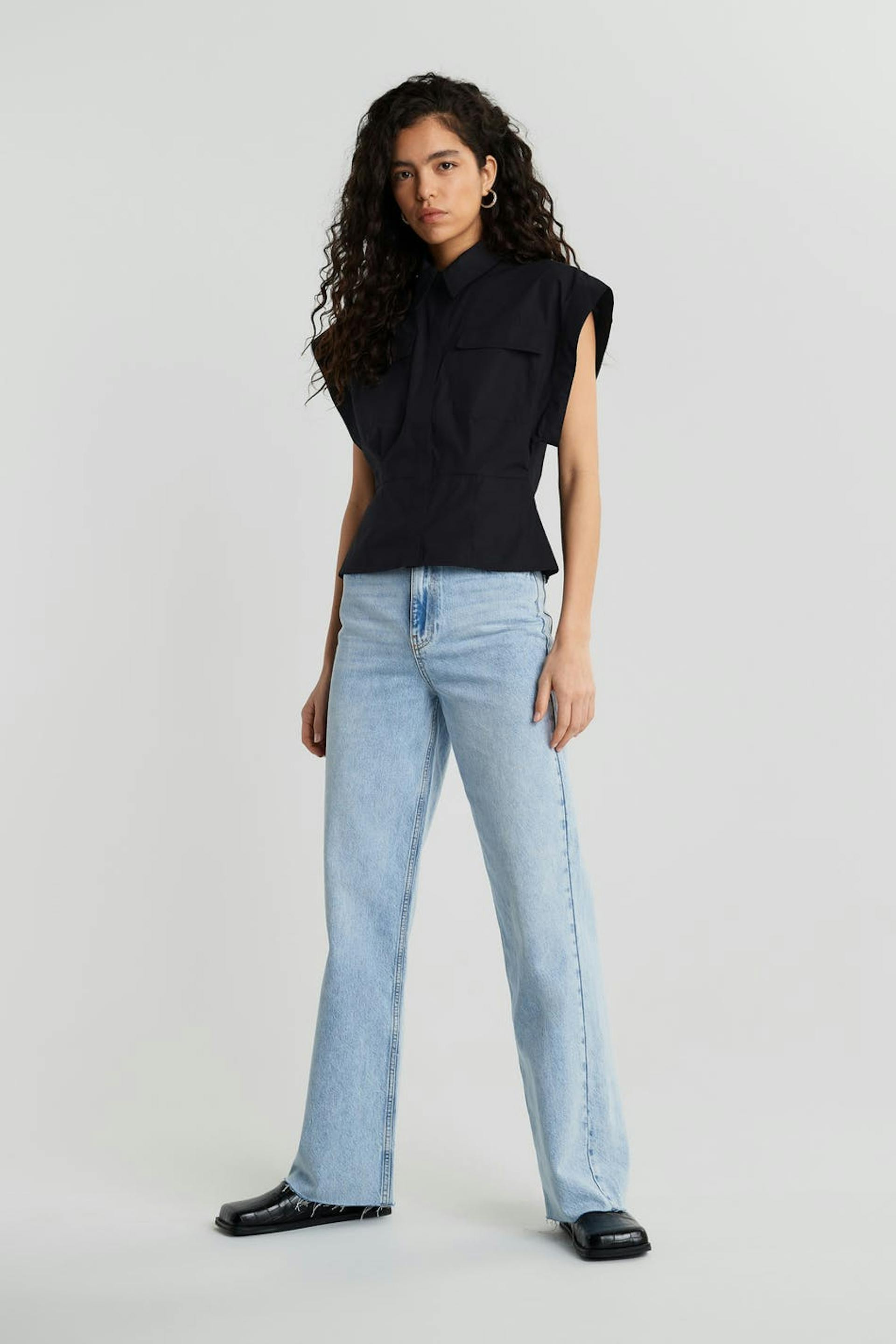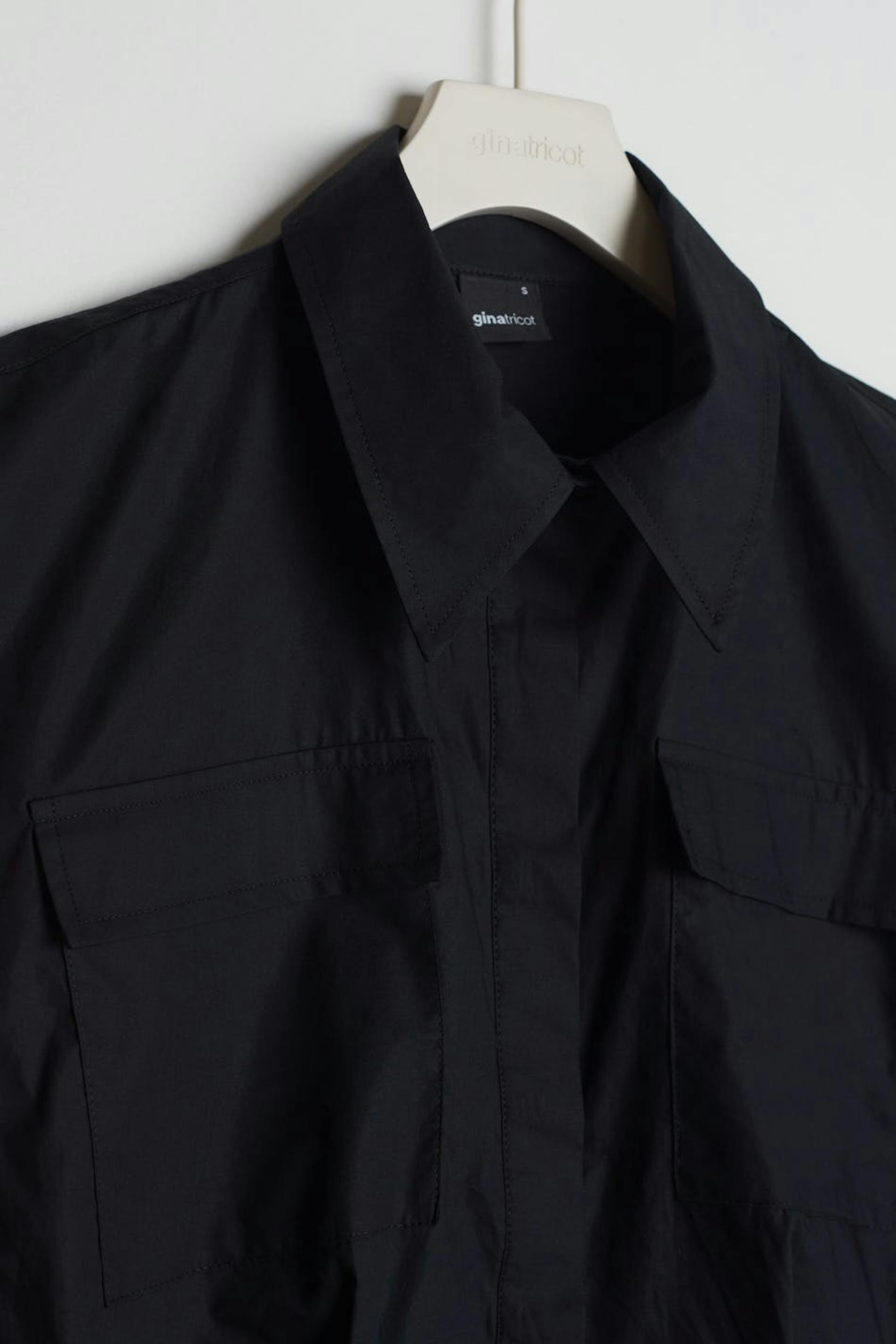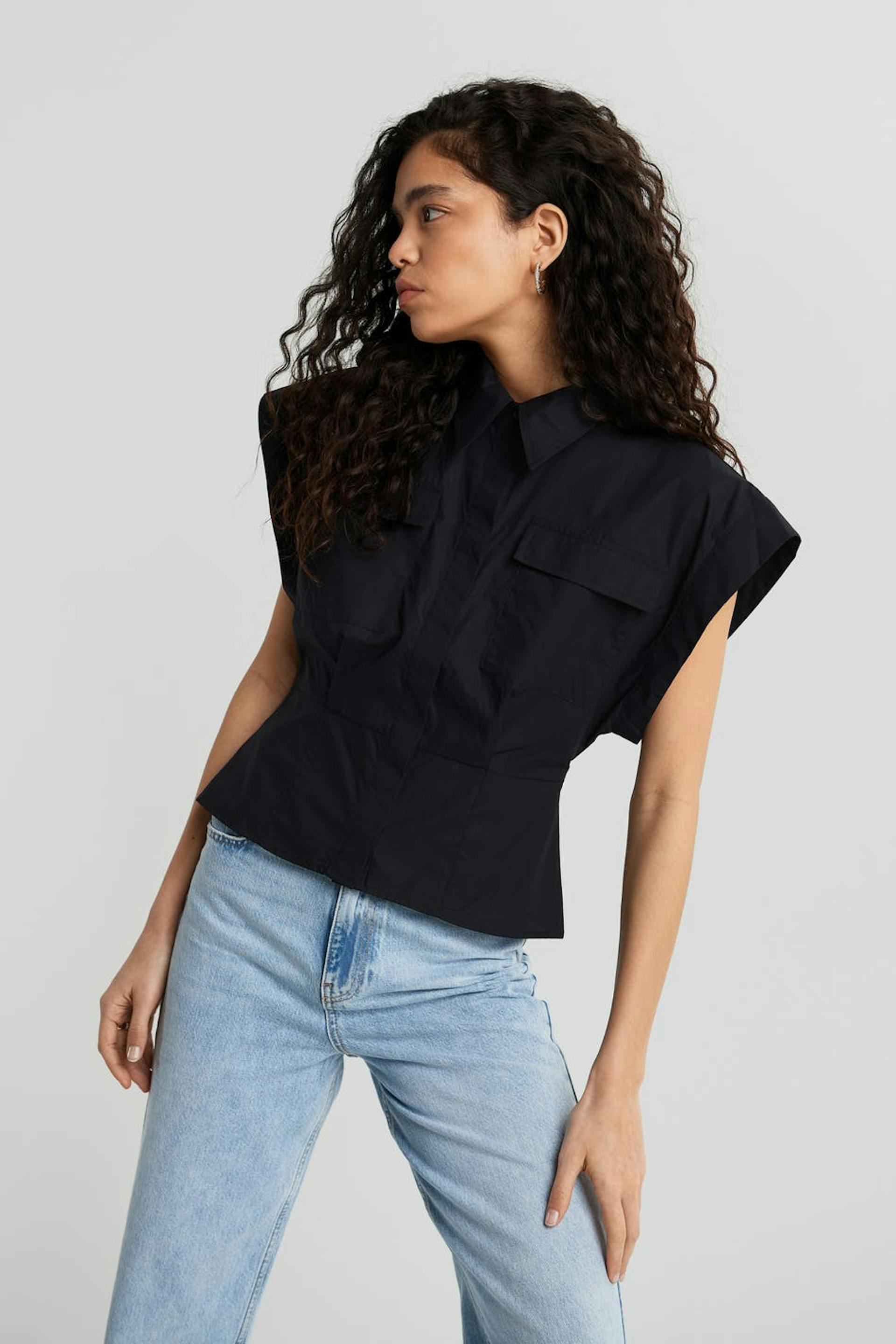 Hihaton paita korostetuilla olkapäillä. Paita on musta ja siinä on syvät hihanaukot. Siinä on laatikkomallinen istuvuus vartalonmyötäisellä vyötäröllä, rintataskut, vekki edessä ja kätketty napituslista edessä.