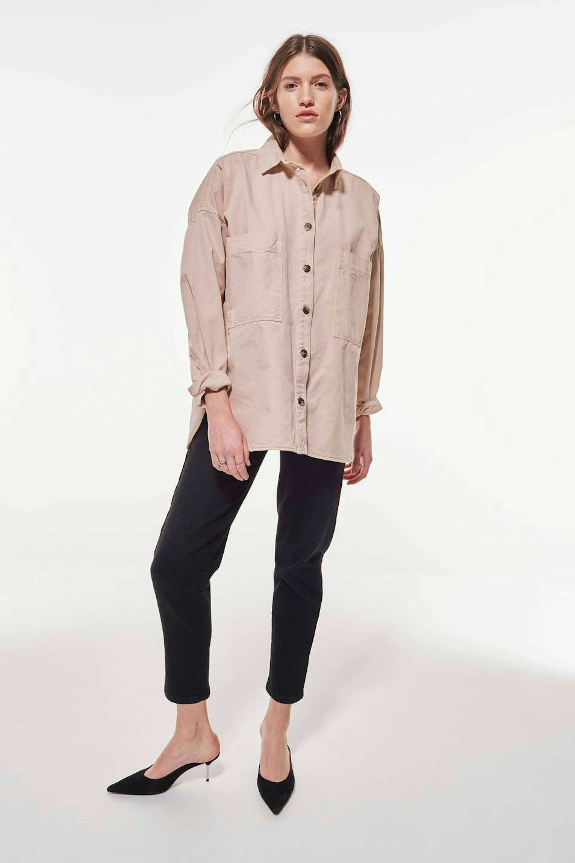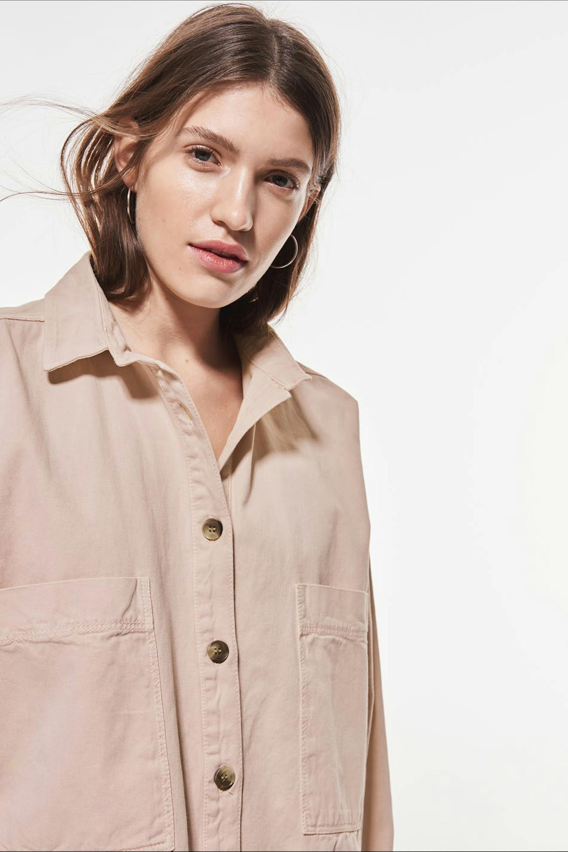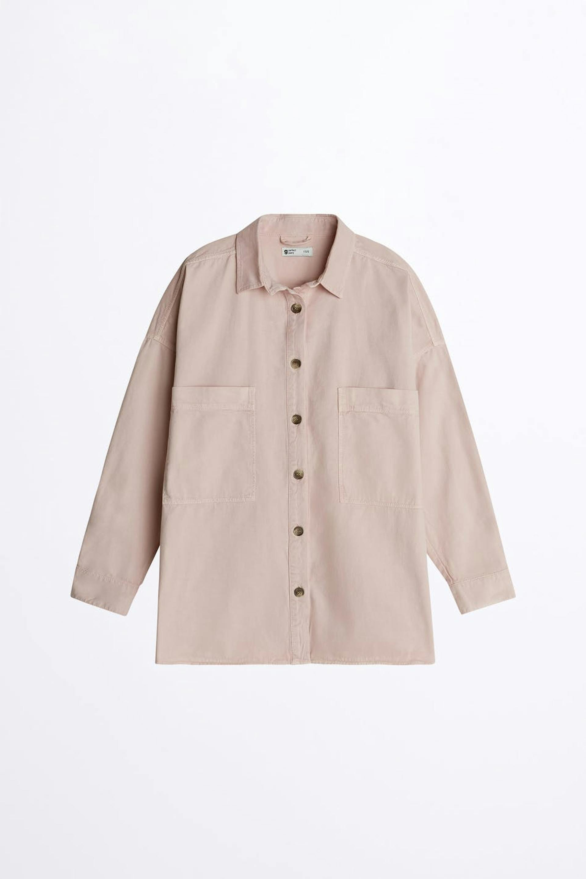 Paita ylisuuri istuvuudella. Paita on pinkki ja siinä on suuret taskut. Se valmistetaan denimistä.