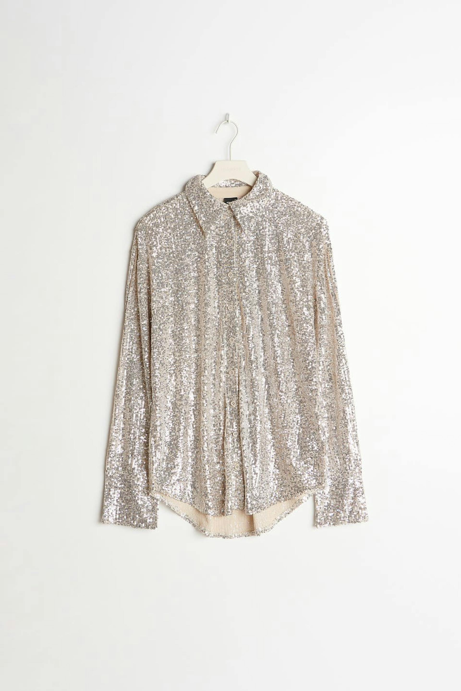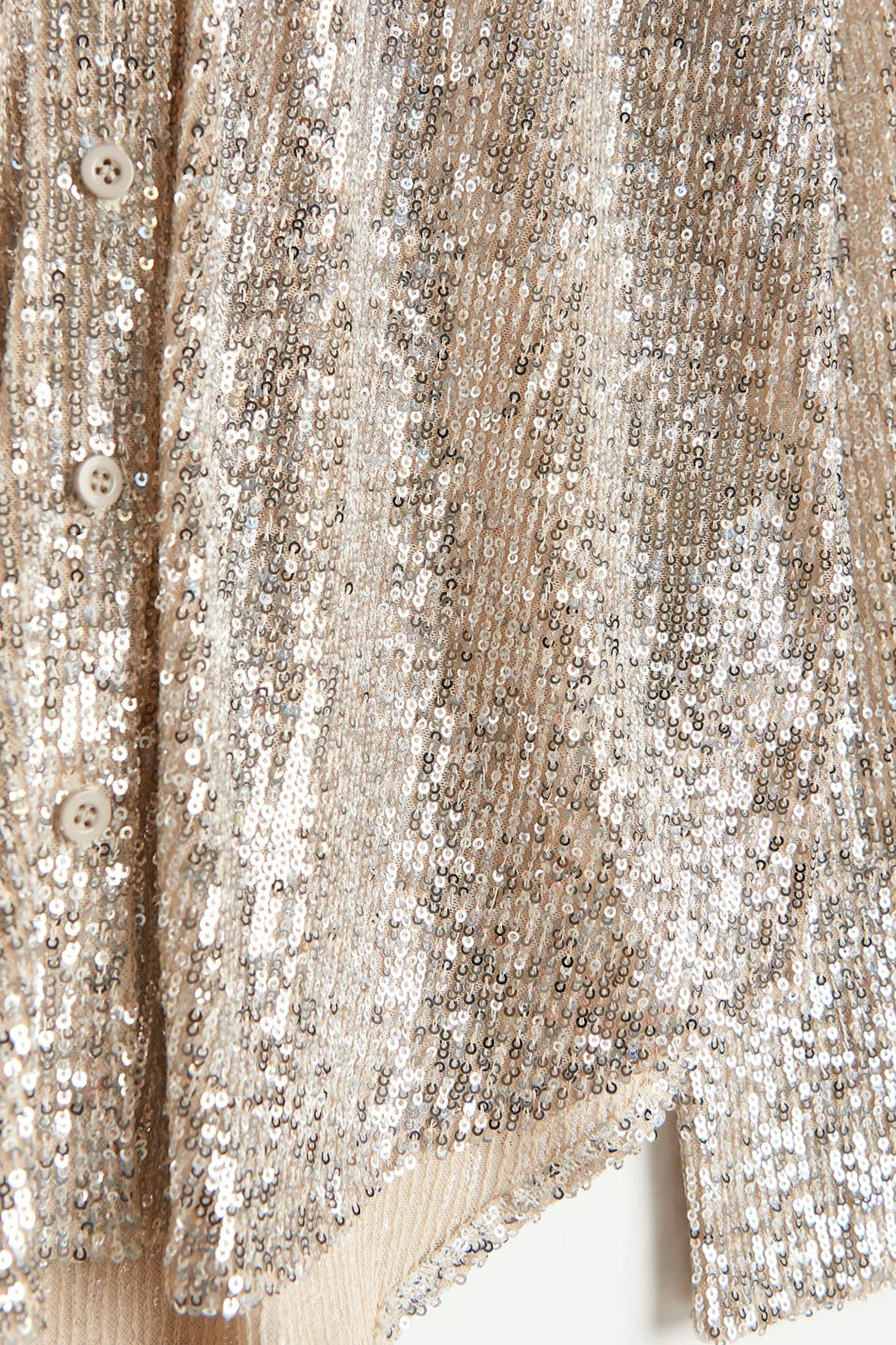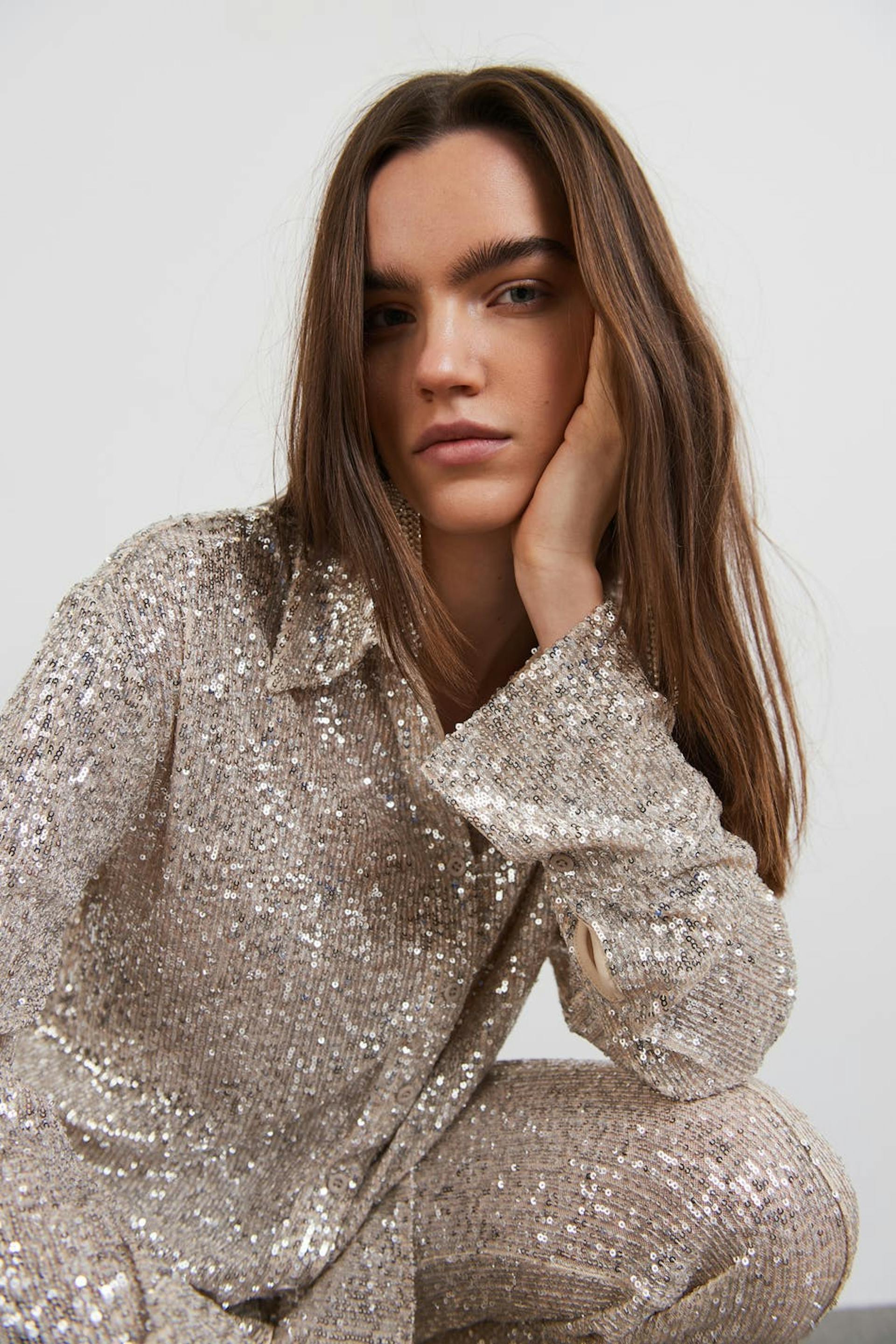 Paljettipaita oversized-mallilla. Paita on juhliin täydellisesti sopiva ja beige ja siinä on nappikiinnitys edessä. Siinä on hihansuut napituslistalla ja pyöristetty helma takana.