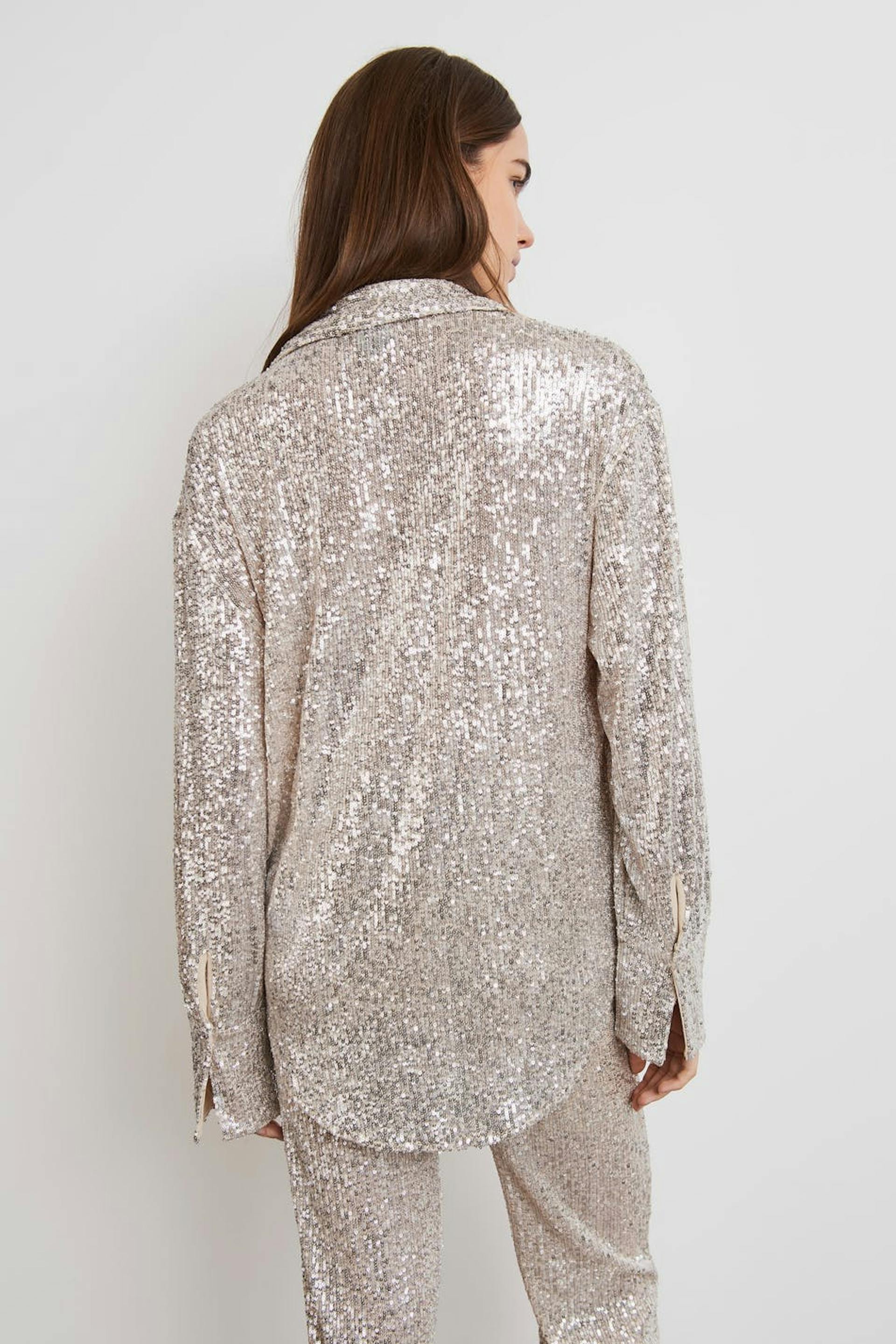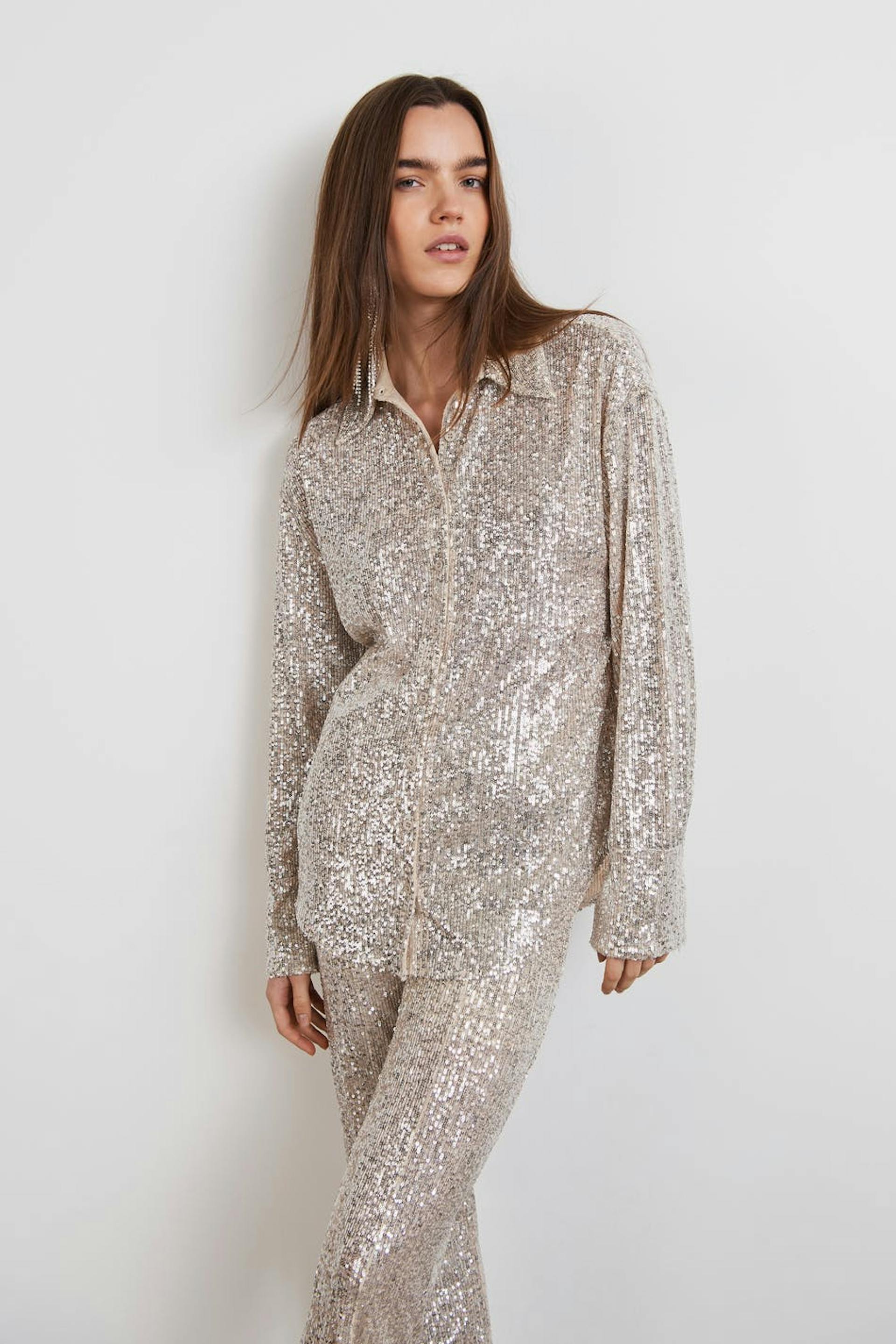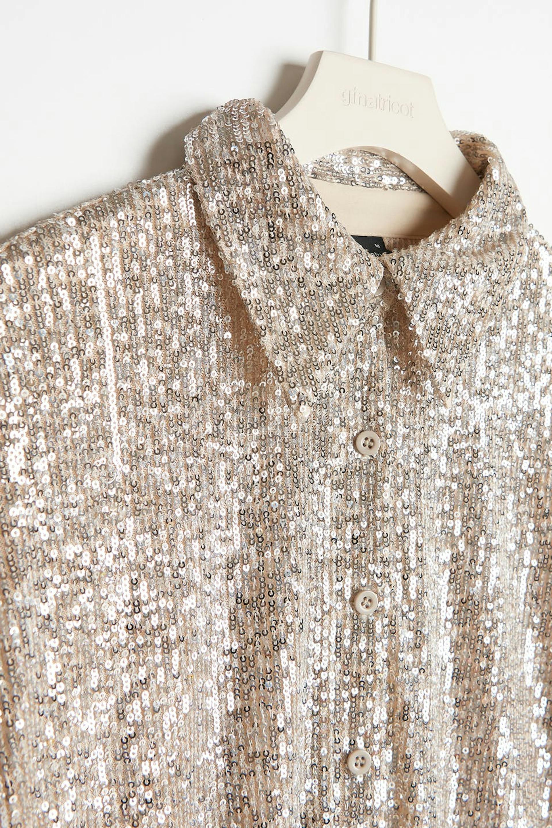 Paljettipaita oversized-mallilla. Paita on juhliin täydellisesti sopiva ja beige ja siinä on nappikiinnitys edessä. Siinä on hihansuut napituslistalla ja pyöristetty helma takana.