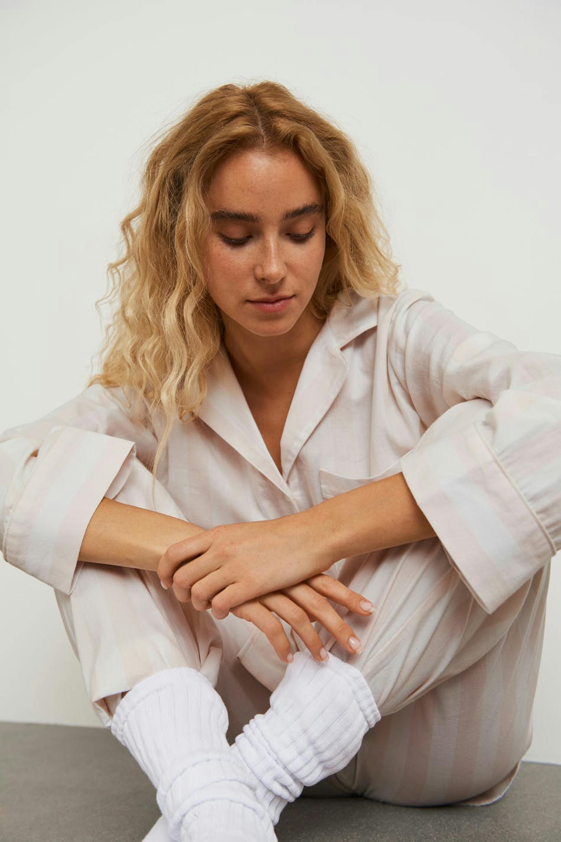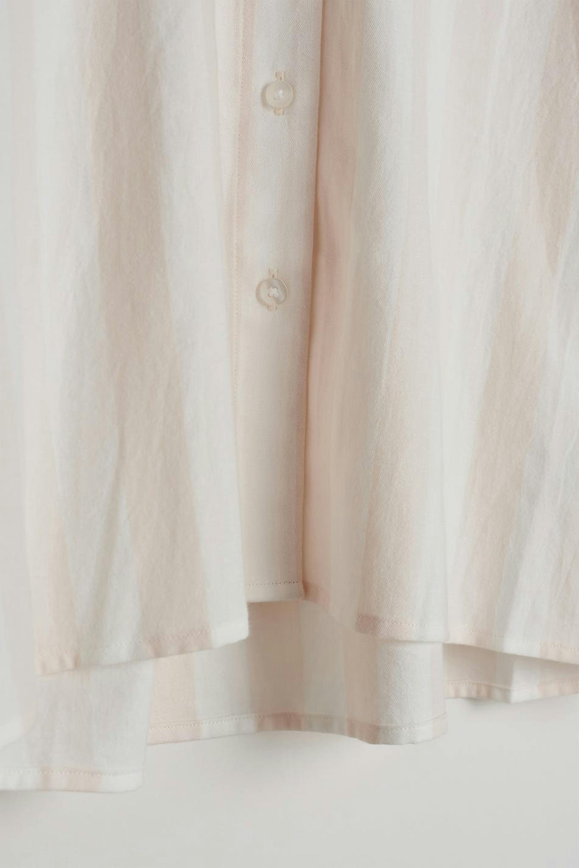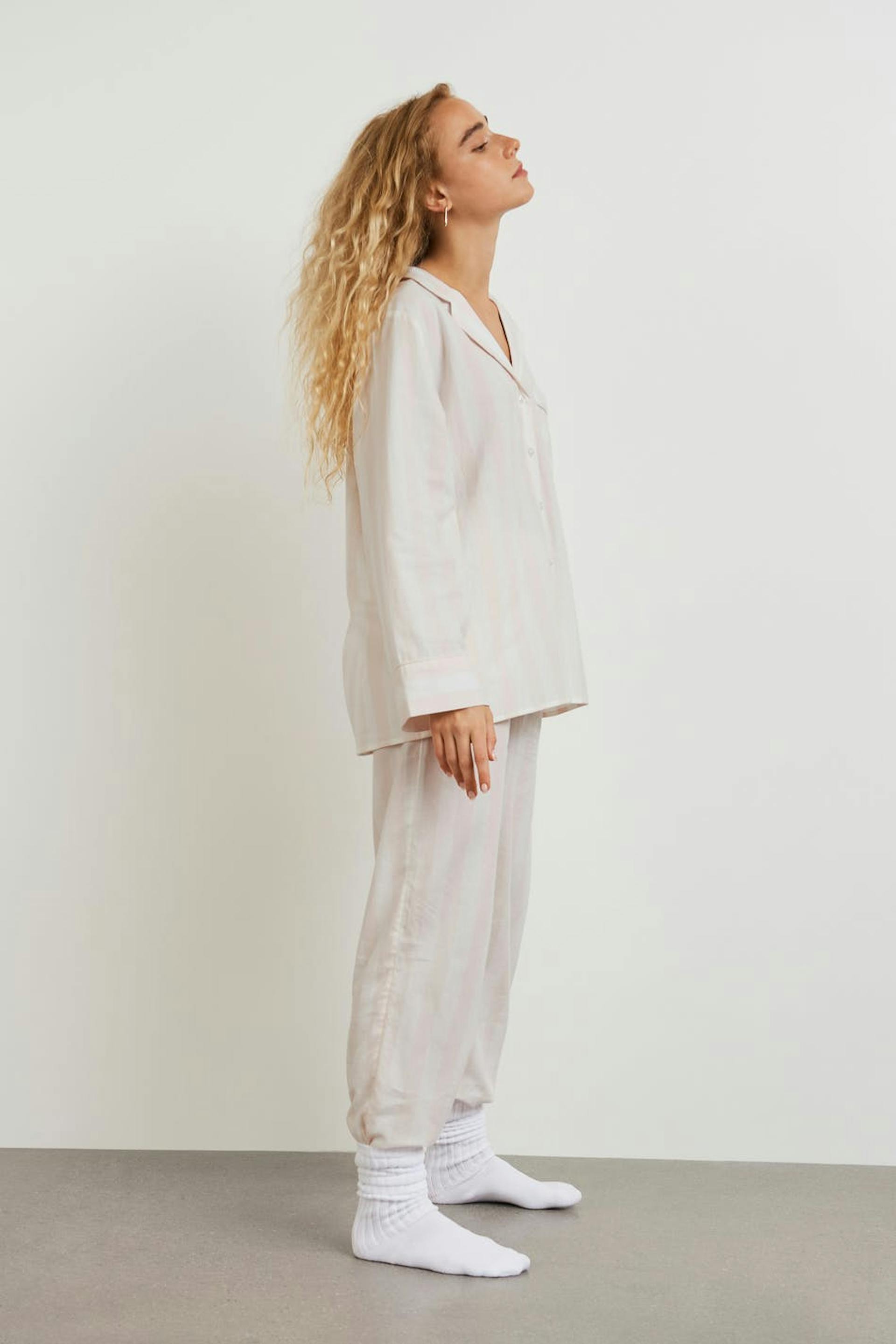 Raidallinen pyjamapaita ylisuuri istuvuudella. Paita on pinkki ja valkoinen ja siinä on pehmeä materiaali puuvillasta. Siinä on kaulus, rintatasku ja nappikiinnitys edessä.