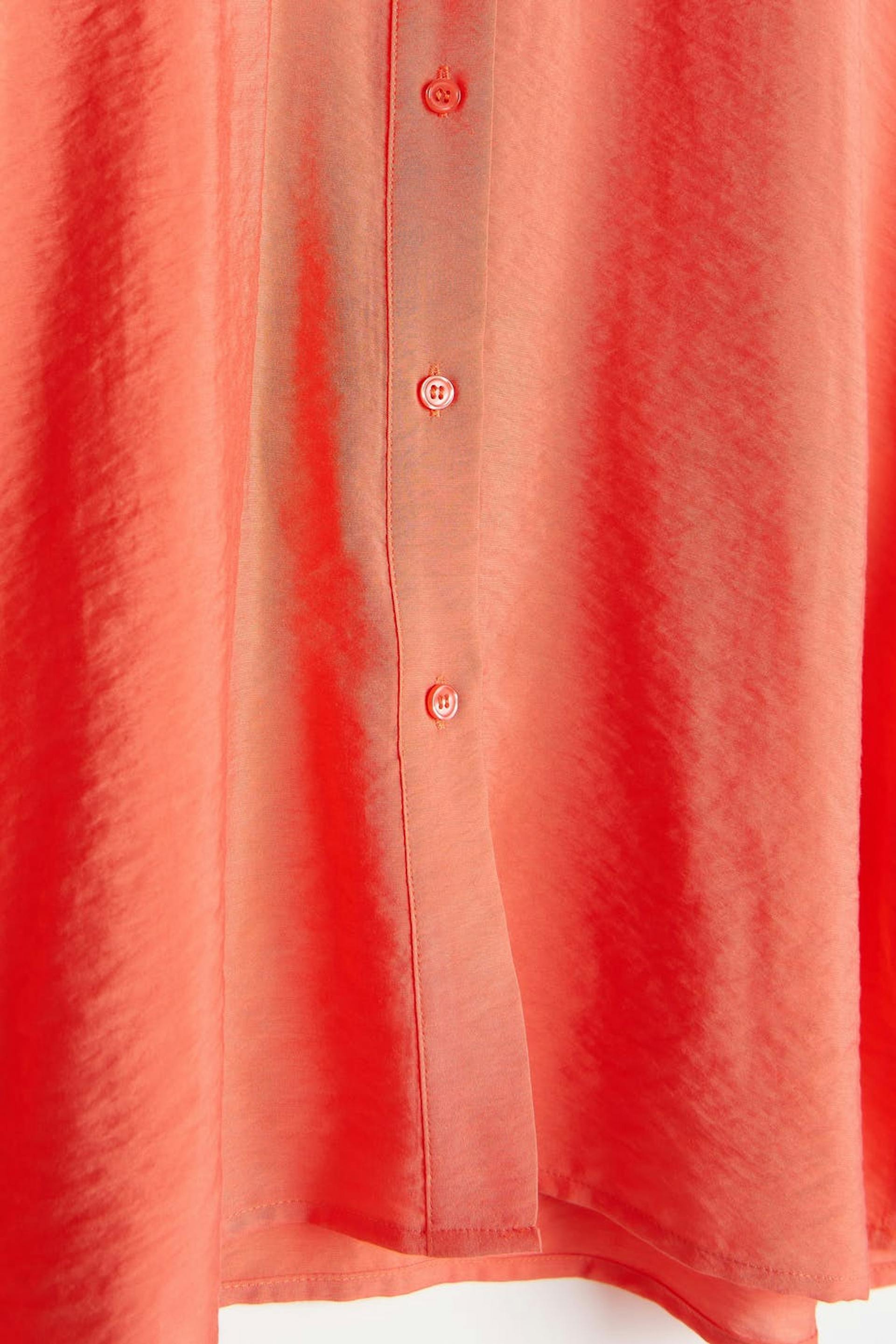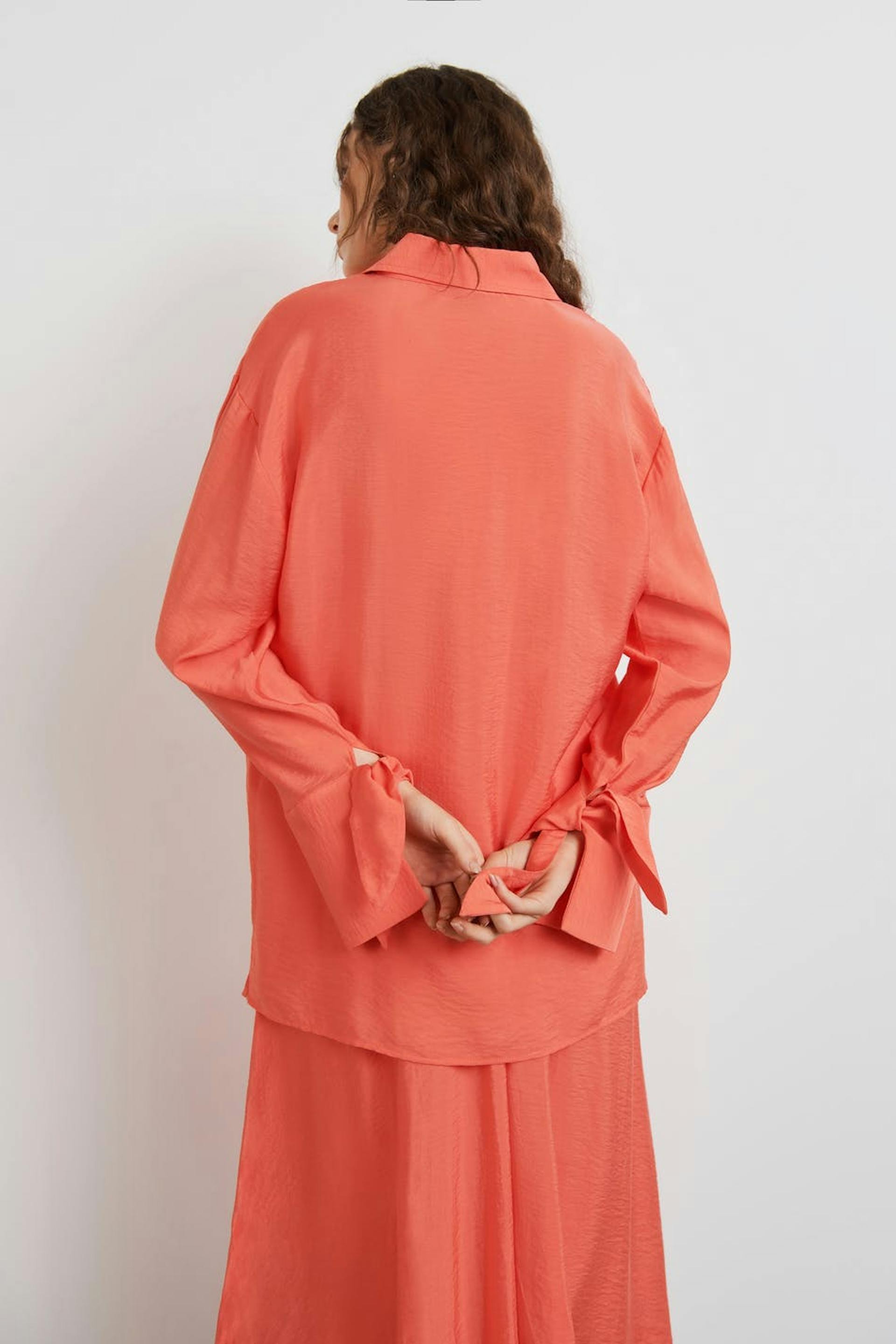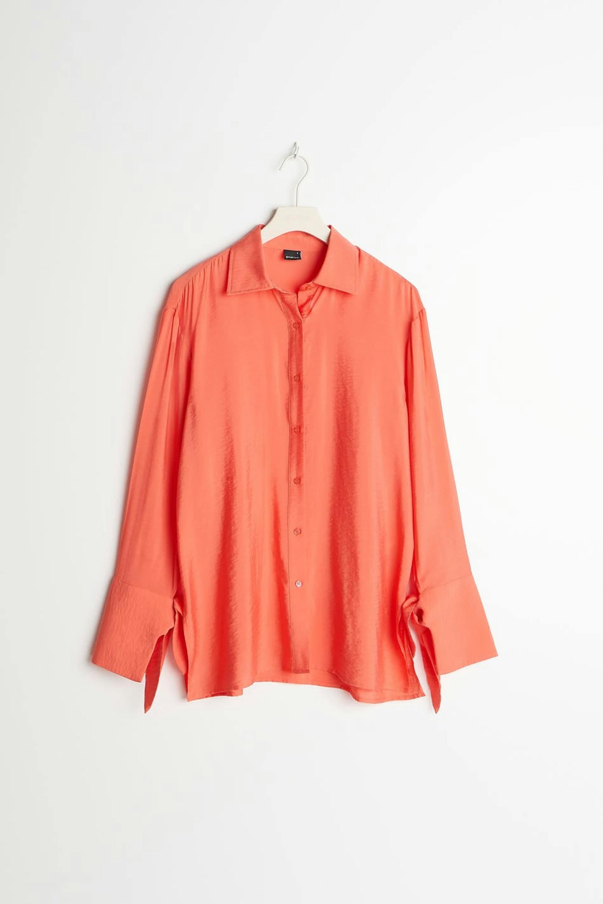 Paita oversized-mallilla. Paita on oranssi ja siinä on napituslista edessä. Siinä on kaulus ja hihansuut solmittavalla vyöllä.