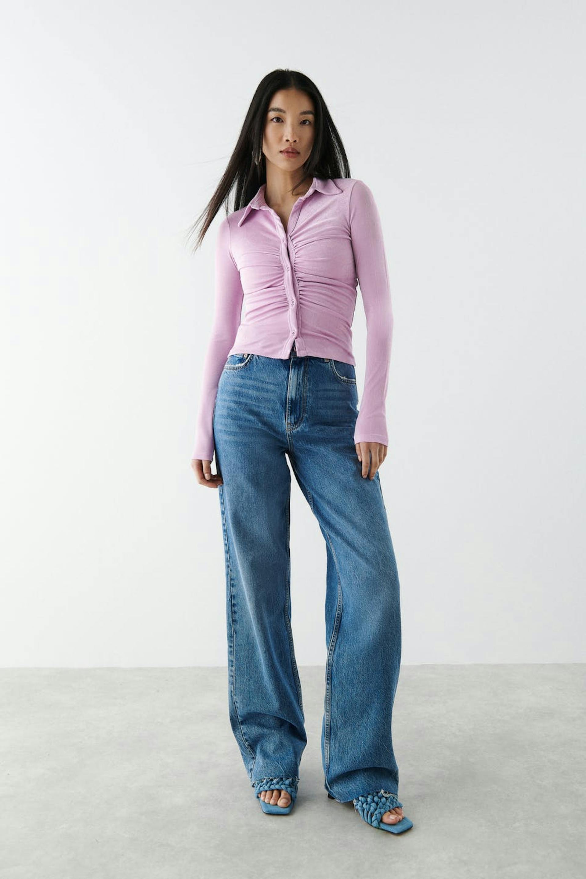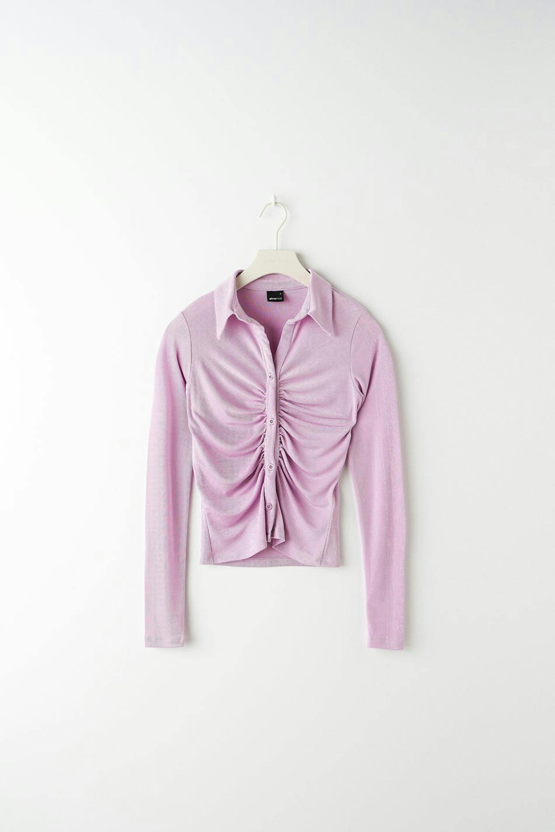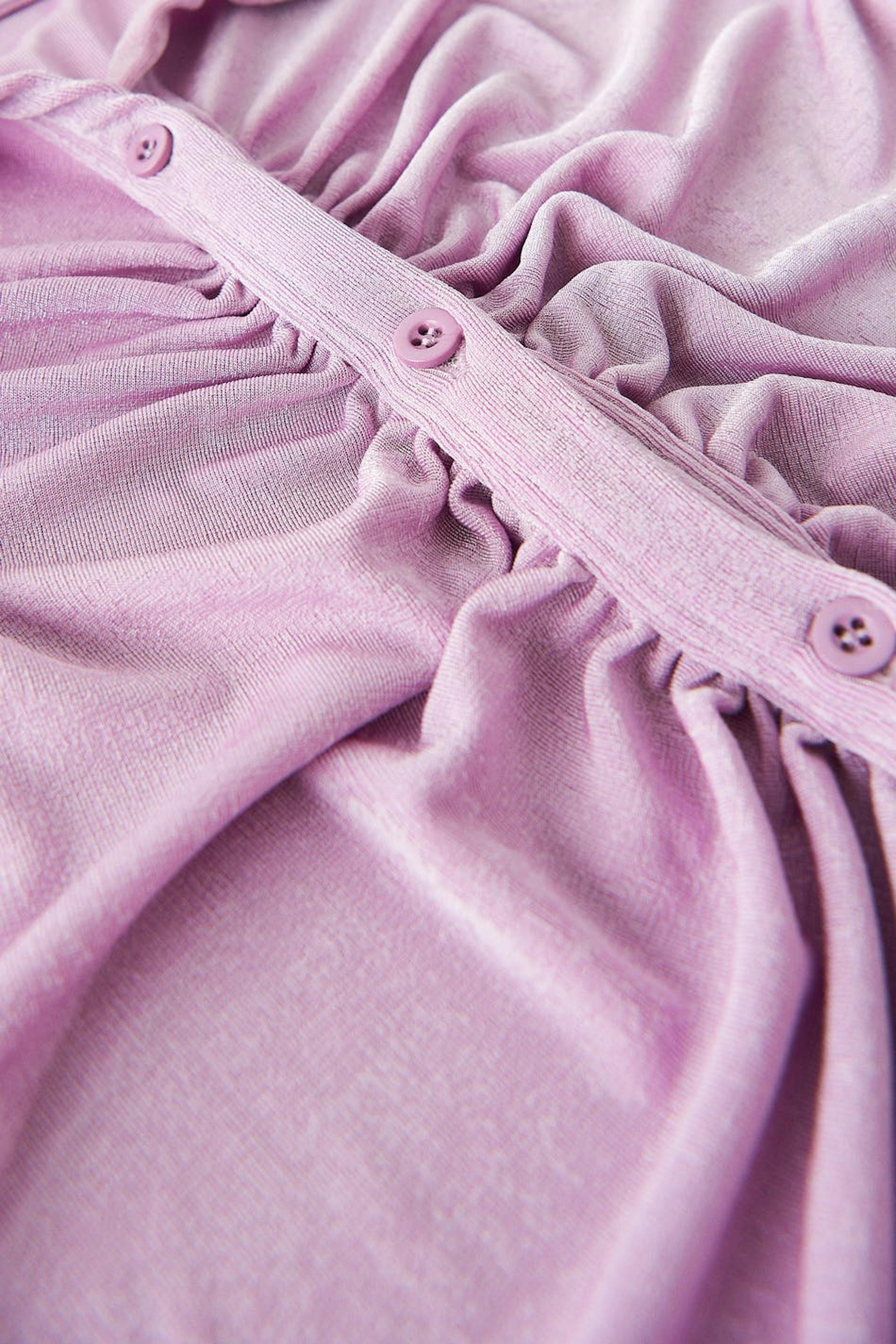 Pitkähihainen toppi poimutetulla efektillä edessä. Toppi on juhliin täydellisesti sopiva ja liila ja siinä on kaulus. Se valmistetaan trikoosta ja siinä on nappikiinnitys edessä ja vartalonmyötäinen sopivuus.