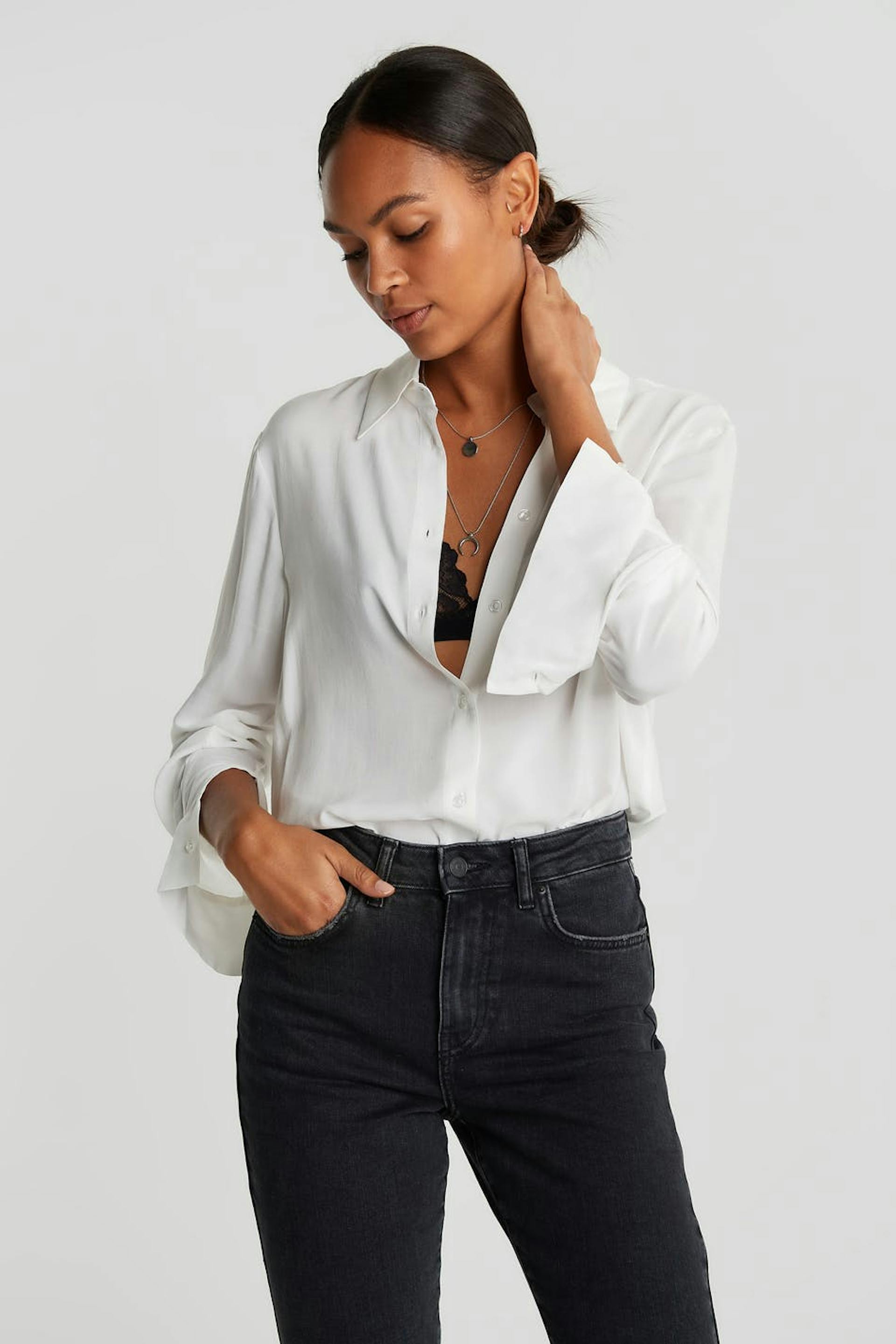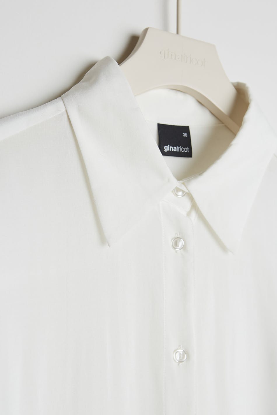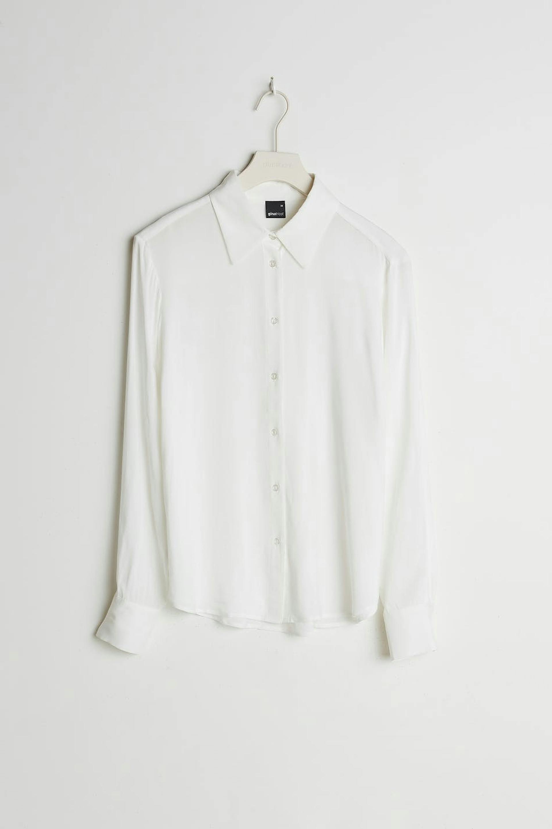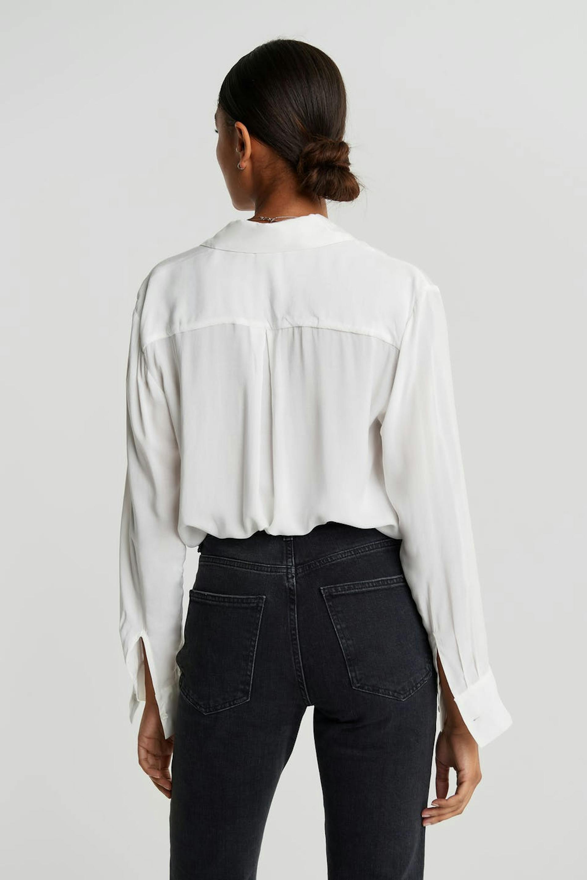 Pehmeä paita pitkillä hihoilla. Paita on valkoinen ja takaa hieman pidempi.