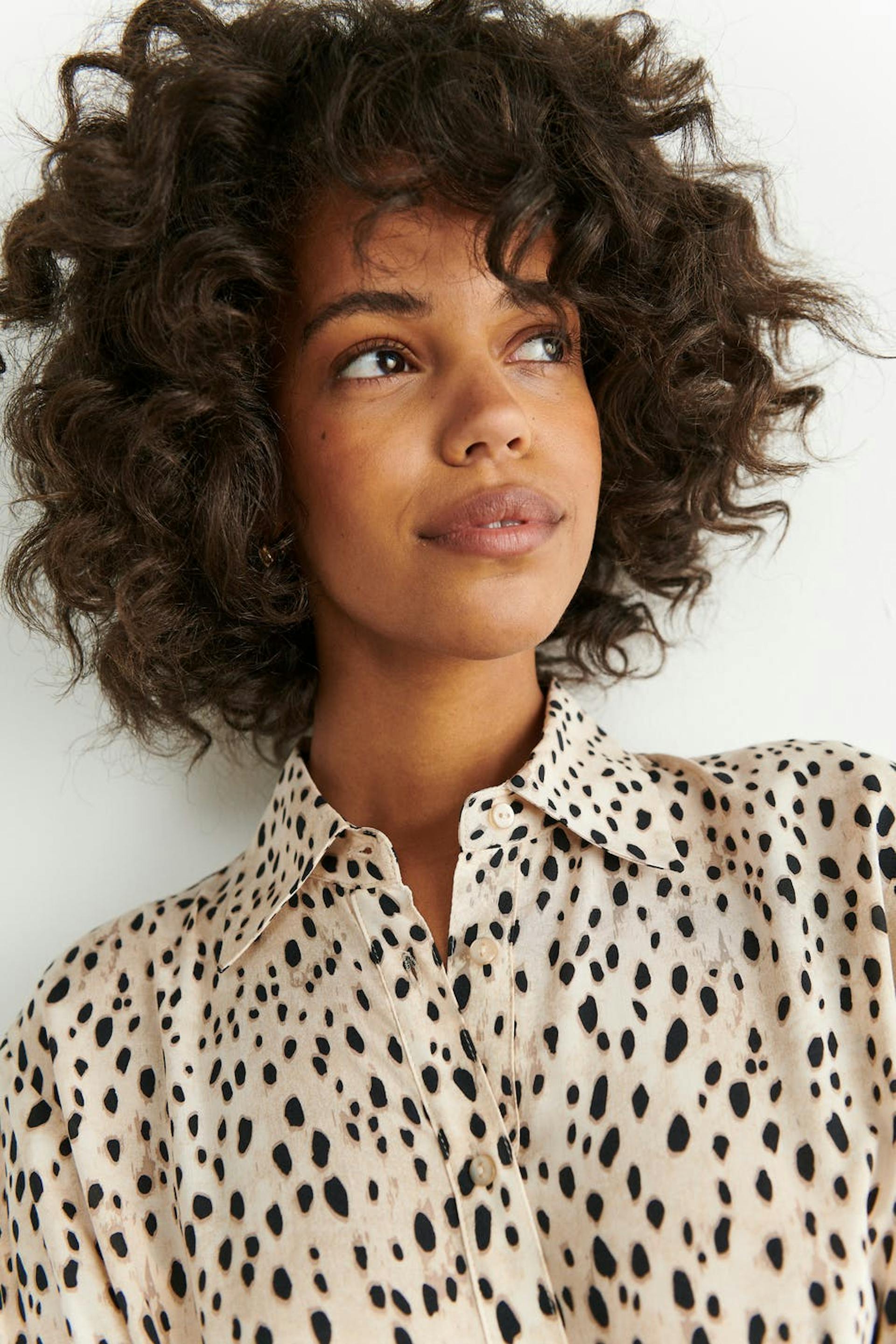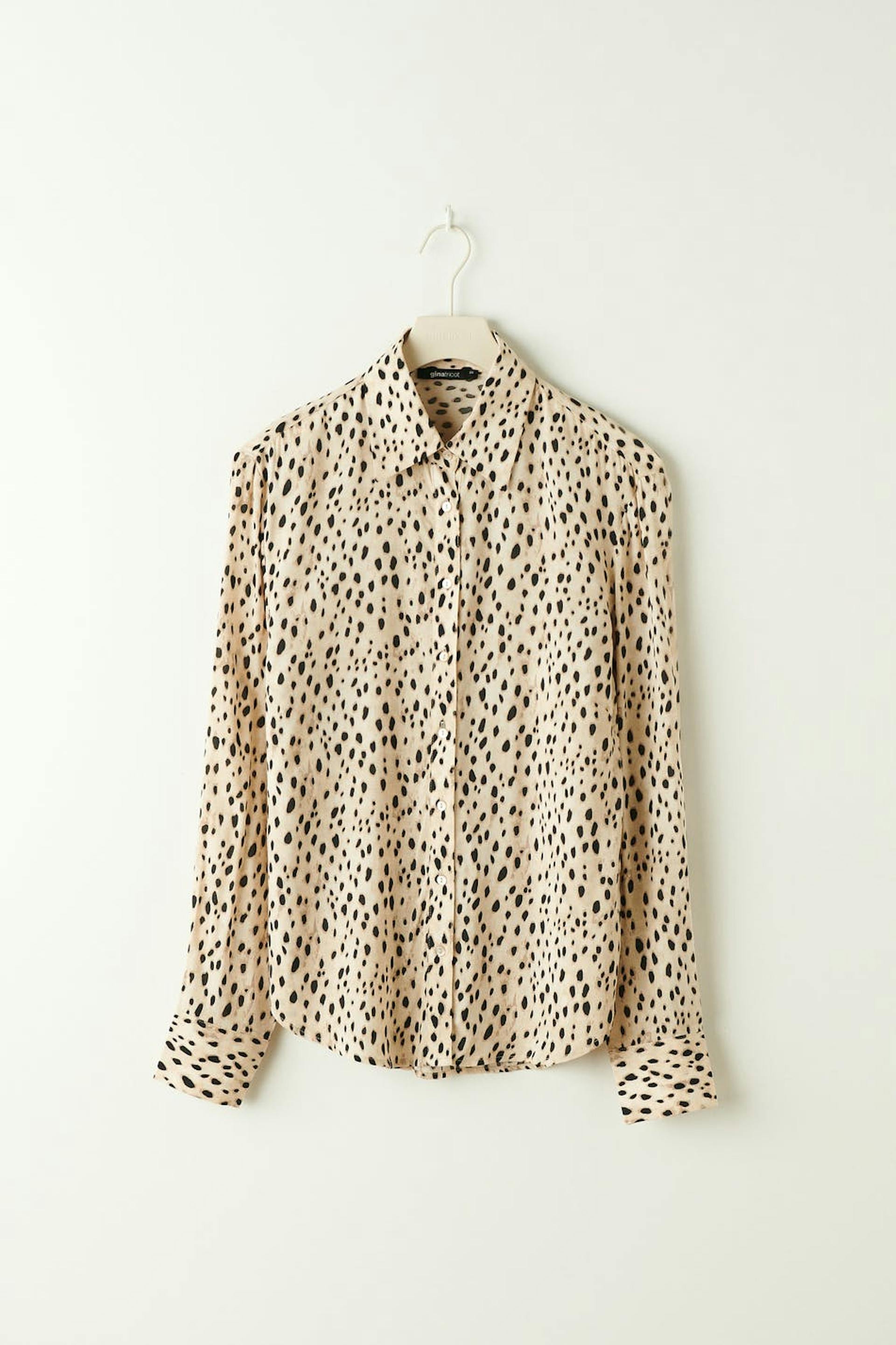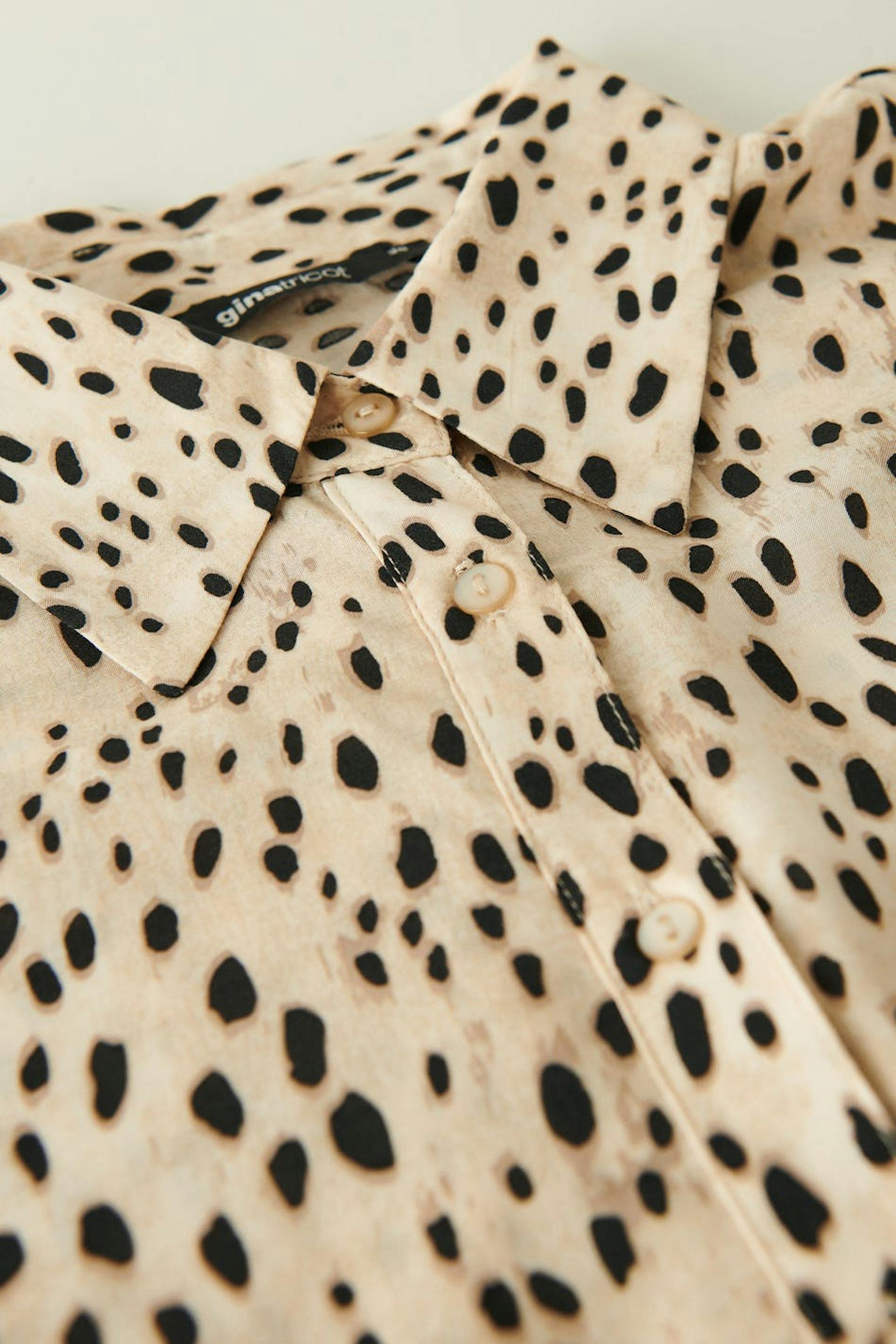 Leopardikuvioinen paita pehmeällä, kudotulla laadulla. Paita on ruskea ja siinä on kaulus. Siinä on napituslista edessä ja hieman pidempi pituus takana.
