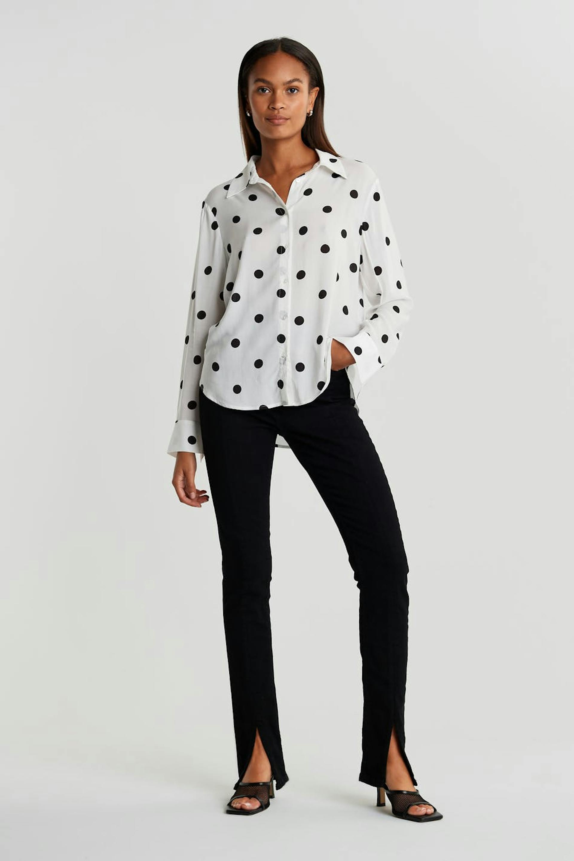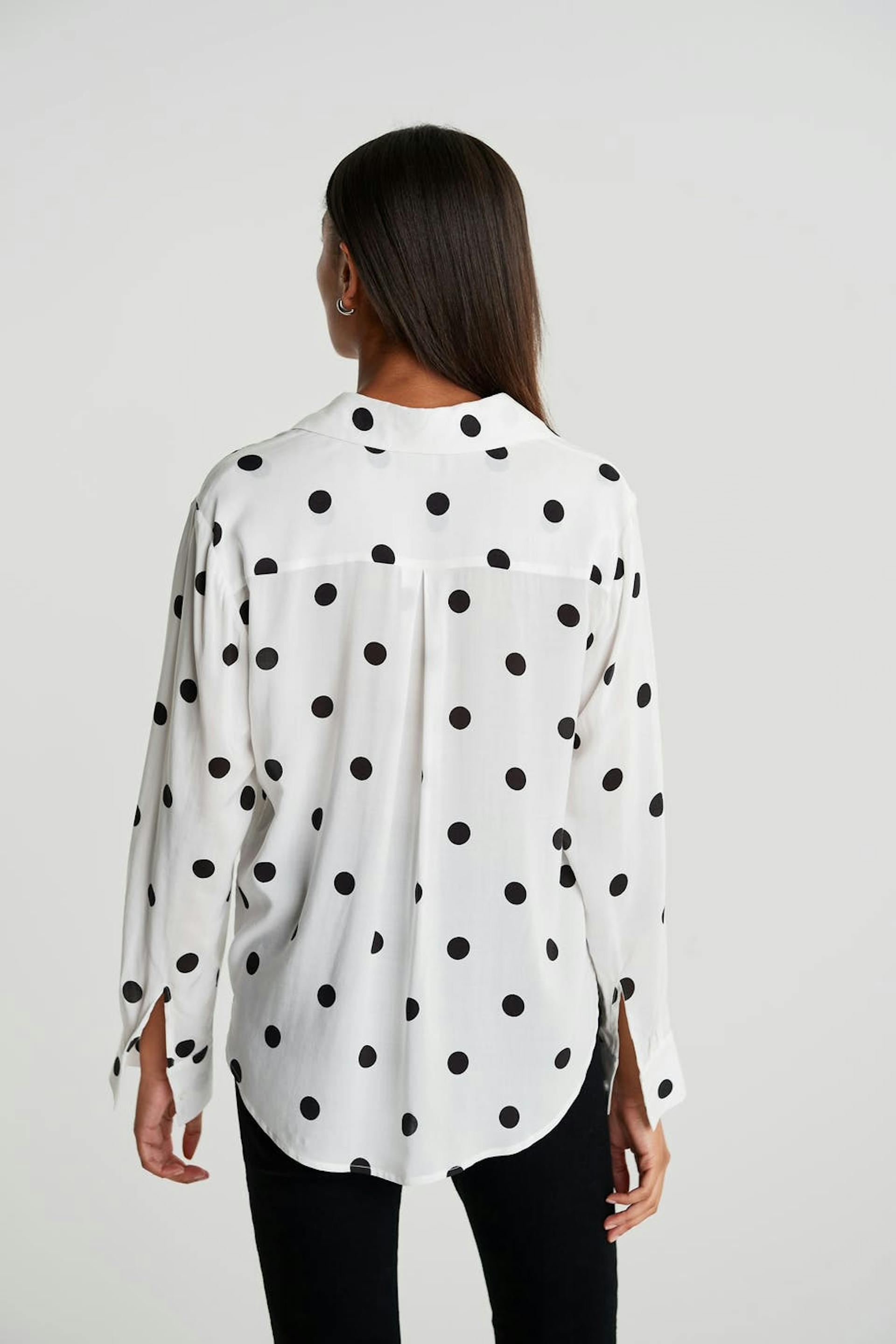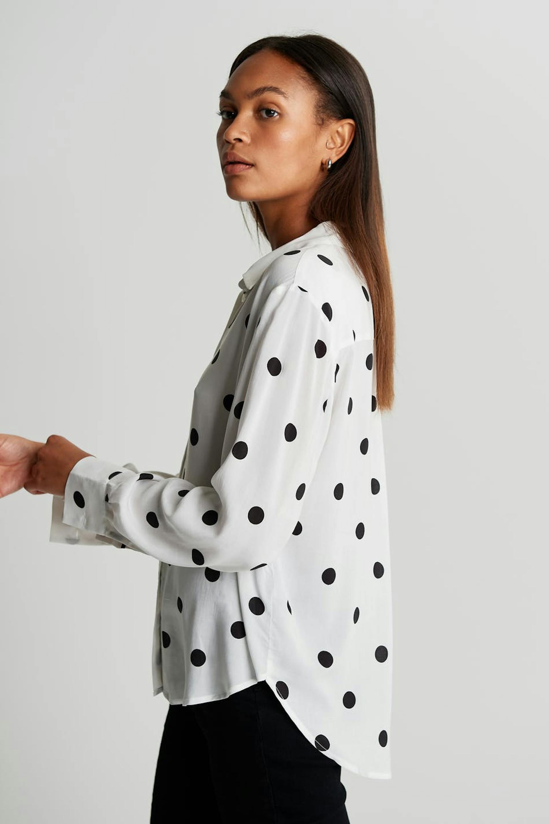 Pilkullinen paita pitkillä hihoilla. Paita on valkoinen, pehmeä ja takaa hieman pidempi.