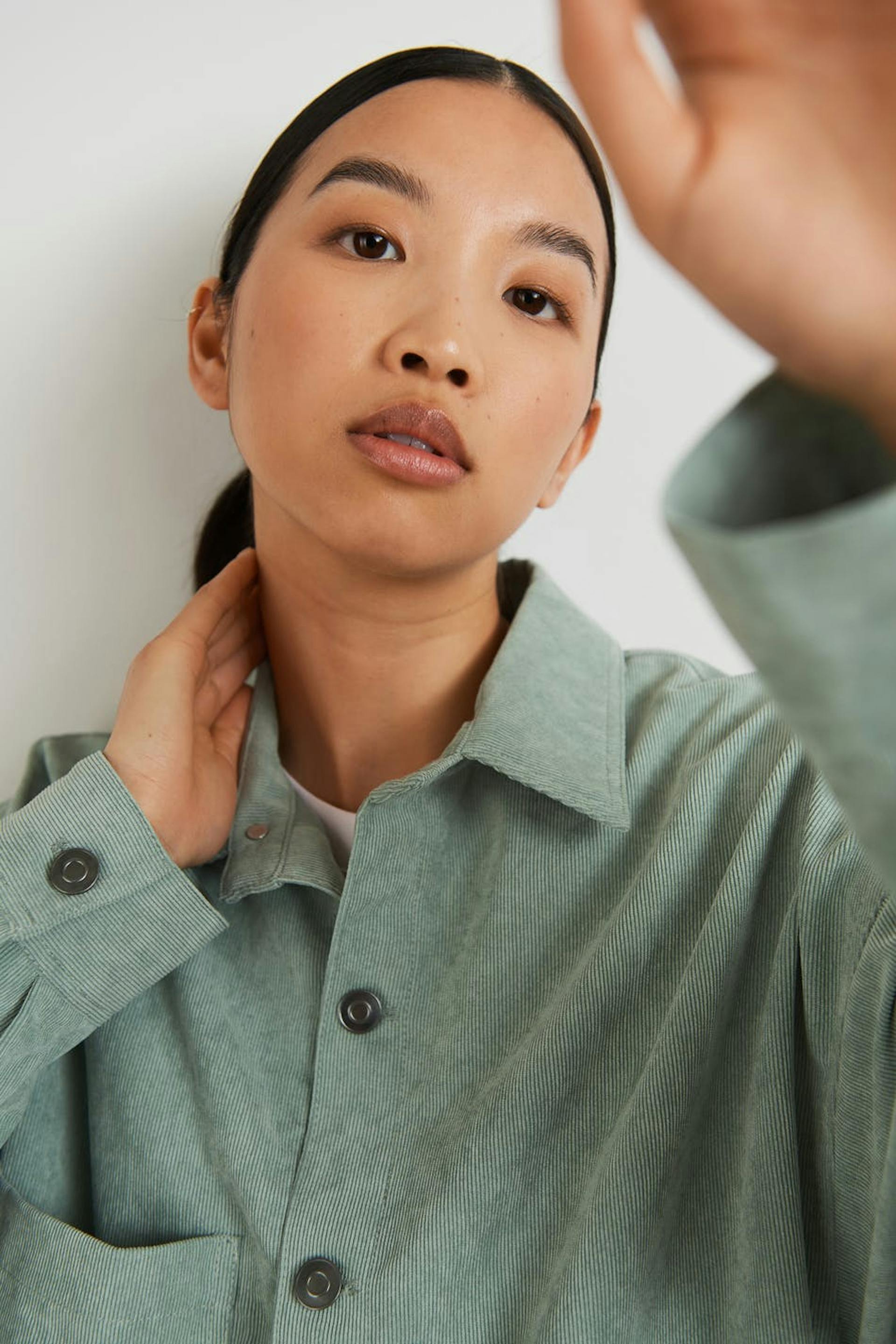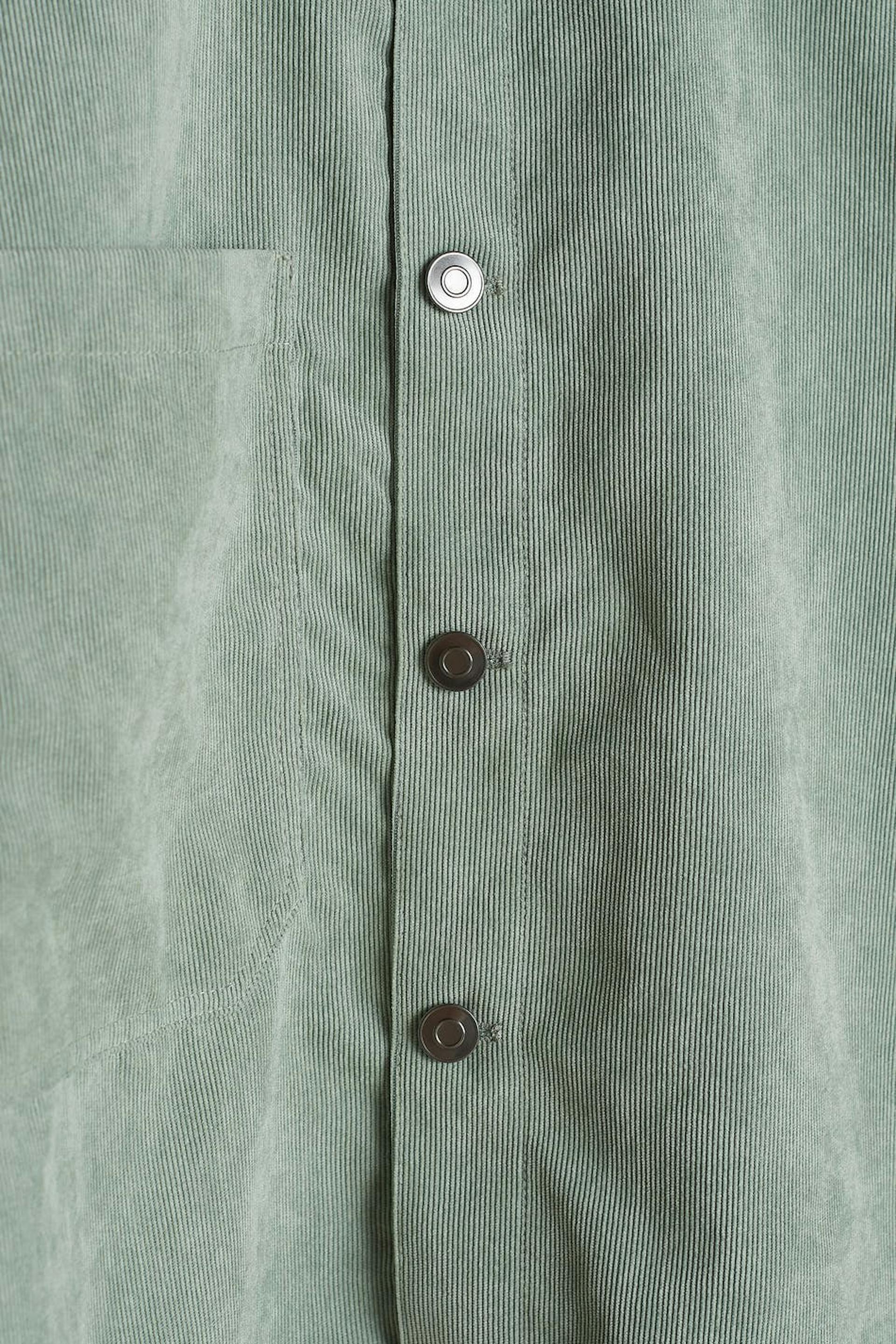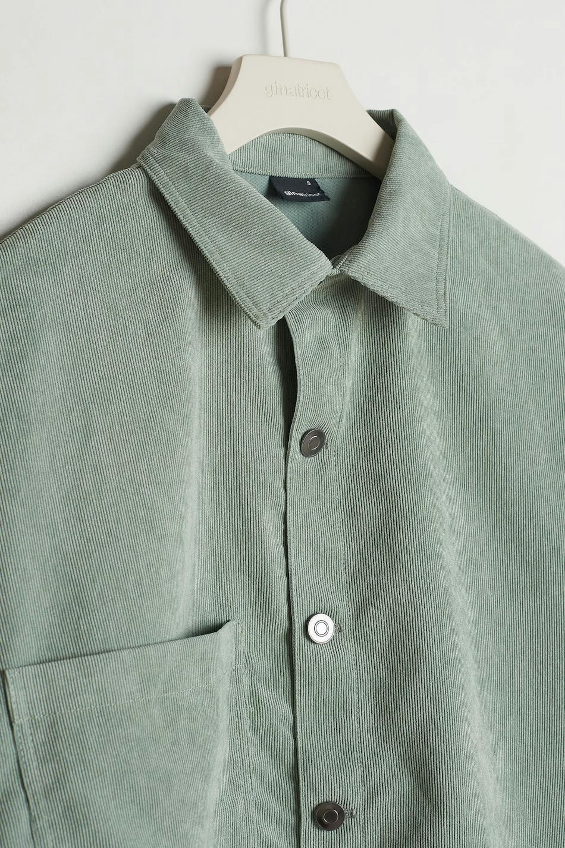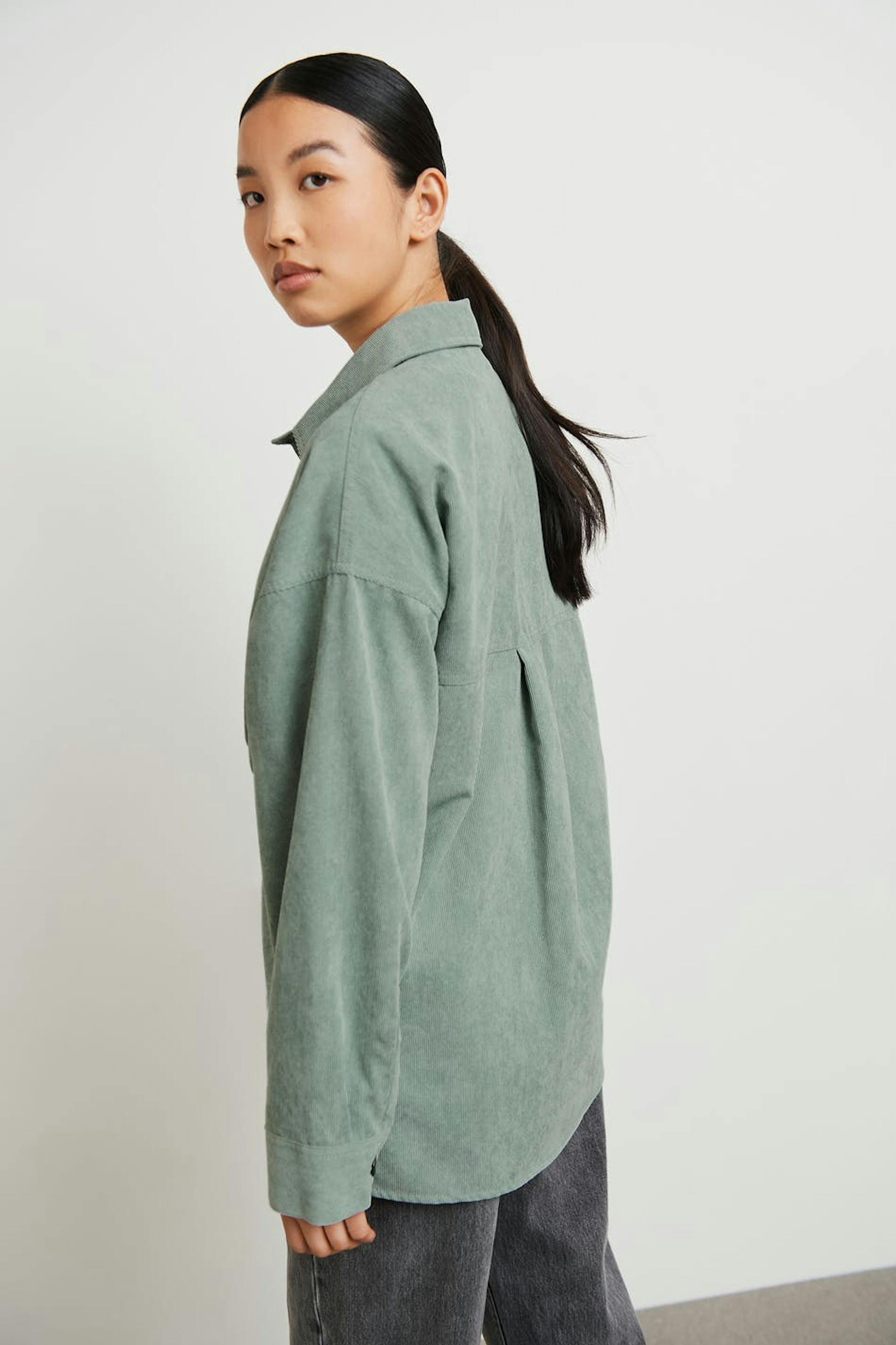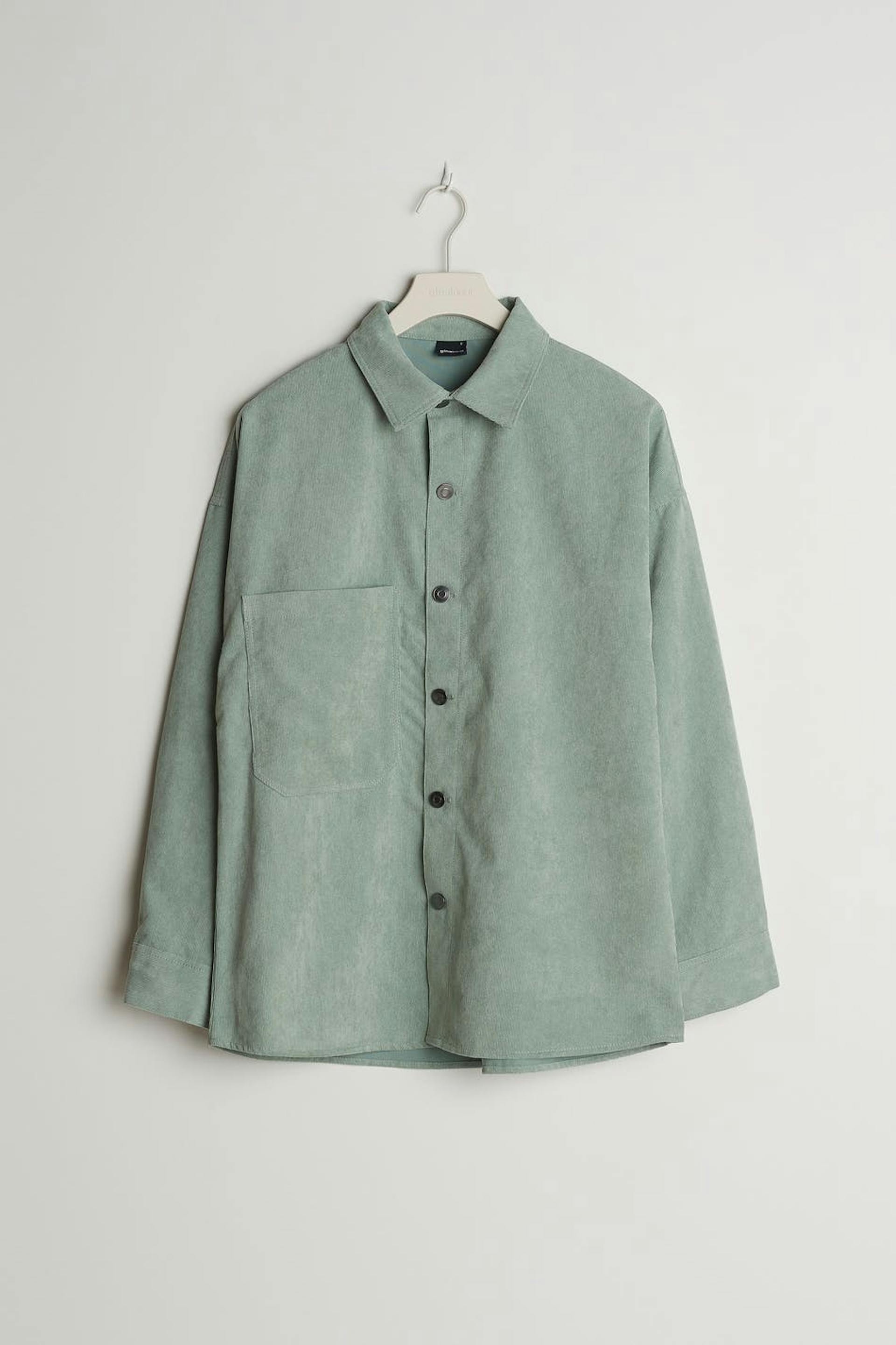Oversize paita rennolla leikkauksella. Paita on vihreä ja siinä on rintatasku yhdellä sivulla. Se valmistetaan vakosametista ja siinä on nappikiinnitys edessä.