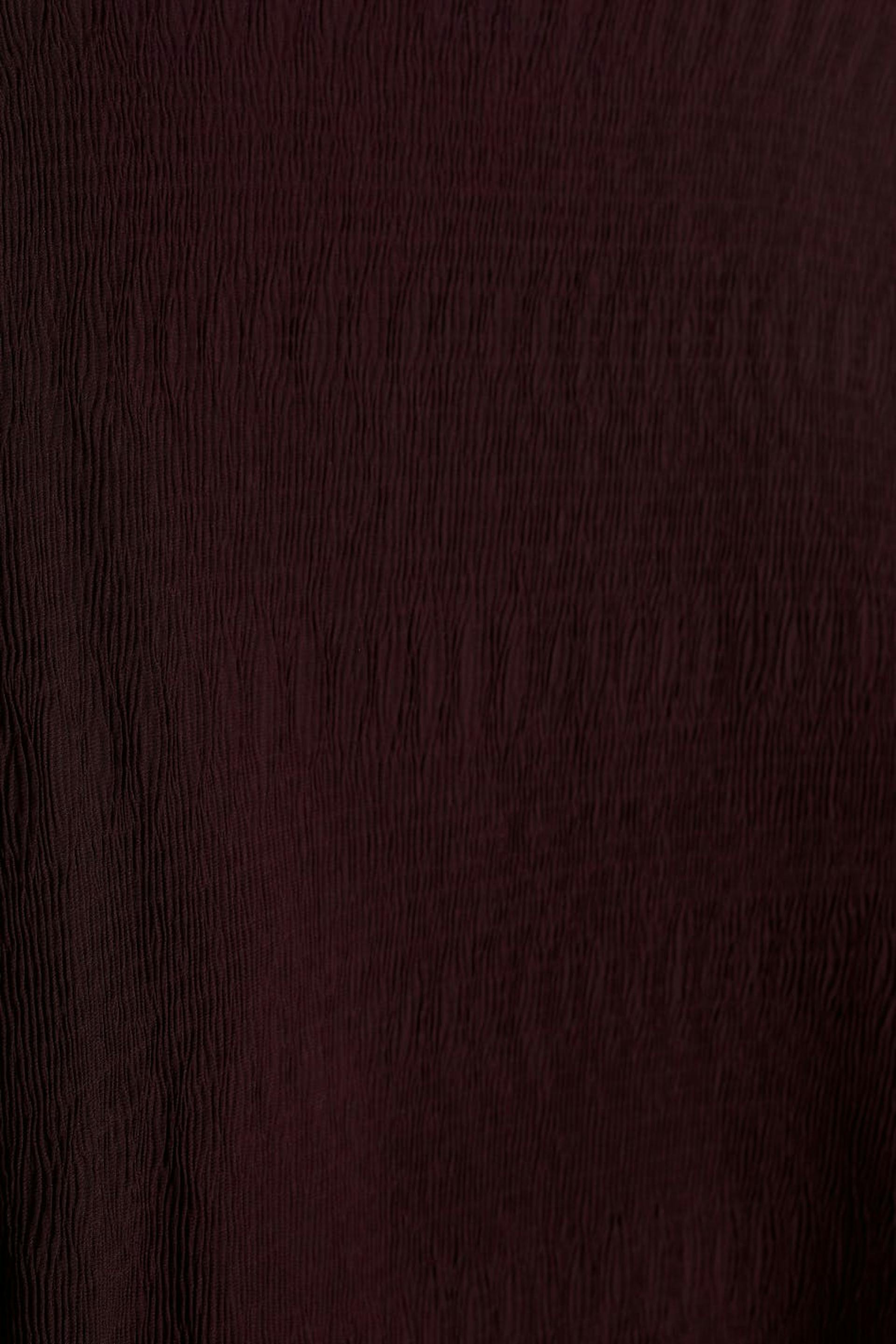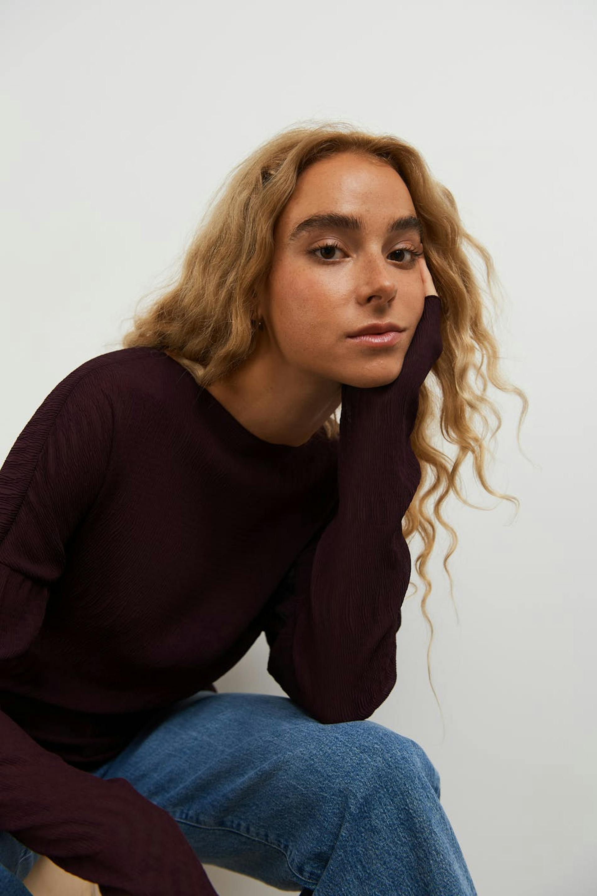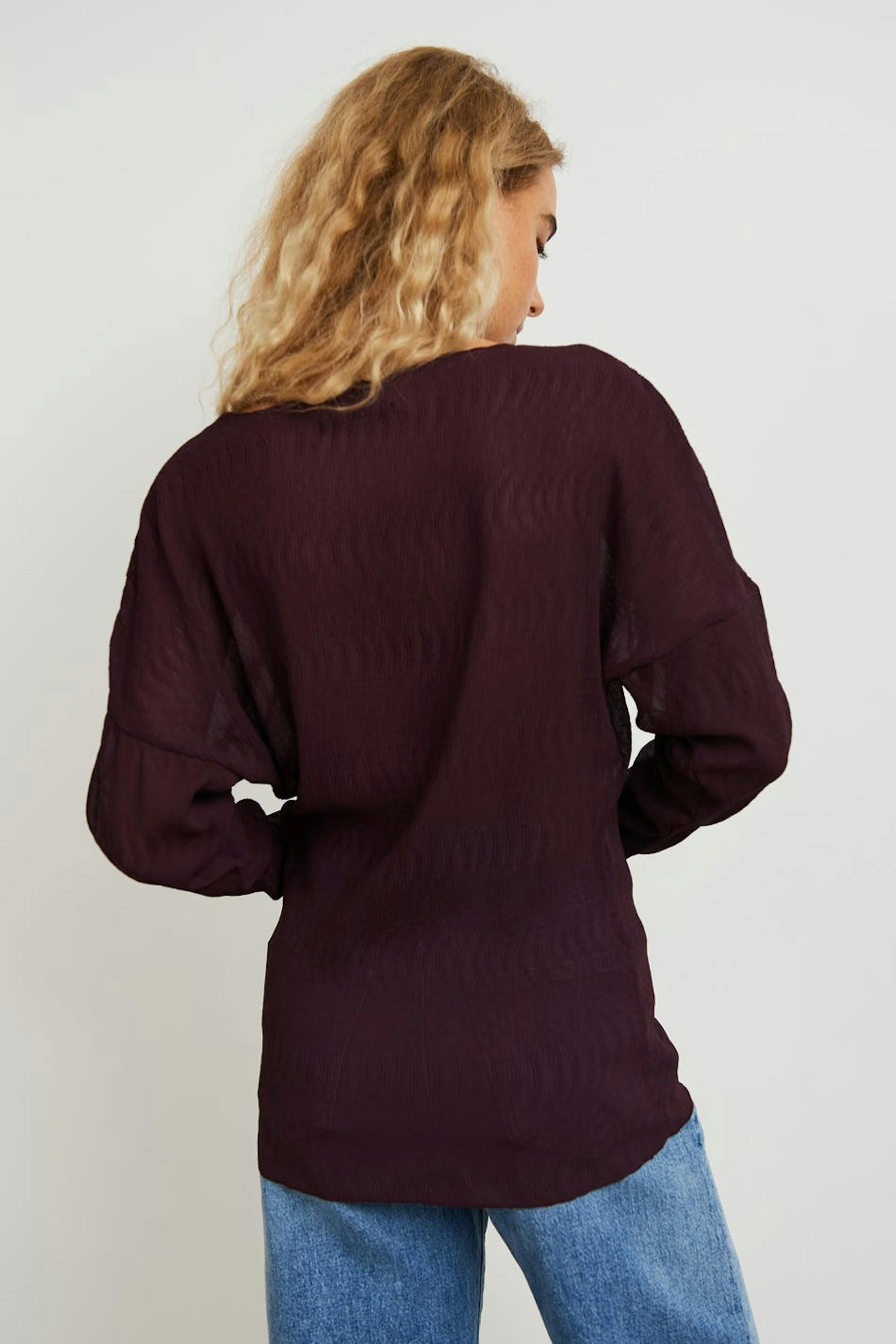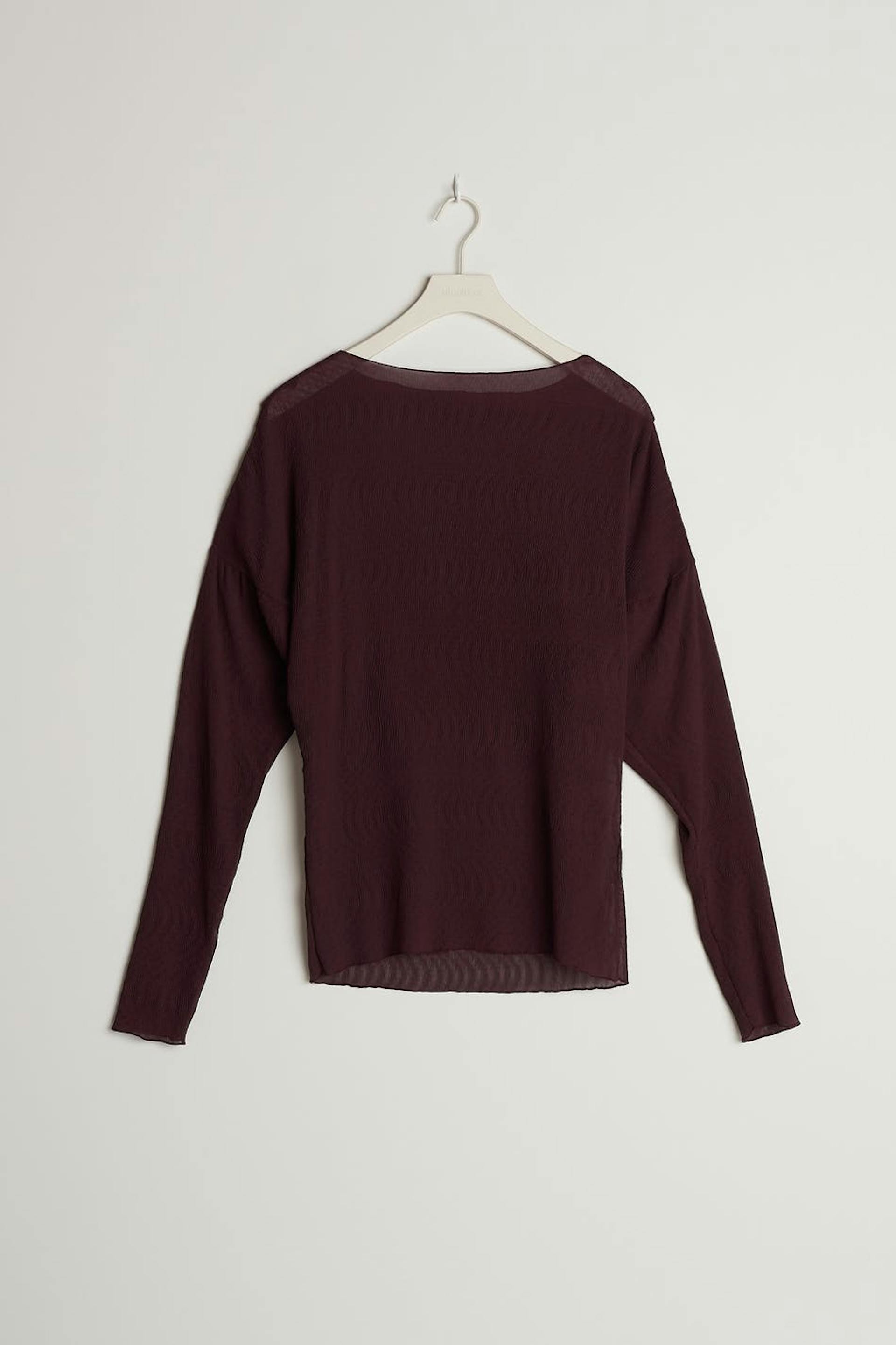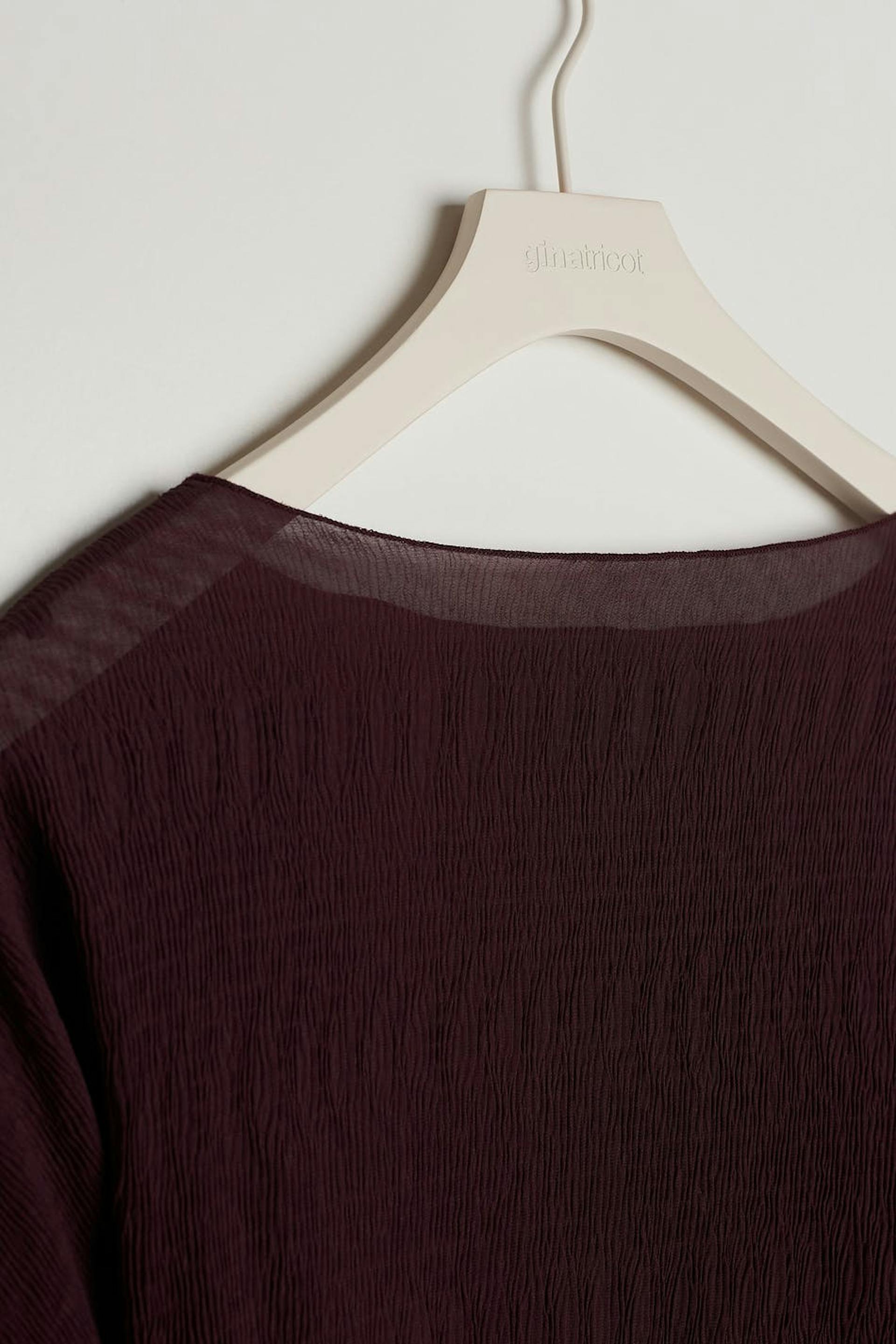 Pusero kevyesti rypistetyllä materiaalilla. Pusero on liila ja siinä on pitkät pudotetut hihat. Siinä on korkea kaula-aukko.