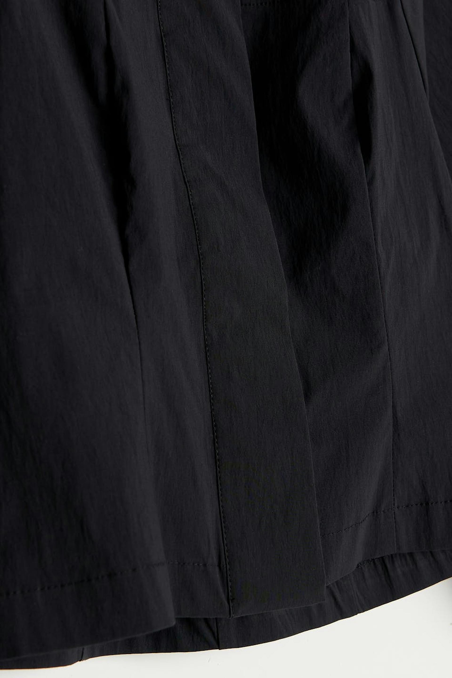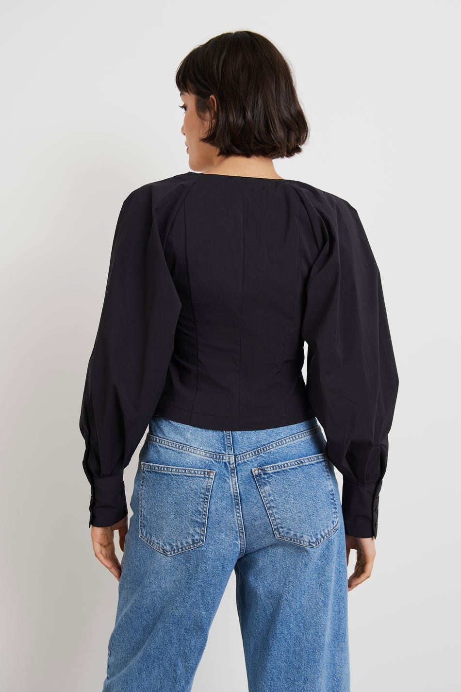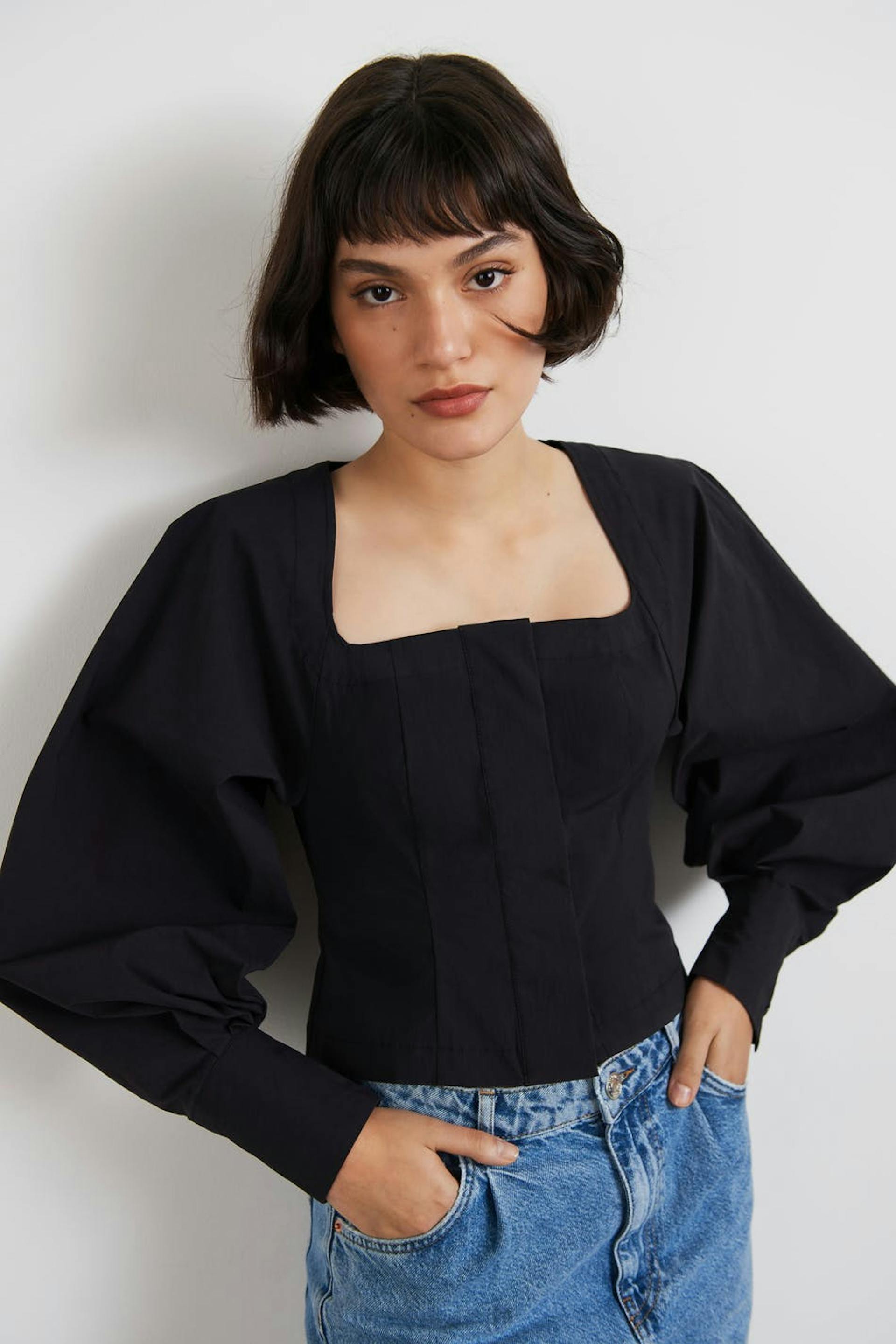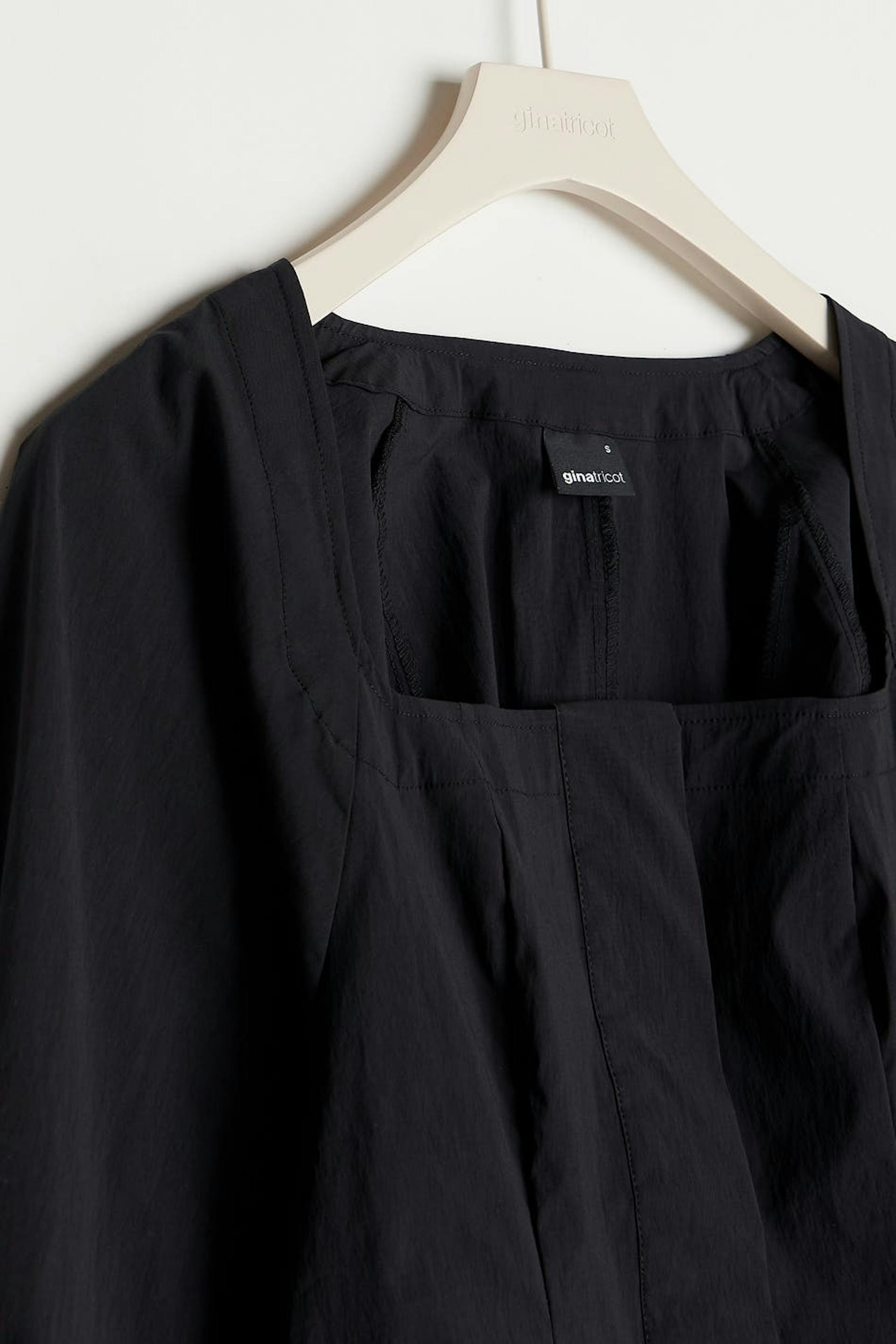 Pusero kookkailla hihoilla. Pusero on musta ja siinä on kudottu laatu puuvillasta joustolla. Siinä on neliöpääntie, raglanhihat, kätketty nappikiinnitys edessä ja napit kalvosimissa.