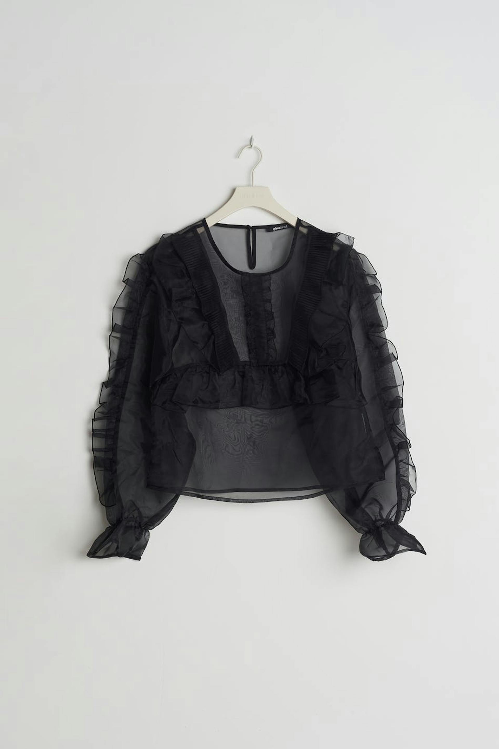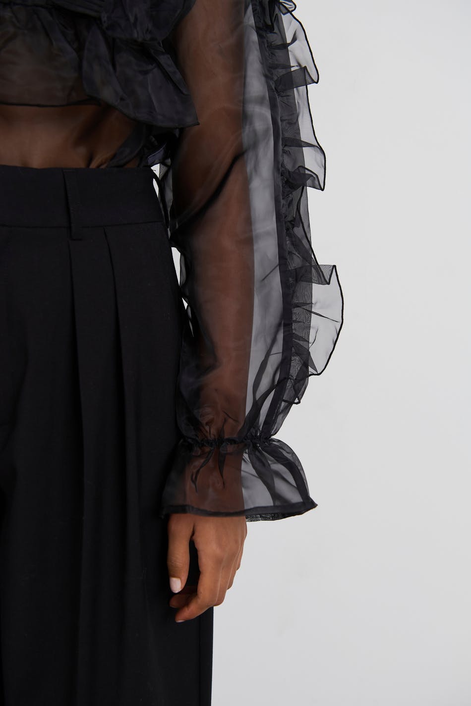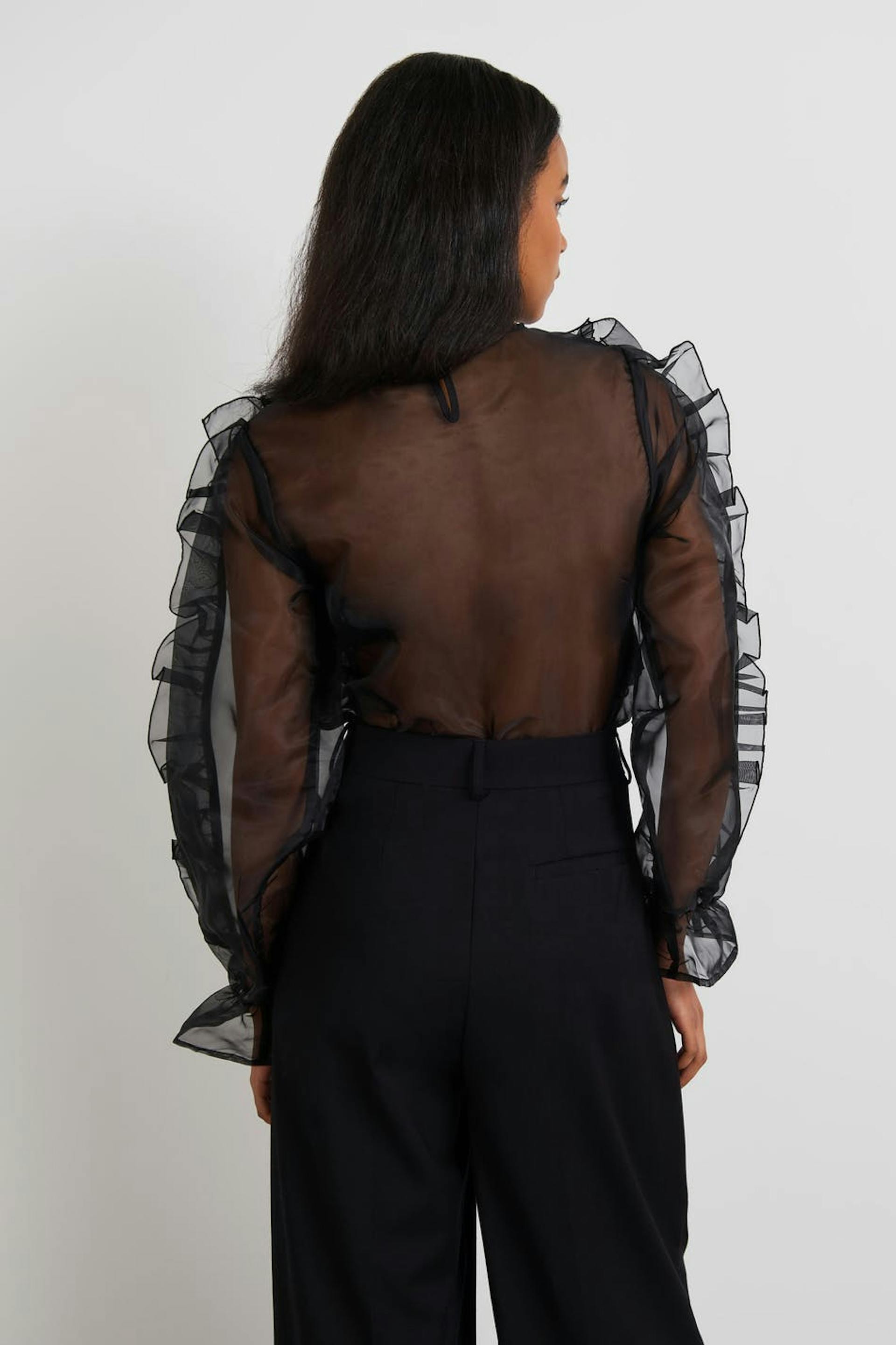 Kookas pusero röyhelöillä edessä ja molempia hihoja pitkin. Pusero on musta ja siinä on ilmavakudottukangas. Siinä on napituslista takana.