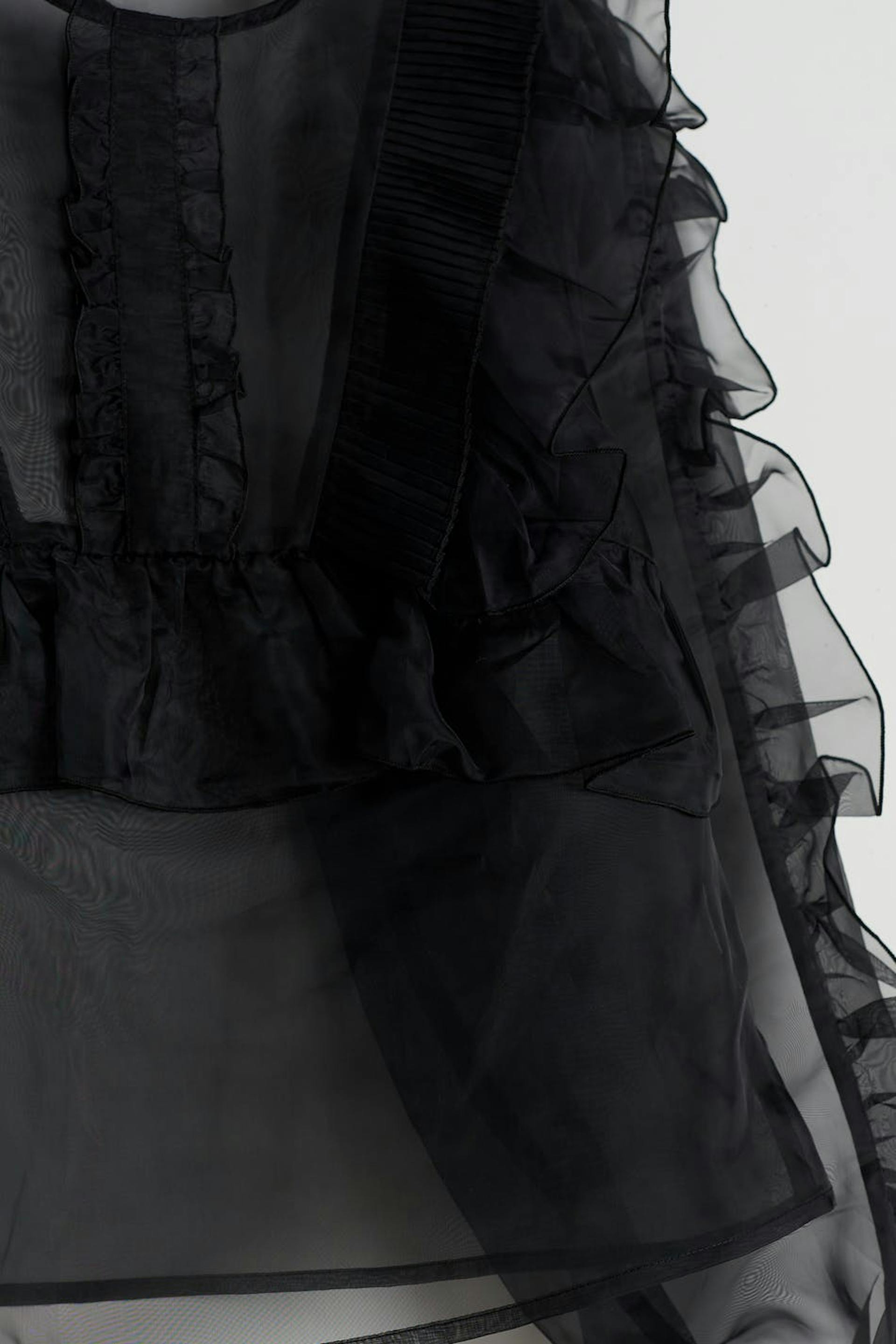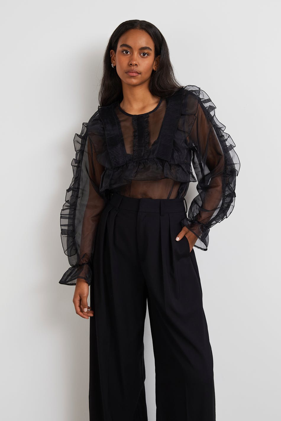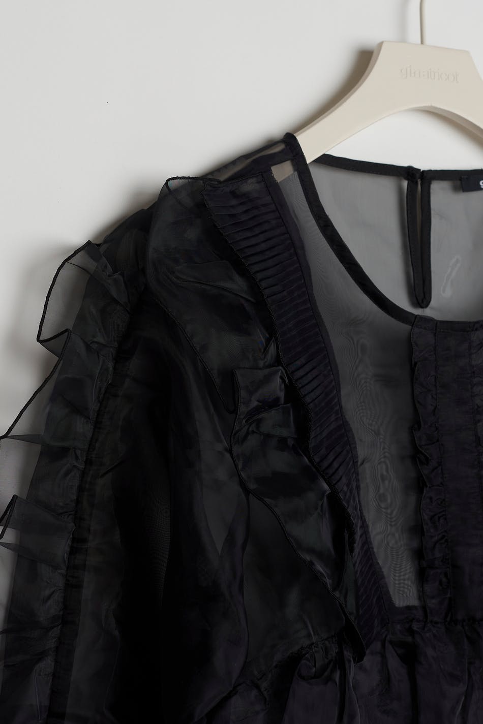 Kookas pusero röyhelöillä edessä ja molempia hihoja pitkin. Pusero on musta ja siinä on ilmavakudottukangas. Siinä on napituslista takana.
