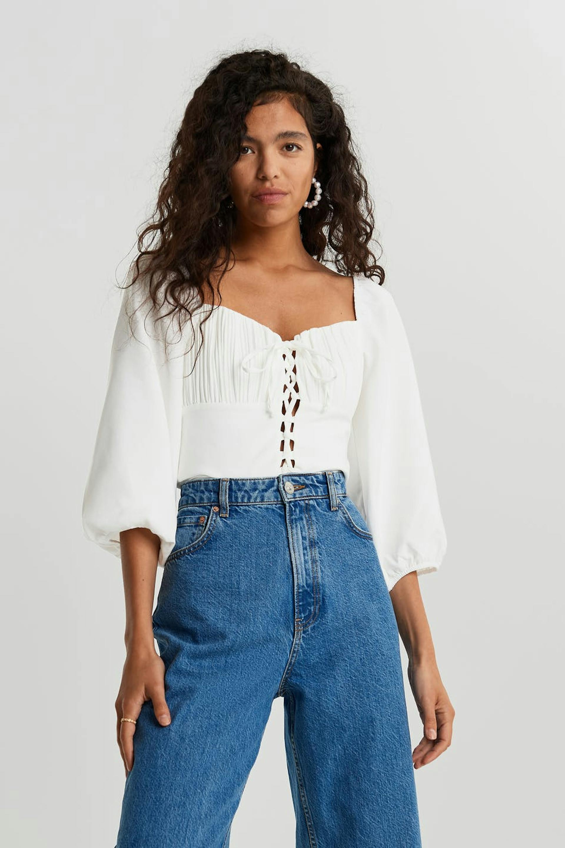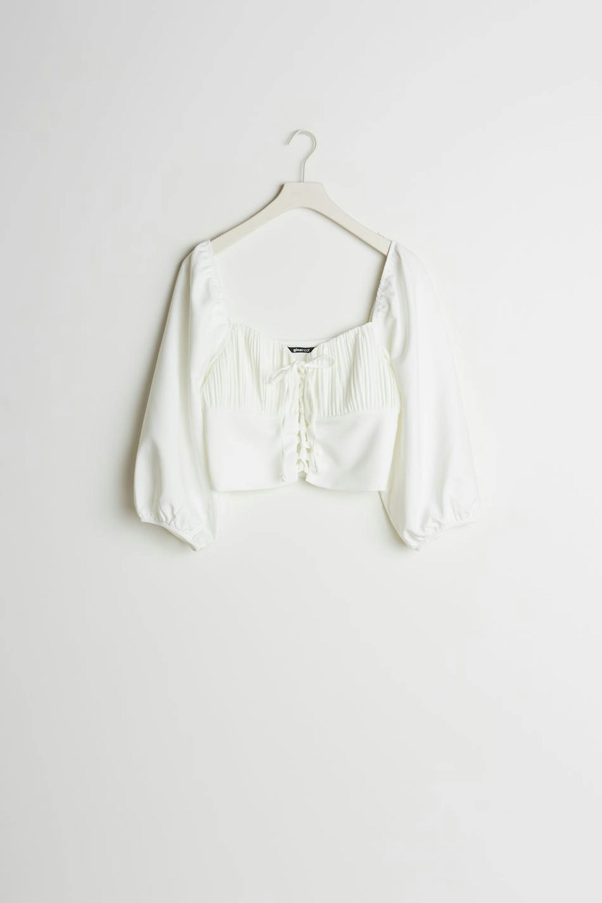 Lyhyt paita vartalonmyötäisellä istuvuudella. Paita on juhliin täydellisesti sopiva ja valkoinen ja siinä on rypytys rinnan yli. Se on juhliin täydellisesti sopiva ja siinä on solmuyksityiskohta keskellä ja puolipitkät hihat.