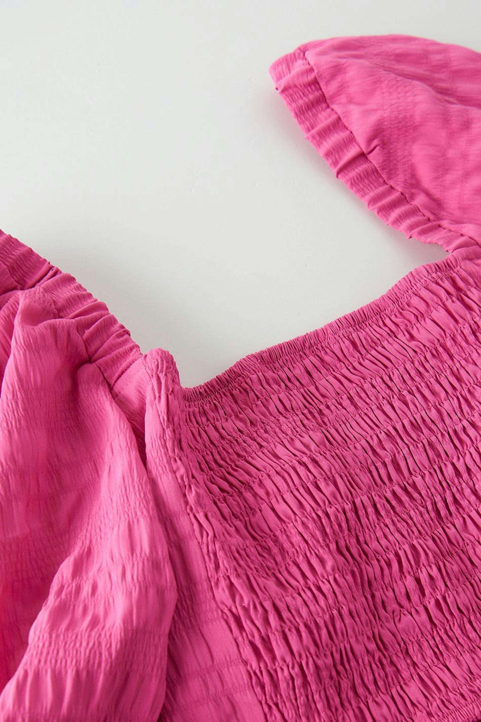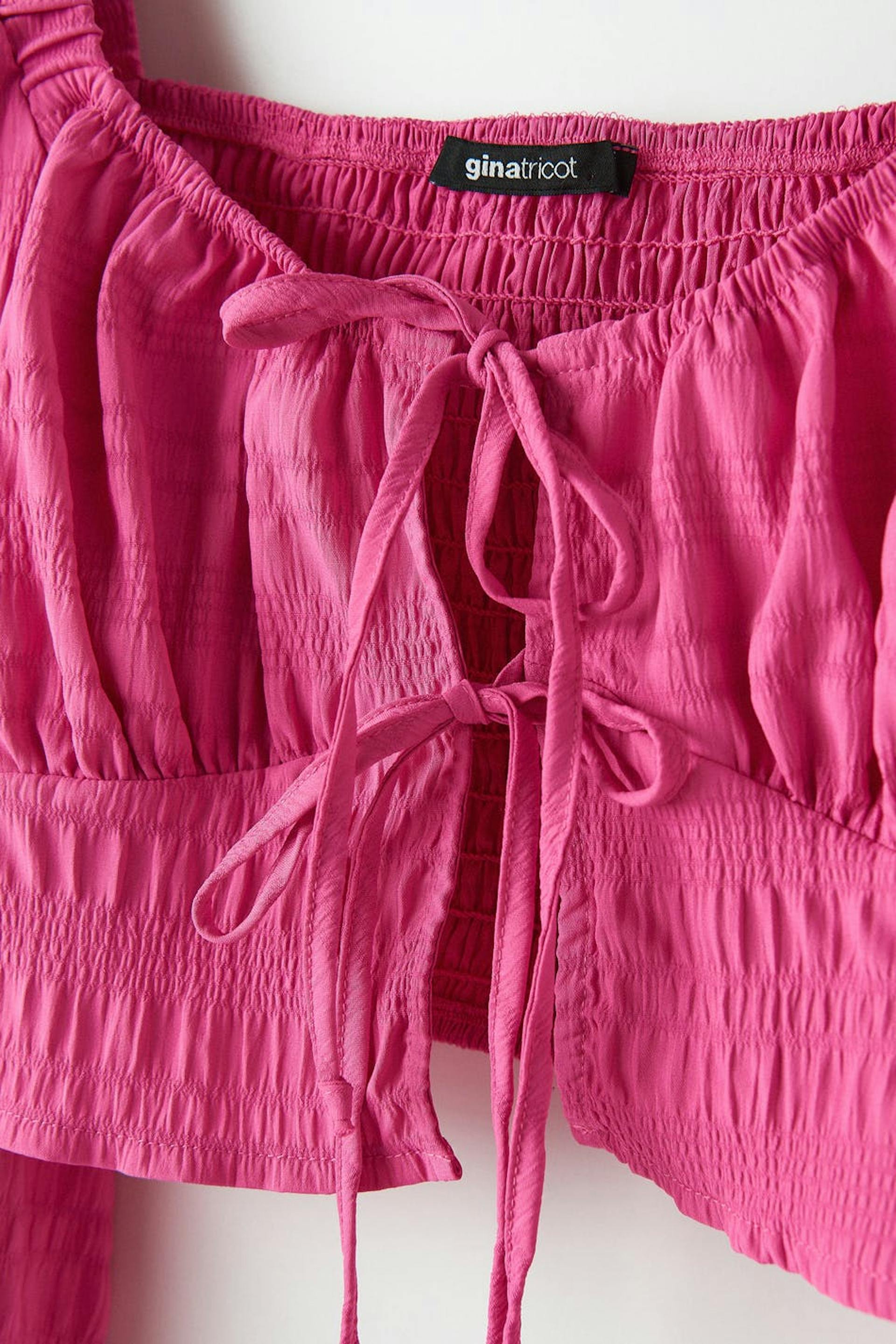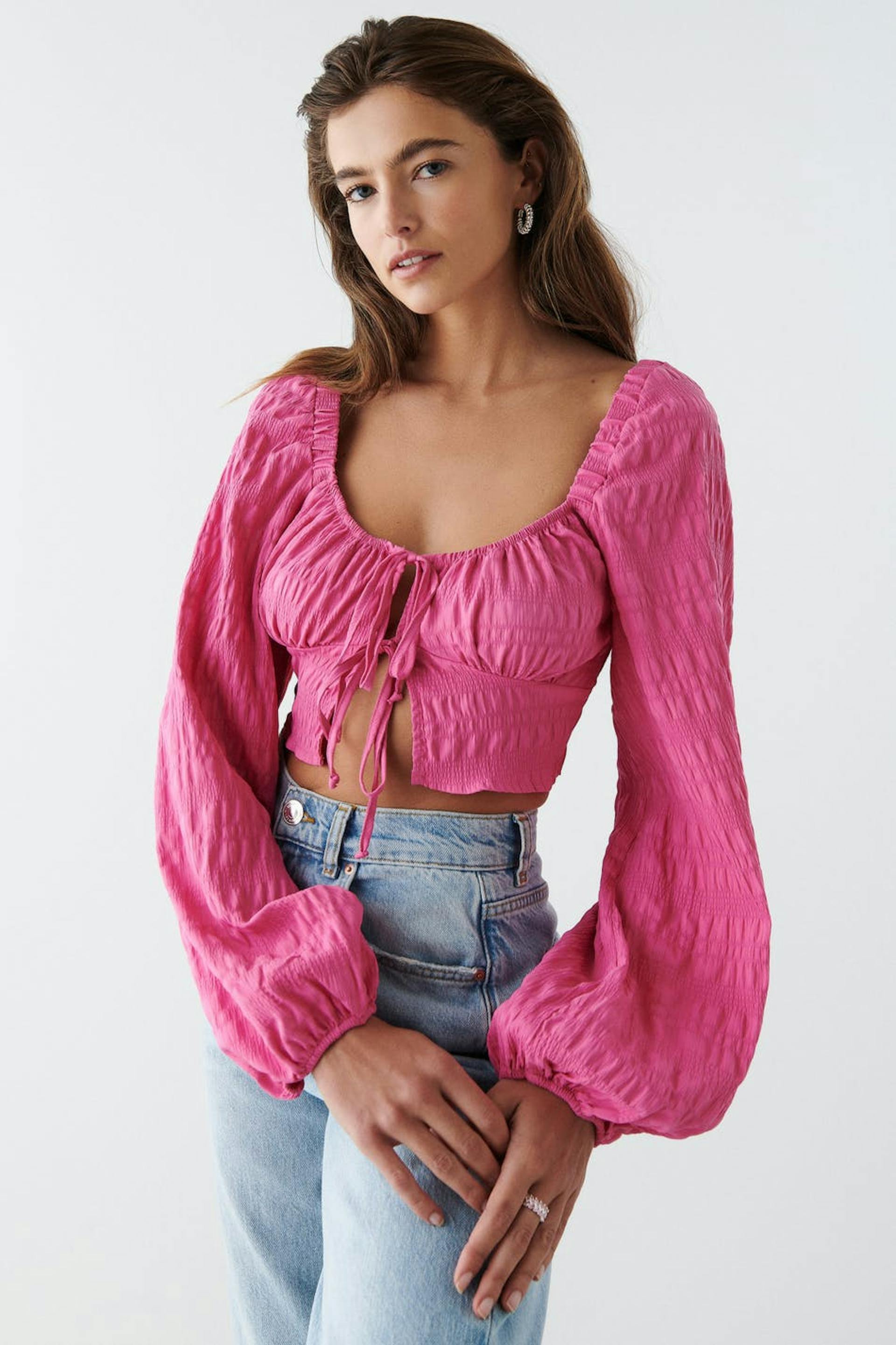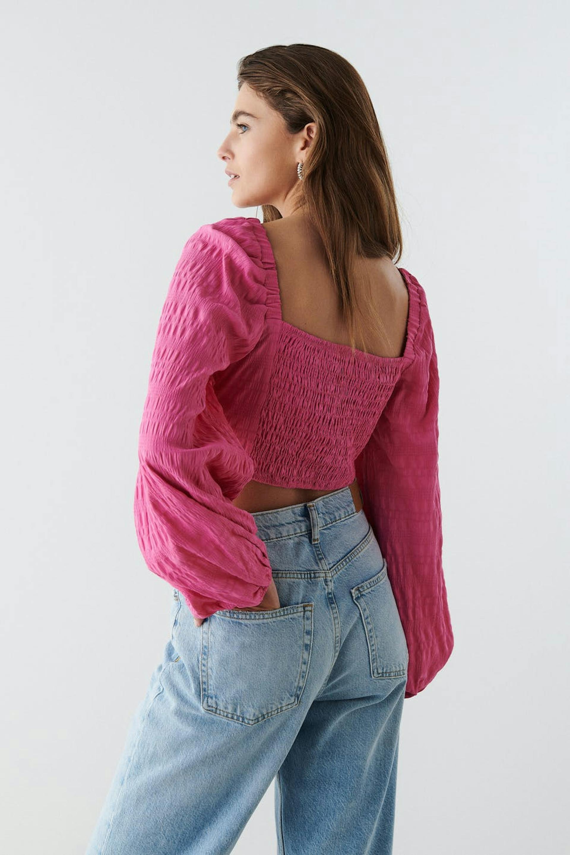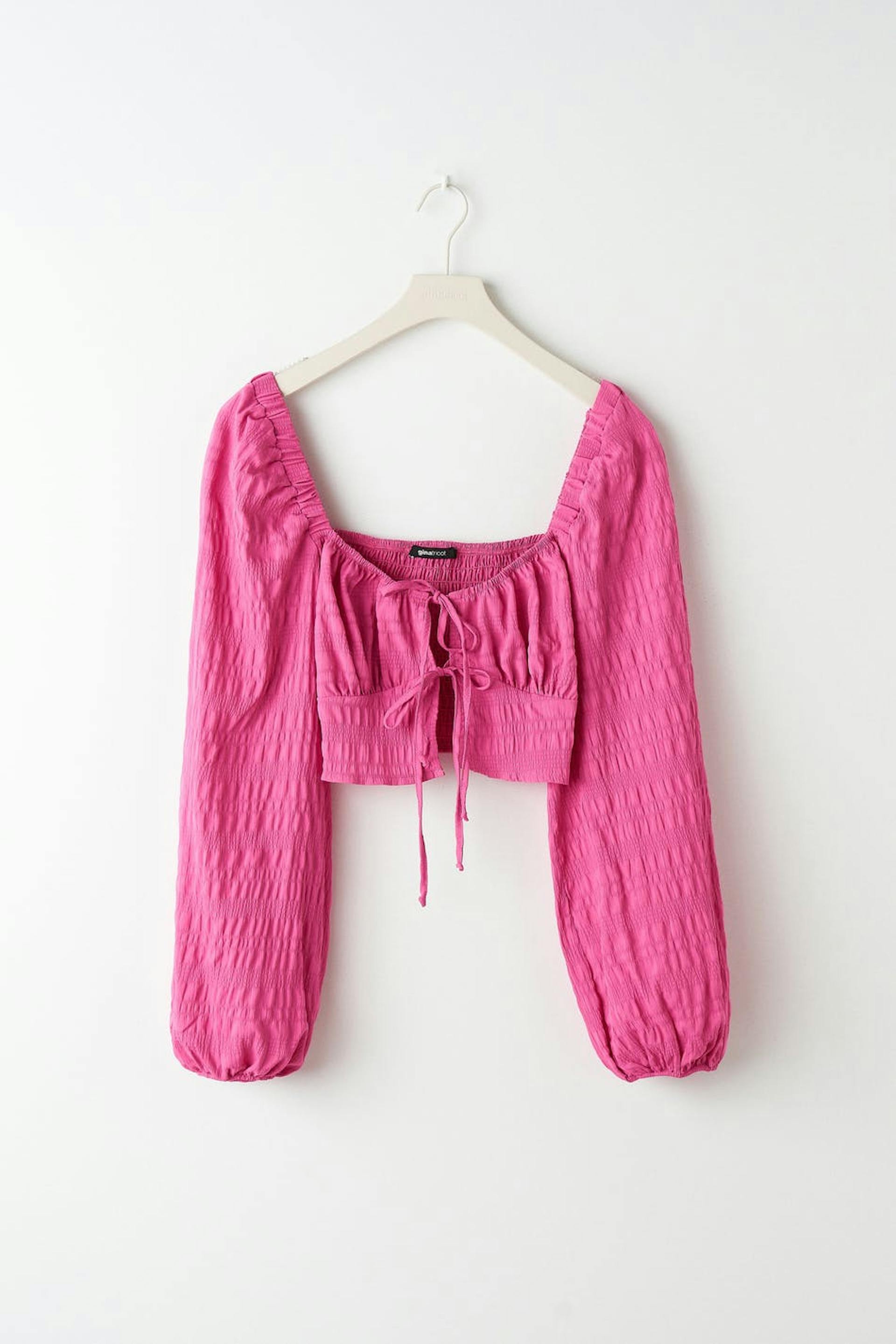 Cropattu pusero pitkillä puhvihihoilla. Pusero on pinkki ja siinä on neliöpääntie. Siinä on rakennemateriaali, vartalonmyötäinen istuvuus, solmuyksityiskohdat edessä, rypytys selässä ja kuminauha hihansuissa ja olkapäissä.