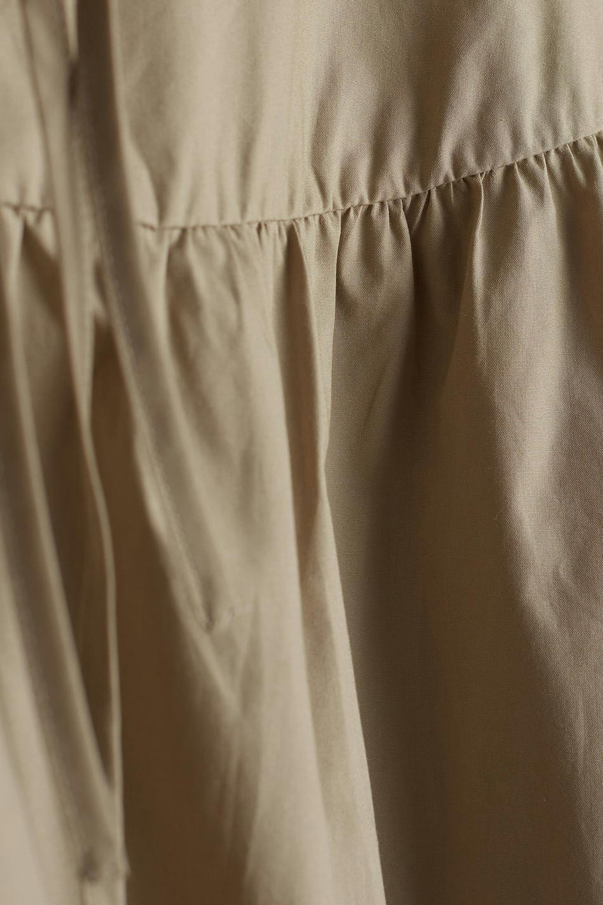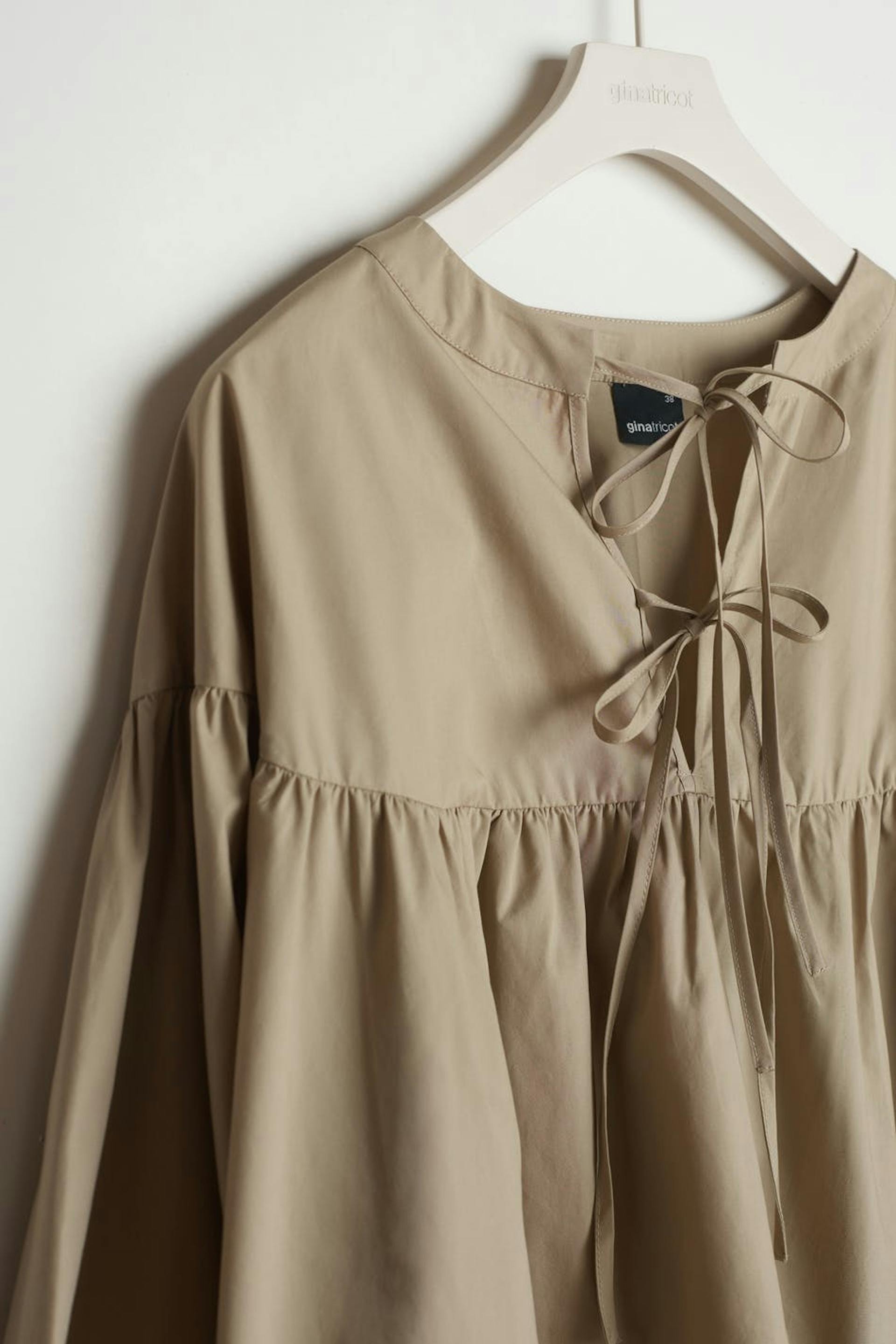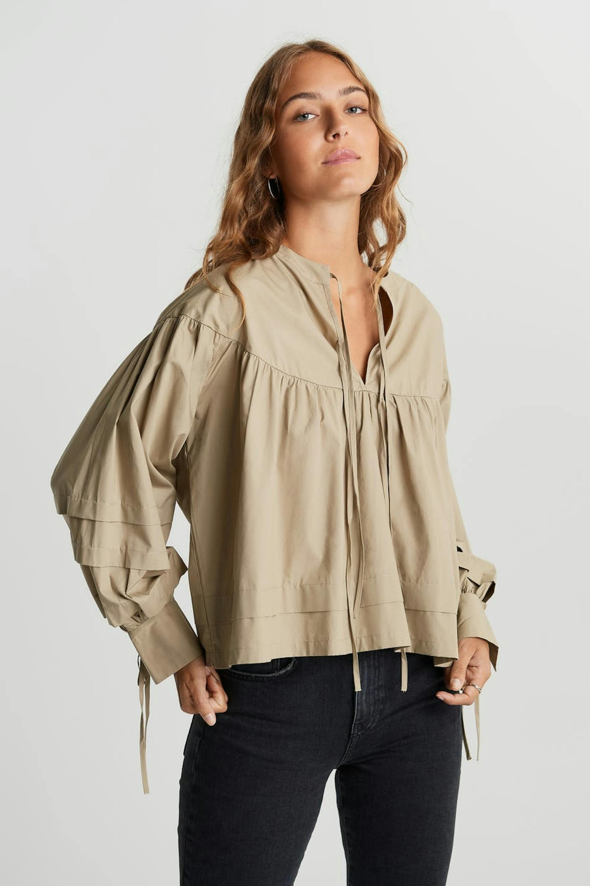 Kookas pusero pitkillä puff sleeve-paidoilla. Pusero on beige ja siinä on nauhaolkaimet kaula-aukossa ja hihansuissa.