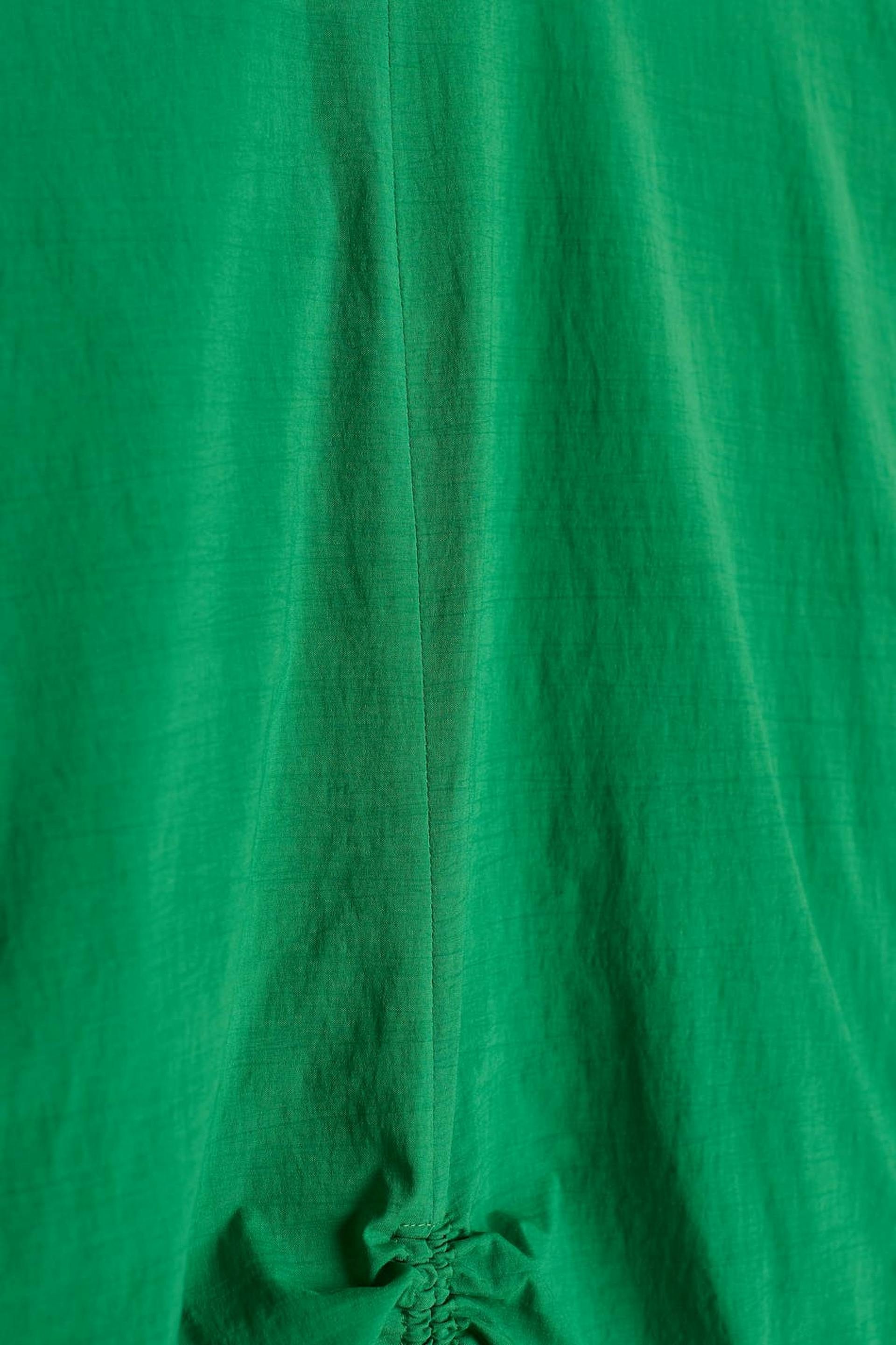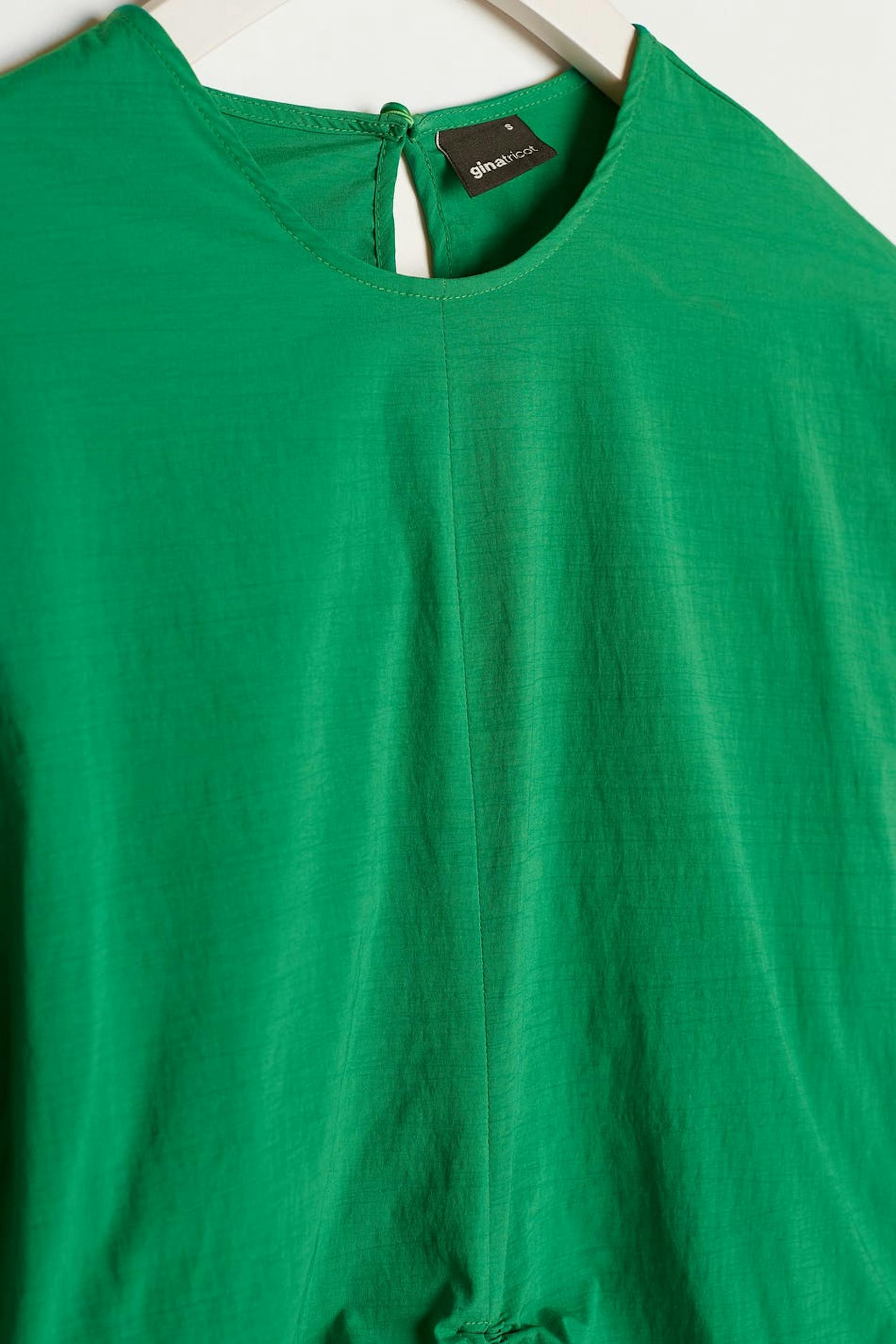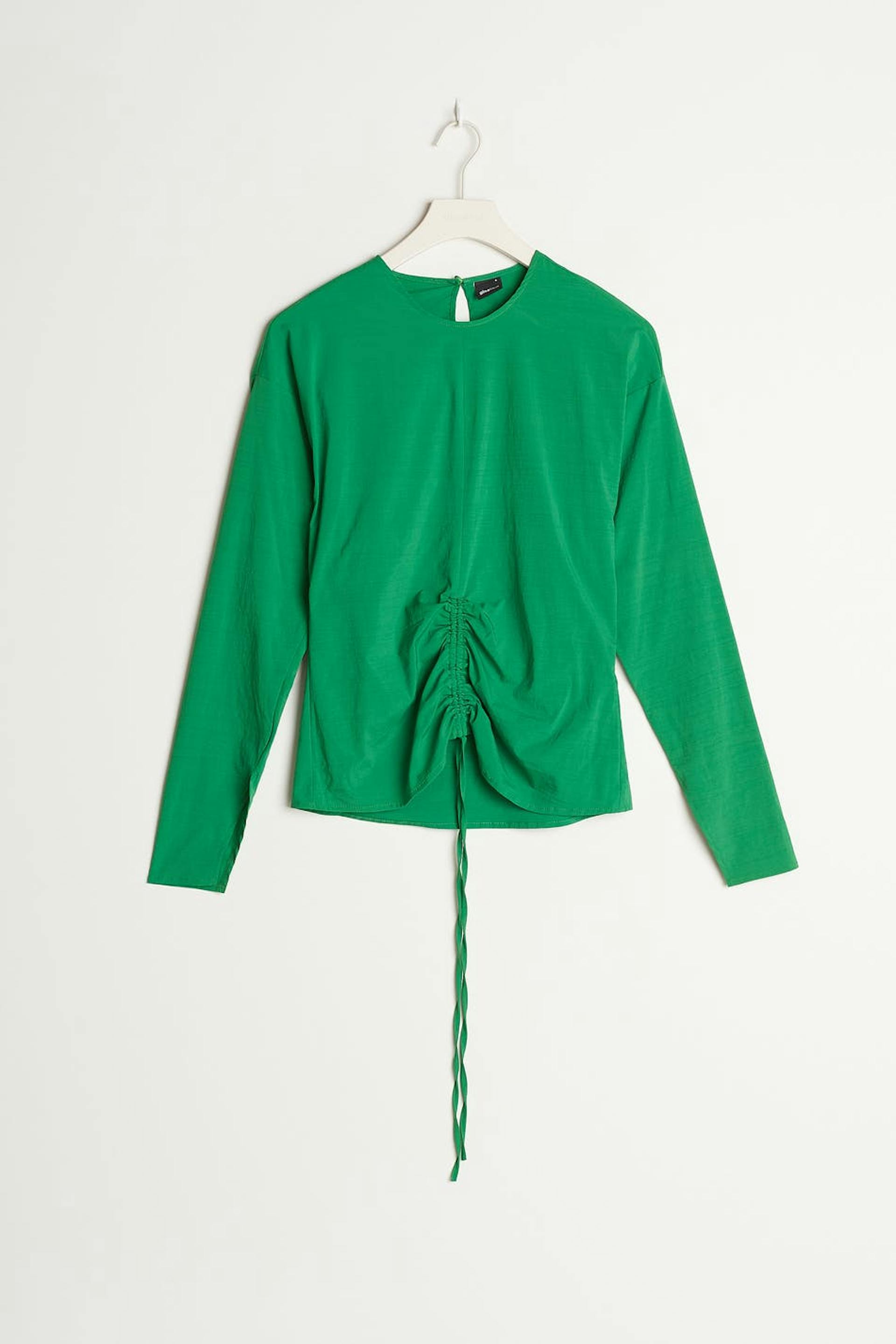 Pitkähihainen pusero kookkailla olkapäillä. Pusero on vihreä ja siinä on poimutetut yksityiskohdat edessä. Siinä on pyöristetty kaula-aukko, napituslista takana ja säädettävä kiristysnyöri solmittavalla vyöllä helmassa.