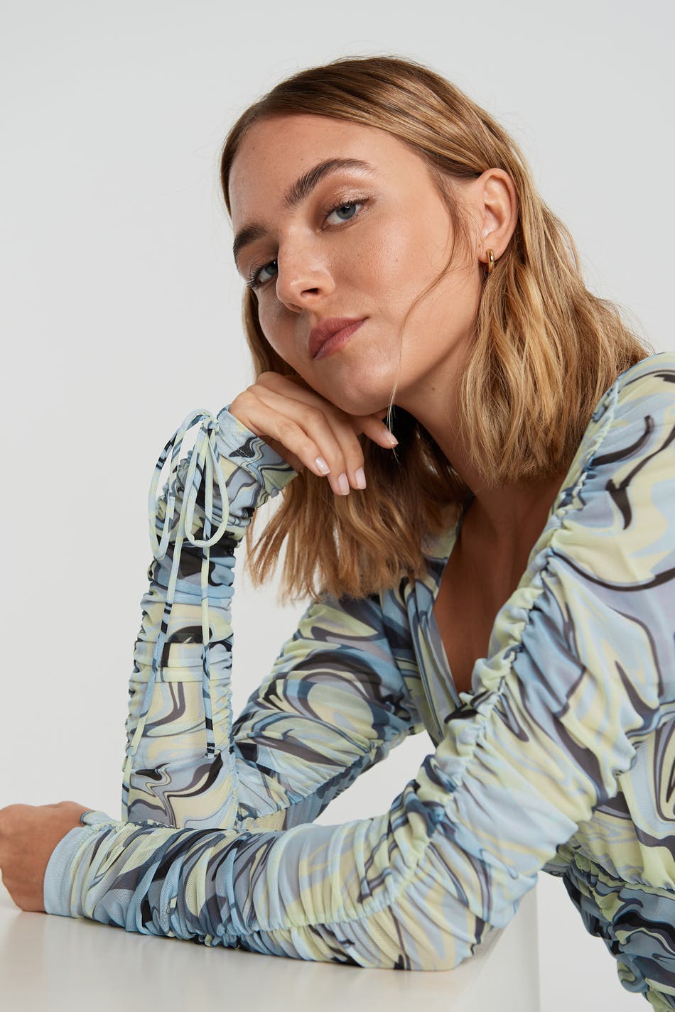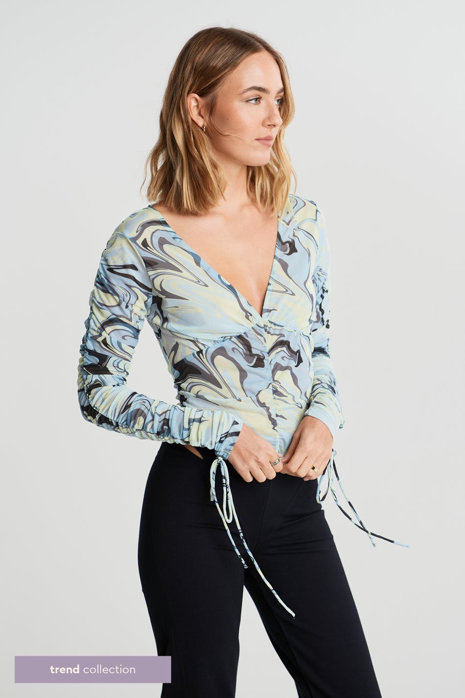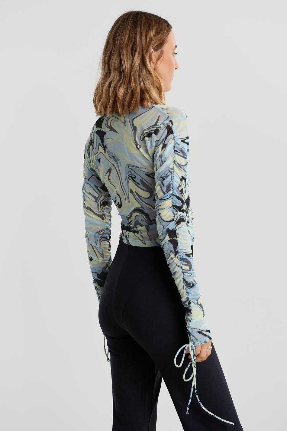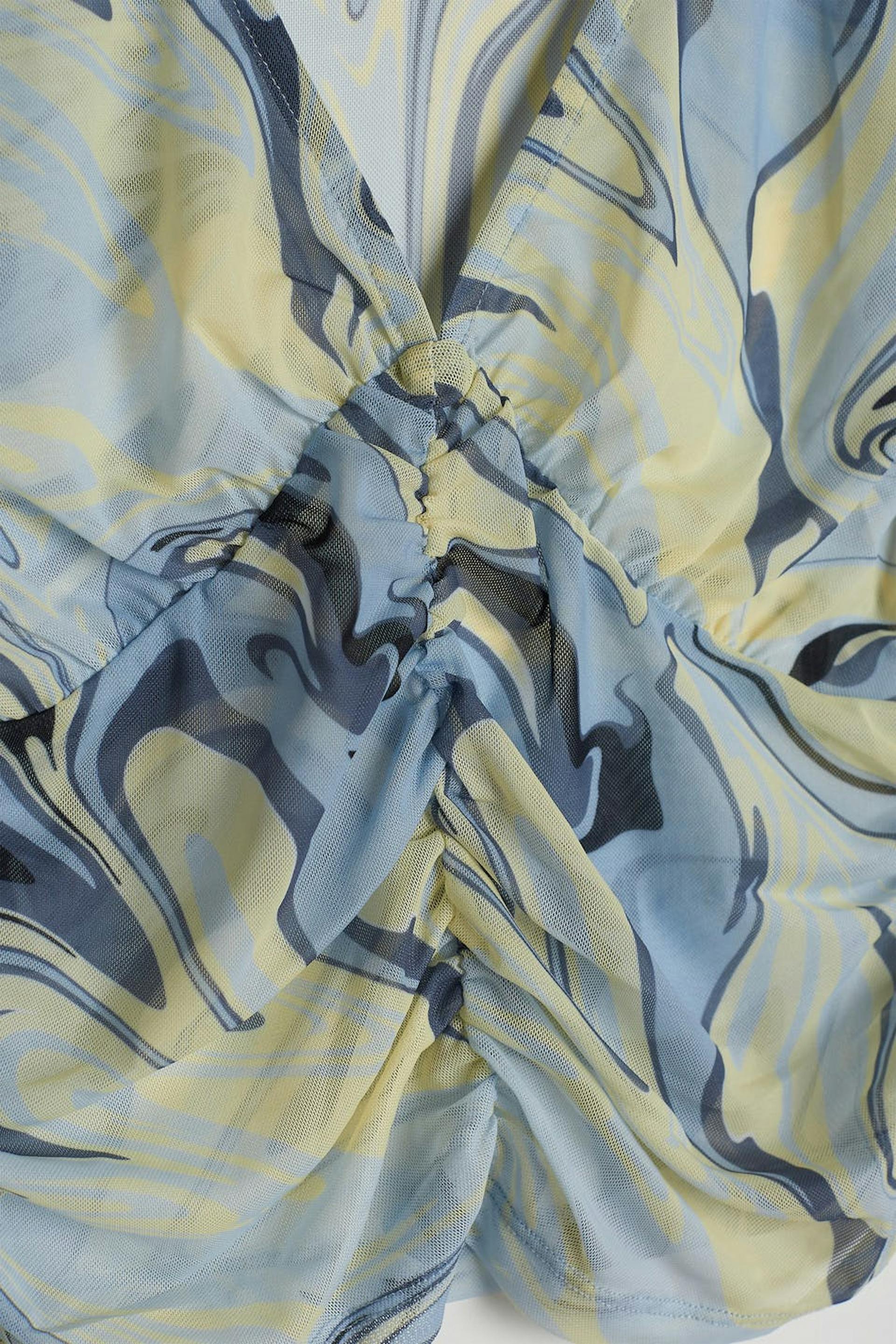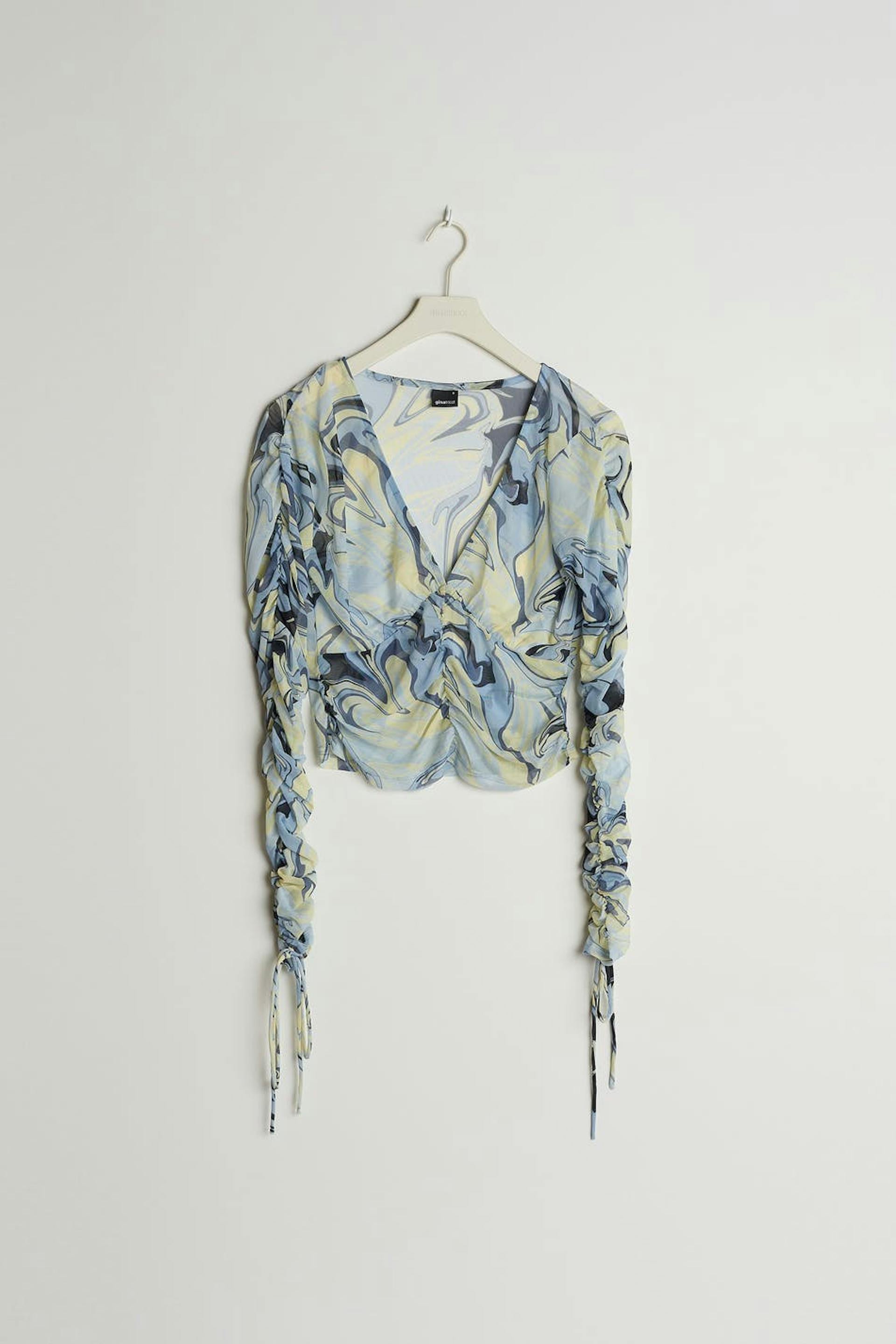 Pusero sinisellä, vihreällä, mustalla kuvioinnilla. Puserossa on pitkät hihat poimuilla ja kiristysnyörillä solmittavalla vyöllä molempia hihoja pitkin. Siinä on v-pääntie, pehmeä laatu verkkokankaasta ja poimu etusivun alaosassa.