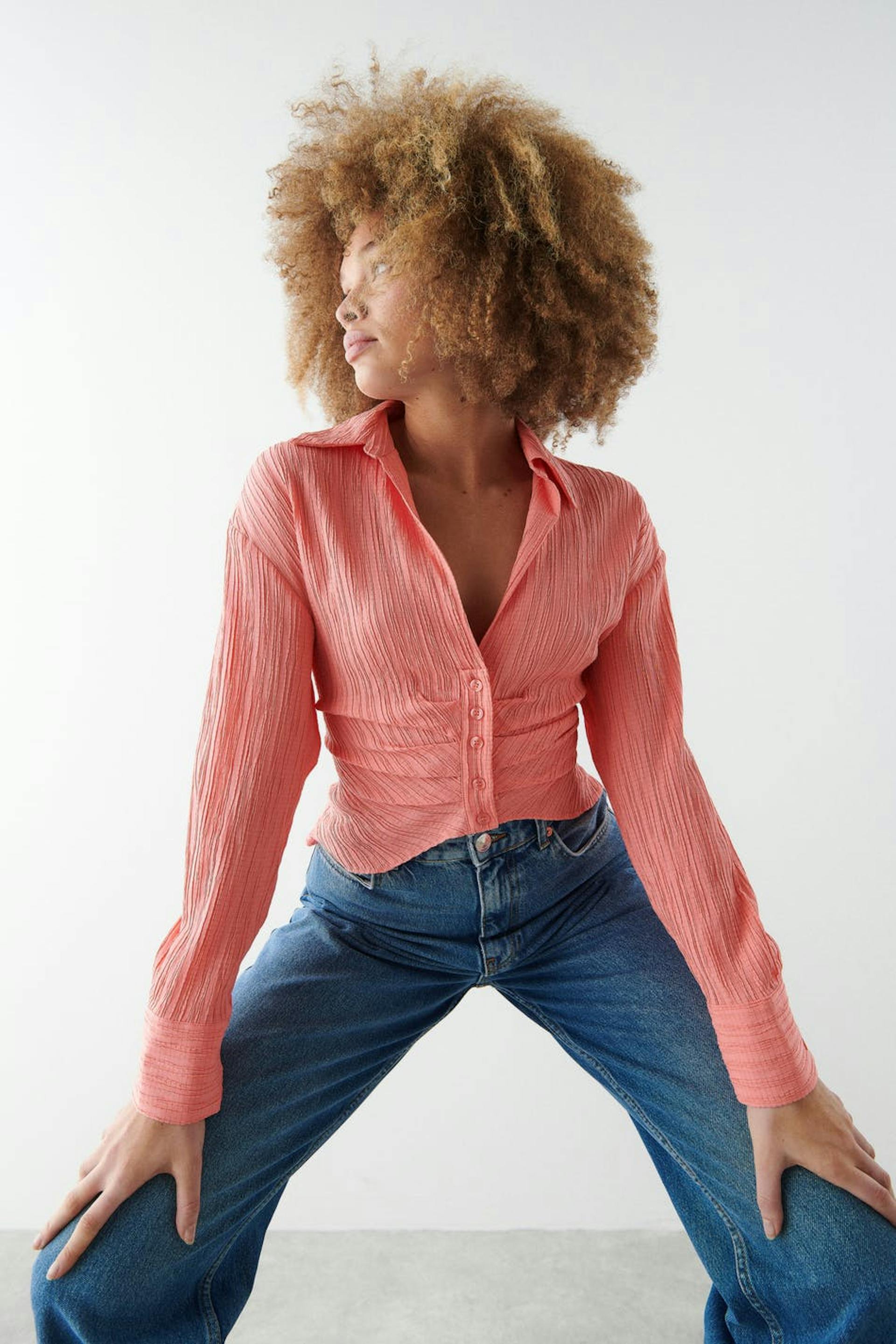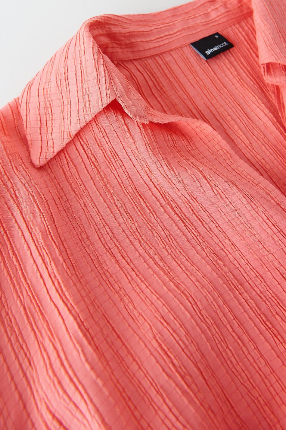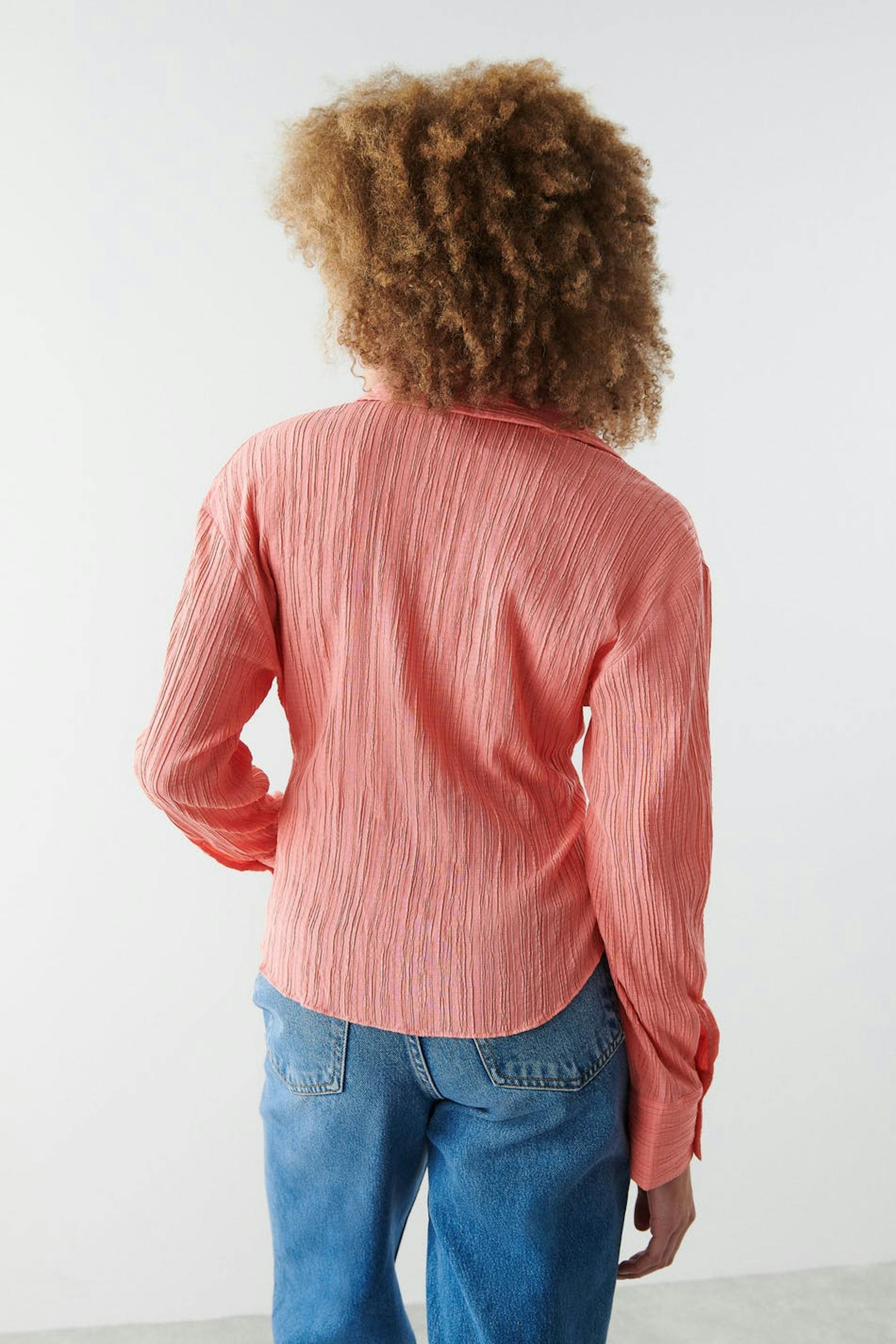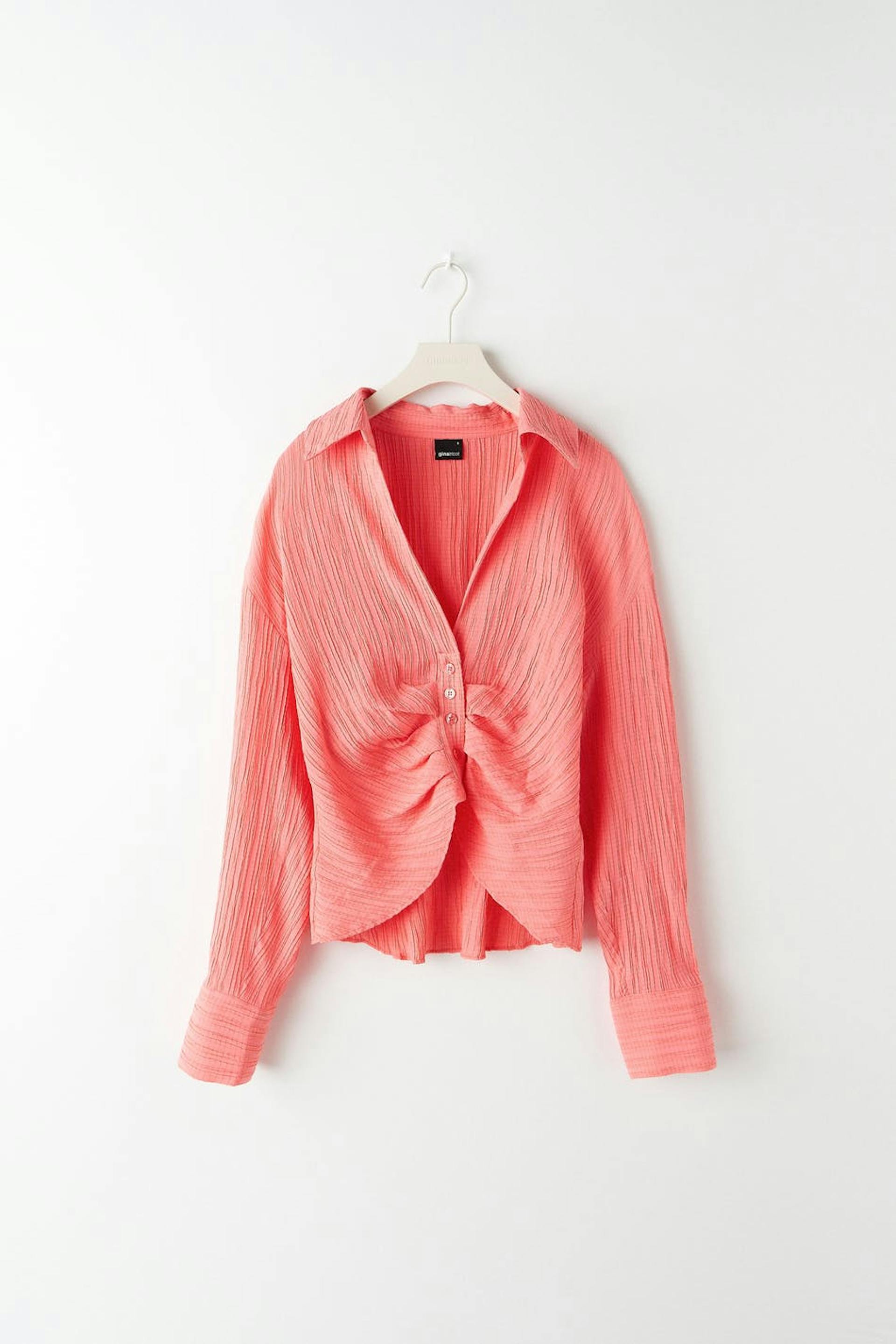 Cropattu pusero poimutetulla efektillä edessä. Pusero on pinkki ja pitkähihainen ja siinä on kudottu laatu. Siinä on syvään uurrettu kaula-aukko, napituslista edessä, kaulus ja hihansuut napeilla.