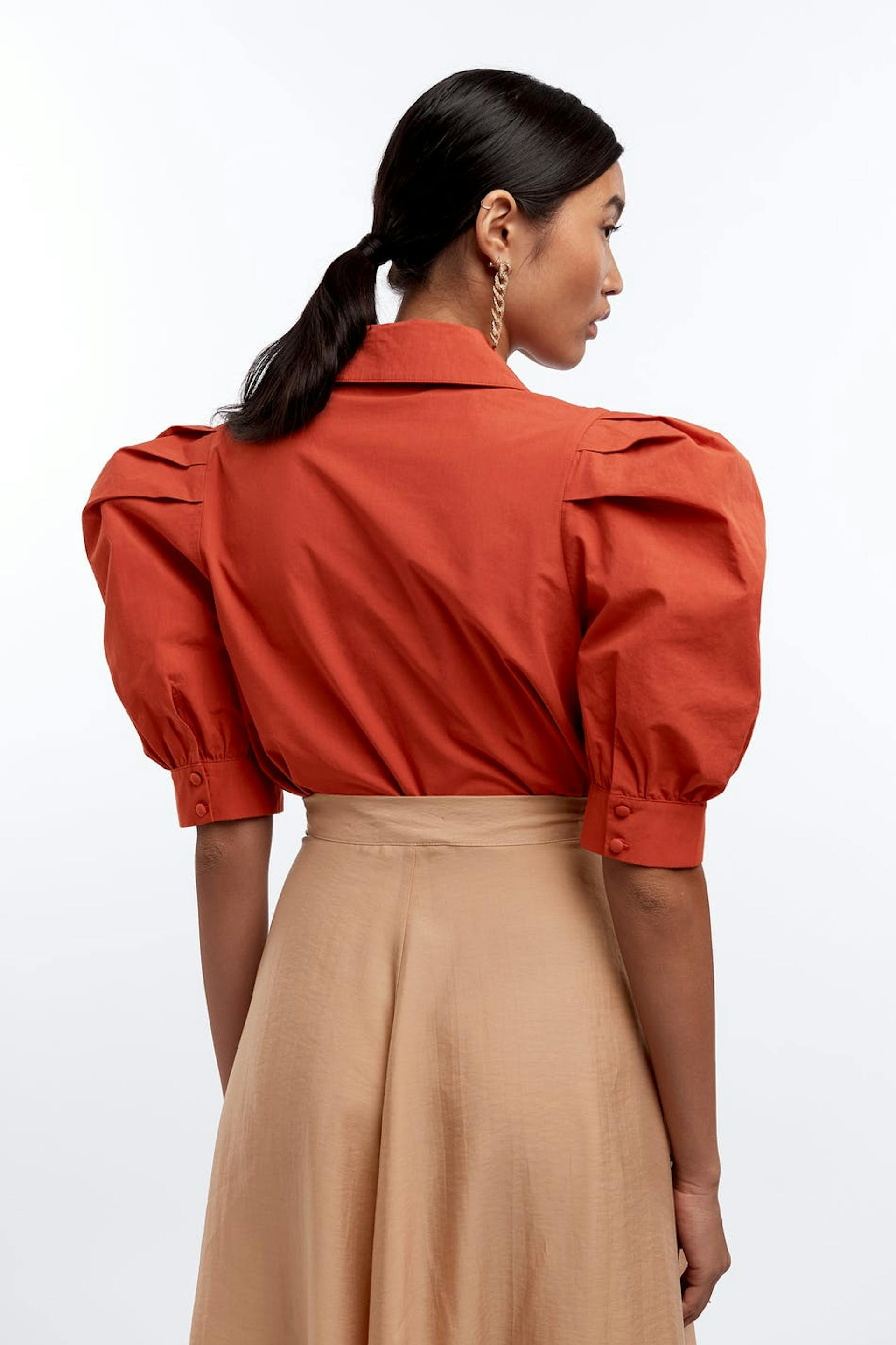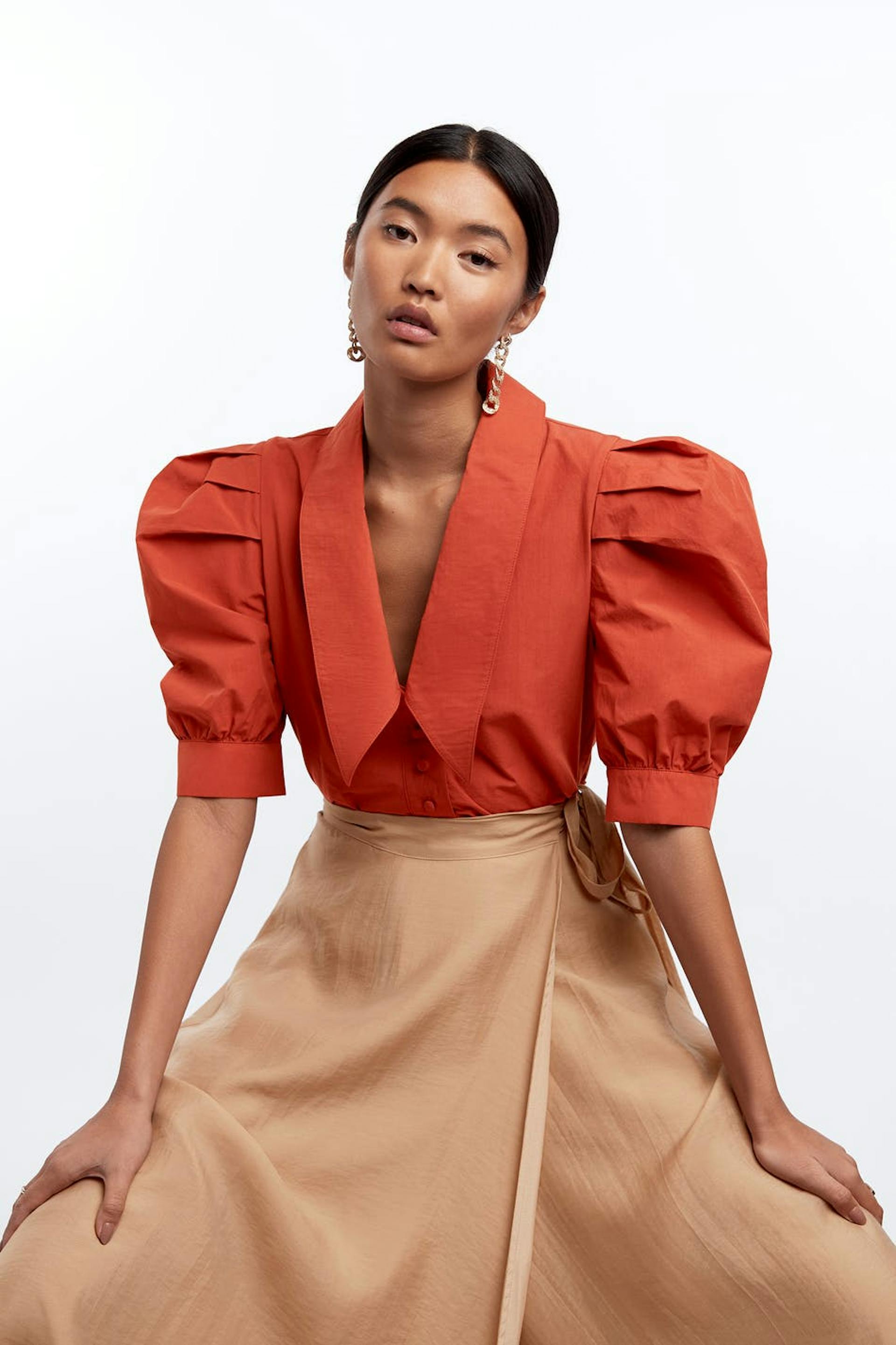Lyhyt pusero syvään uurretulla pääntiellä. Pusero on oranssi ja siinä on lyhyet puff sleeve-paidat hihansuilla hihansuissa. Siinä on napit edessä ja terävät käänteet.