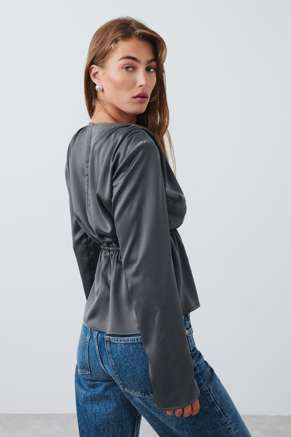 Pitkähihainen pusero satiinista olkatoppauksilla. Pusero on harmaa ja siinä on kuminauha vyötäröllä. Siinä on v-pääntie ja poimut olkapäiden ympärillä.