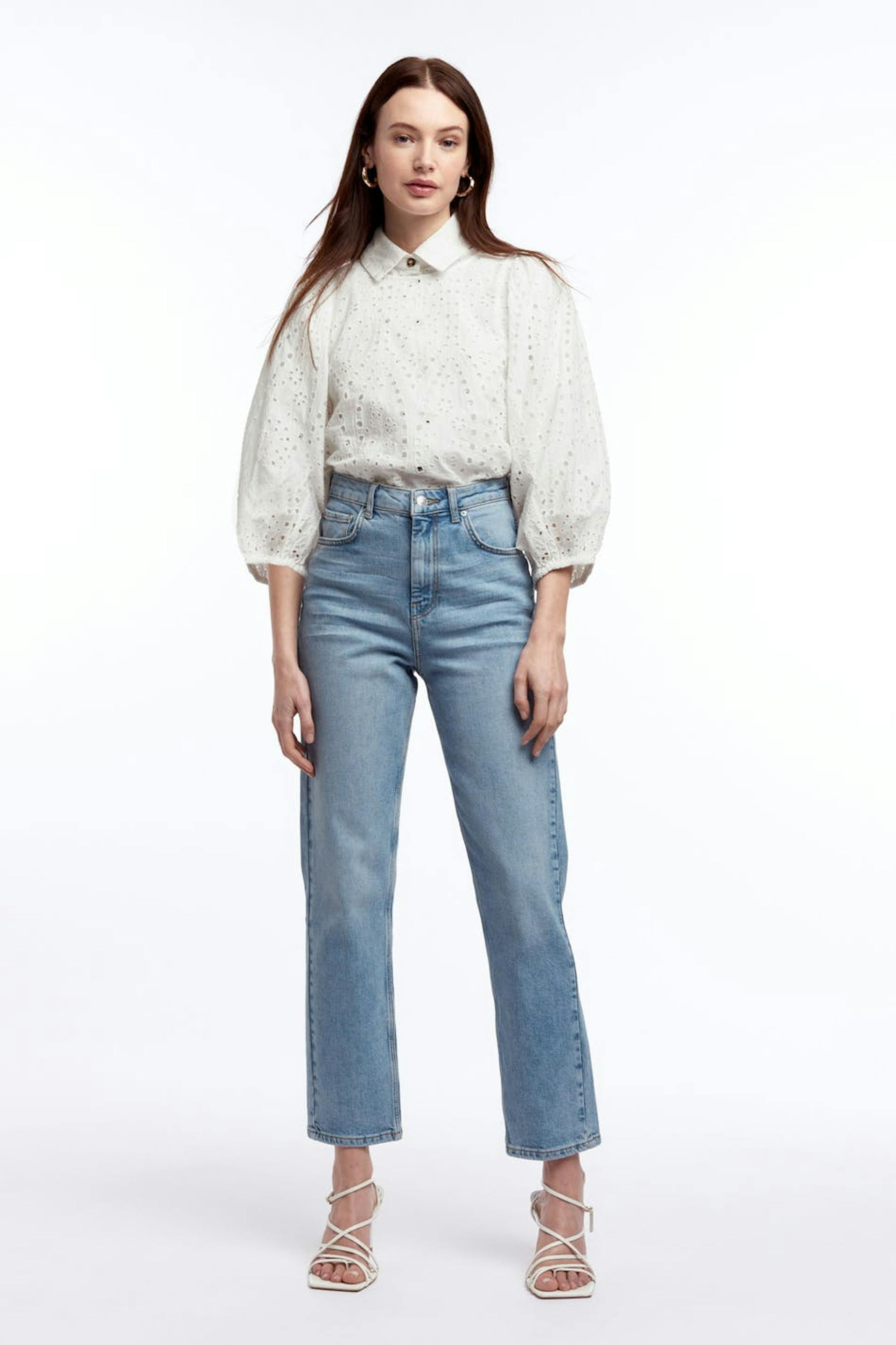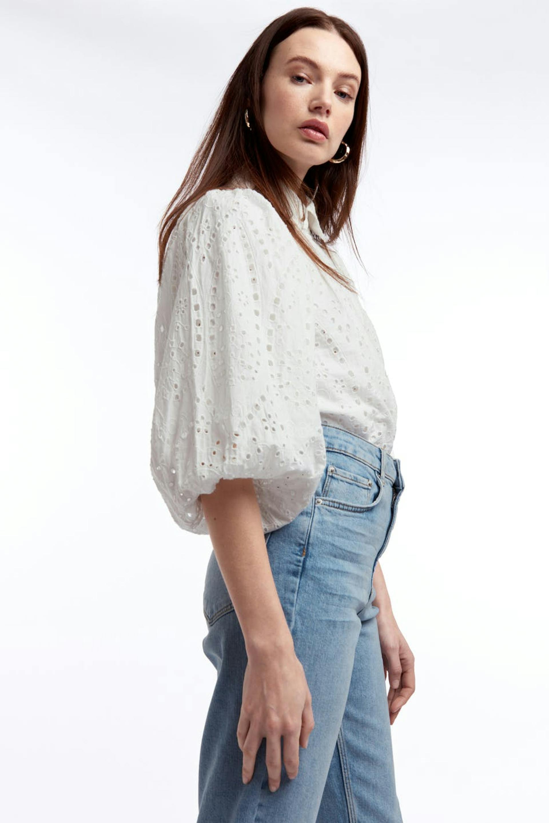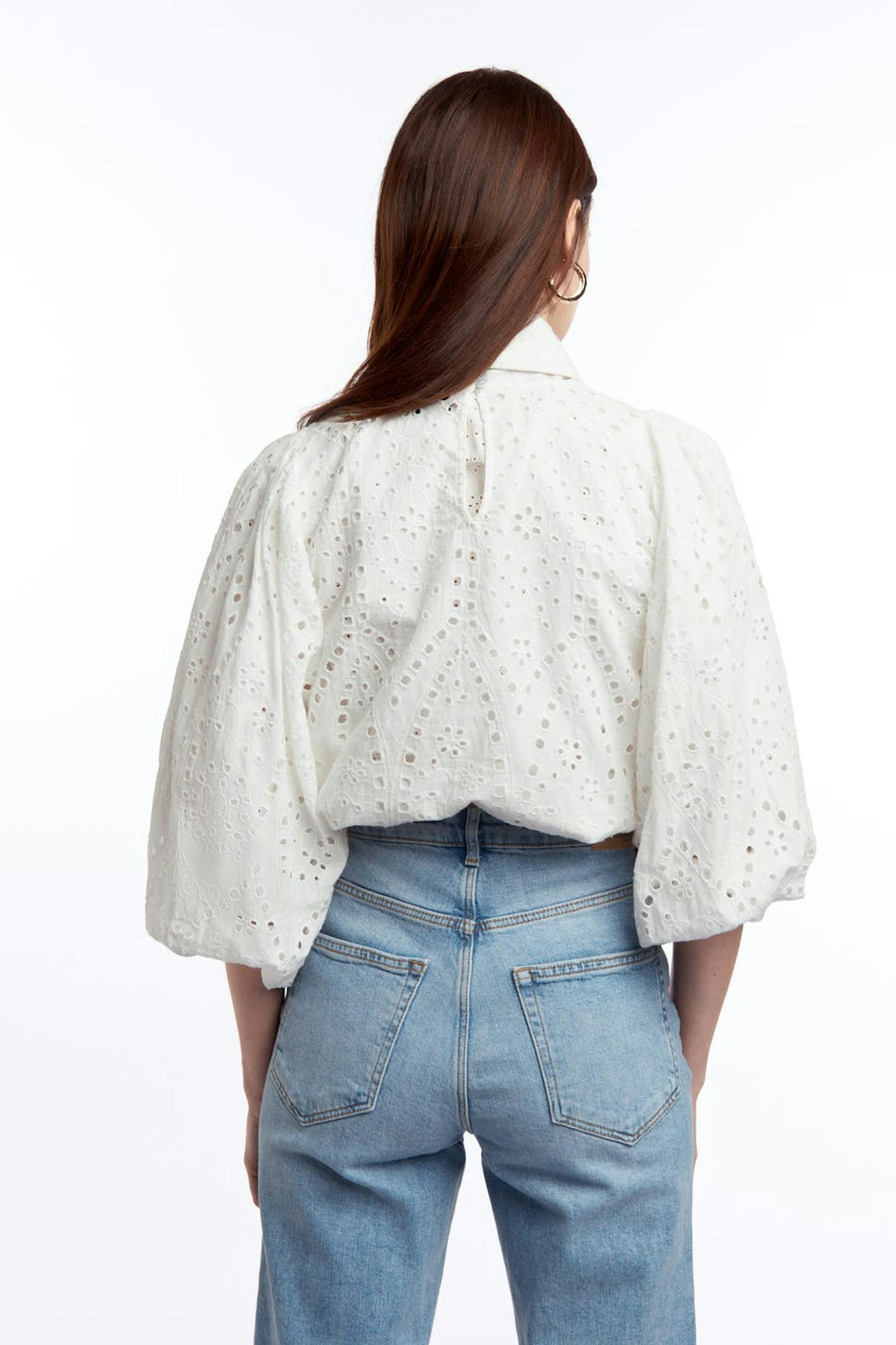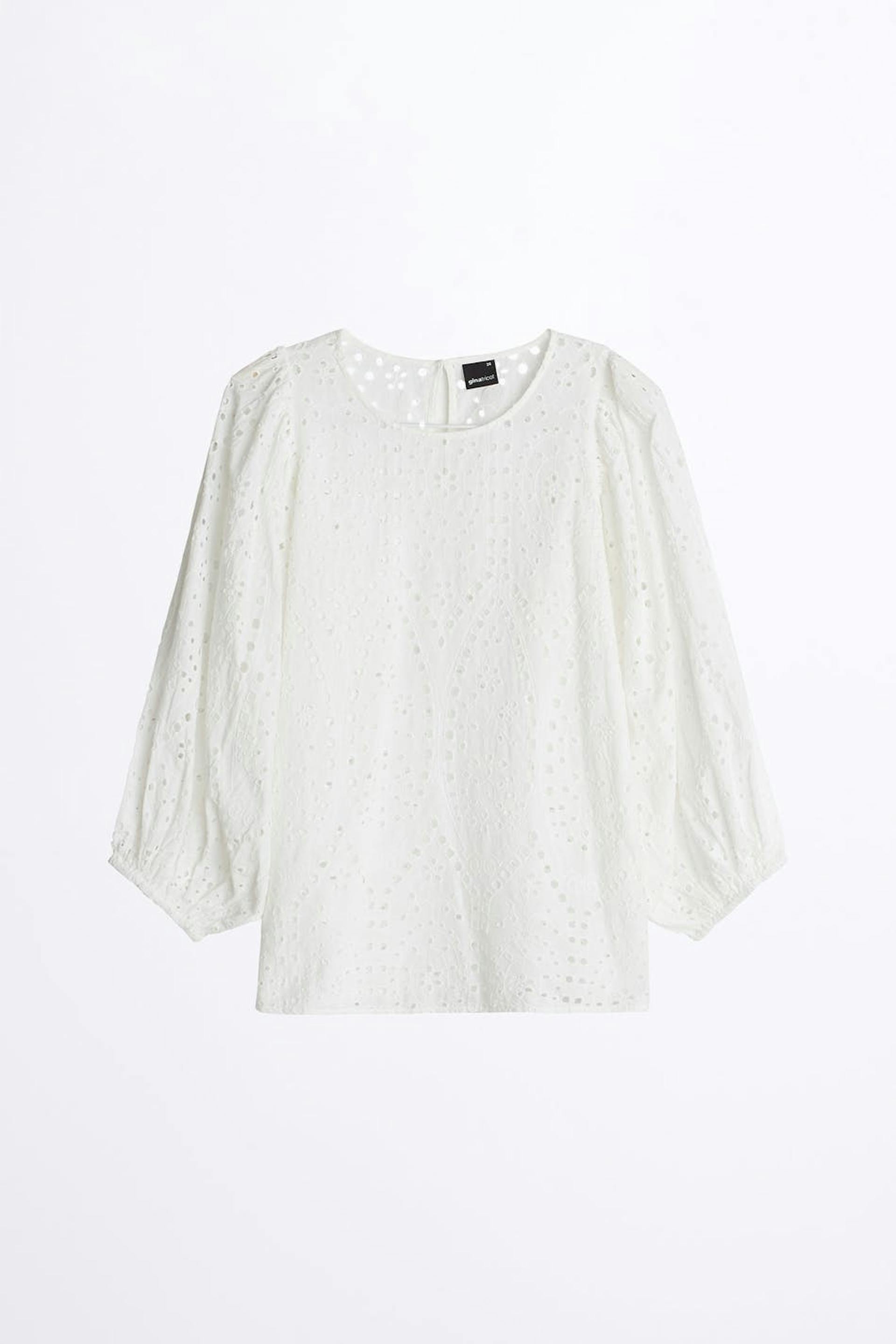 Pusero 3/4-pituisilla puff sleeve-paidoilla. Pusero on valkoinen.