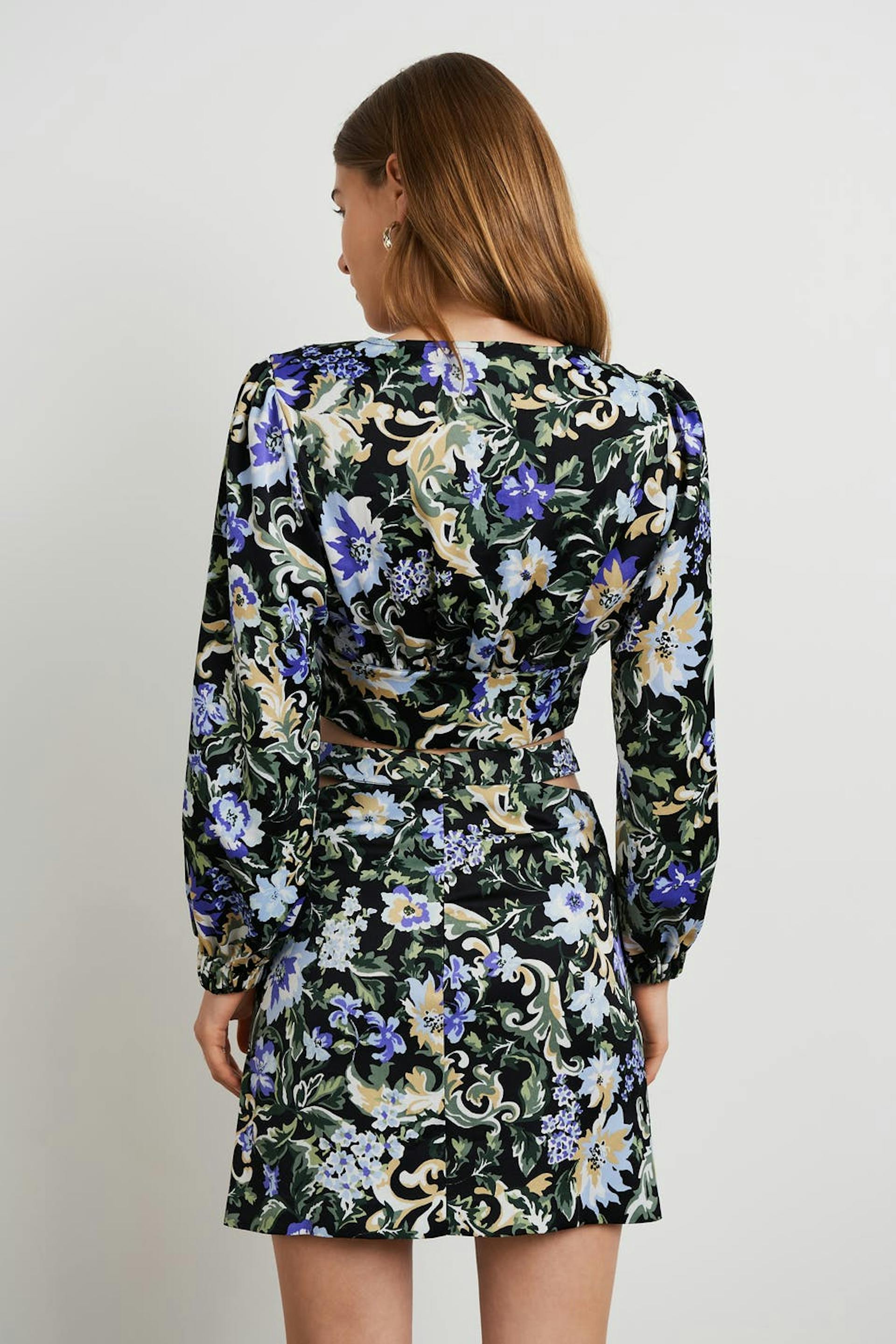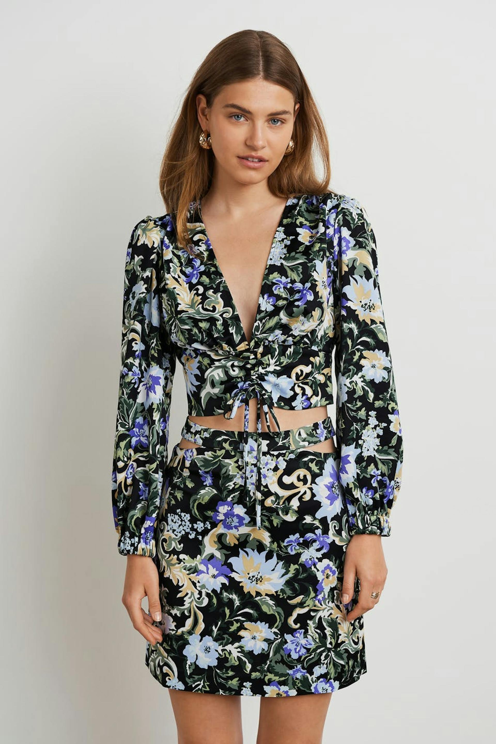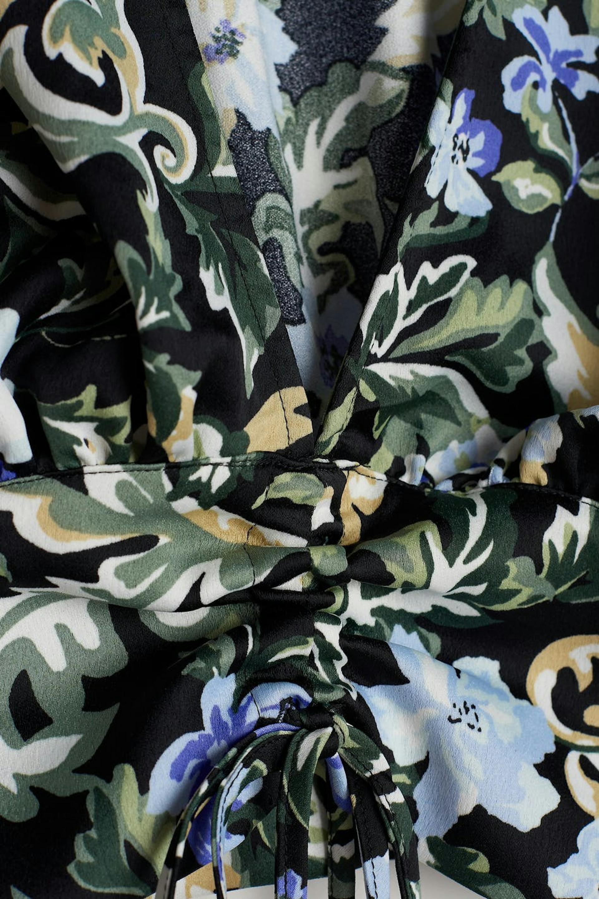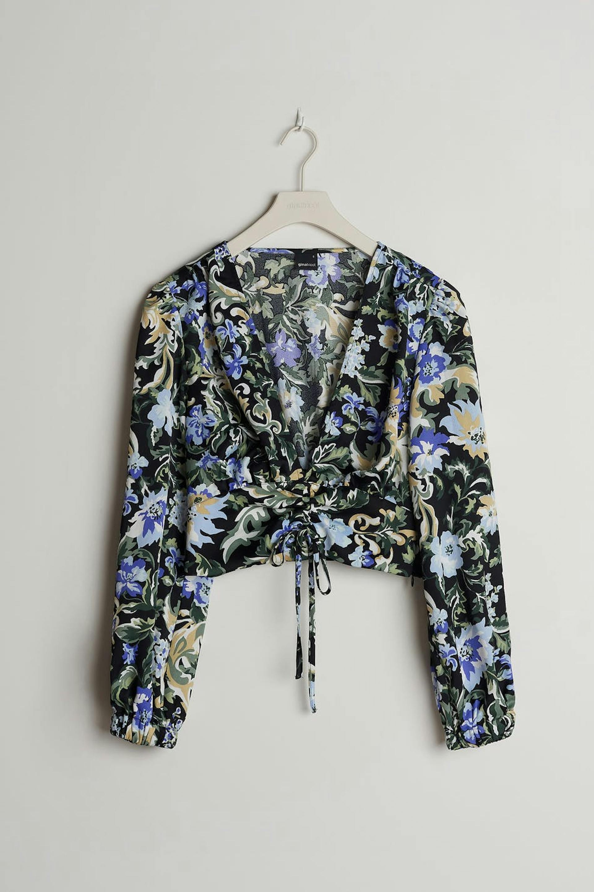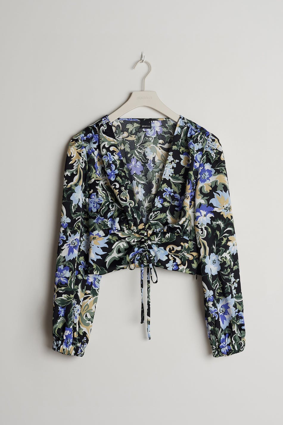 Kukallinen pusero poimutetuilla yksityiskohdilla edessä. Pusero on sininen, pitkähihainen ja cropattu. Siinä on syvään uurrettu kaula-aukko, kuminauha hihansuissa ja säädettävä kiristysnyöri solmittavalla vyöllä helmassa.