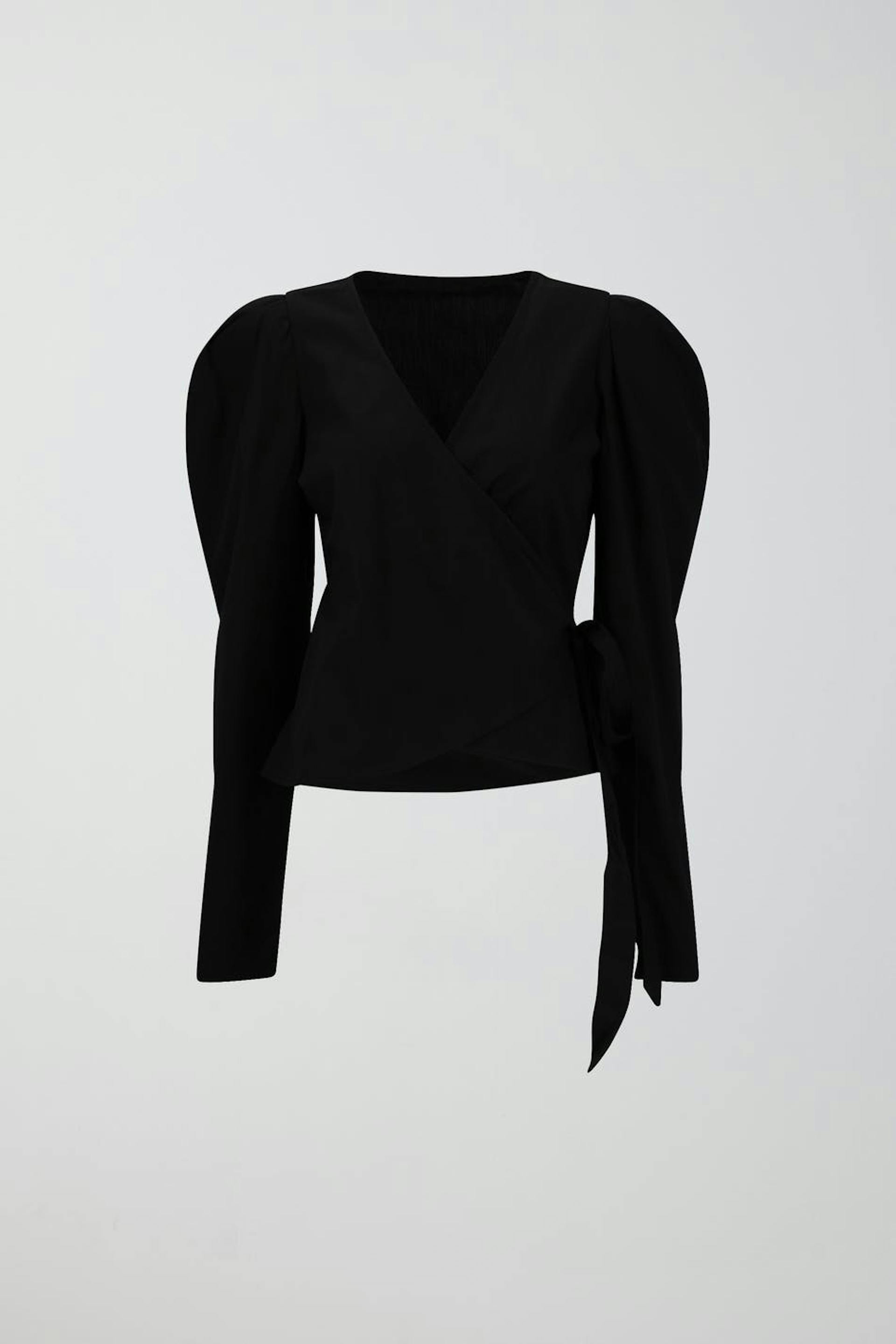 Pitkähihainen kietaisupusero rennolla istuvuudella. Pusero on musta ja siinä on puhvihihat. Siinä on v-pääntie ja solmittava vyö vyötäröllä.